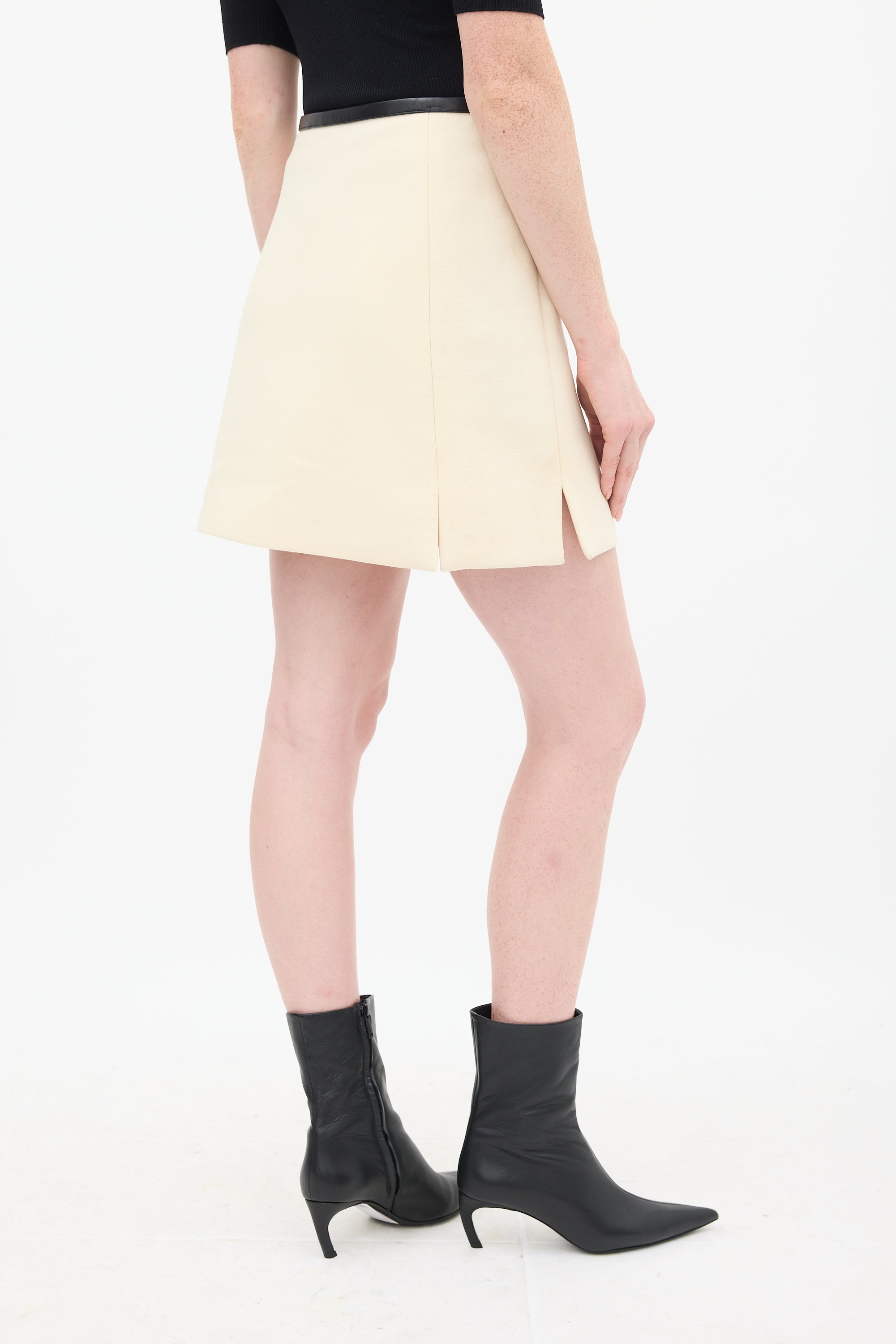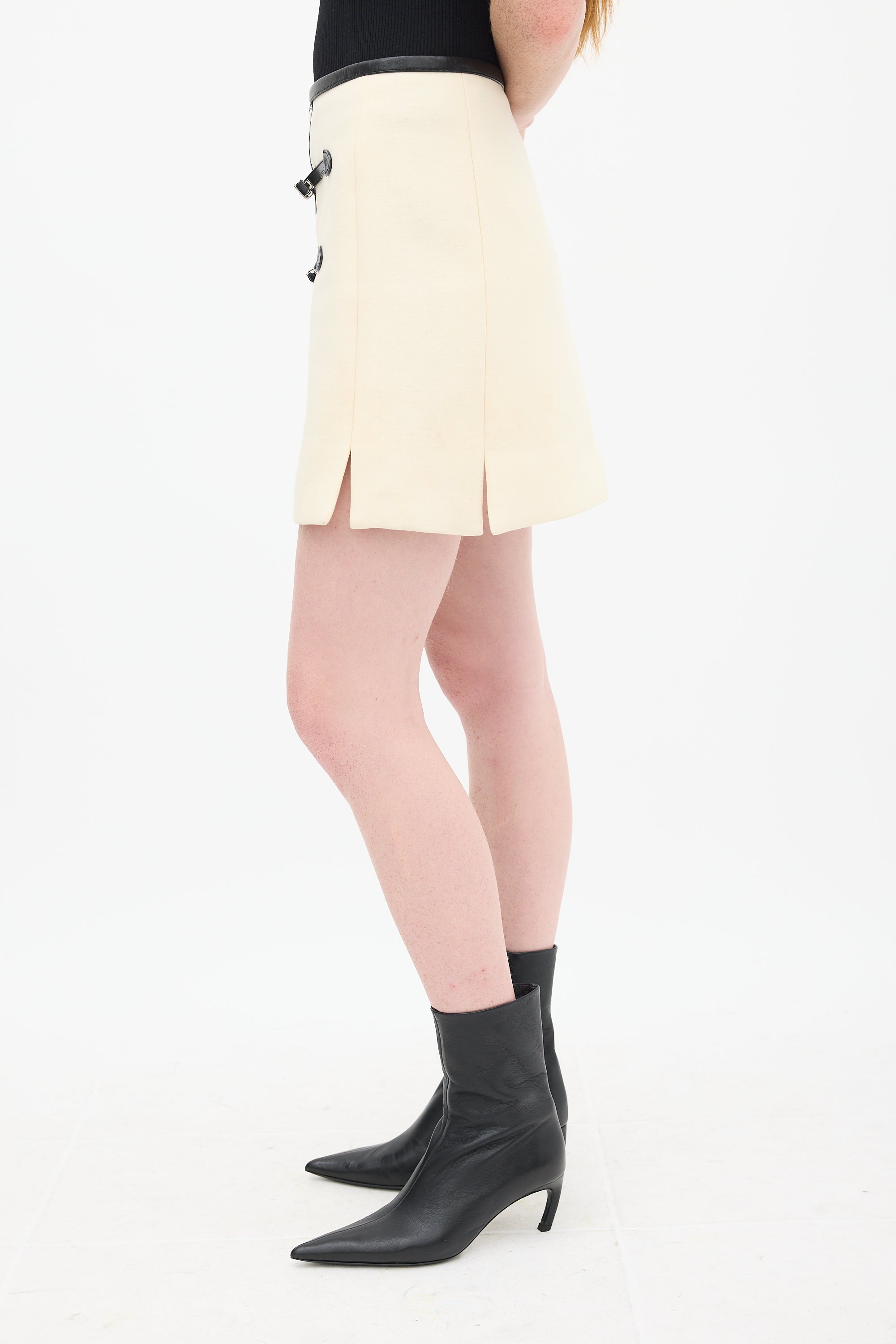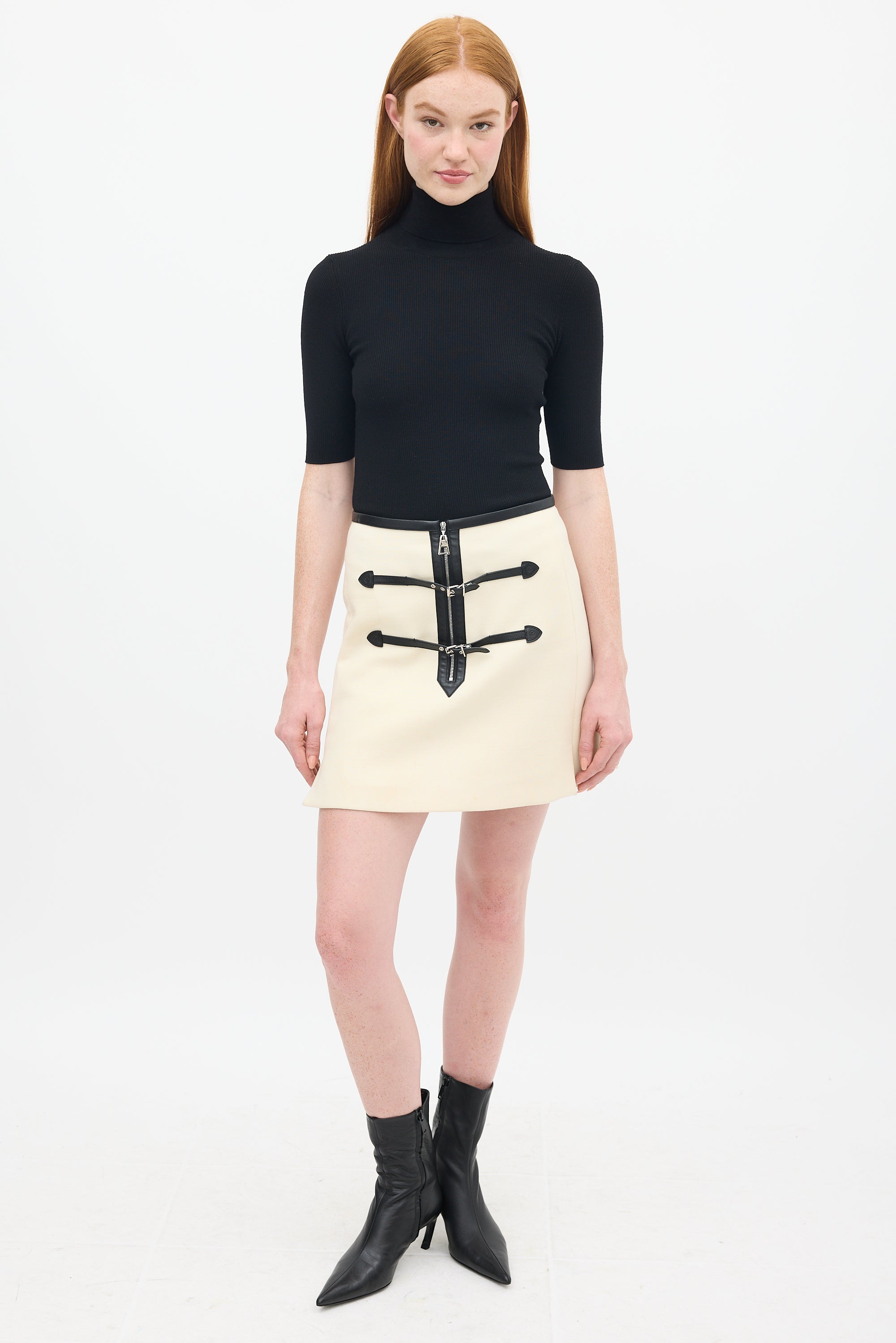 Pre-owned Louis Vuitton cream wool mini skirt featuring black leather trim at waist and front, dual slits at front and back, and two adjustable buckled straps across silver tone front zip. Lined.