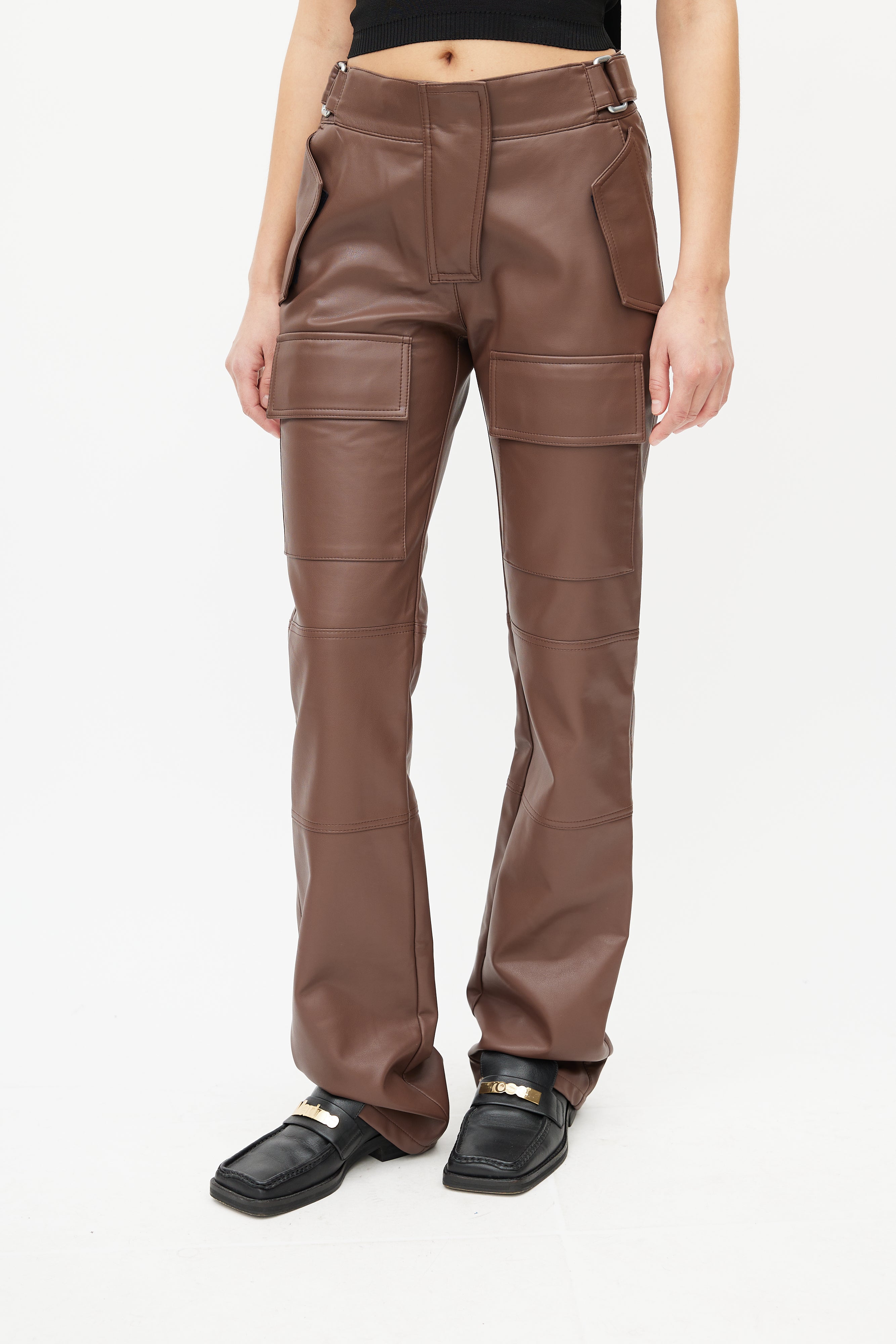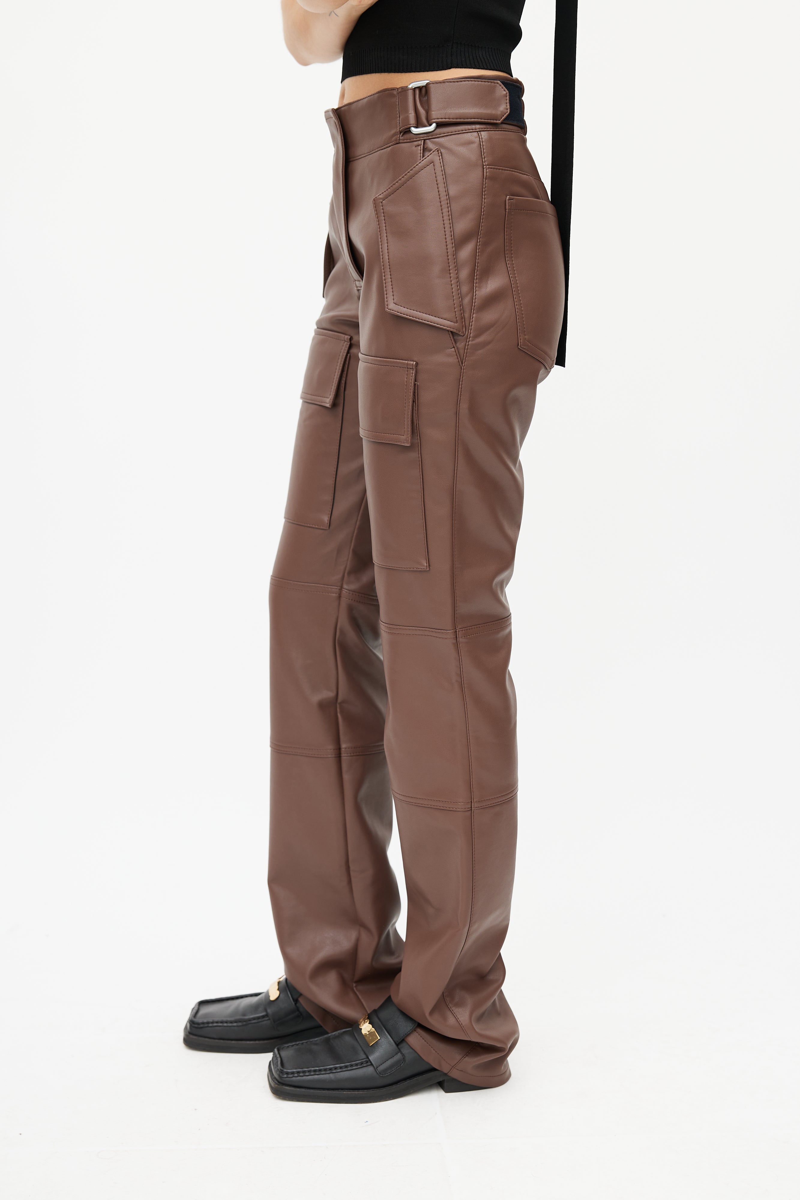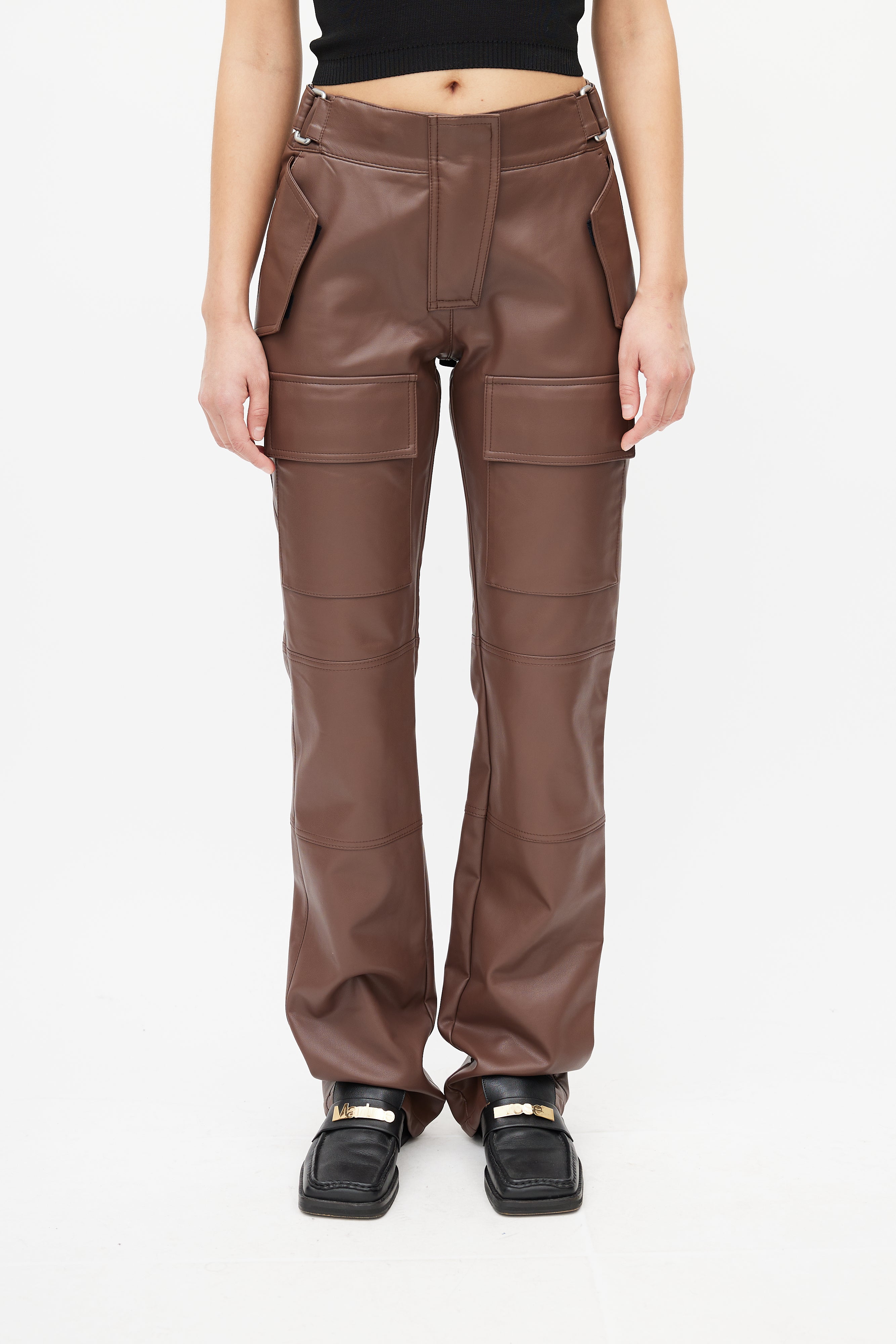 Pre-owned MISBHV brown faux leather trousers featuring two velcro pockets at hip, adjustable waist straps, two slip pockets at back, two cargo pockets at thigh, straight leg, and zip fly with snap closure.