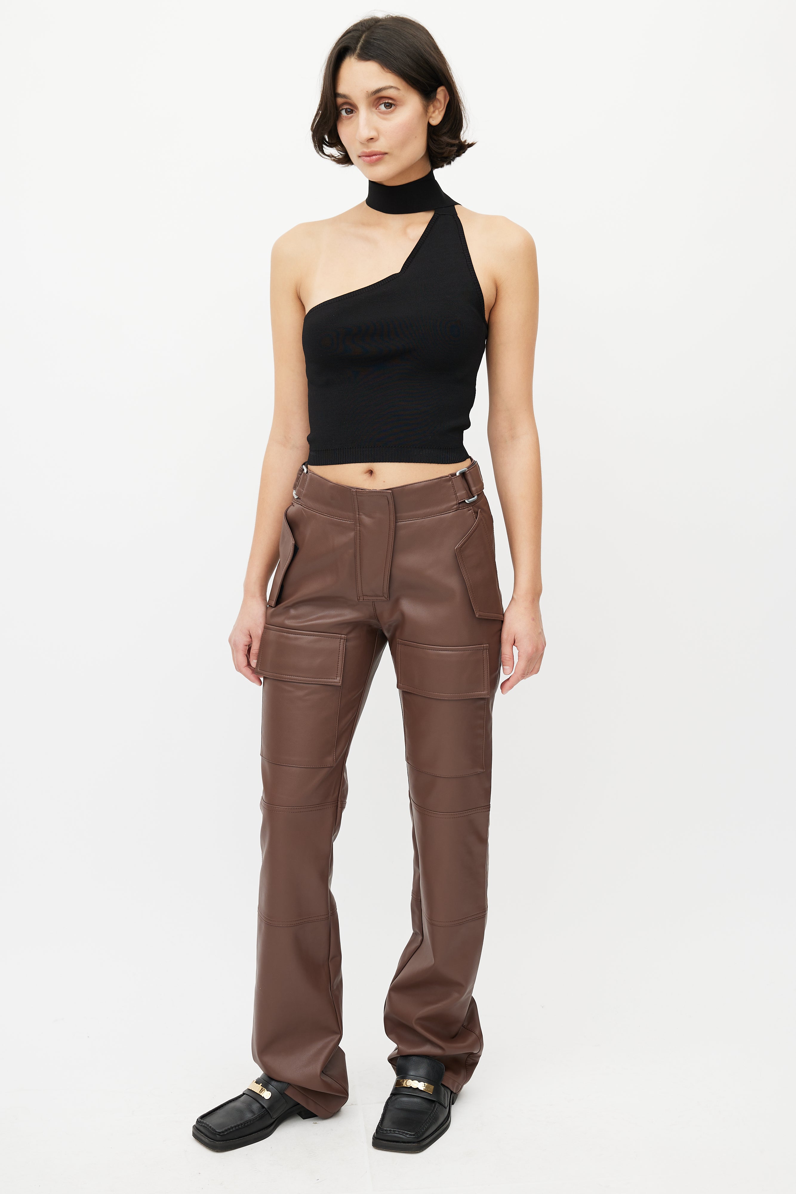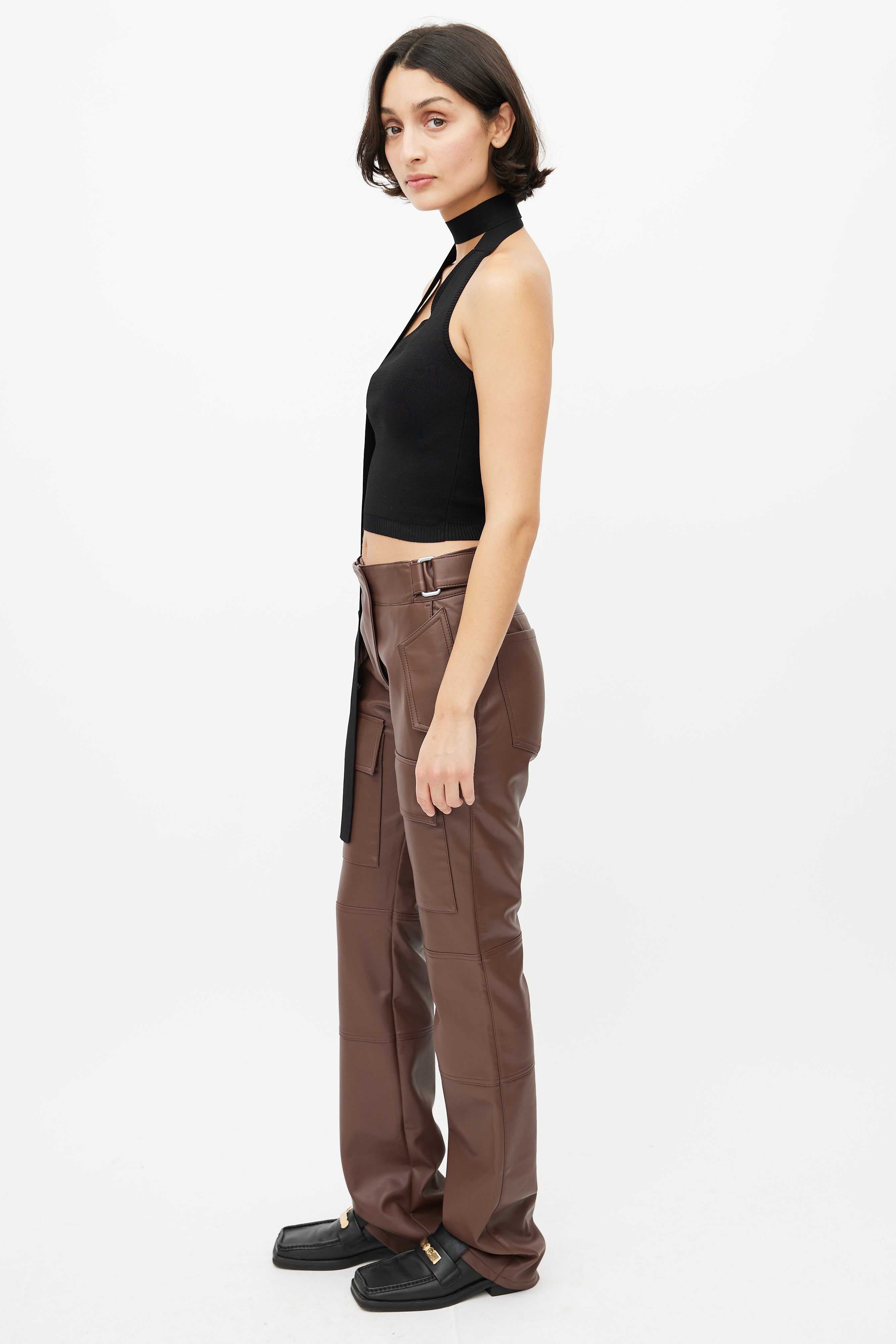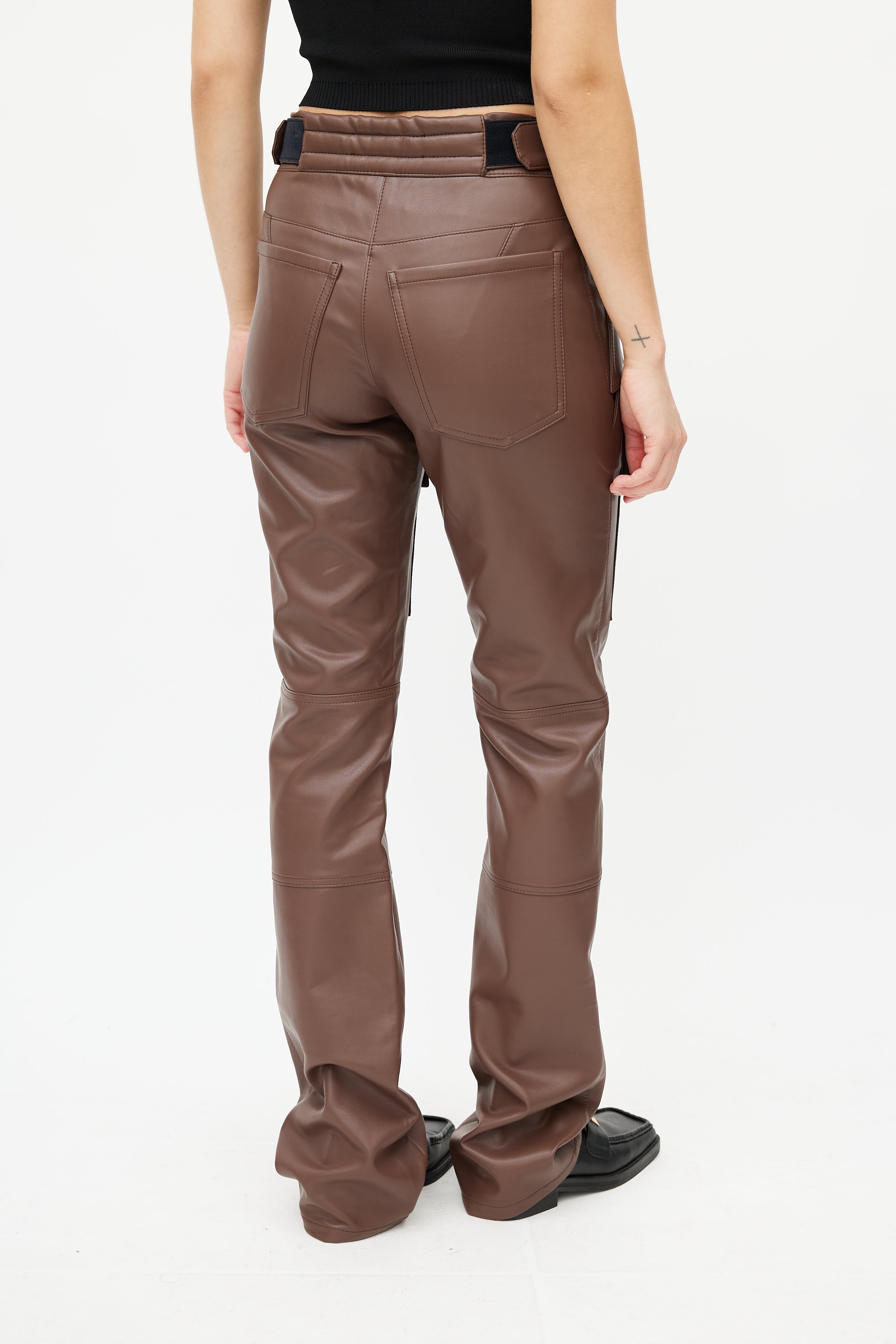 Pre-owned MISBHV brown faux leather trousers featuring two velcro pockets at hip, adjustable waist straps, two slip pockets at back, two cargo pockets at thigh, straight leg, and zip fly with snap closure.