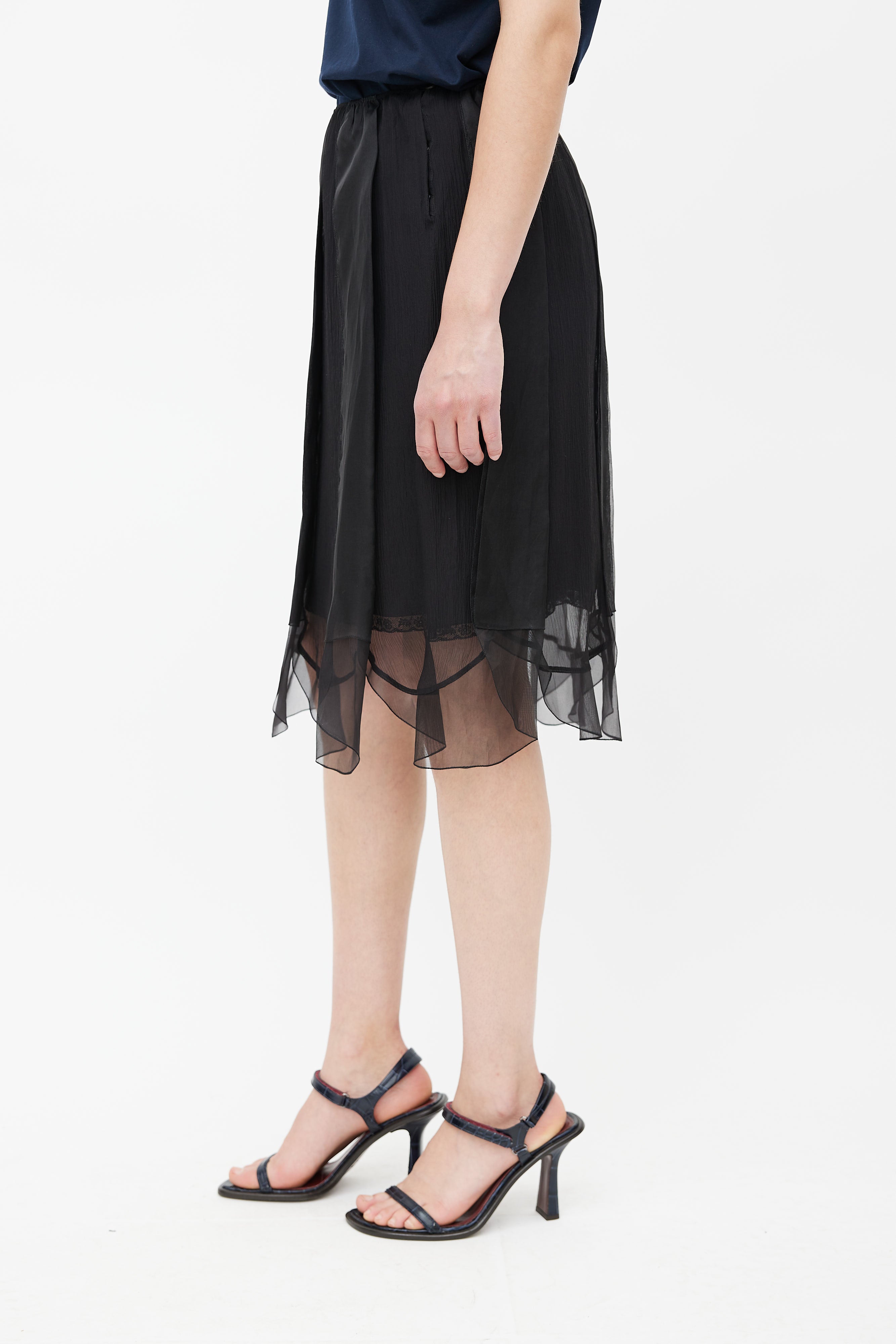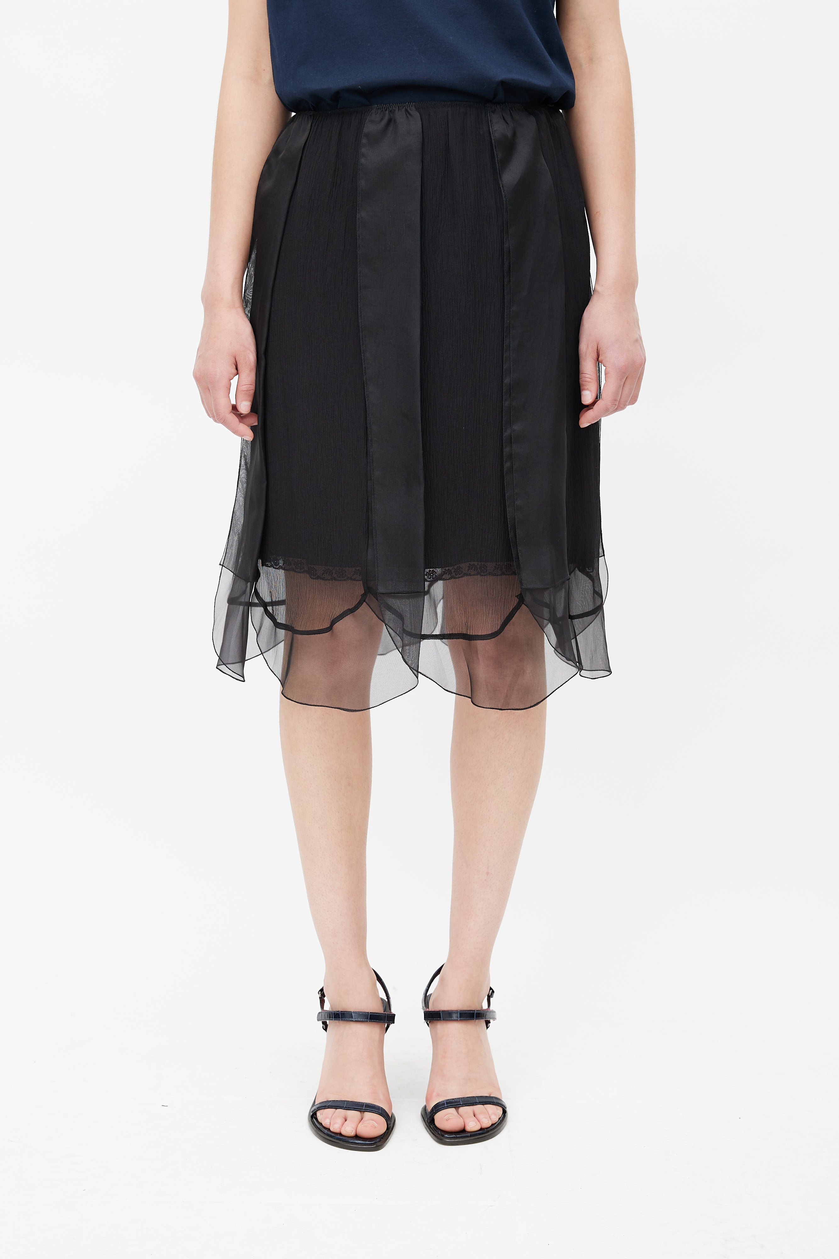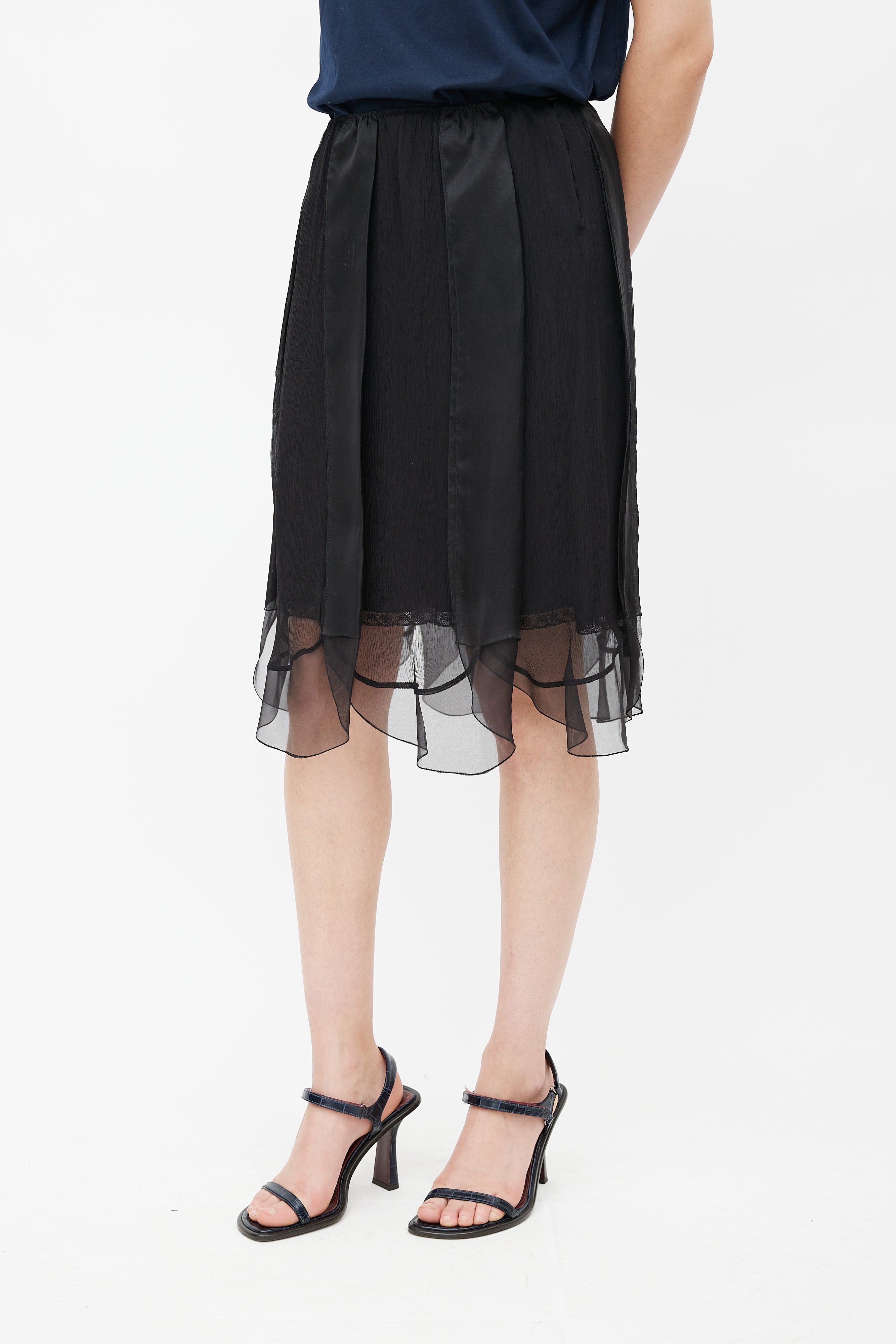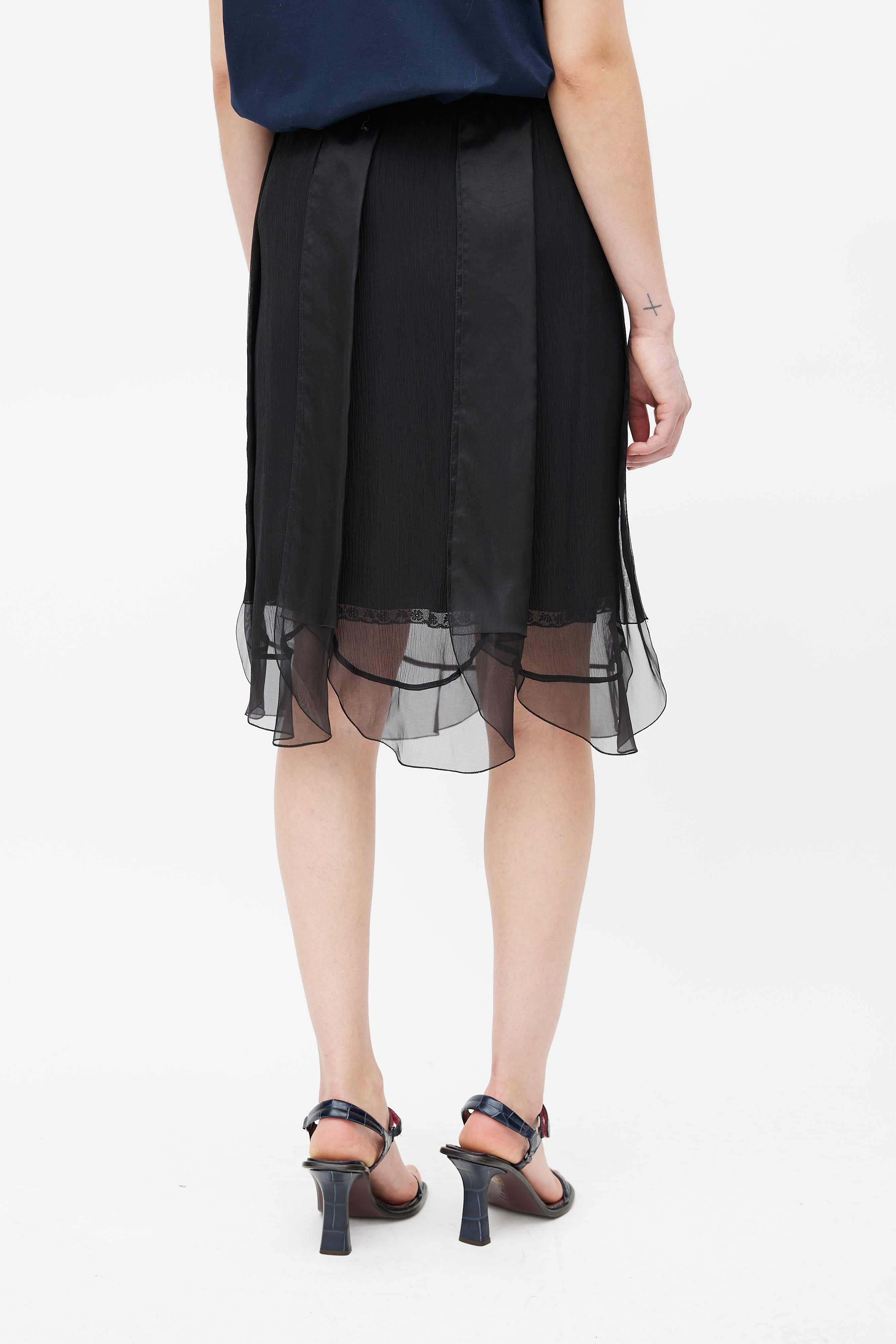 Pre-owned Prada black silk skirt featuring fixed waistband, clasp closure with button fastening at side, satin pleated, ruffle hem, and lining with lace hem.