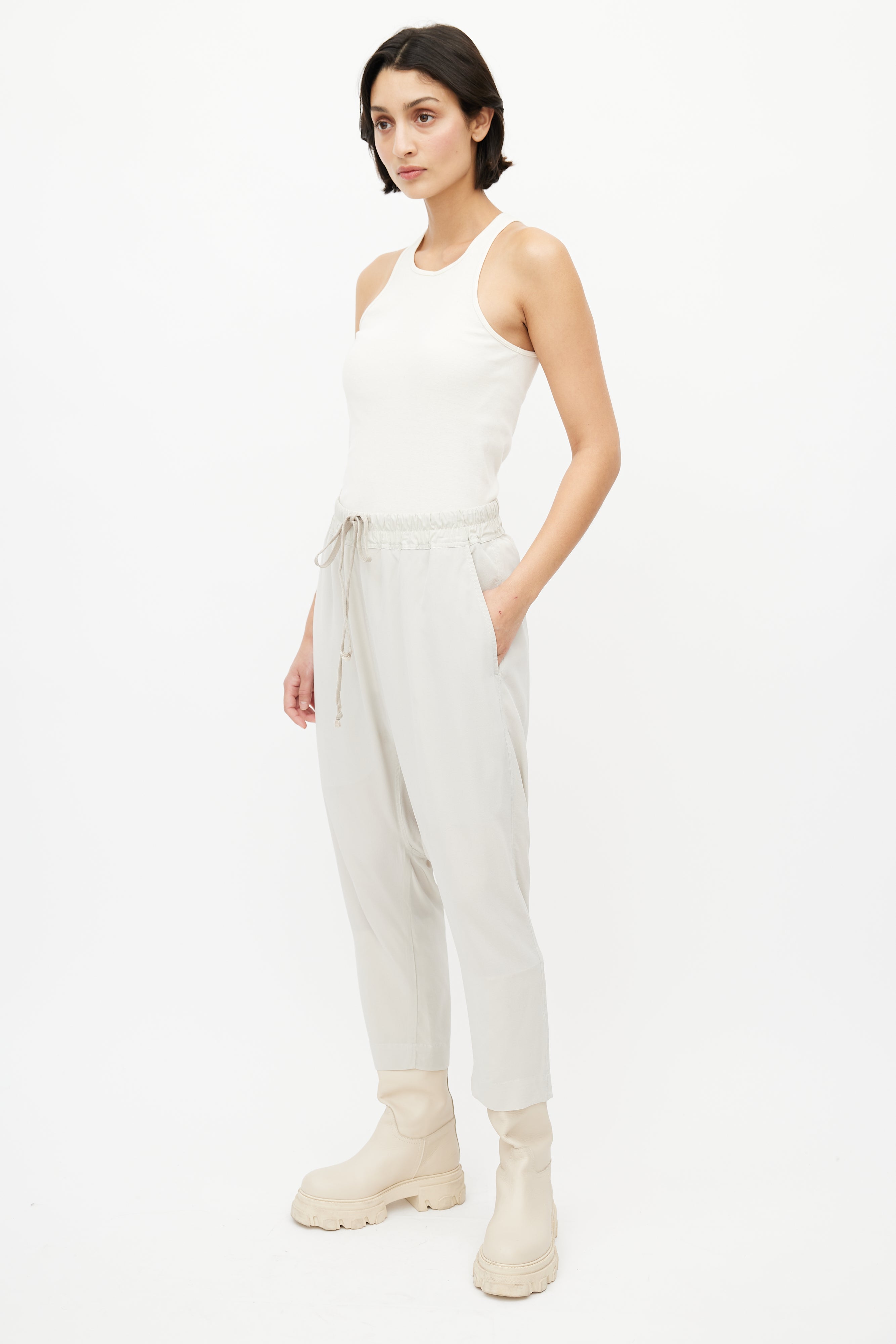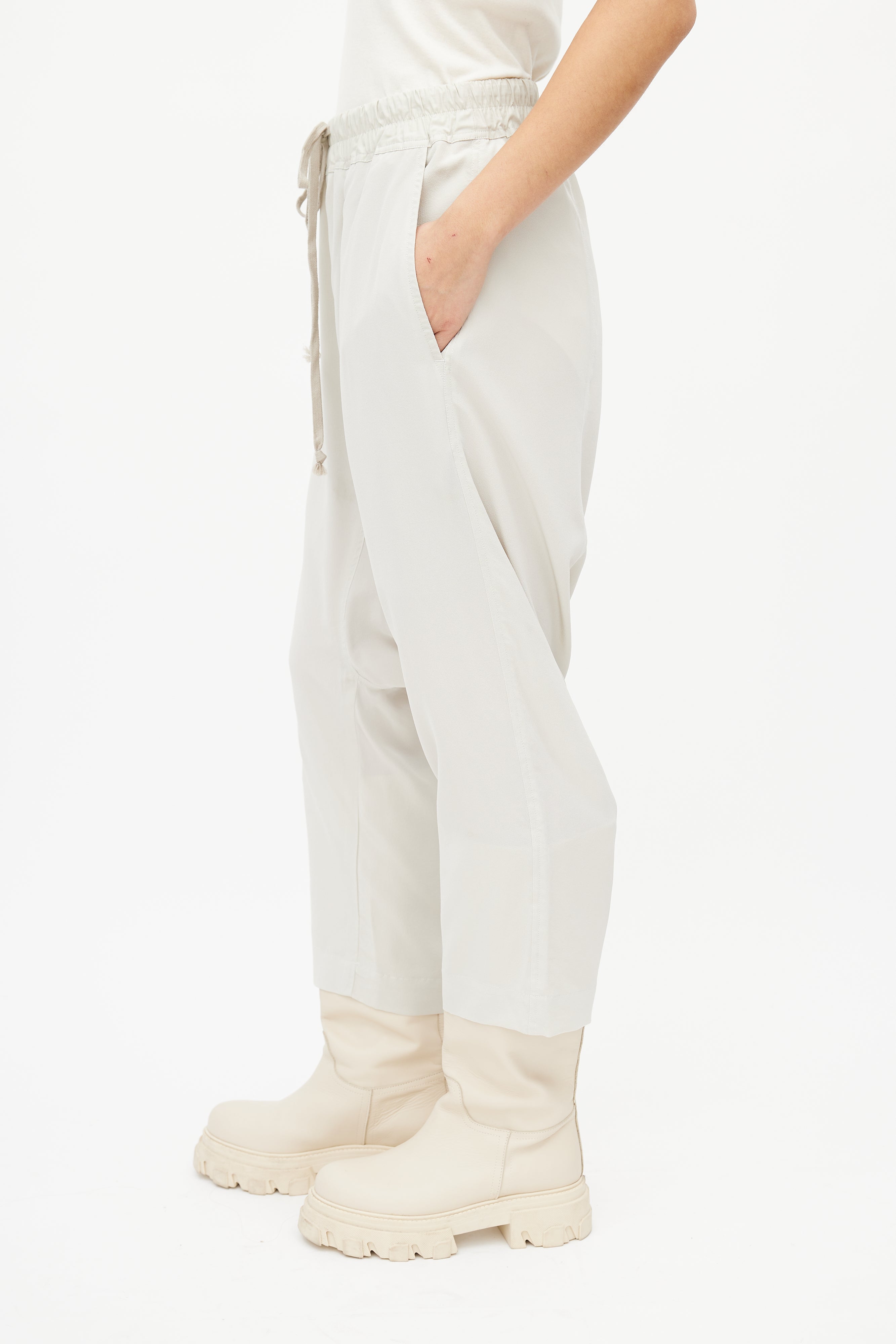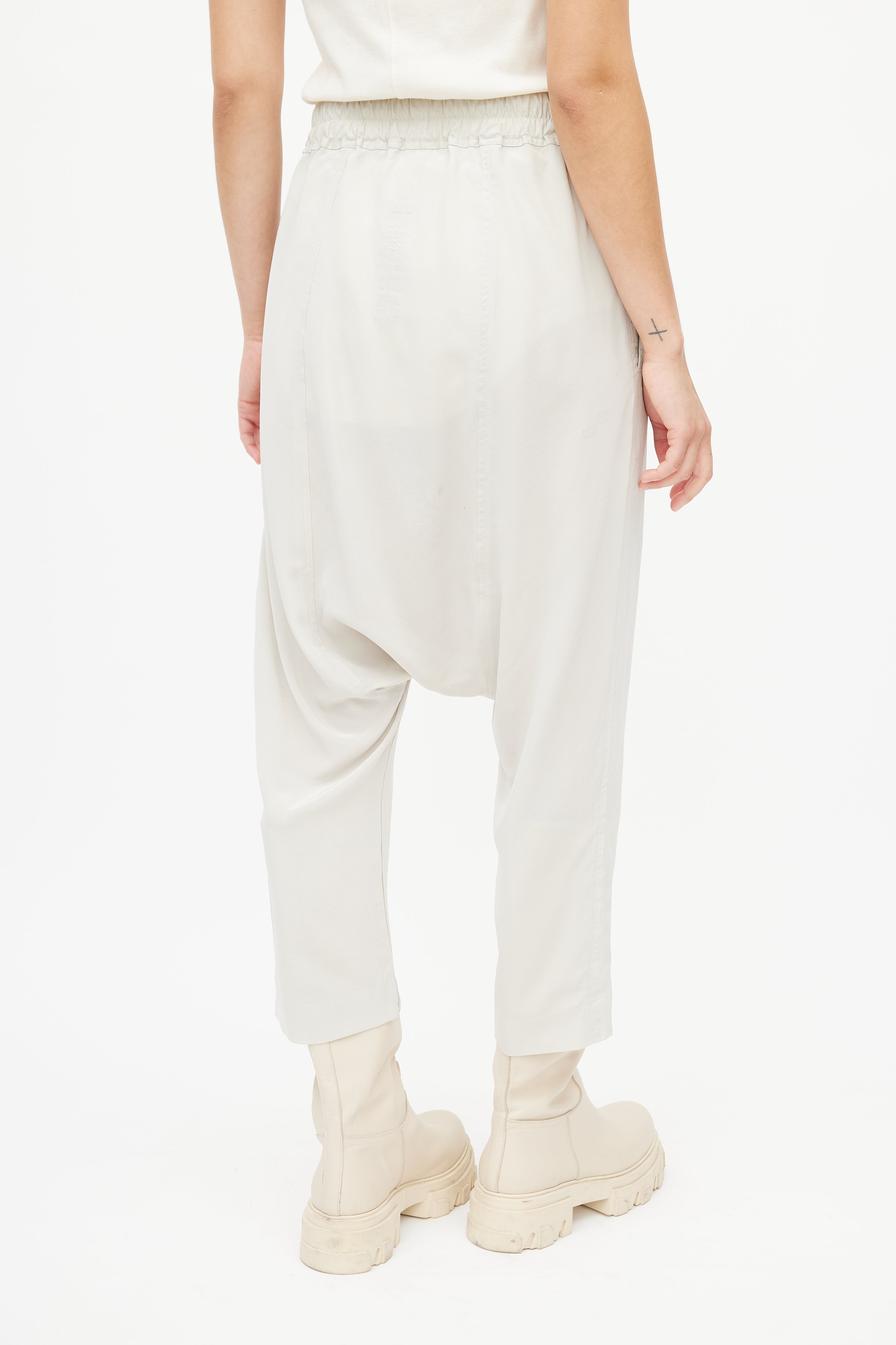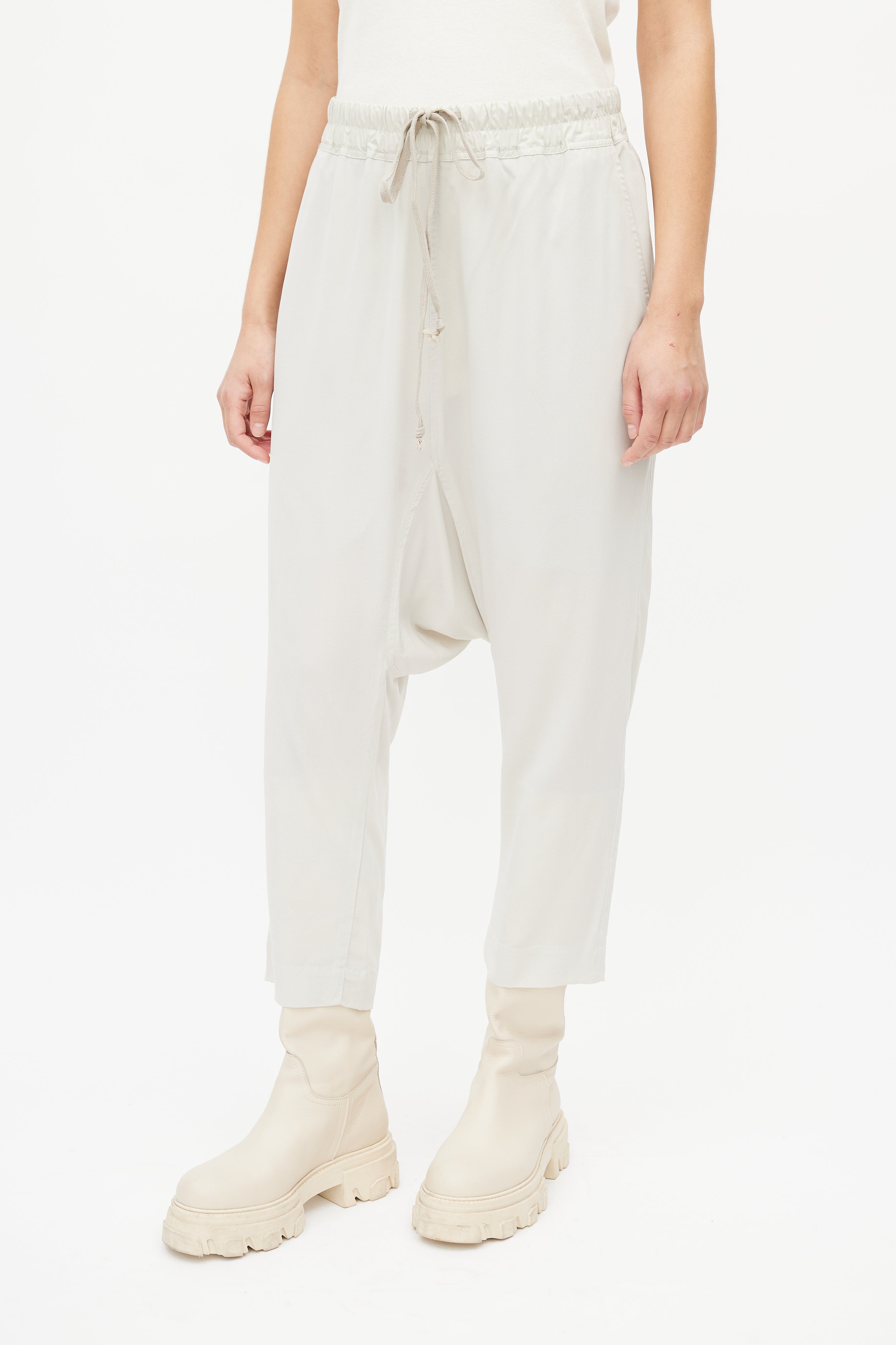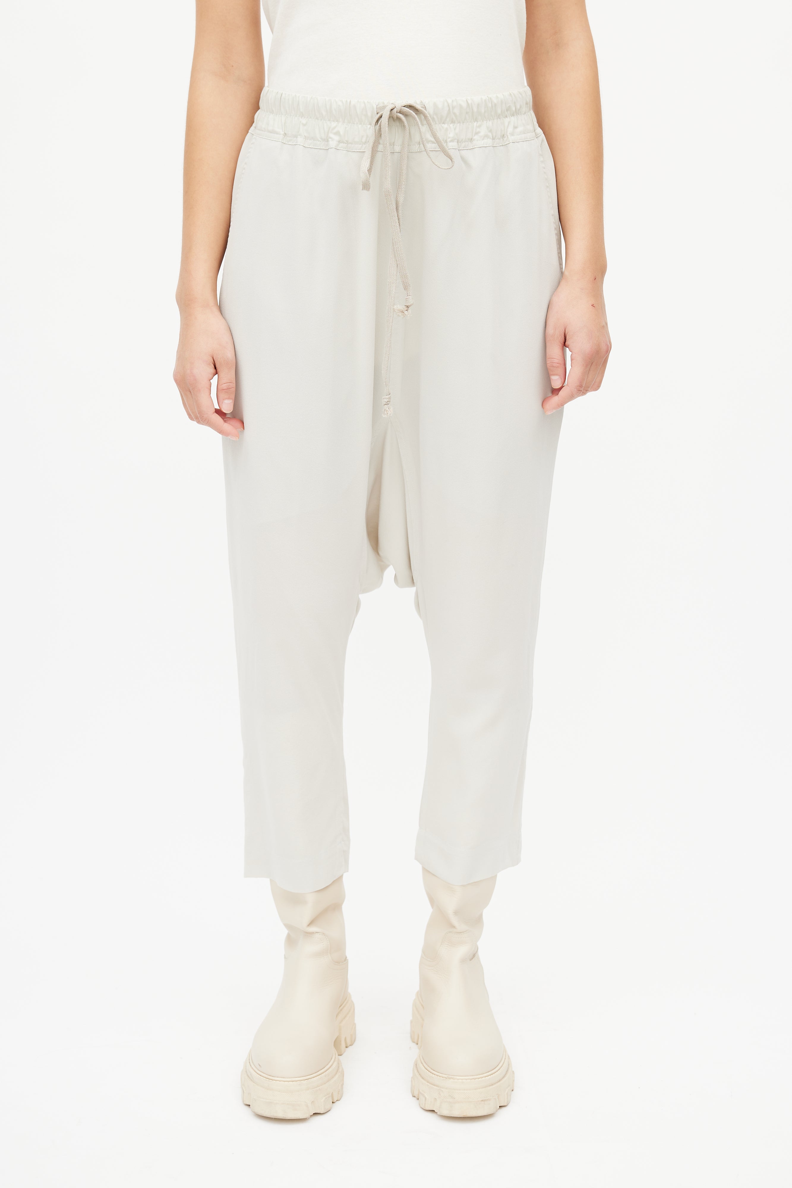 Pre-owned Spring/Summer 2019 Rick Owens grey Babel trousers featuring an elasticized drawstring waist, two slip pockets at hip, cropped leg, and drop seat.