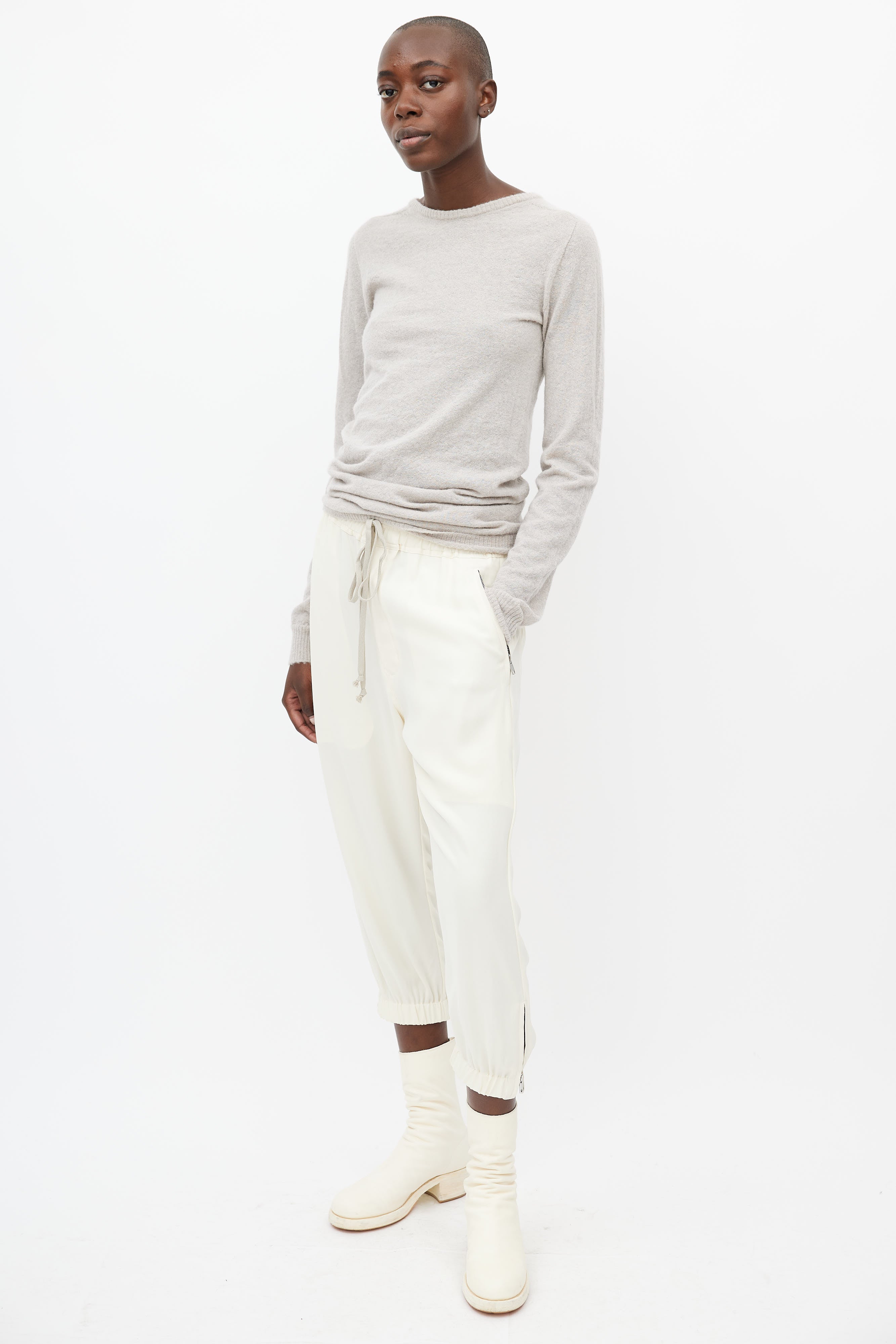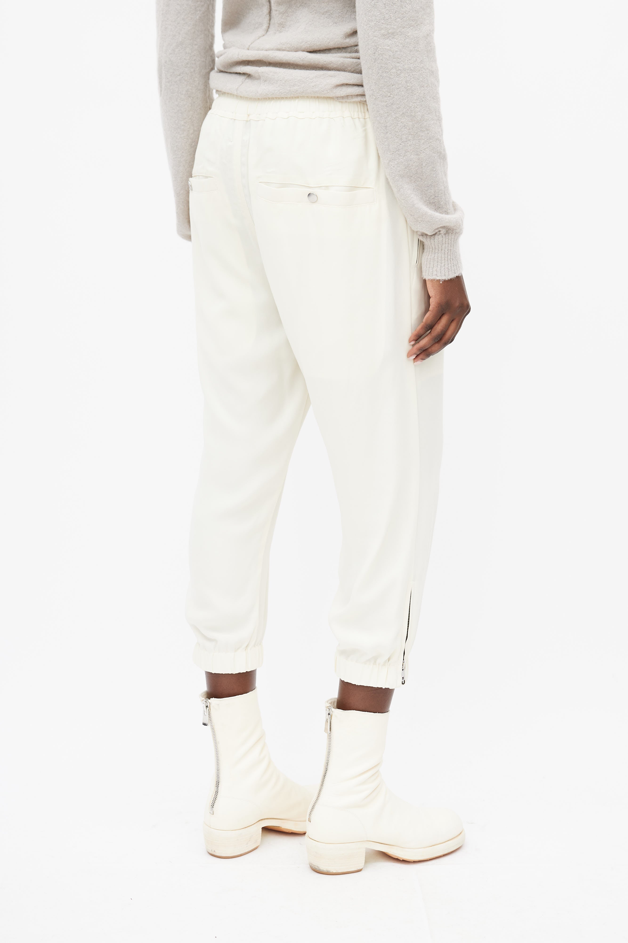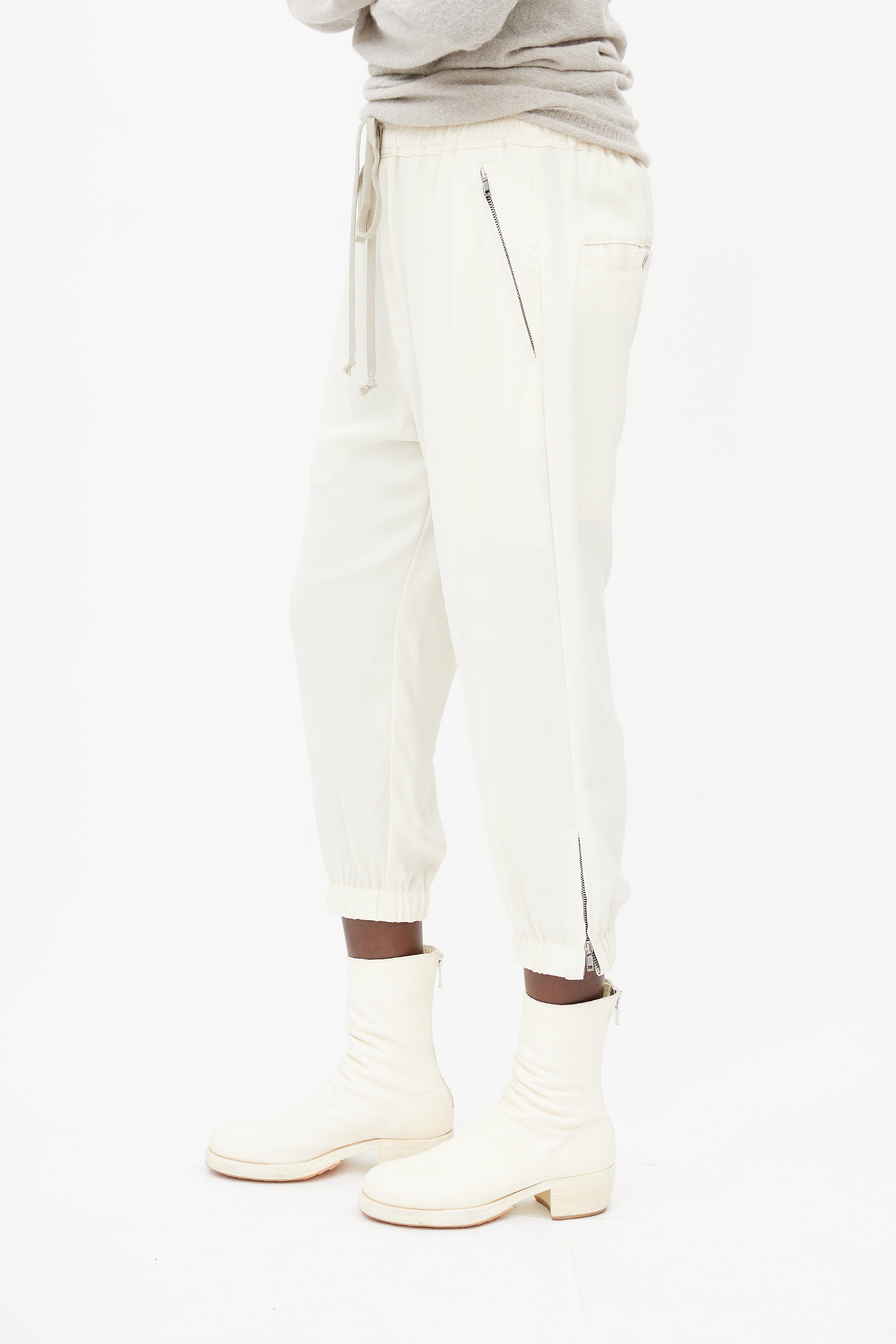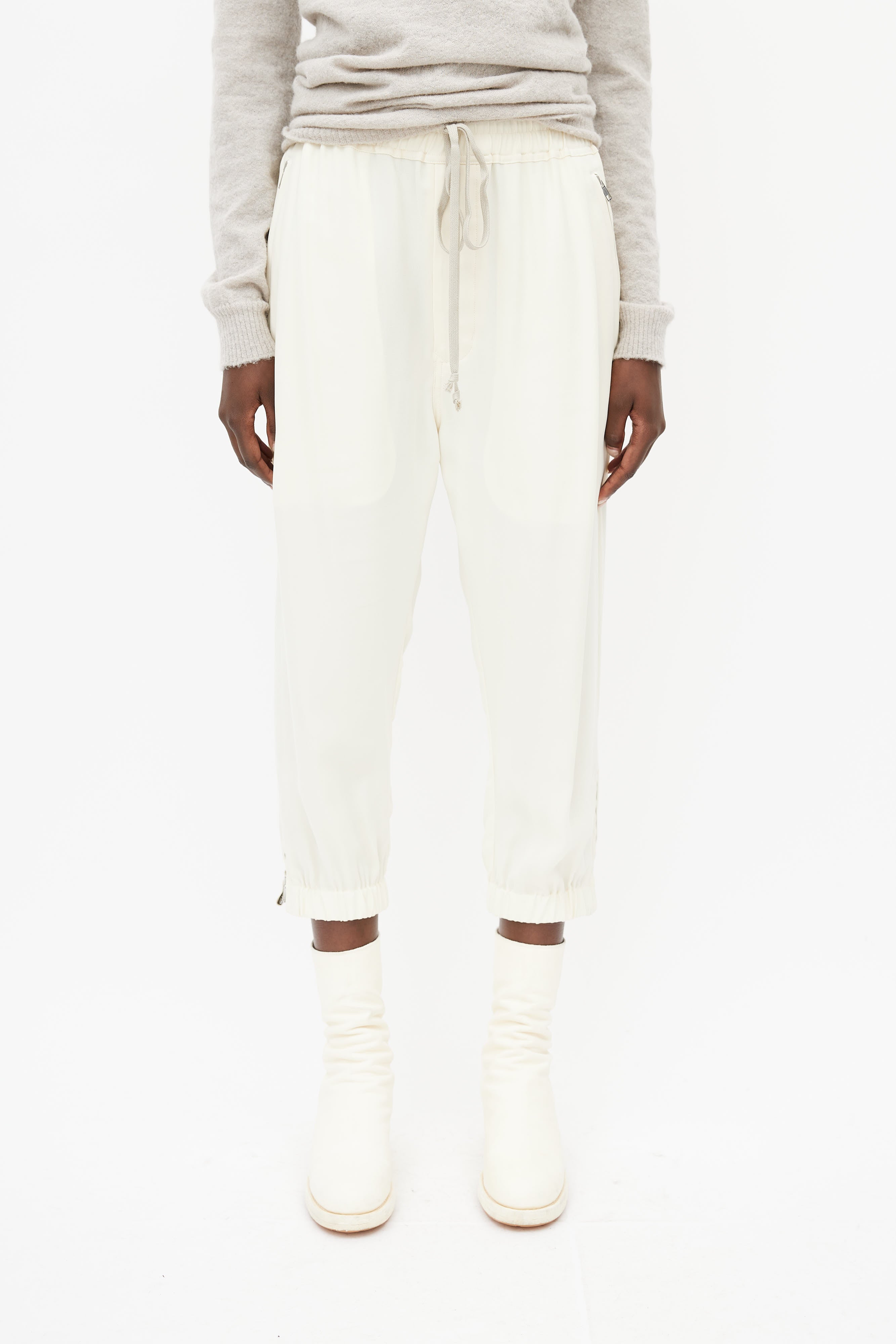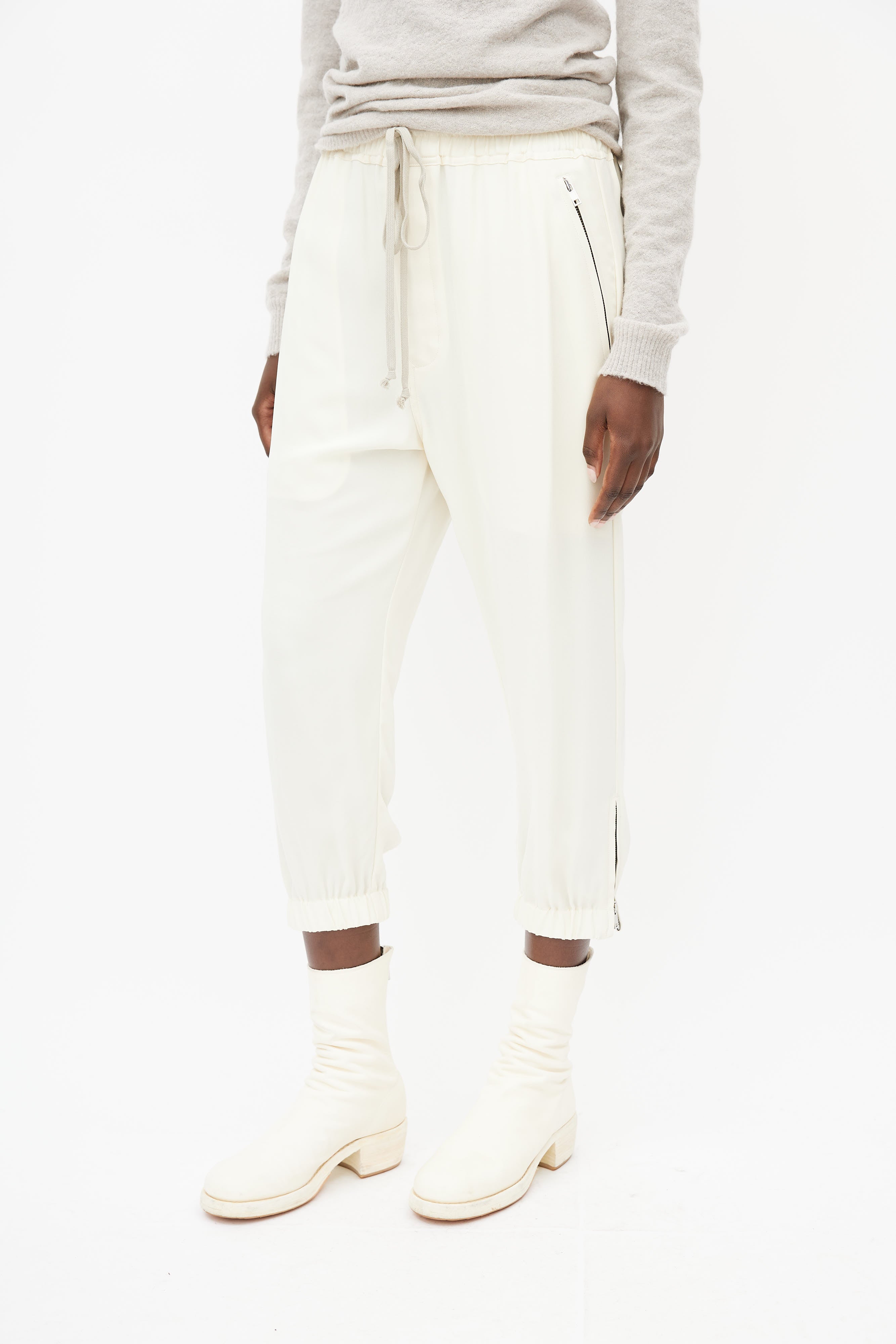 Pre-owned S/S 2022 Fogachine Rick Owens cream trousers featuring an elasticized drawstring waist, two zipped pockets at hip, two buttoned welt pockets at back, drop seat, cropped leg, elasticized hem with zip detail, and button fly closure.