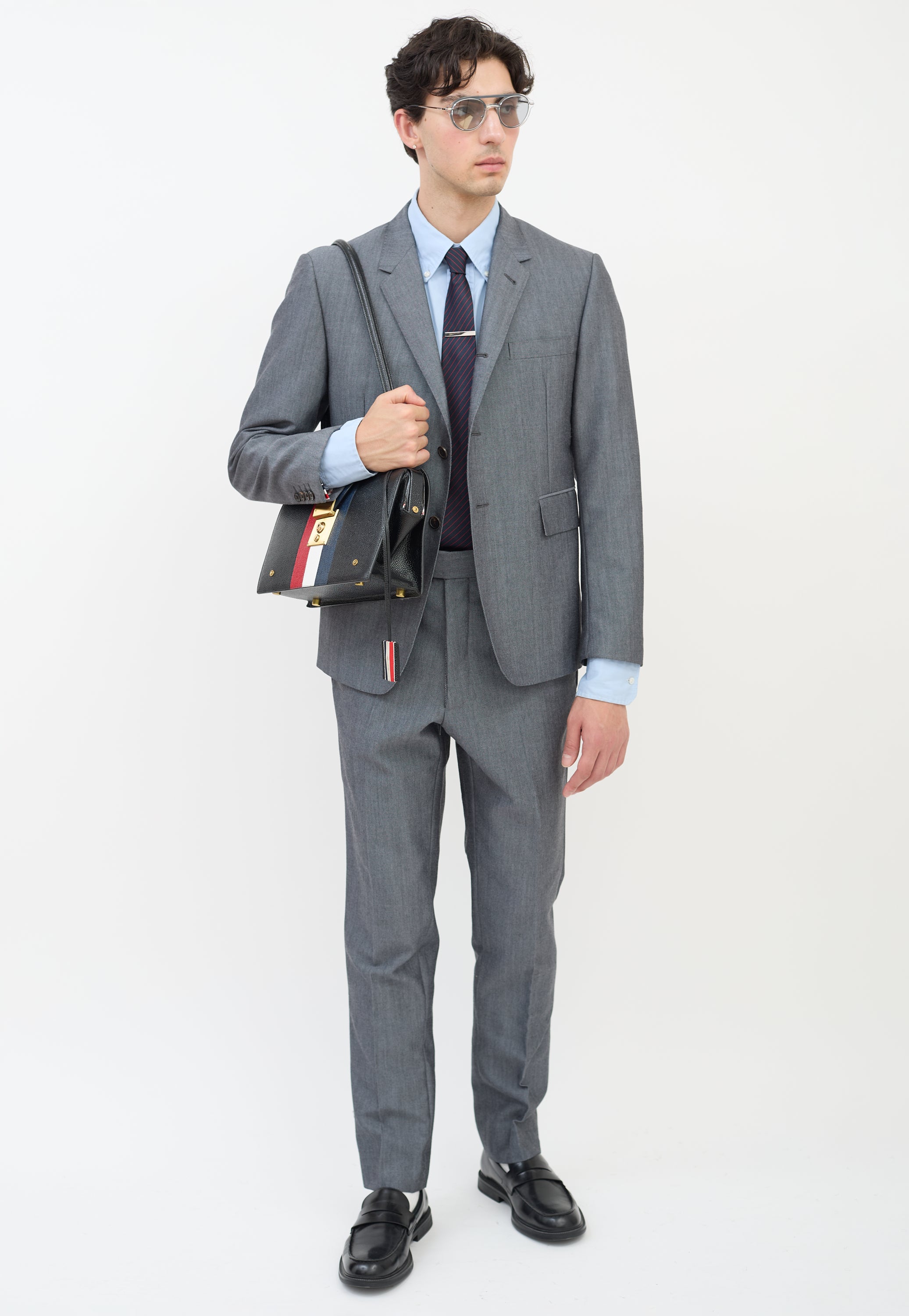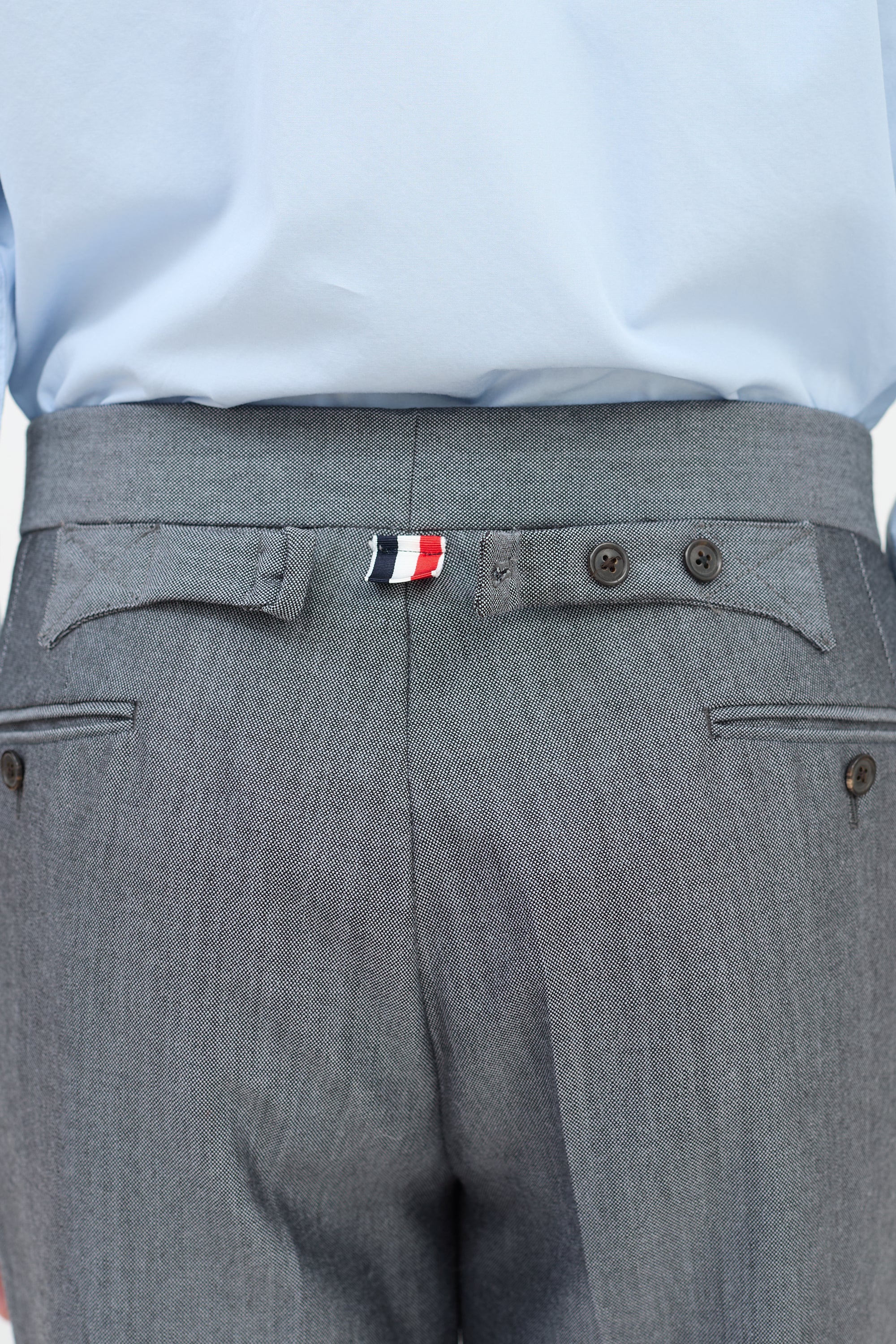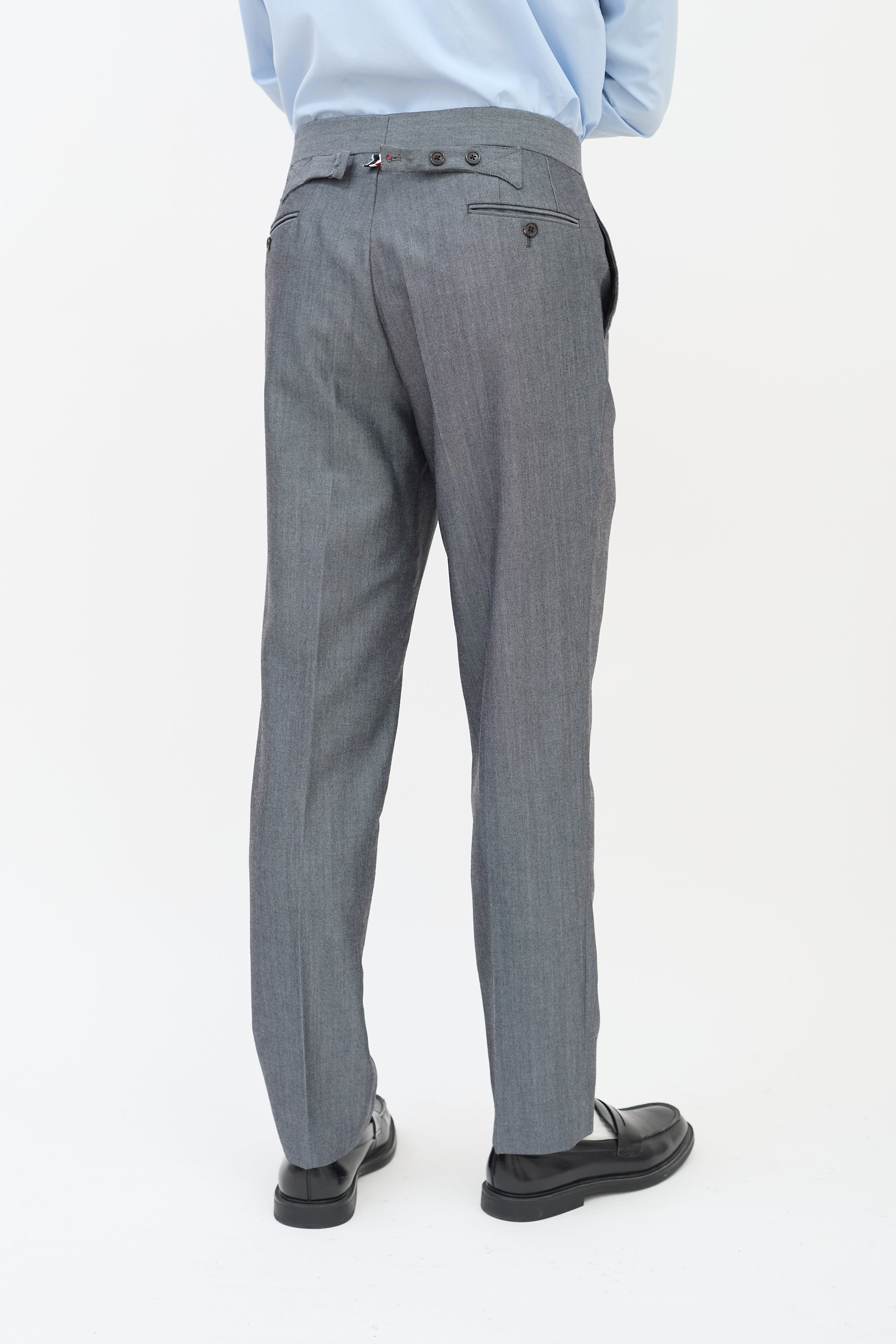 Pre-owned Thom Browne dark grey wool and mohair blend trousers featuring a high waist, dropped seat, tapered leg with creases, four pocket styling, signature tricolour grosgrain ribbon and adjuster at back waist, and button fly.