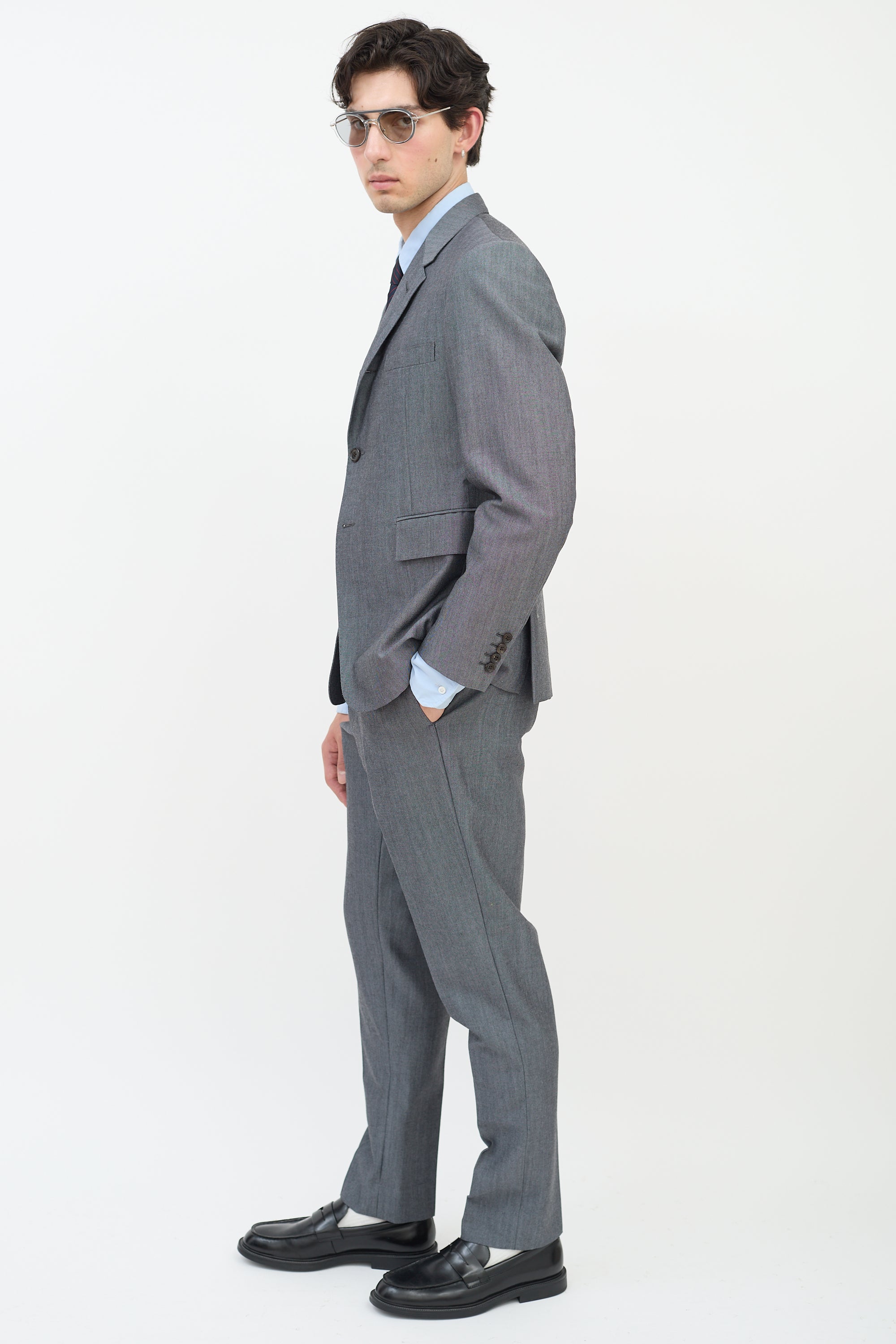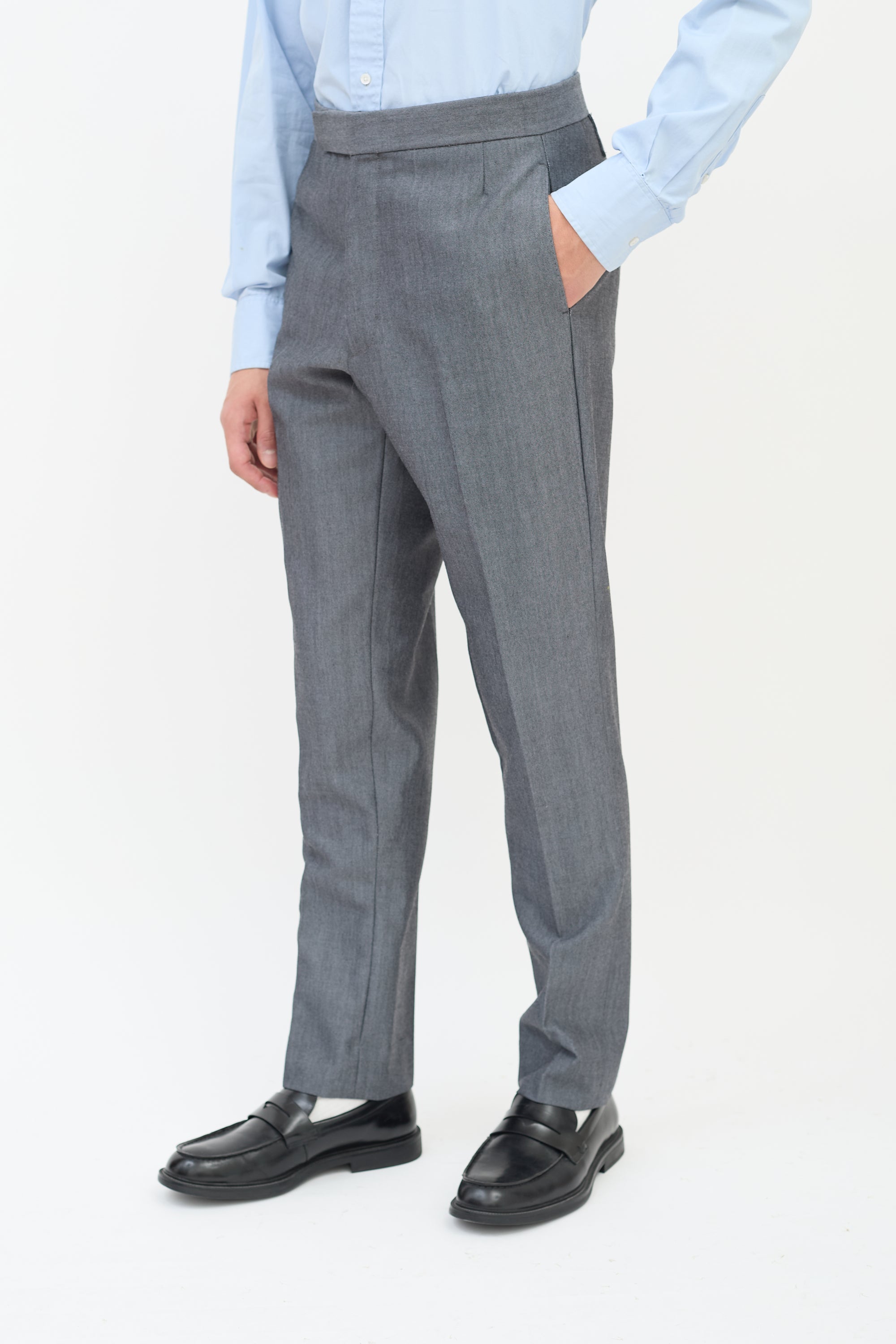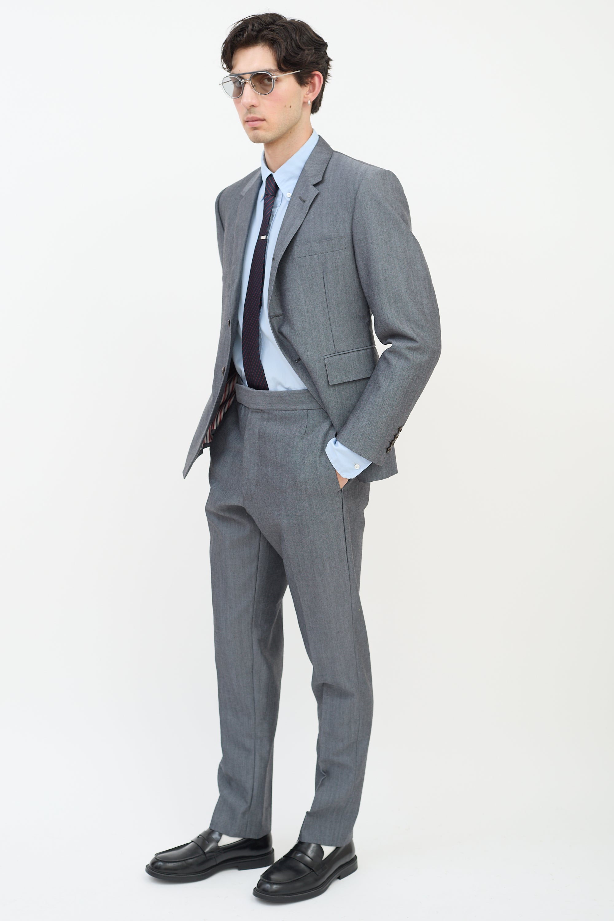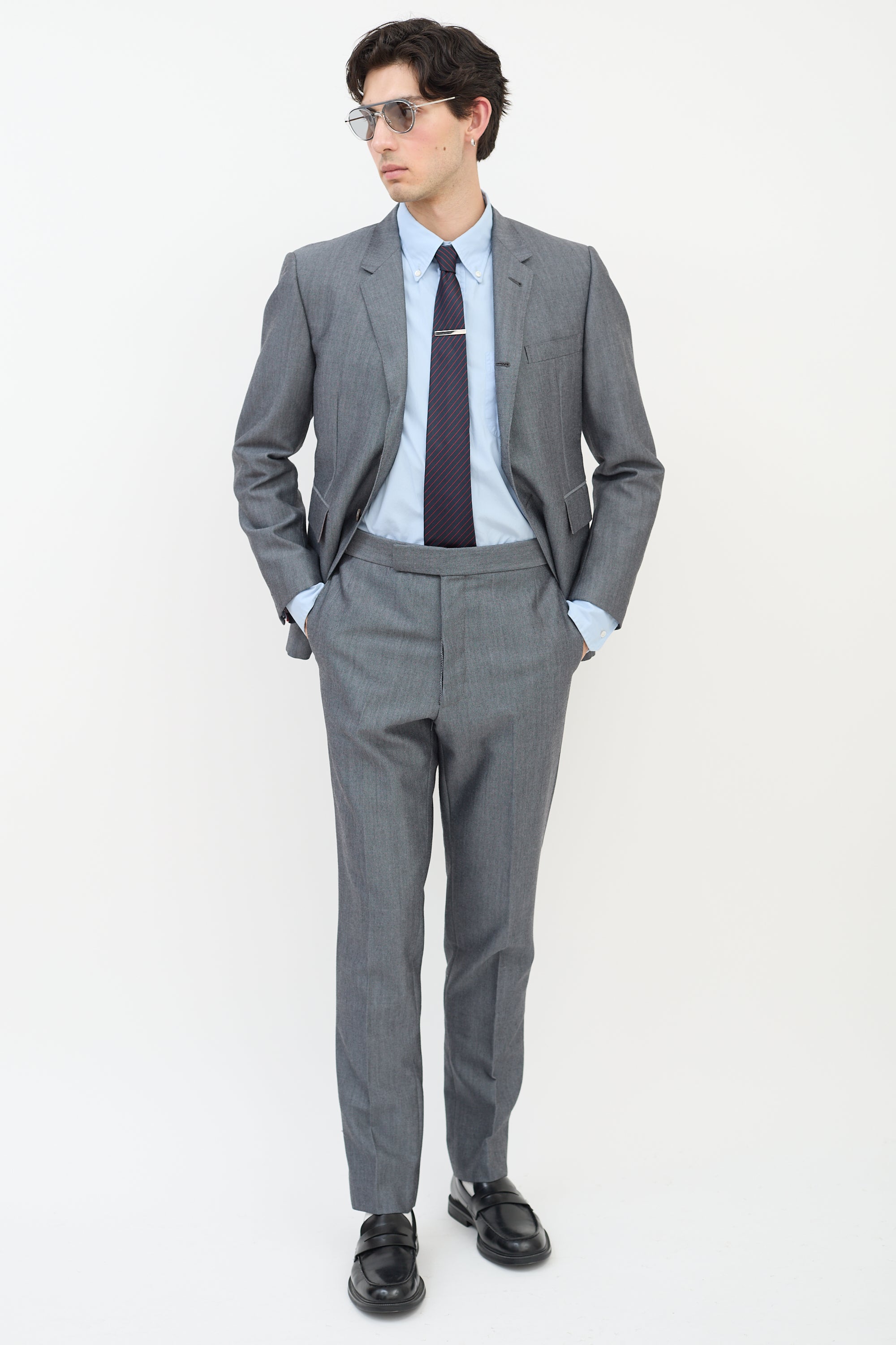Pre-owned Thom Browne dark grey wool and mohair blend trousers featuring a high waist, dropped seat, tapered leg with creases, four pocket styling, signature tricolour grosgrain ribbon and adjuster at back waist, and button fly.