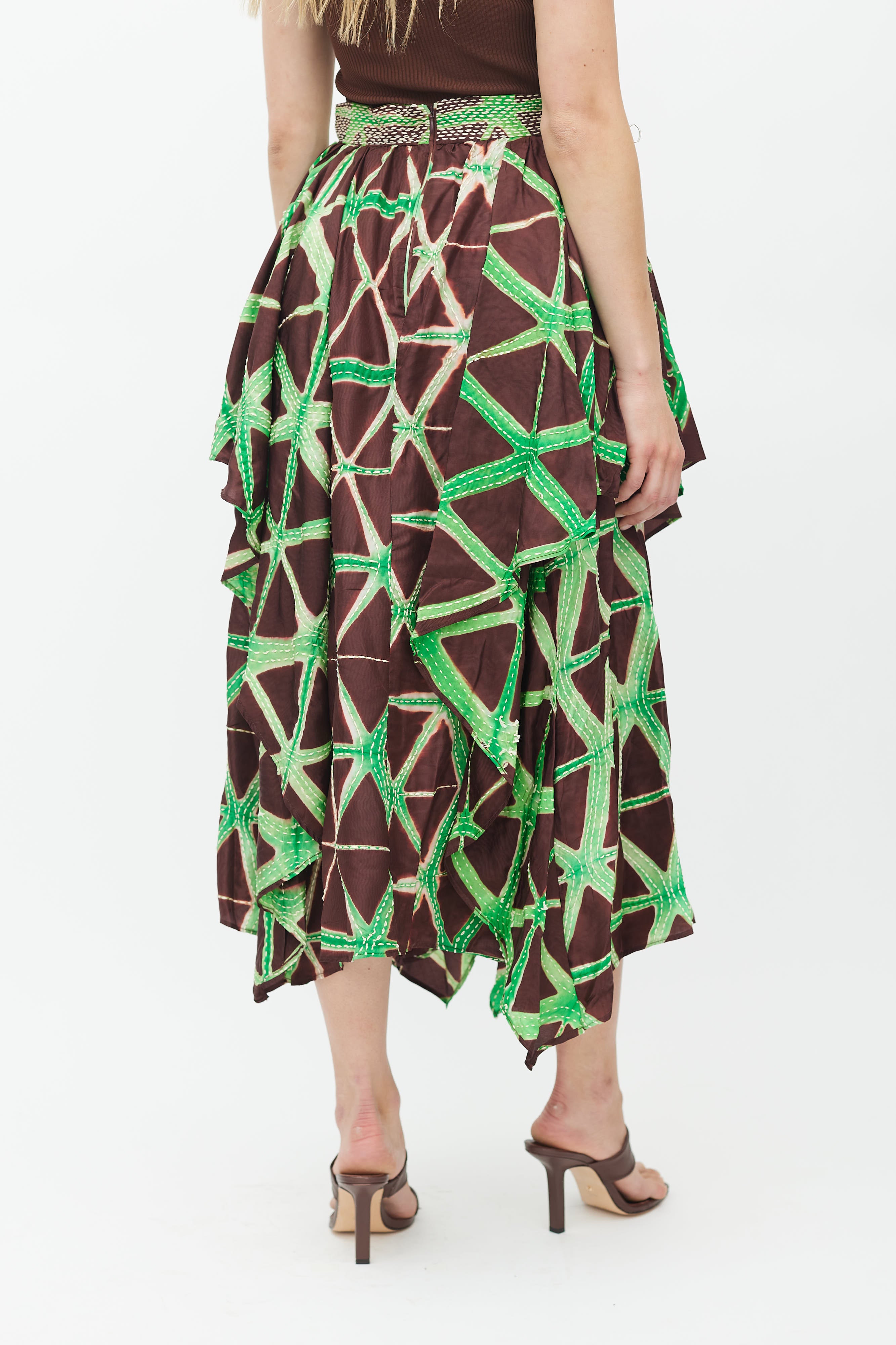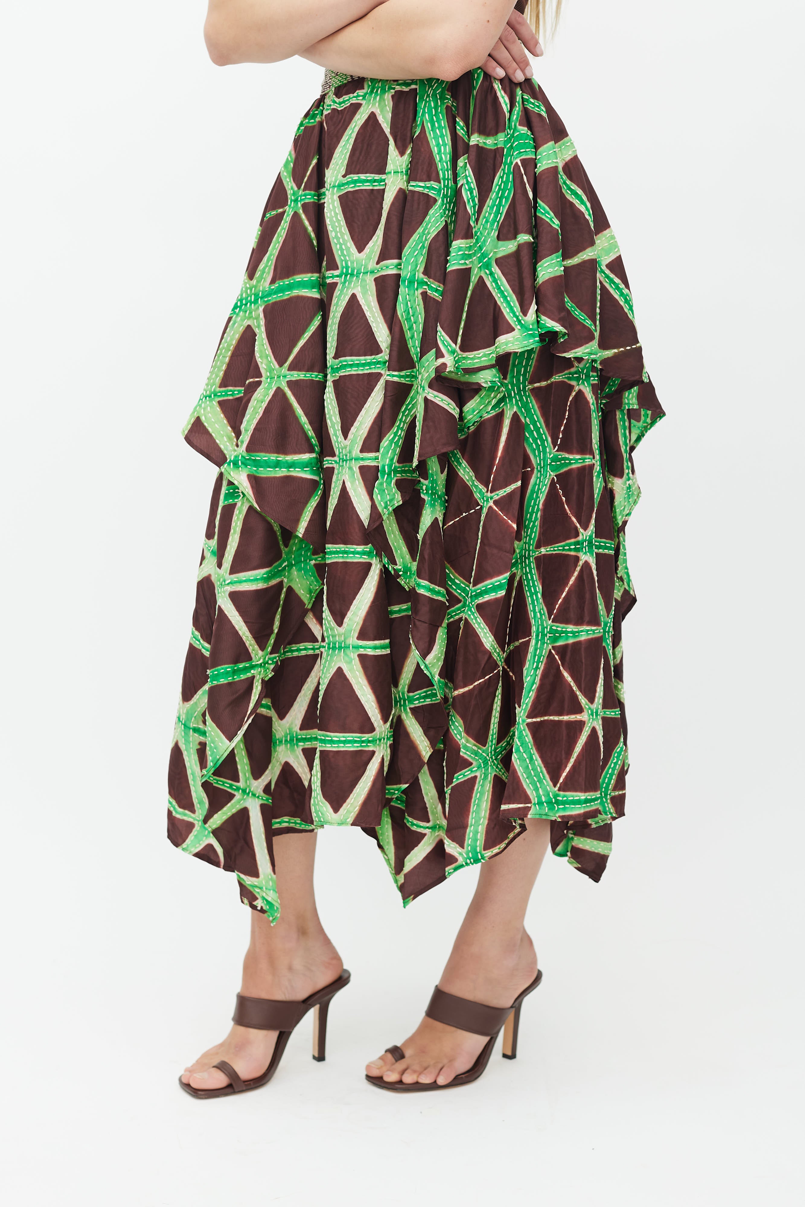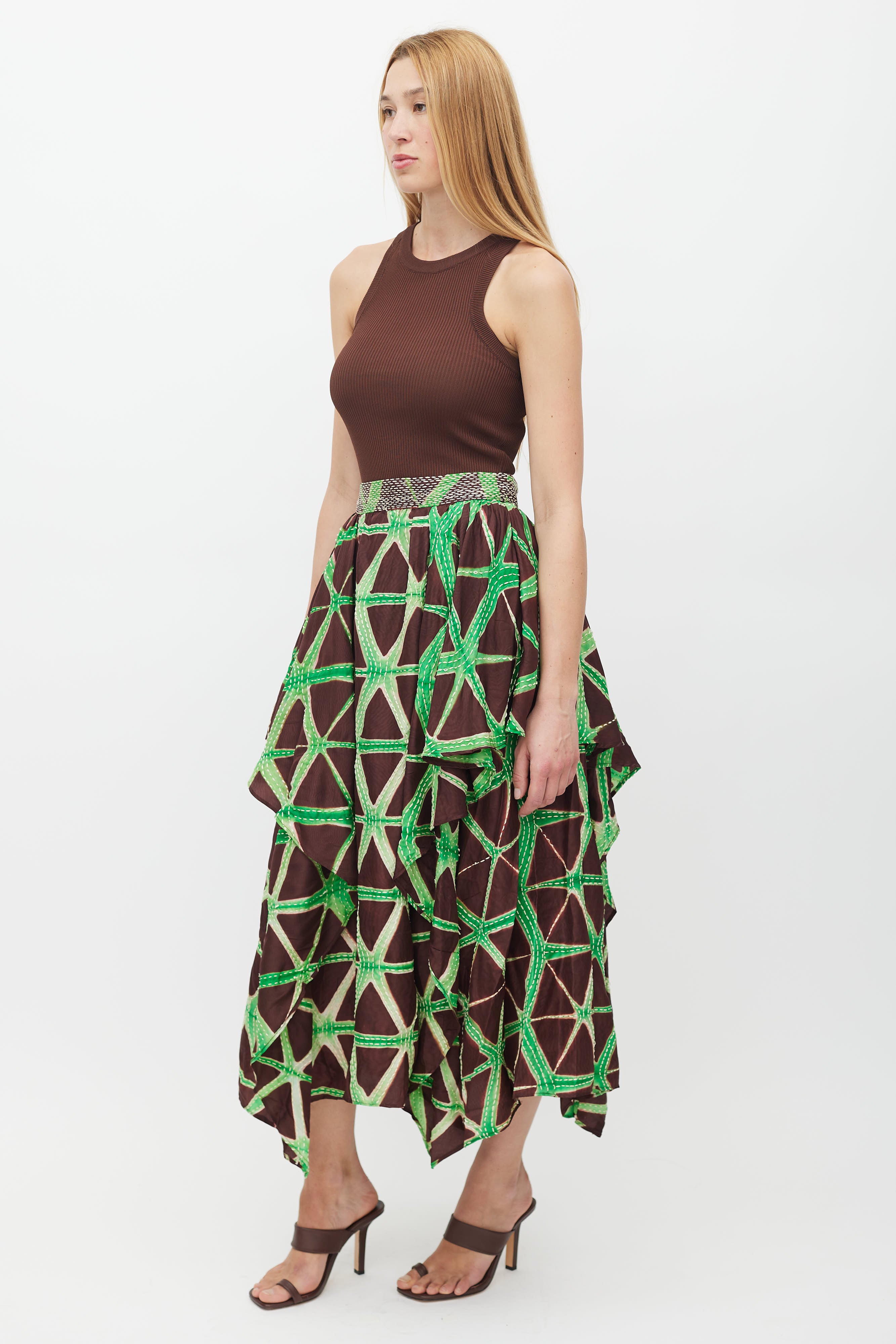 Fall/Winter 2023 Ulla Johnson brown Savita skirt featuring a green pattern throughout, ruffled trim, stitch detailing, and zip at back with hook and eye closure.