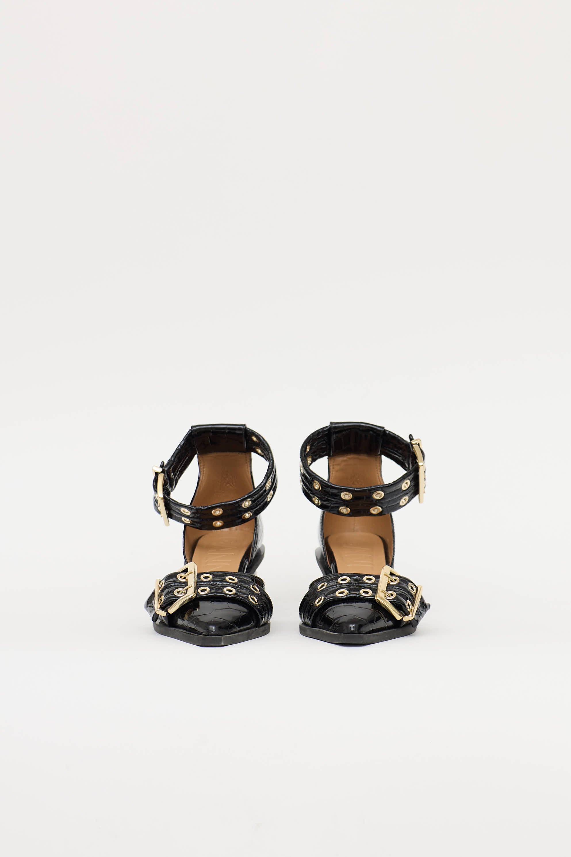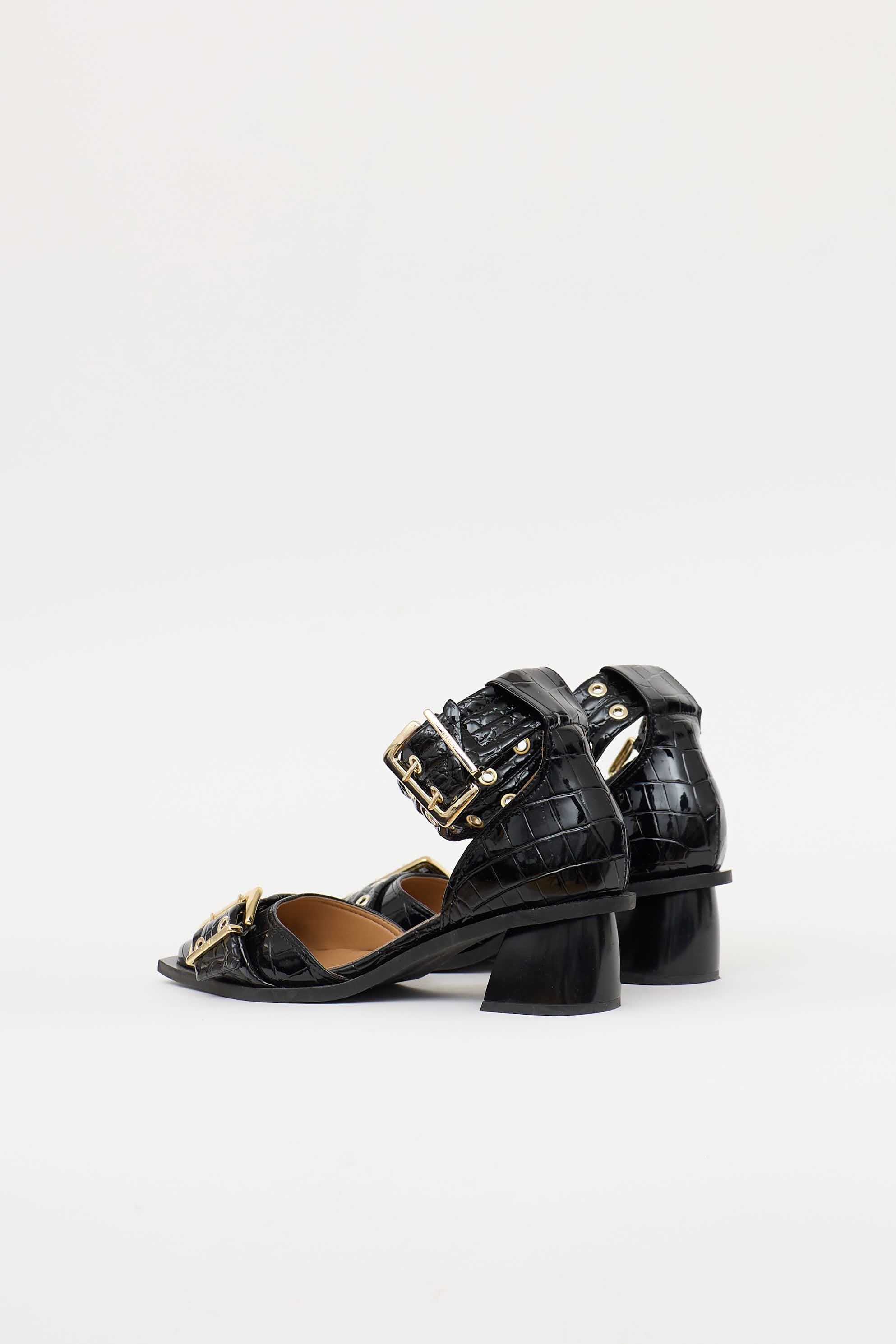 Pre-owned Ganni black faux leather croc embossed Feminine Buckle Open pump featuring pointed toe, gold tone hard wear, adjustable buckle straps at vamp and ankle, and block heel.