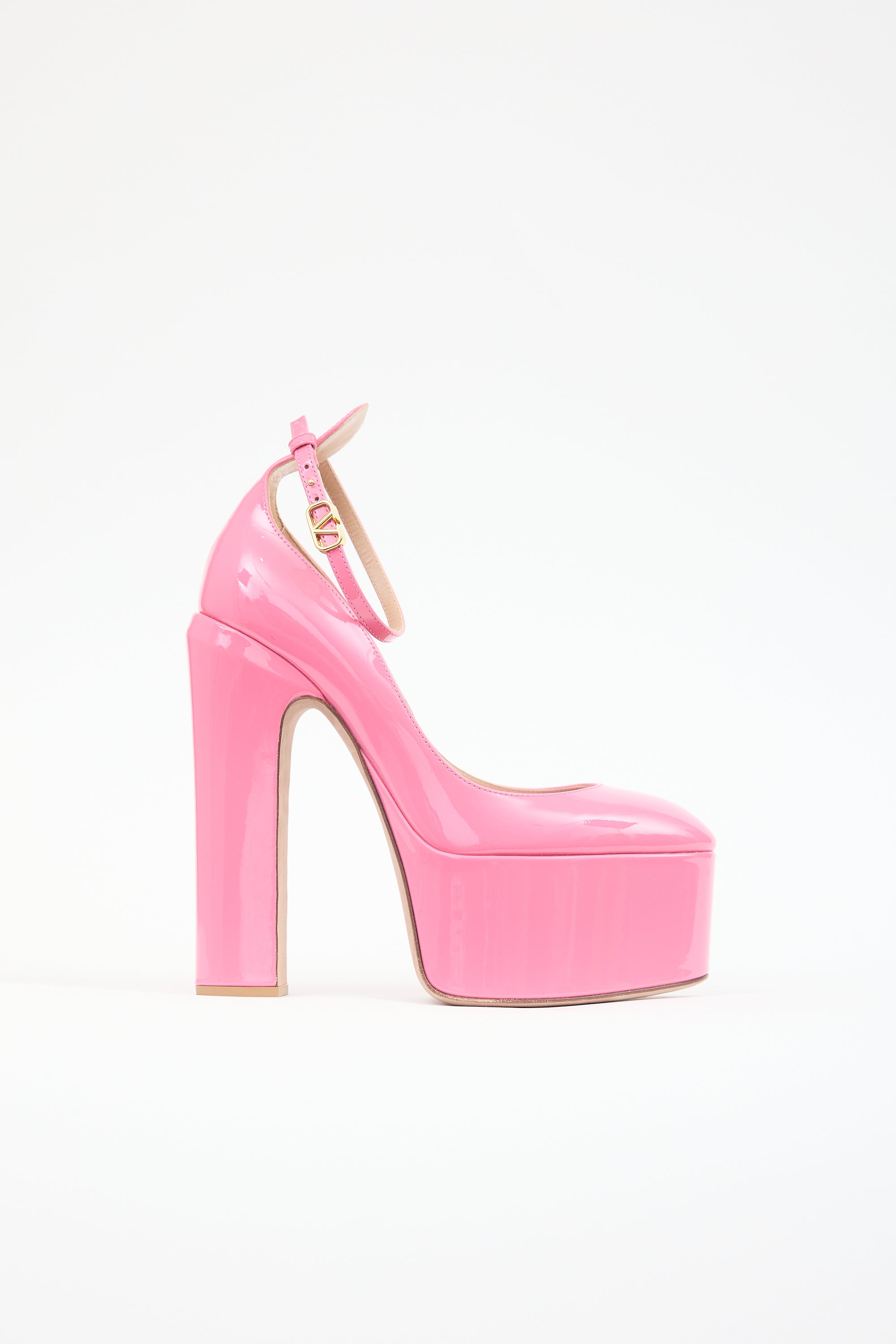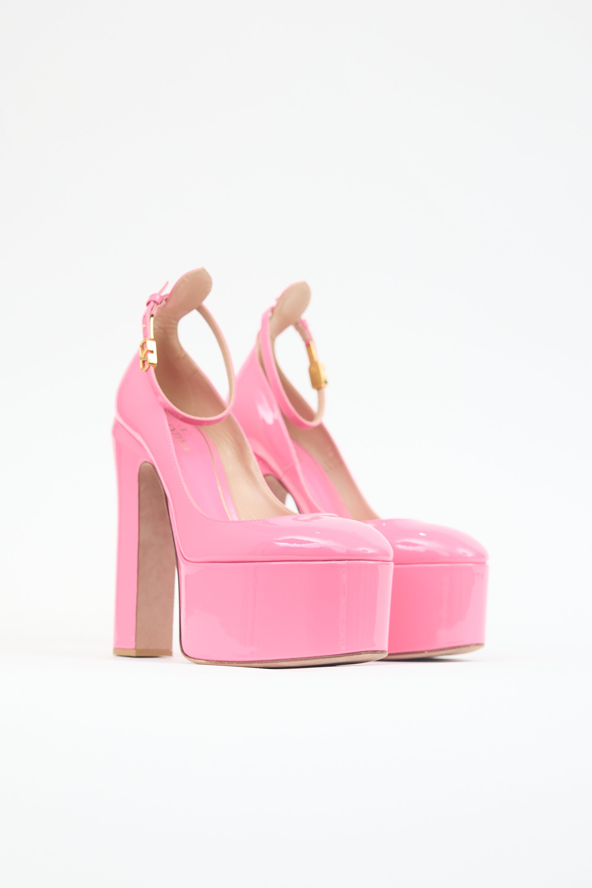 Pre-owned Valentino pink patent leather Tan-Go pumps featuring a rounded toe, adjustable ankle strap with gold tone V-logo hardware, covered platform, and block heel.