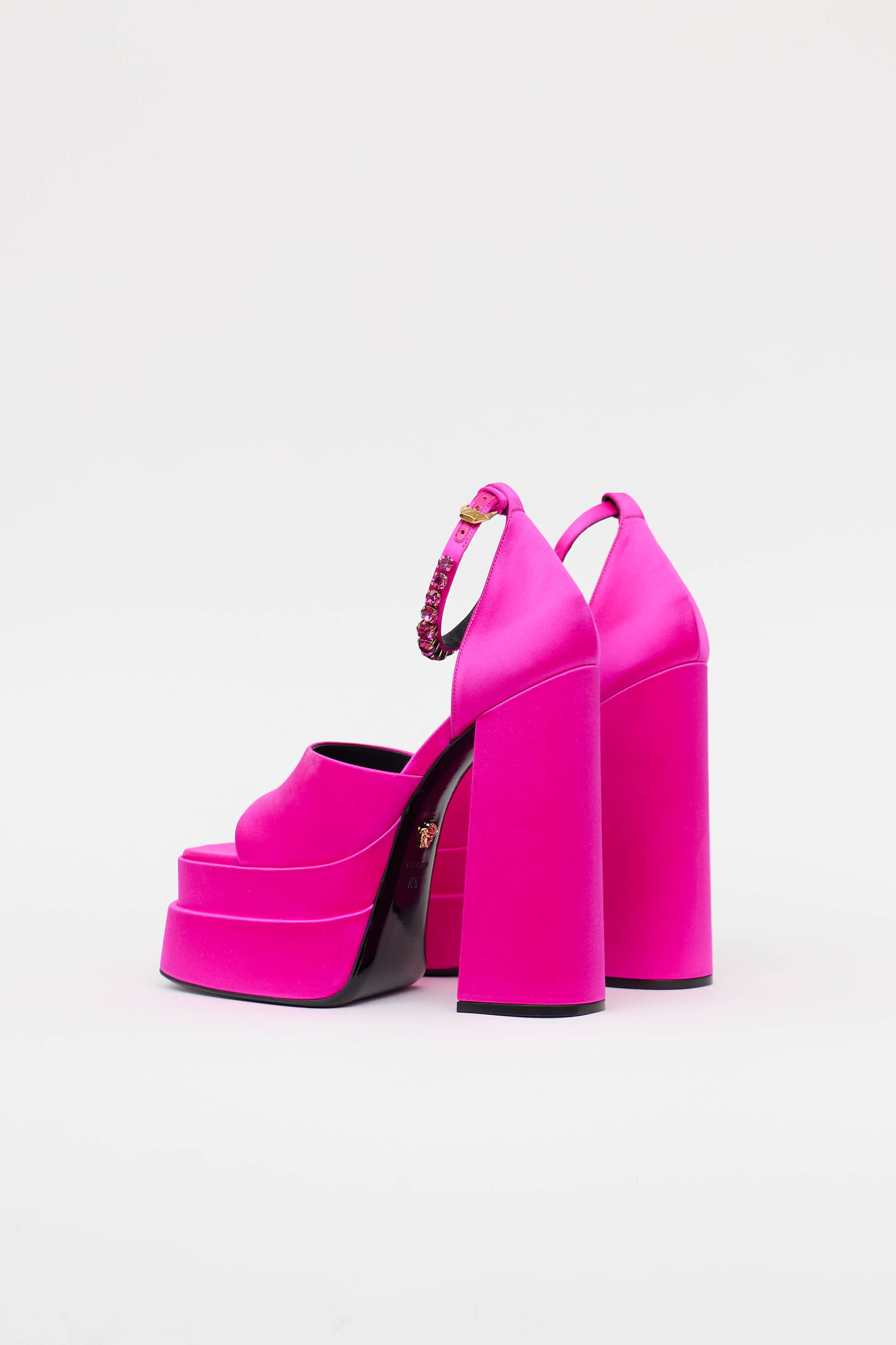 Pre-owned Versace pink satin Aevitas pumps featuring square toe, platform midsole, covered block heel, and adjustable ankle strap with gold tone Medusa charm and crystal embellishments.