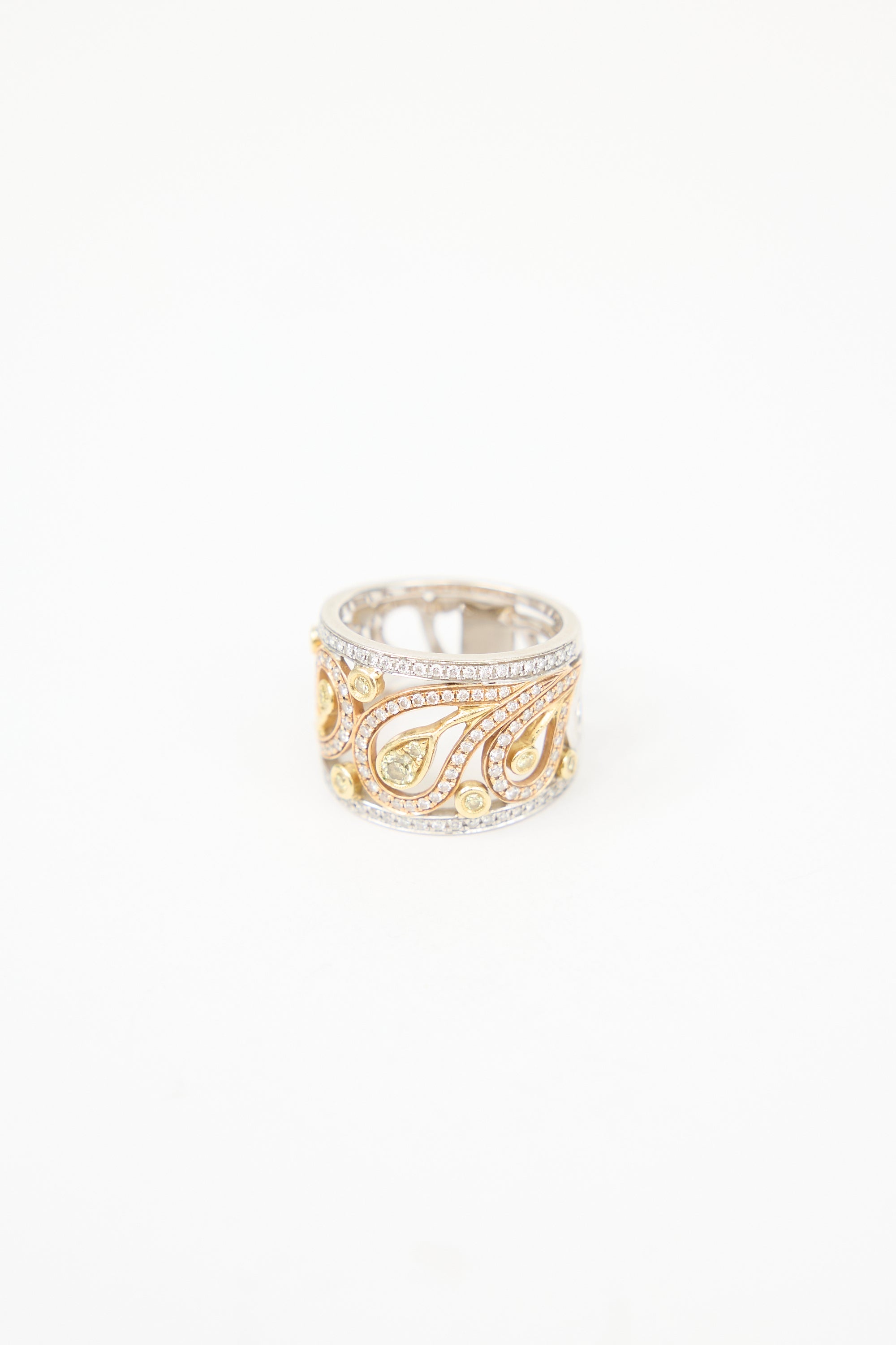 Pre-owned 18K yellow, white, and rose gold ring featuring paisley motif, rhodium plate finish, nine natural round brilliant cut diamonds with bezel set, and 117 natural round brilliant cut diamonds in prong set. Includes certificate of appraisal.