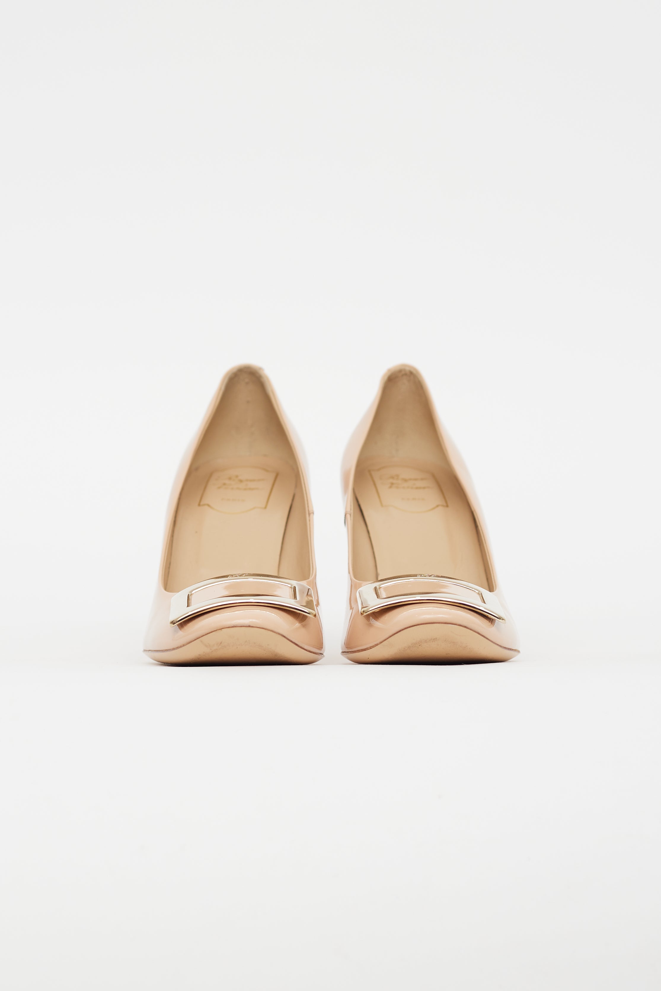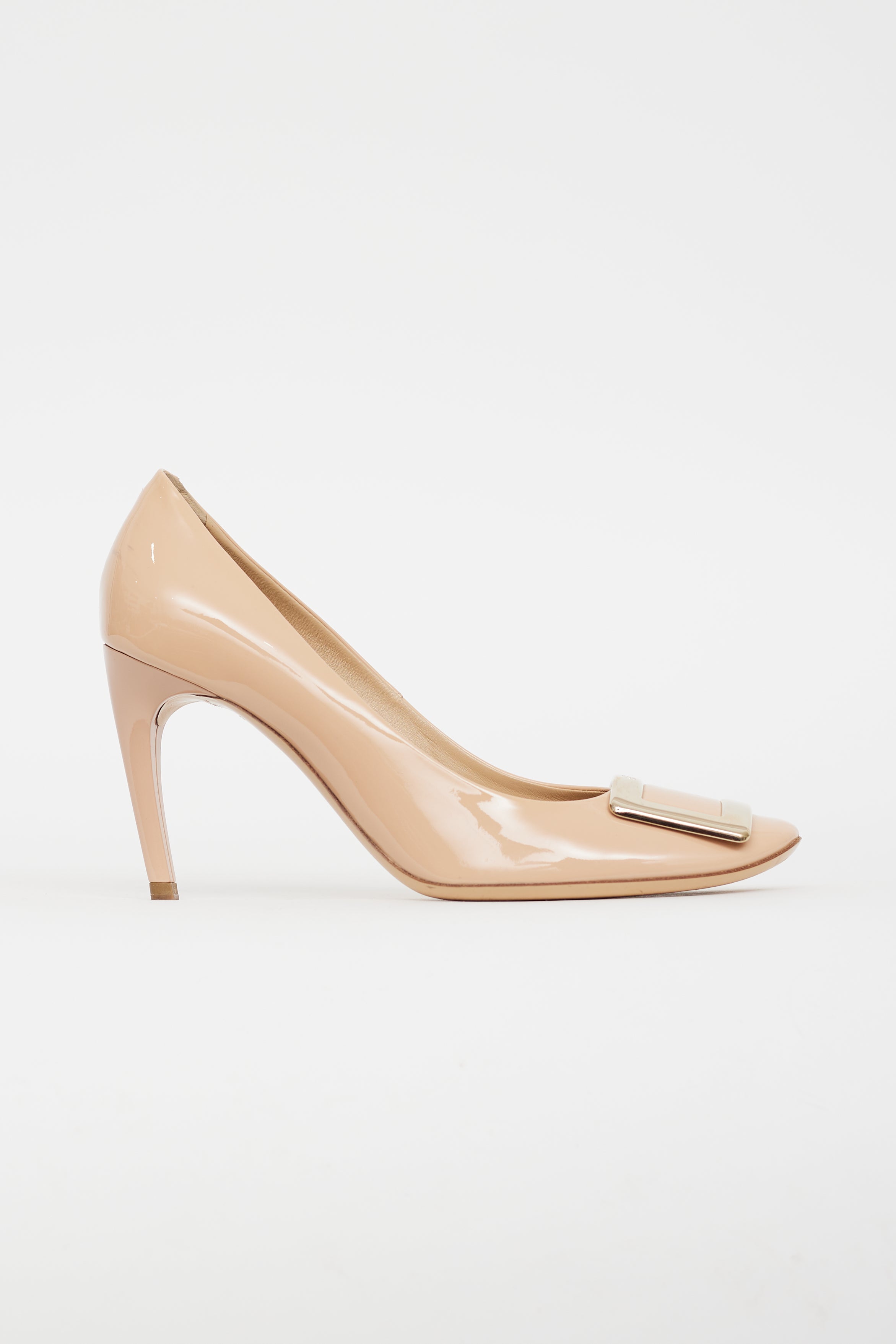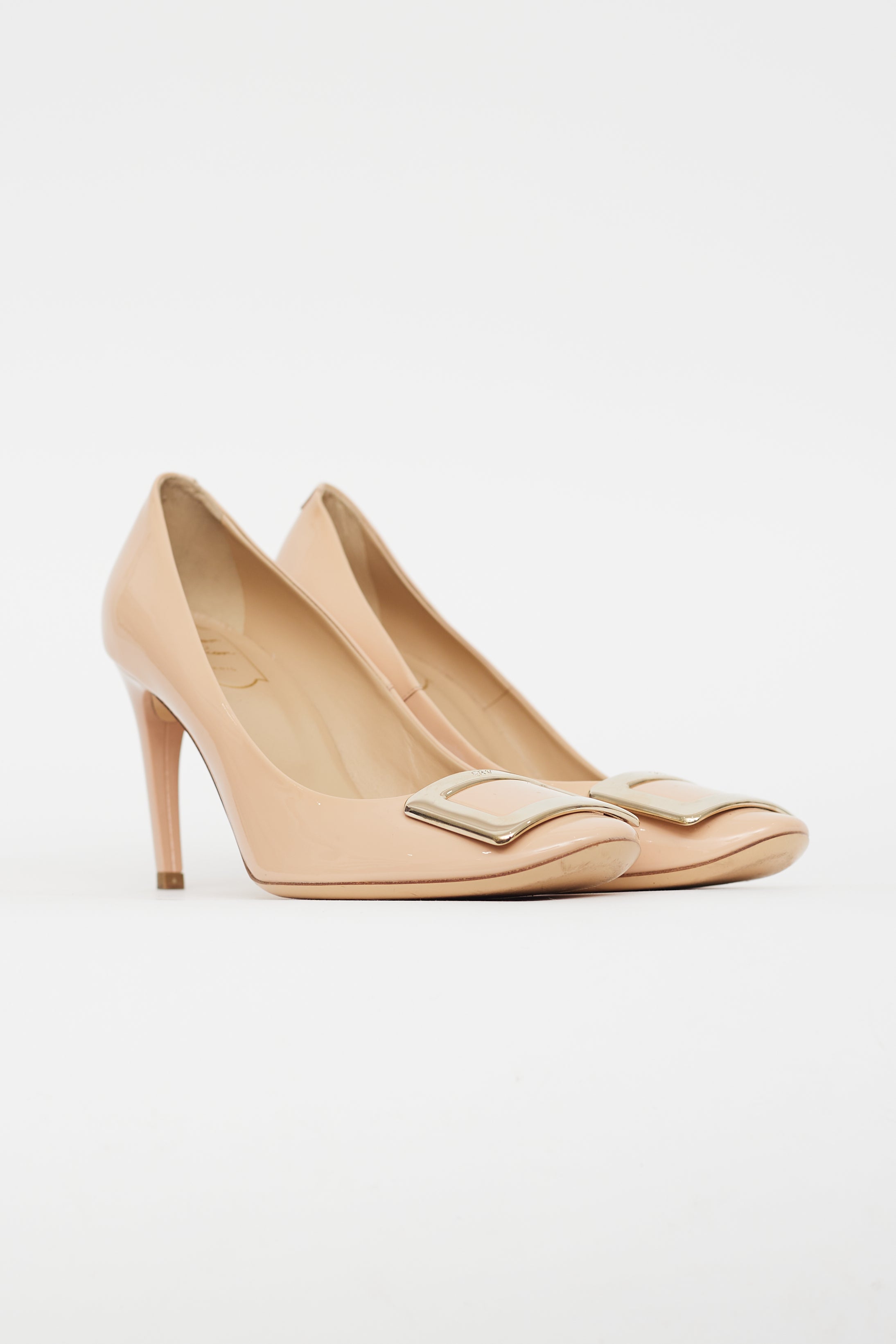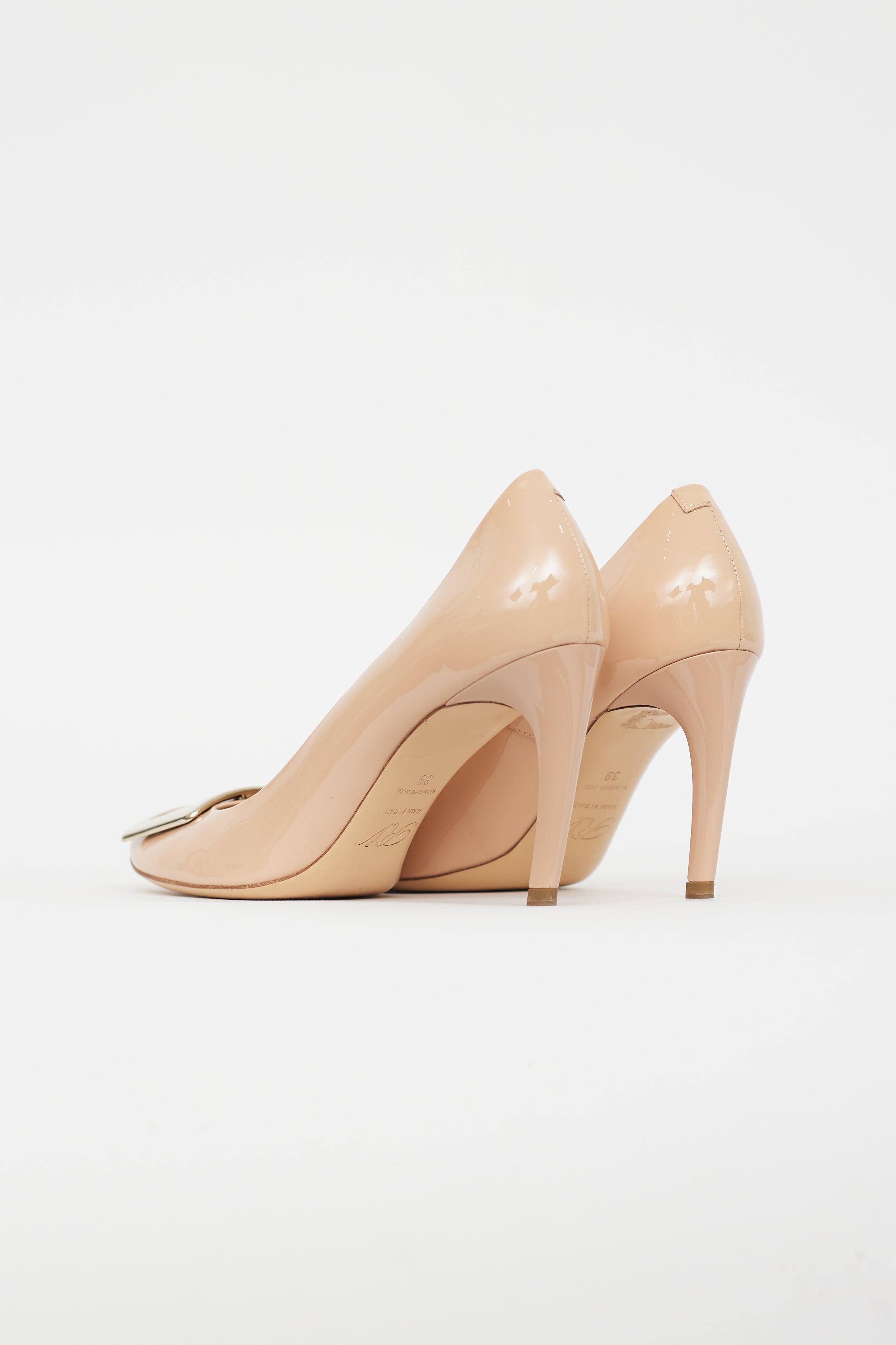 Pre-owned Roger Vivier beige patent leather pumps featuring round toe, large gold tone buckle with engraved logo at toe box, covered stiletto heel, and leather insoles.