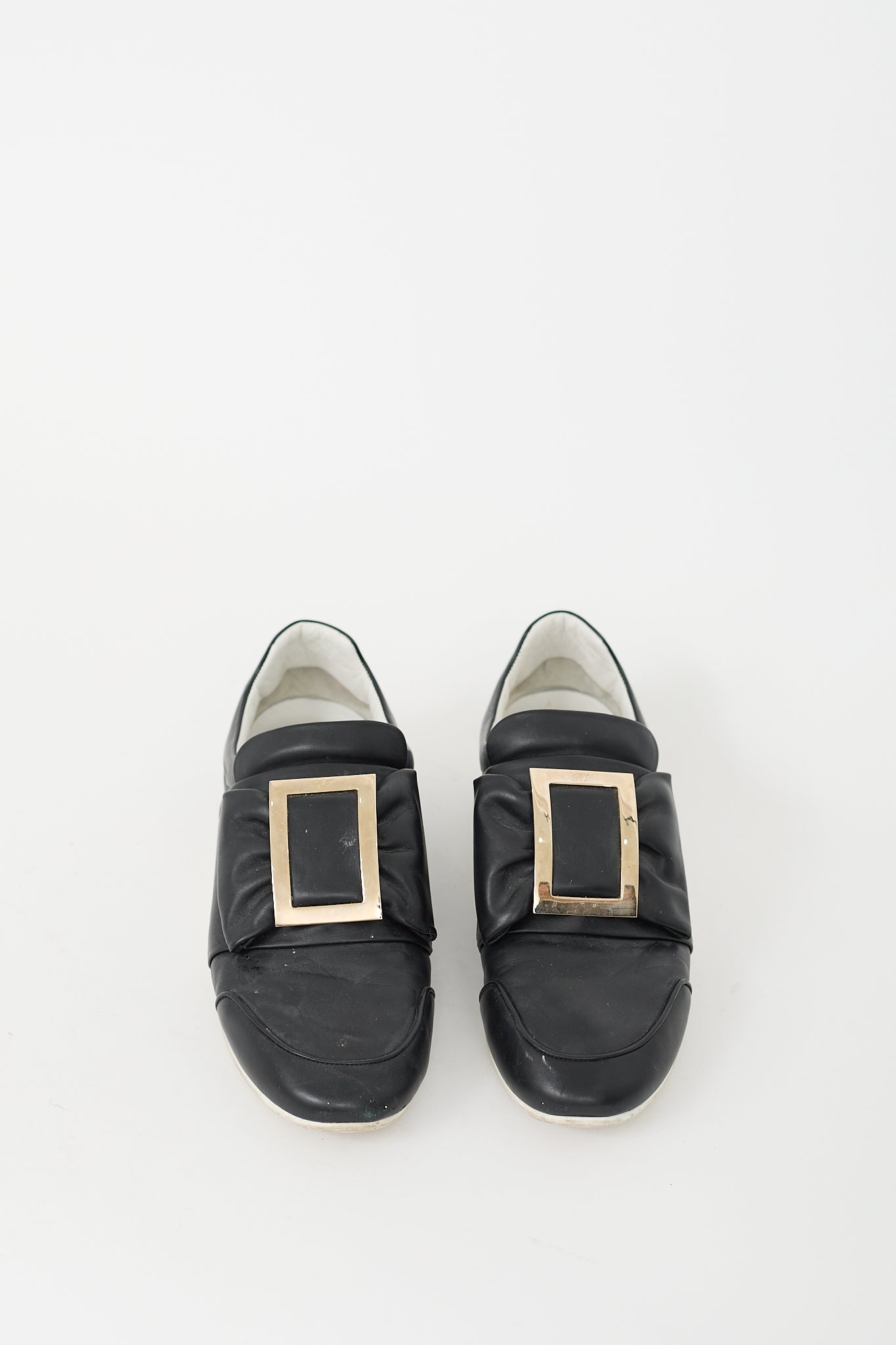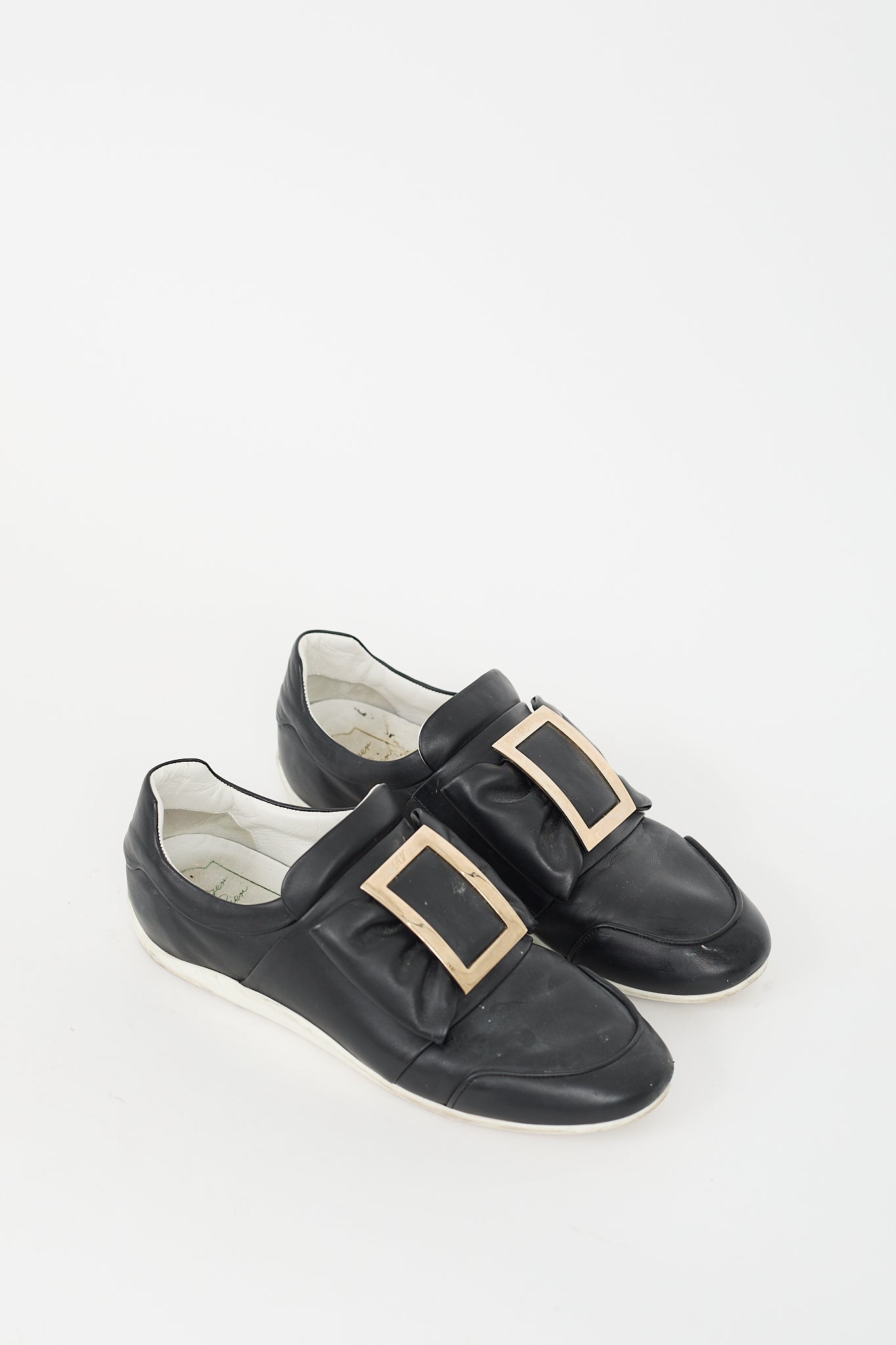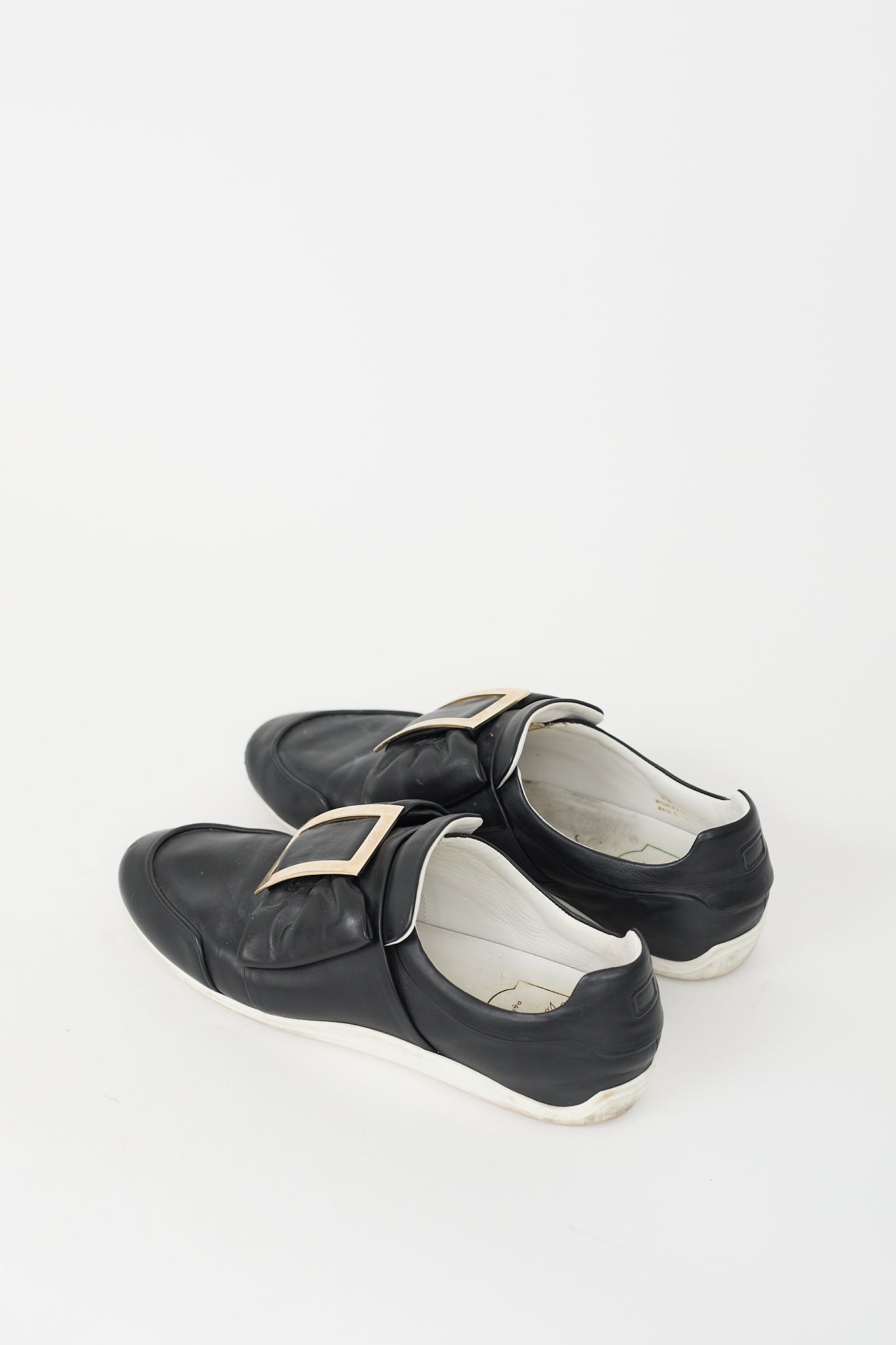 Pre-owned Roger Vivier black leather sneakers featuring rounded toe, bow with silver tone buckle at upper, slip on entry, and rubber outsole.