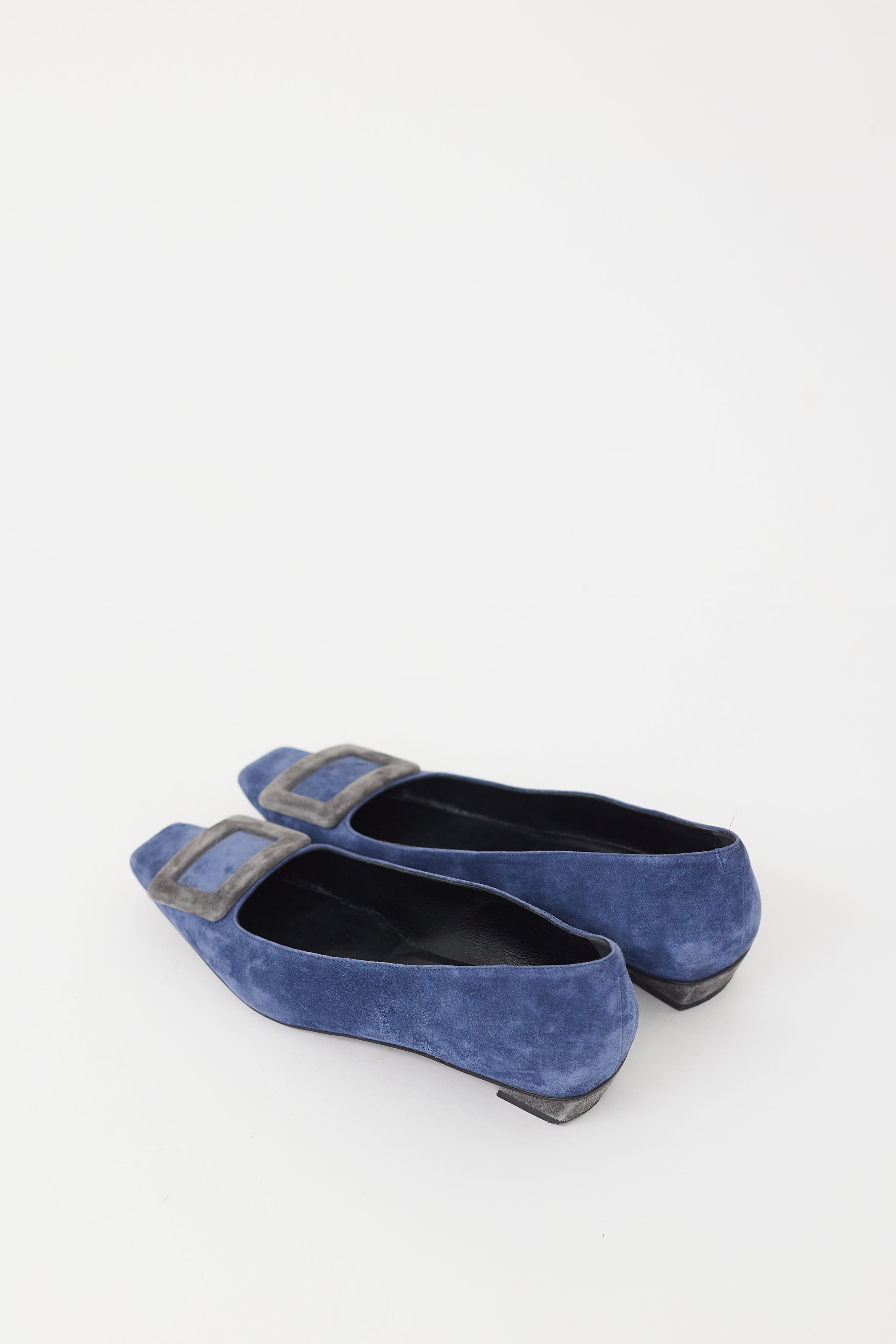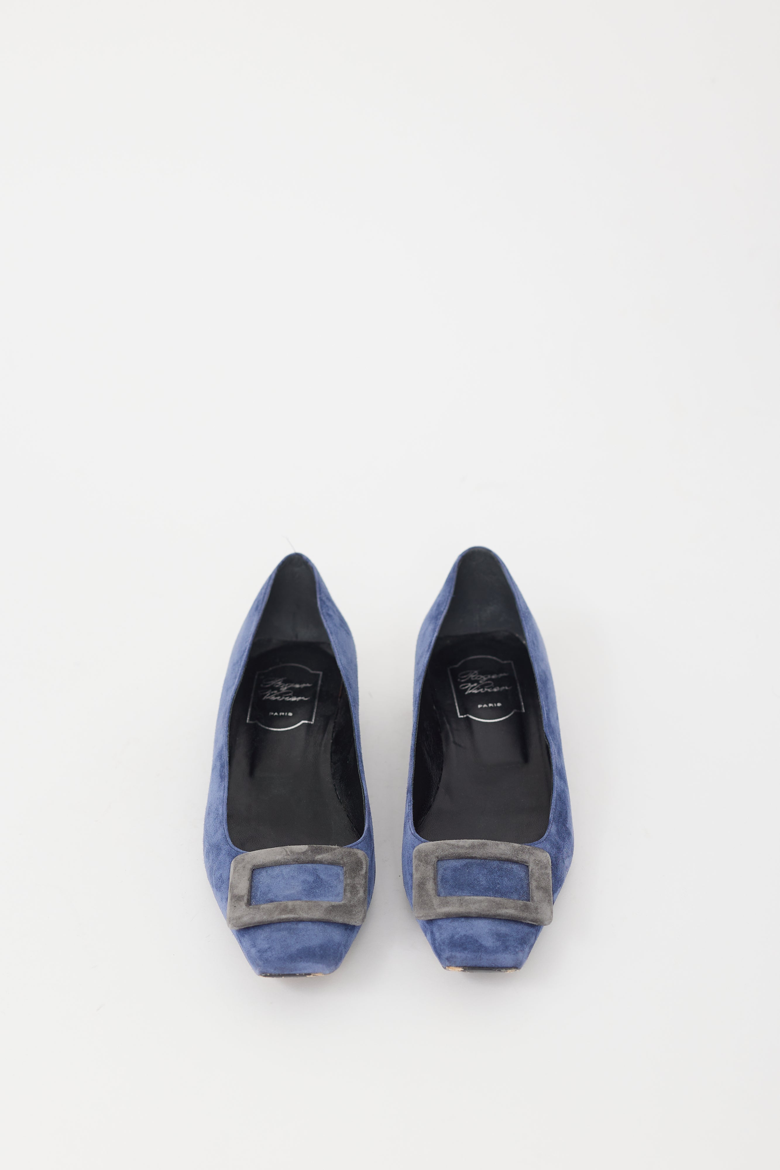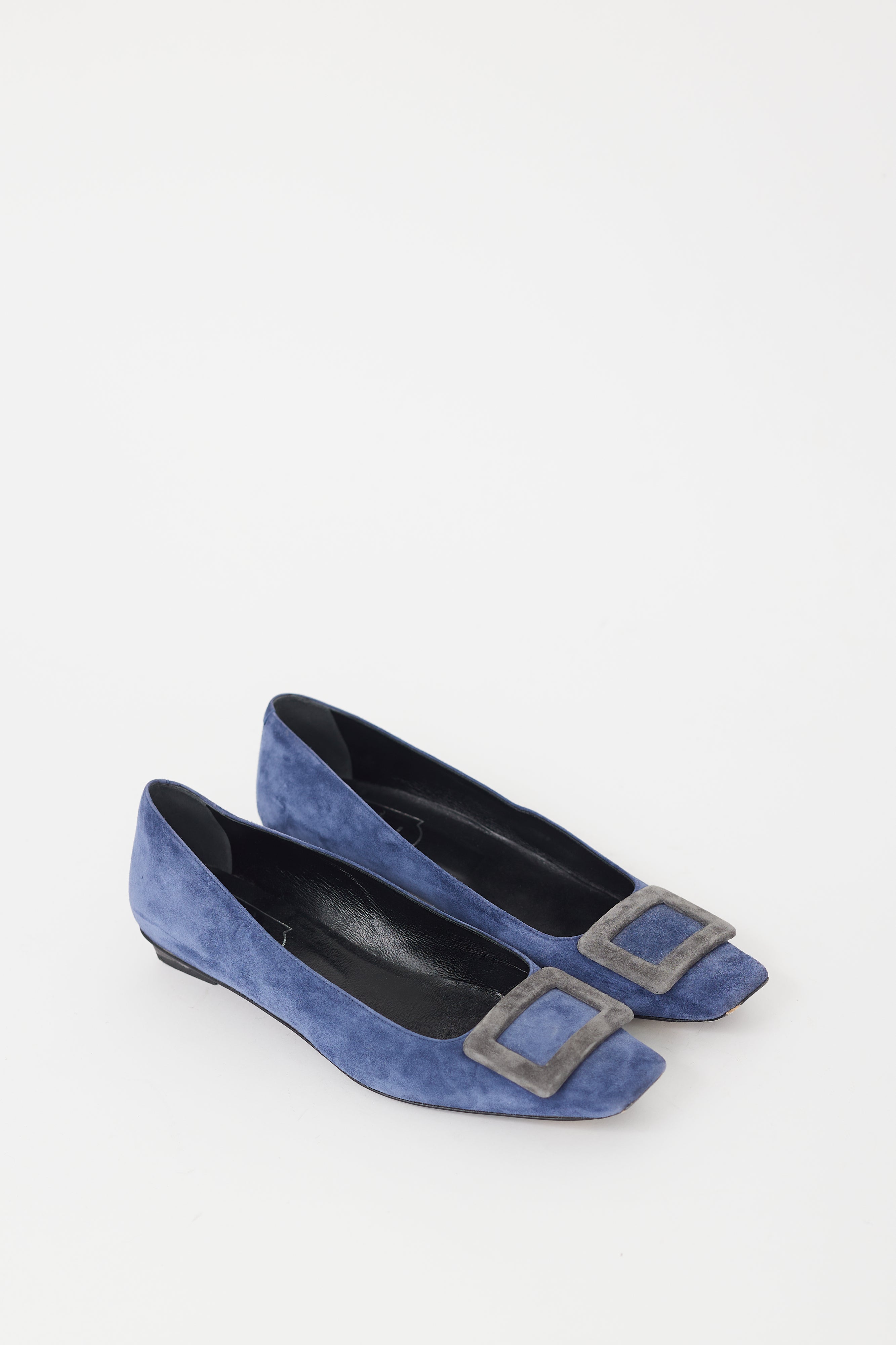 Pre-owned Roger Vivier blue and grey suede Trompette flat featuring square toe, grey suede buckle at toe, and slip on entry.