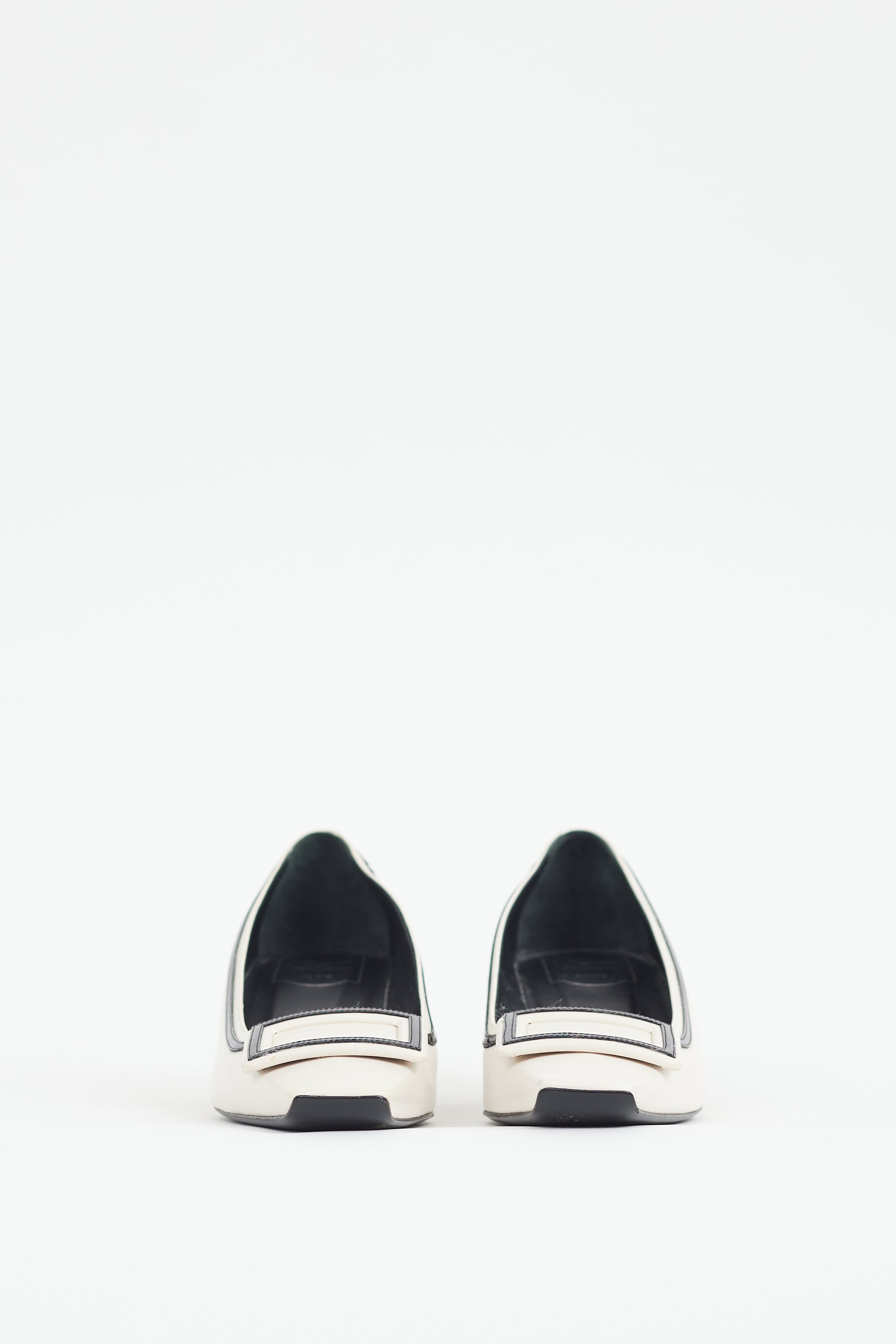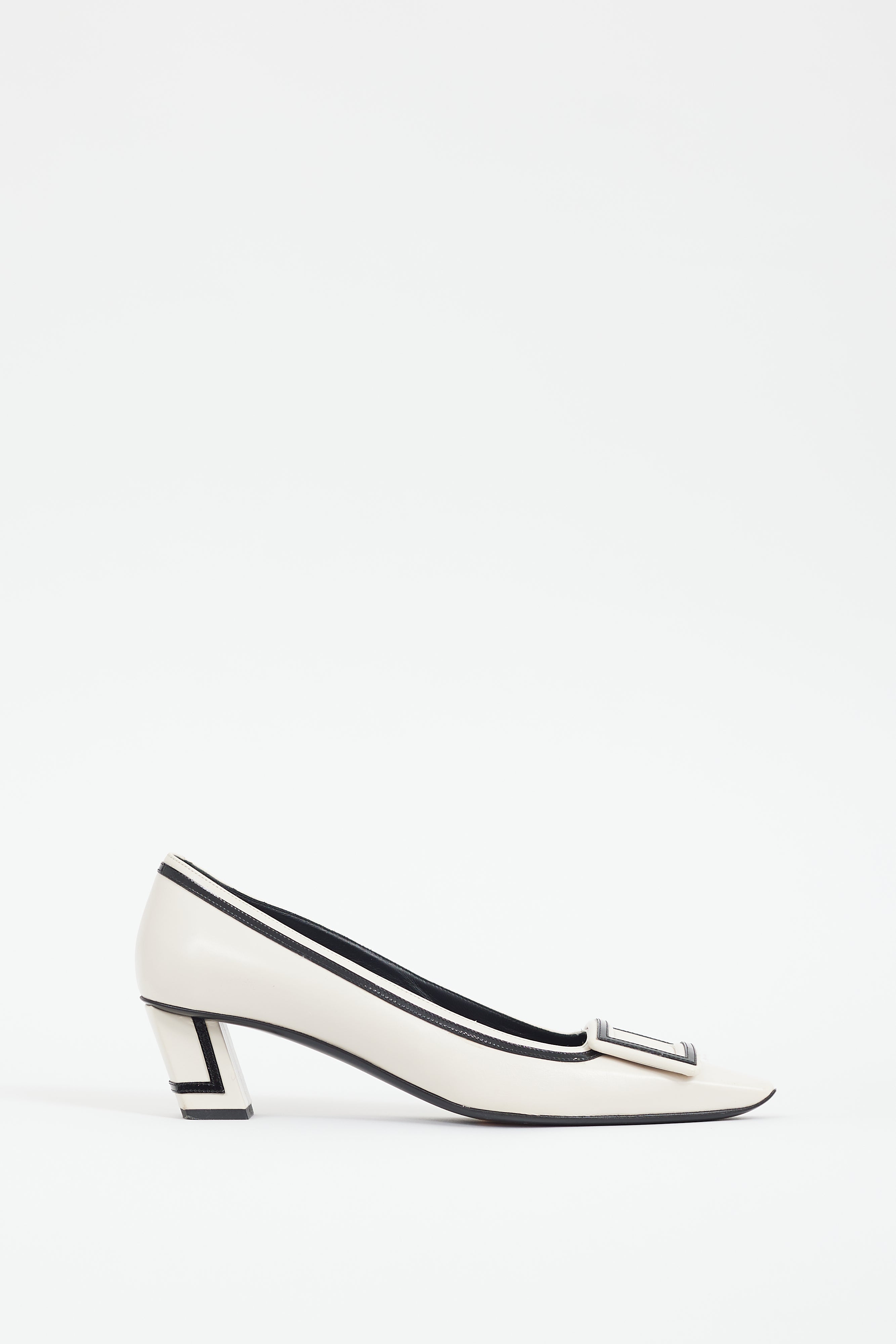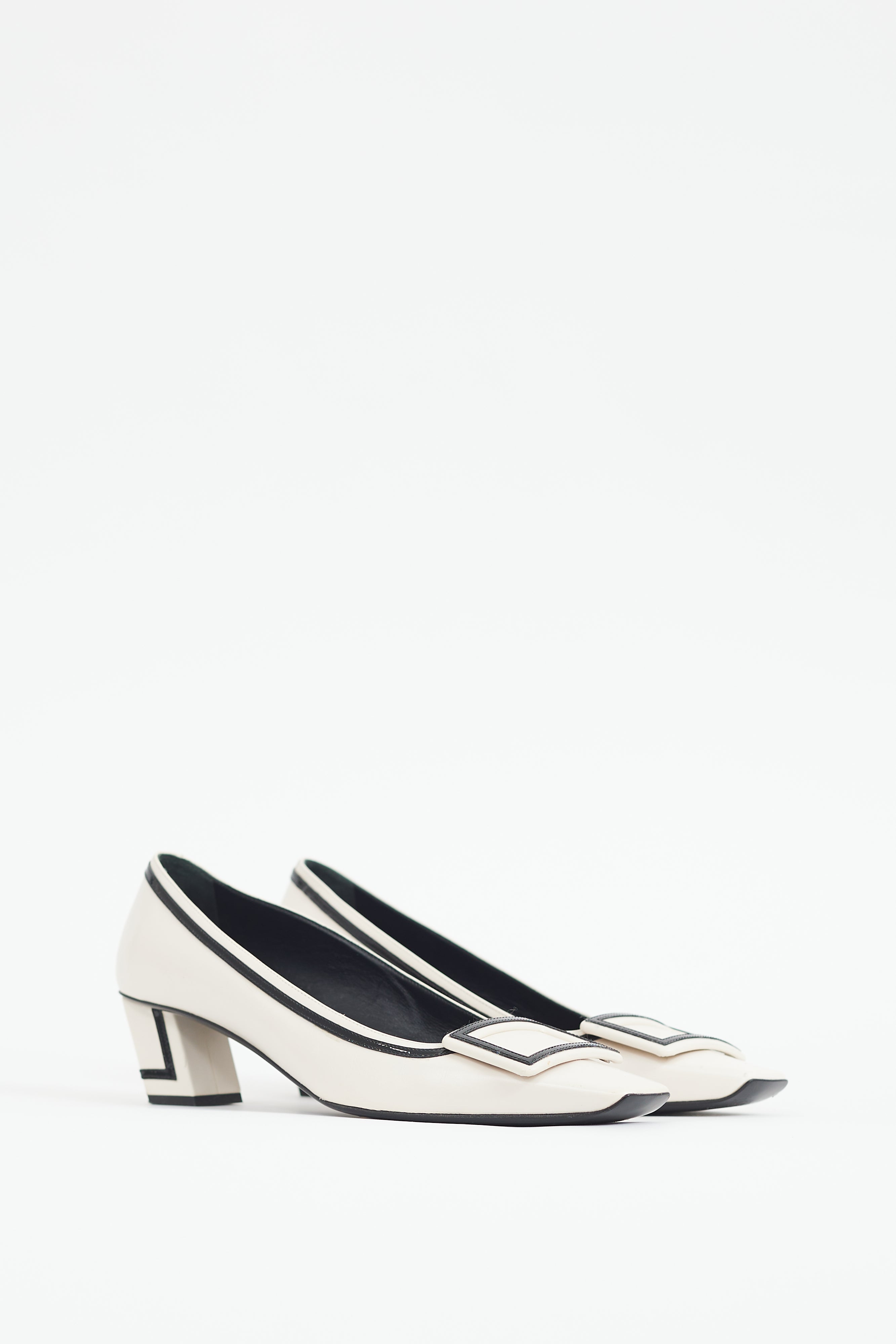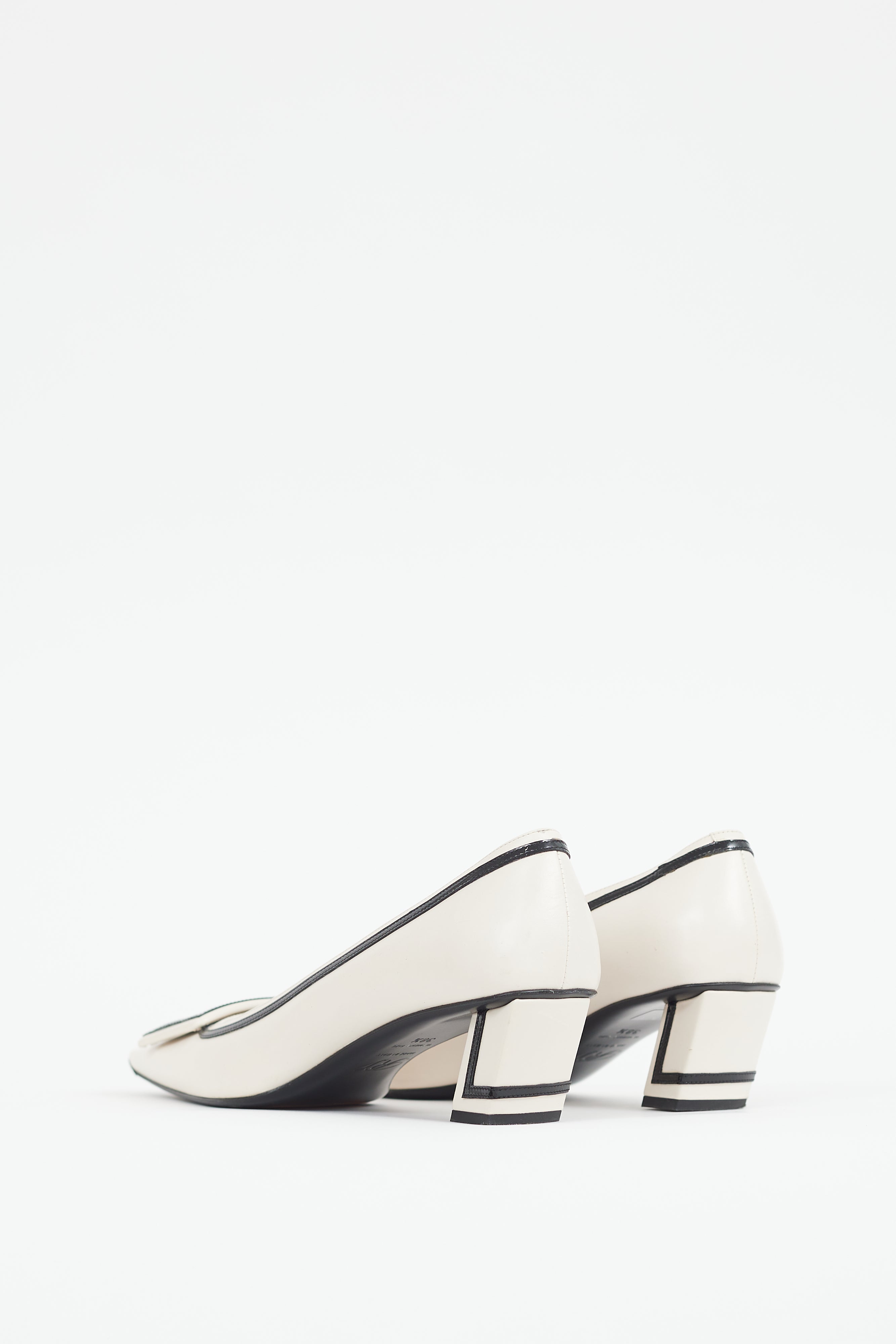 Pre-owned Roger Vivier cream Belle Vivier heels featuring a square toe, tonal buckle hardware, black patent trim, and a wrapped block heel.
