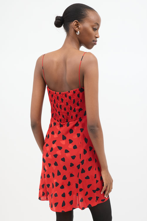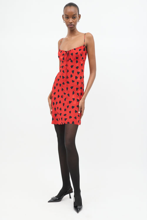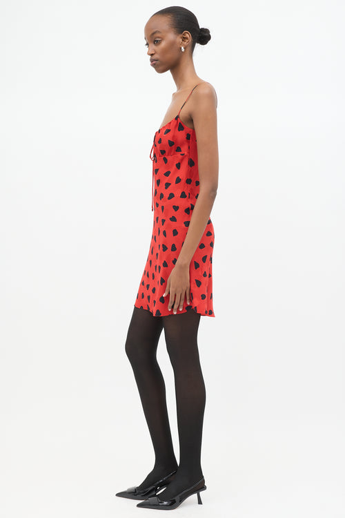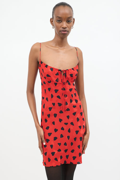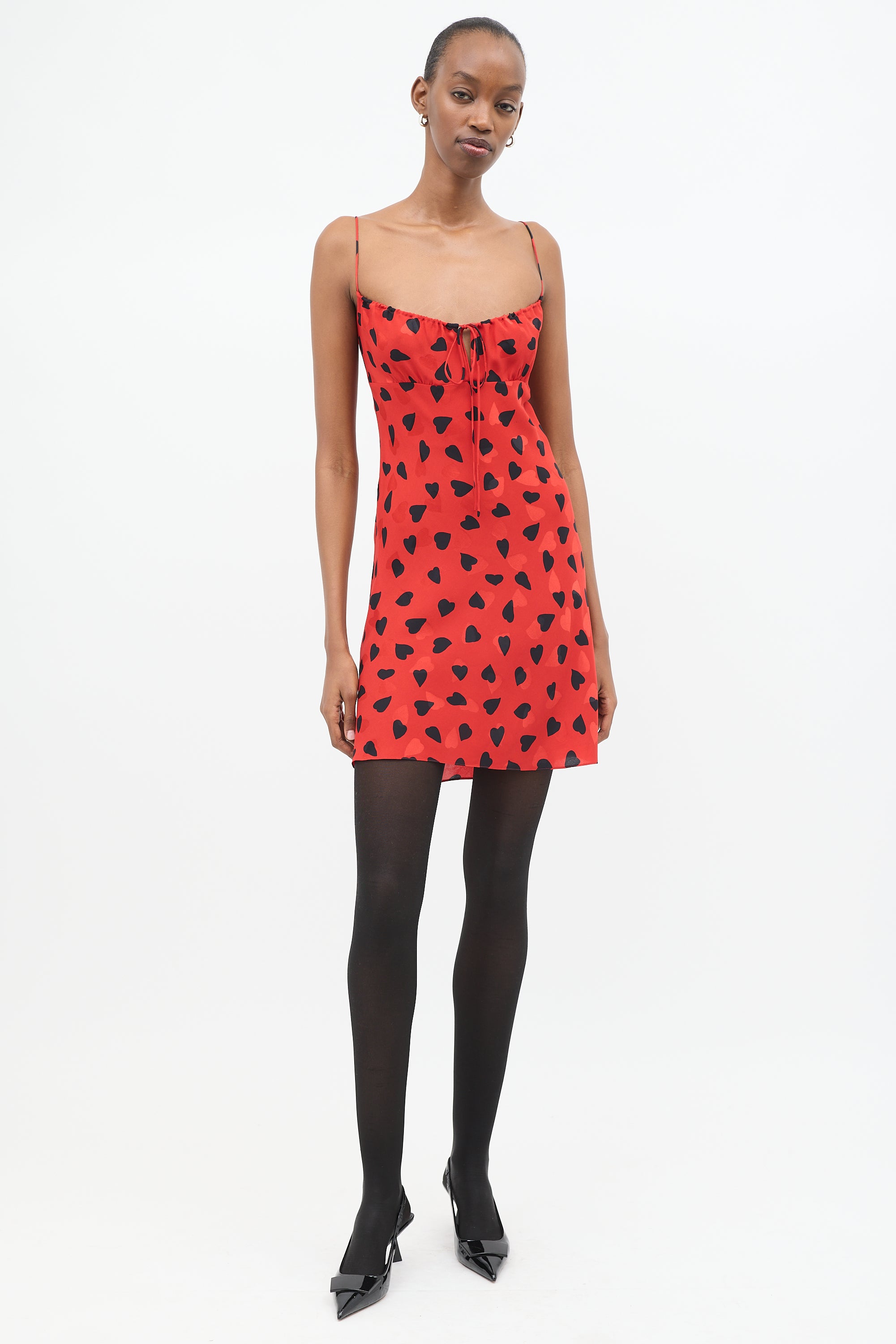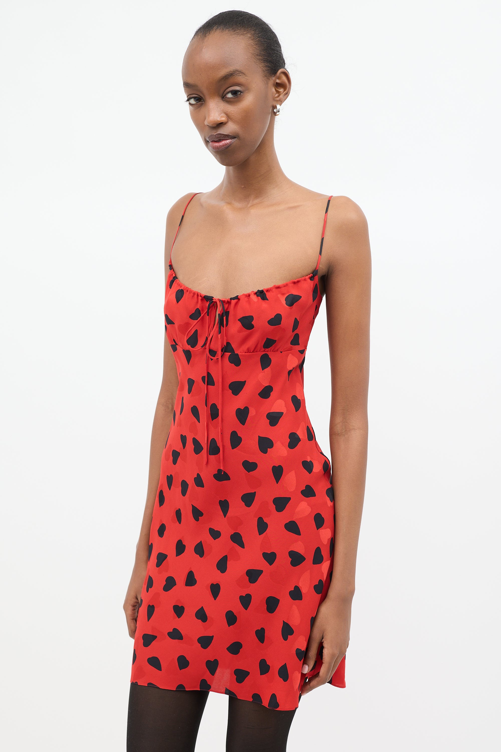 Pre-owned Saint Laurent red silk sleeveless dress featuring adjustable neckline with notch and self tie, red and black heart pattern dress throughout, and elasticized back. Clipped to fit model.