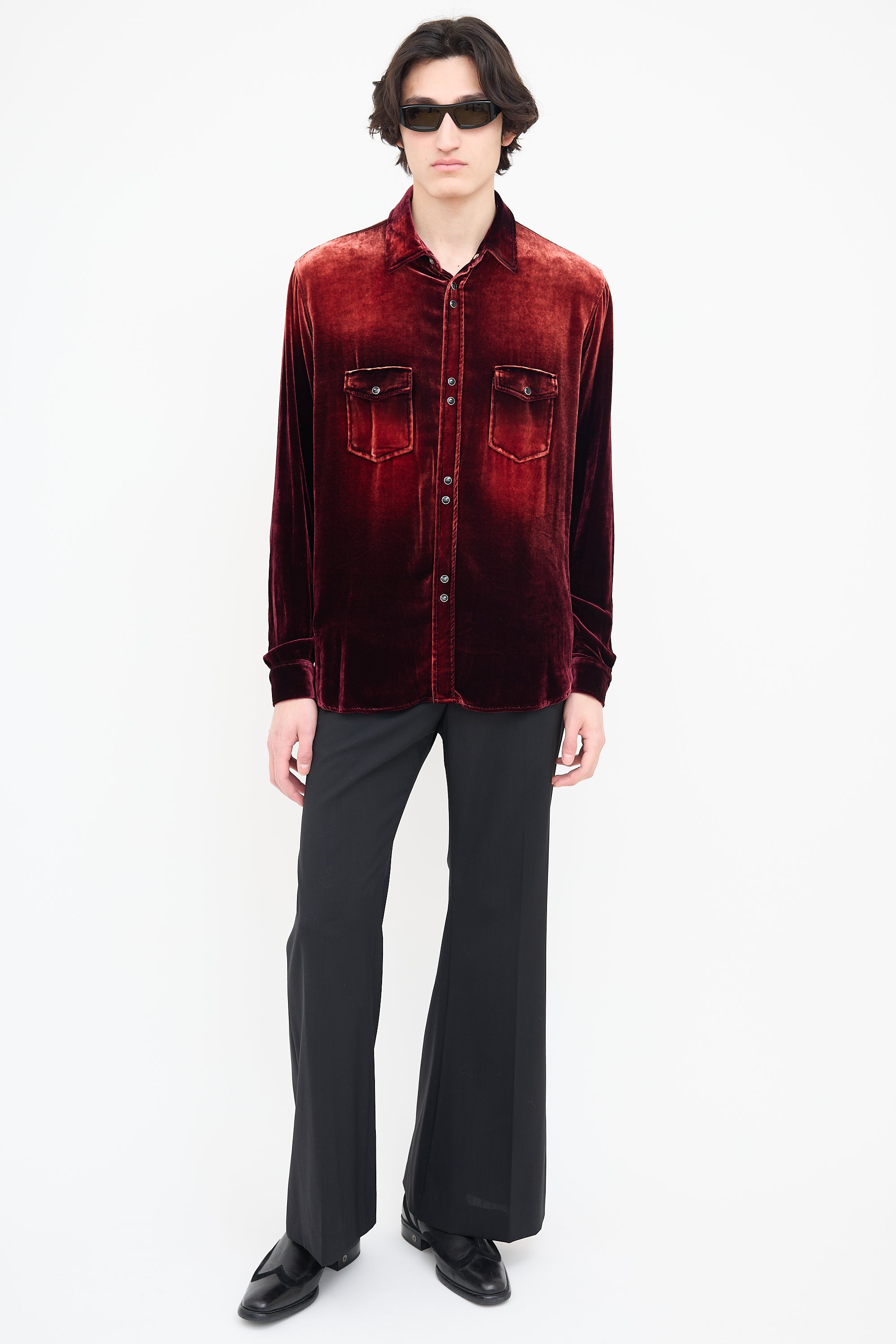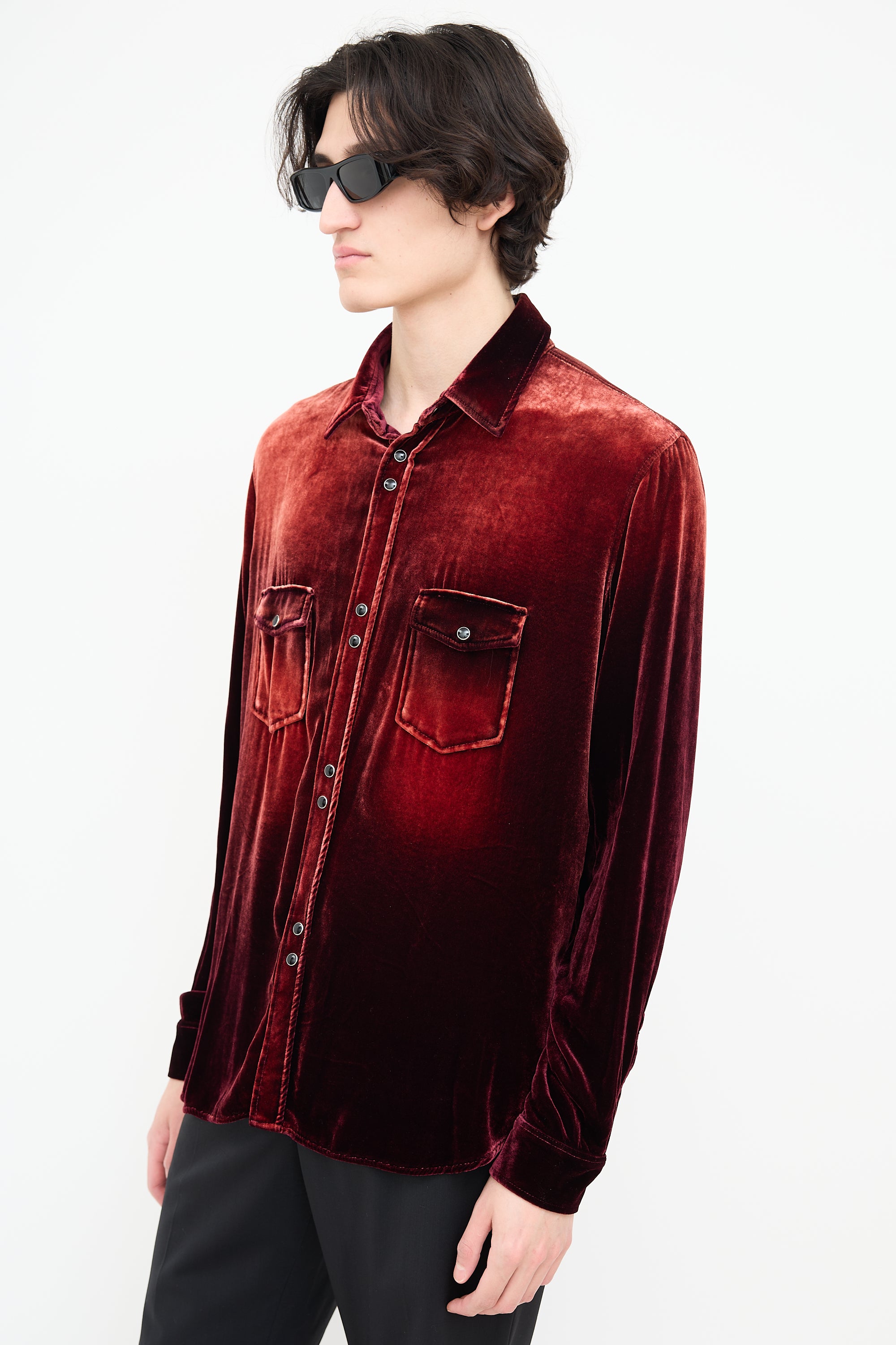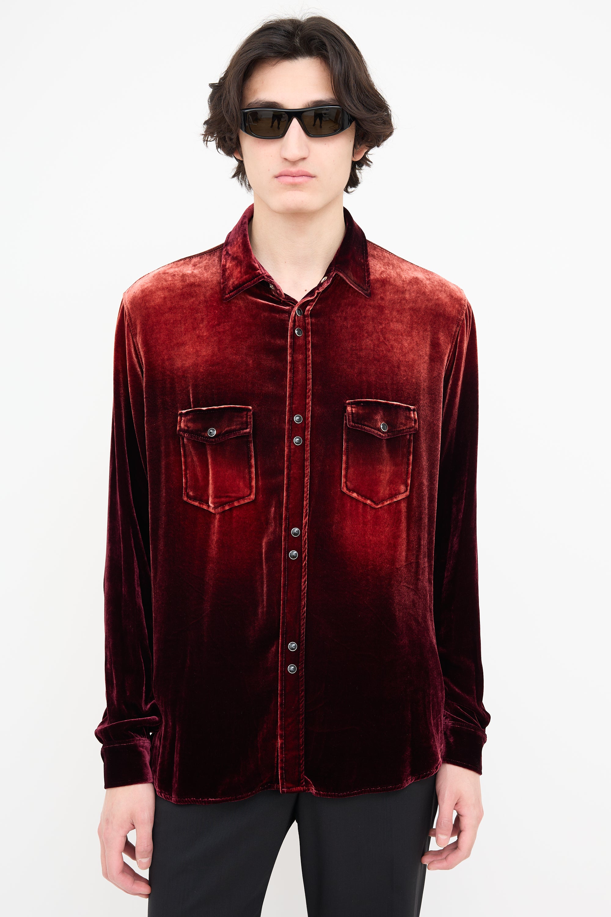 Pre-owned Saint Laurent red and burgundy crushed velvet shirt featuring a gradient design, straight collar, snap buttoned front, two front pockets, curved hem, and snap buttoned cuffs.