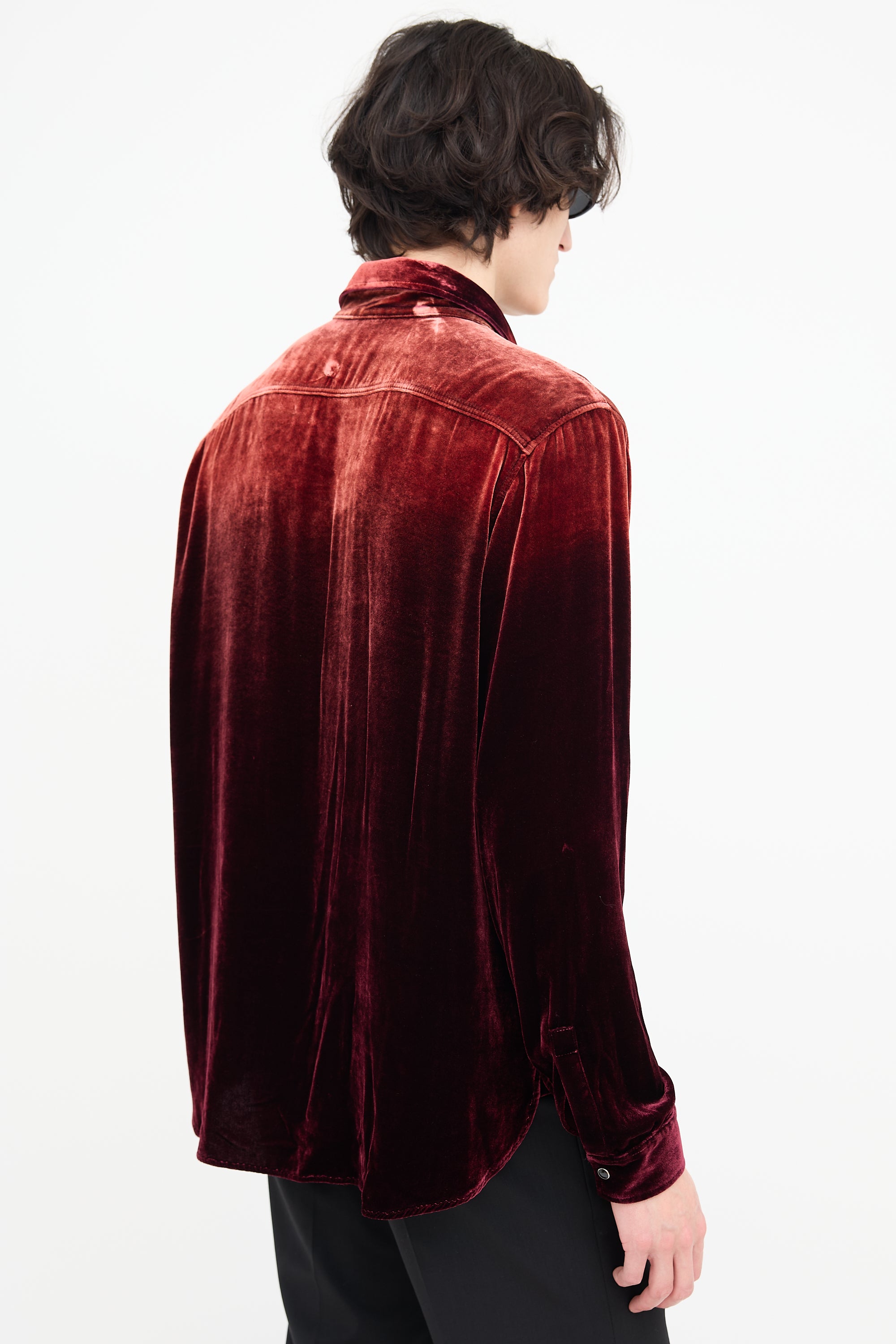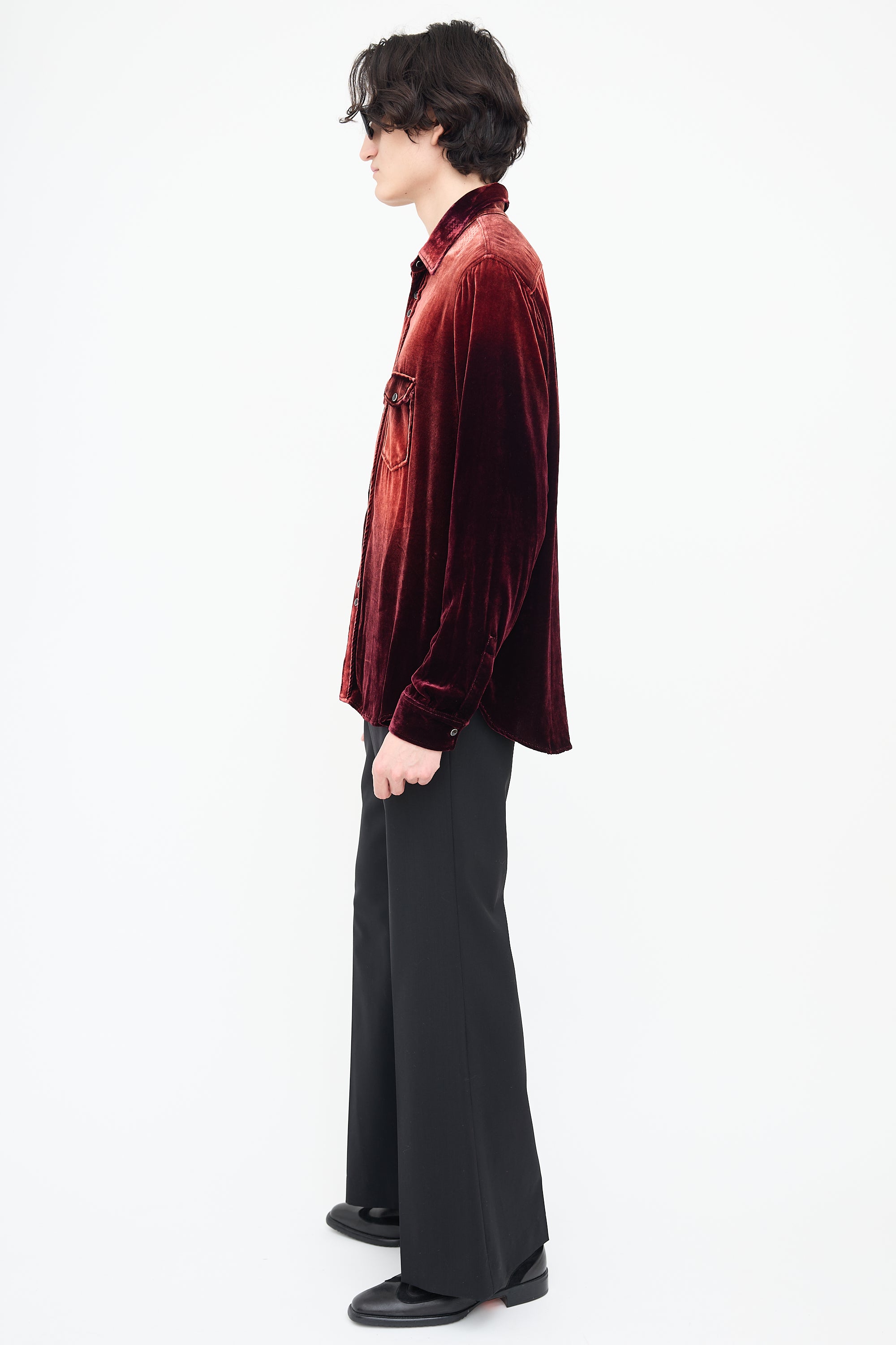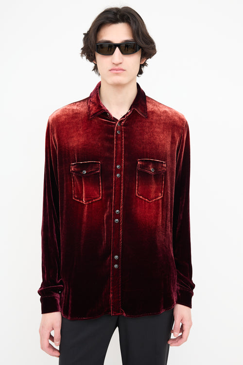 Pre-owned Saint Laurent red and burgundy crushed velvet shirt featuring a gradient design, straight collar, snap buttoned front, two front pockets, curved hem, and snap buttoned cuffs.