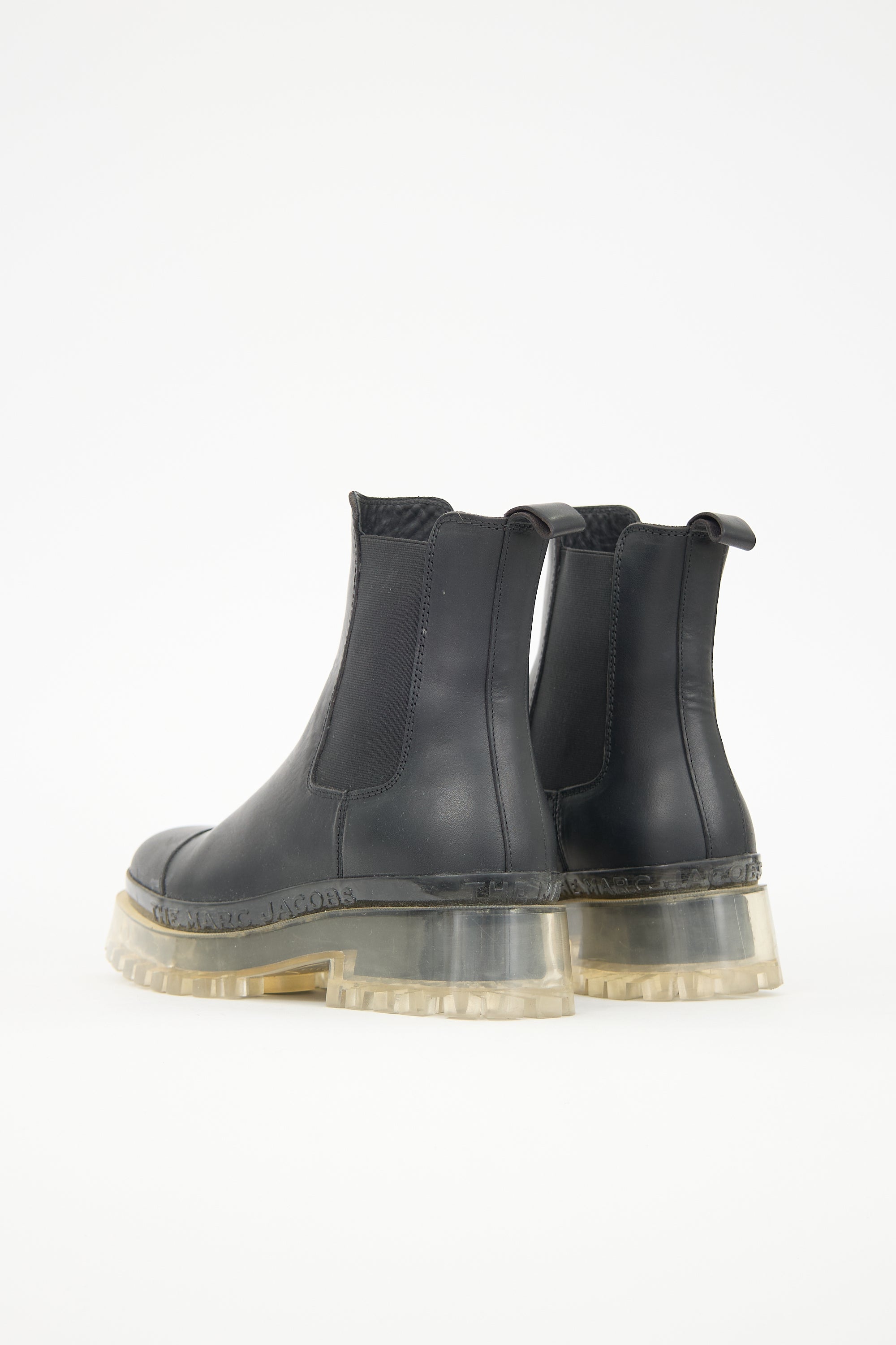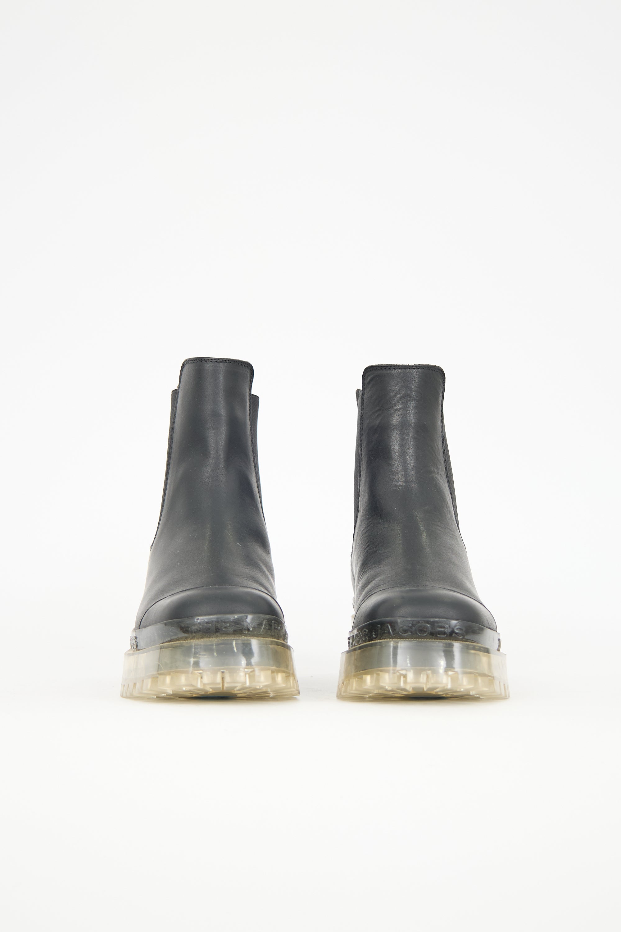 Pre-owned Marc Jacobs black leather Stomper Chelsea boots featuring rounded toe, elastic sides, pull tab at counter, and translucent treaded rubber platform sole with embossed logo trim. Comes with original dust bag.