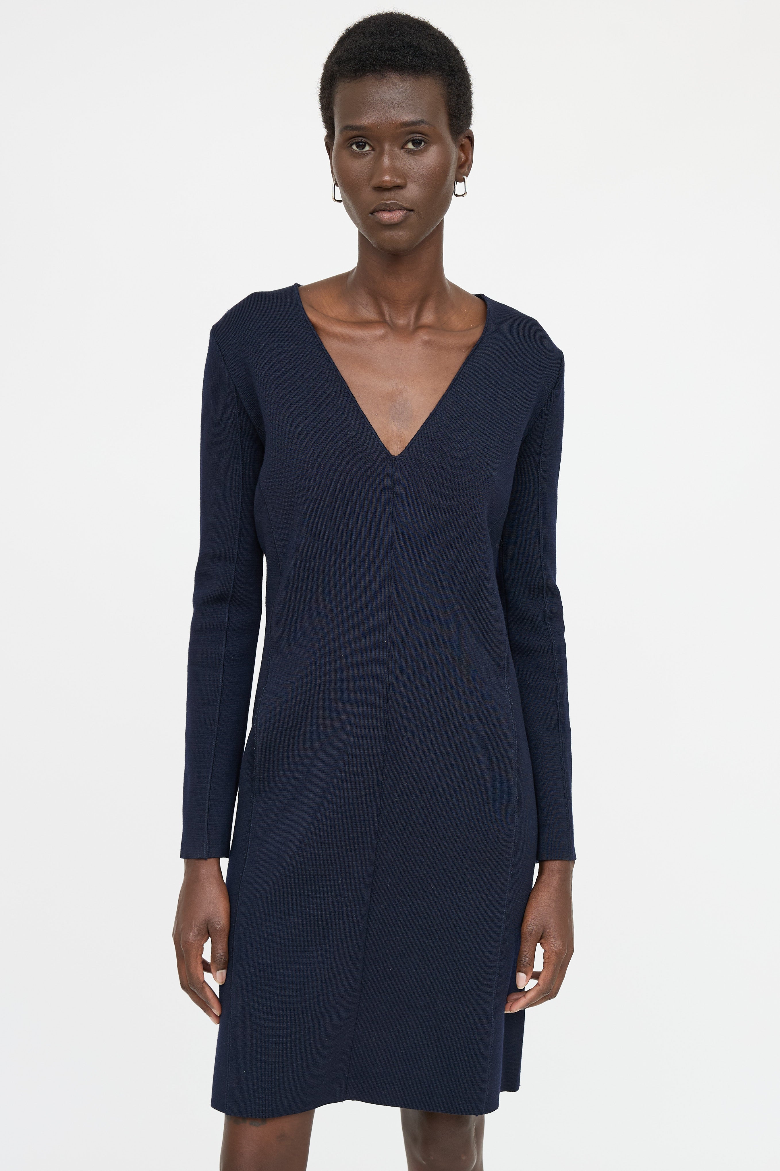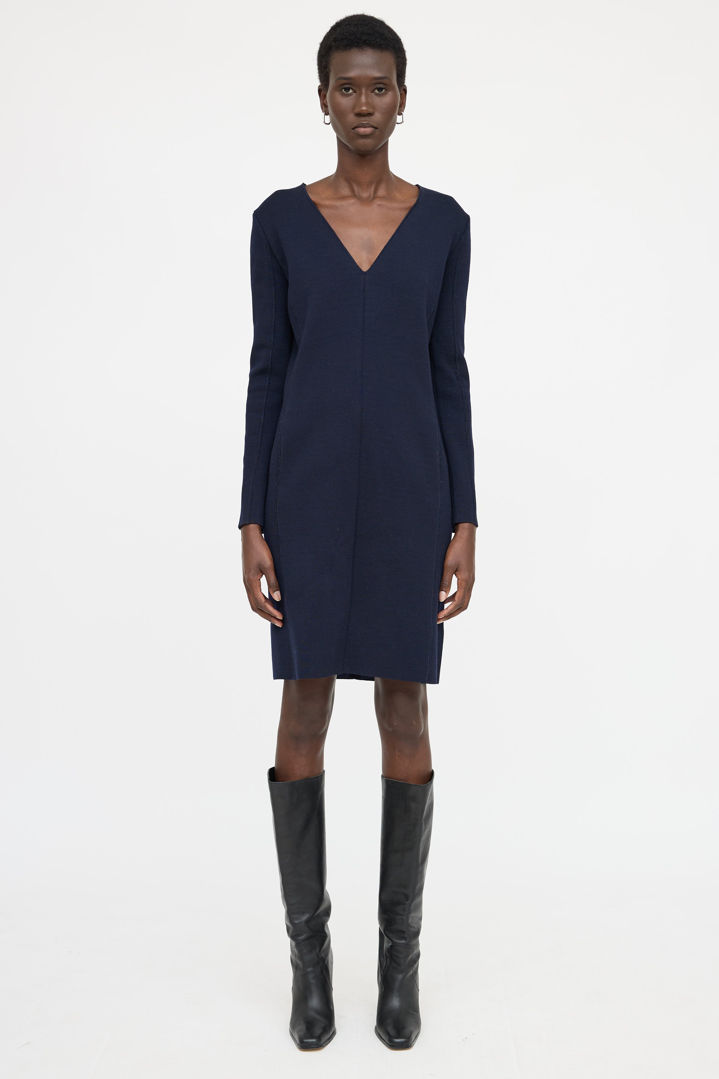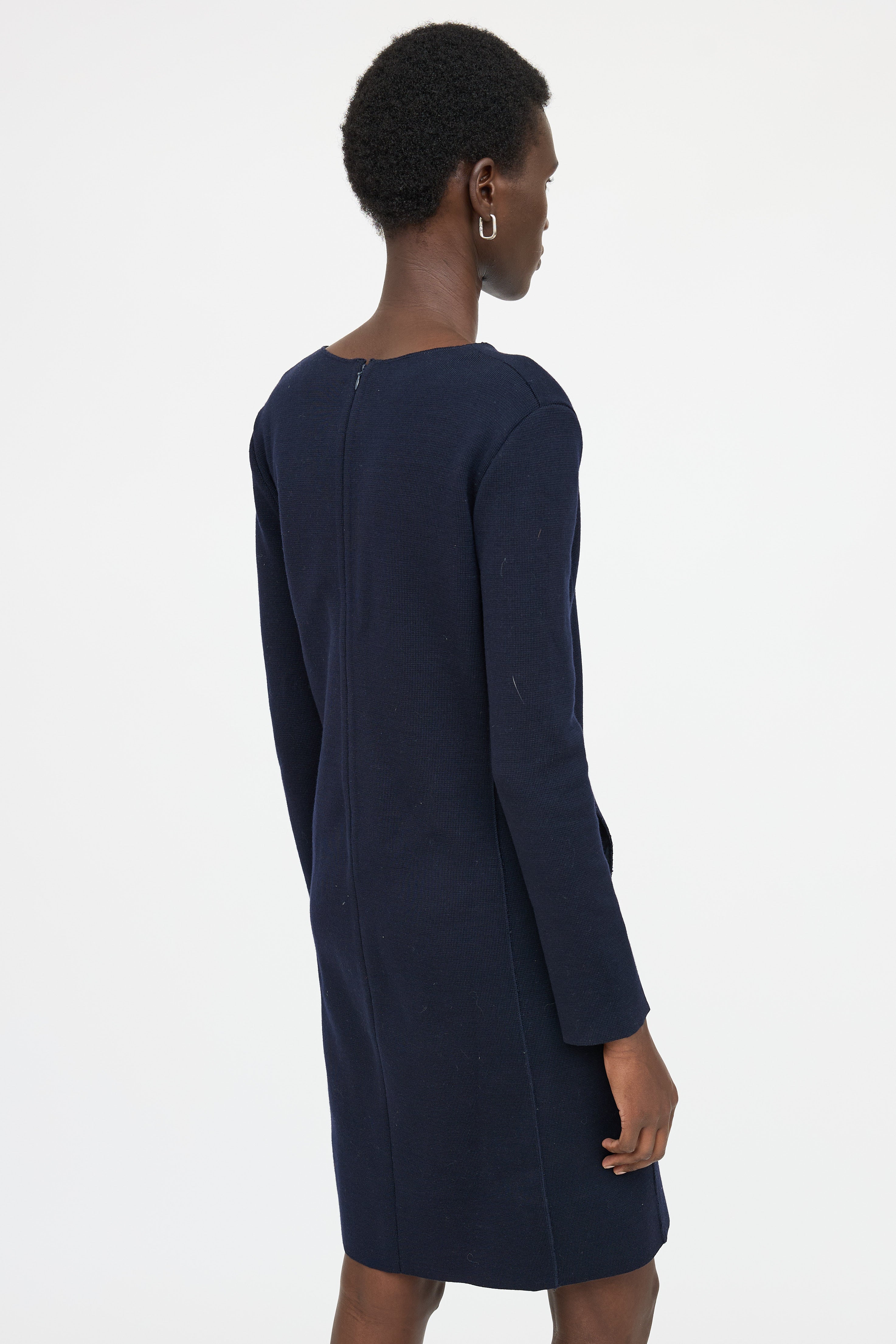 Pre-owned Blumarine navy long sleeve dress featuring v-neckline, concealed zip at back, slit pockets at hips, and paneling throughout.