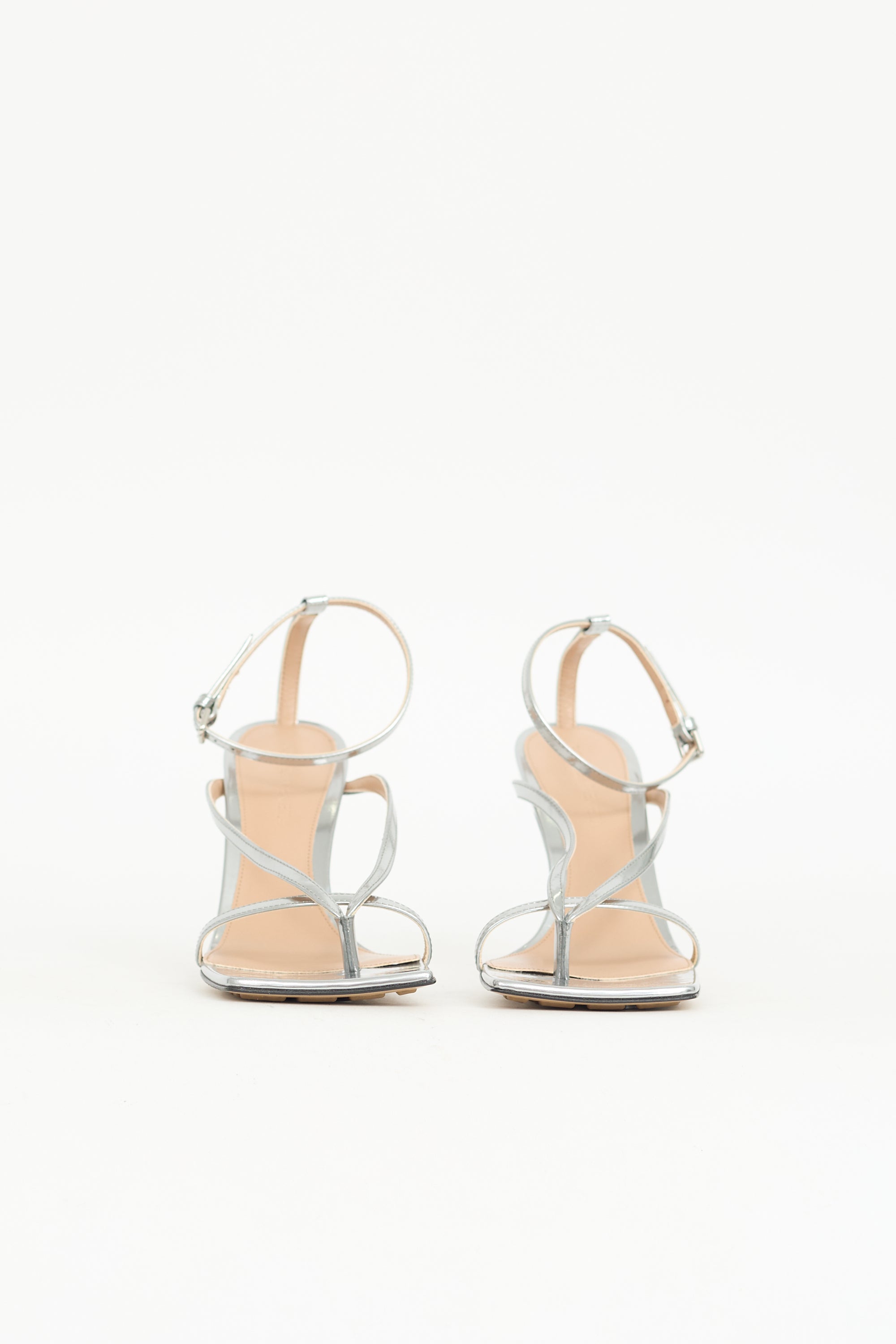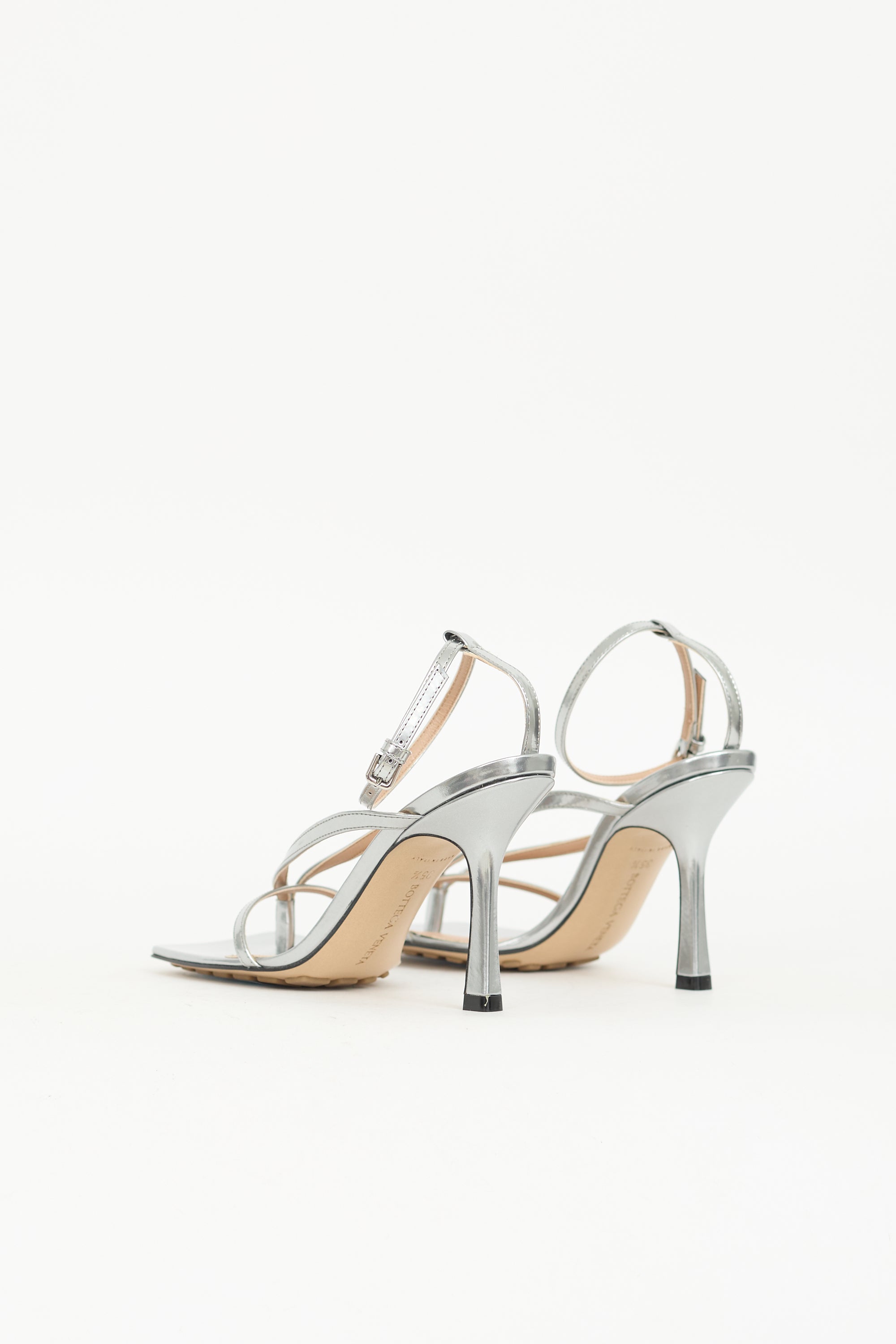 Pre-owned Bottega Veneta silver tone Stretch sandals featuring mirrored finish, square toe, thin strappy vamp, adjustable ankle strap, covered continental heel, and rubber dot outsole. Comes with original box and spare heel tips.