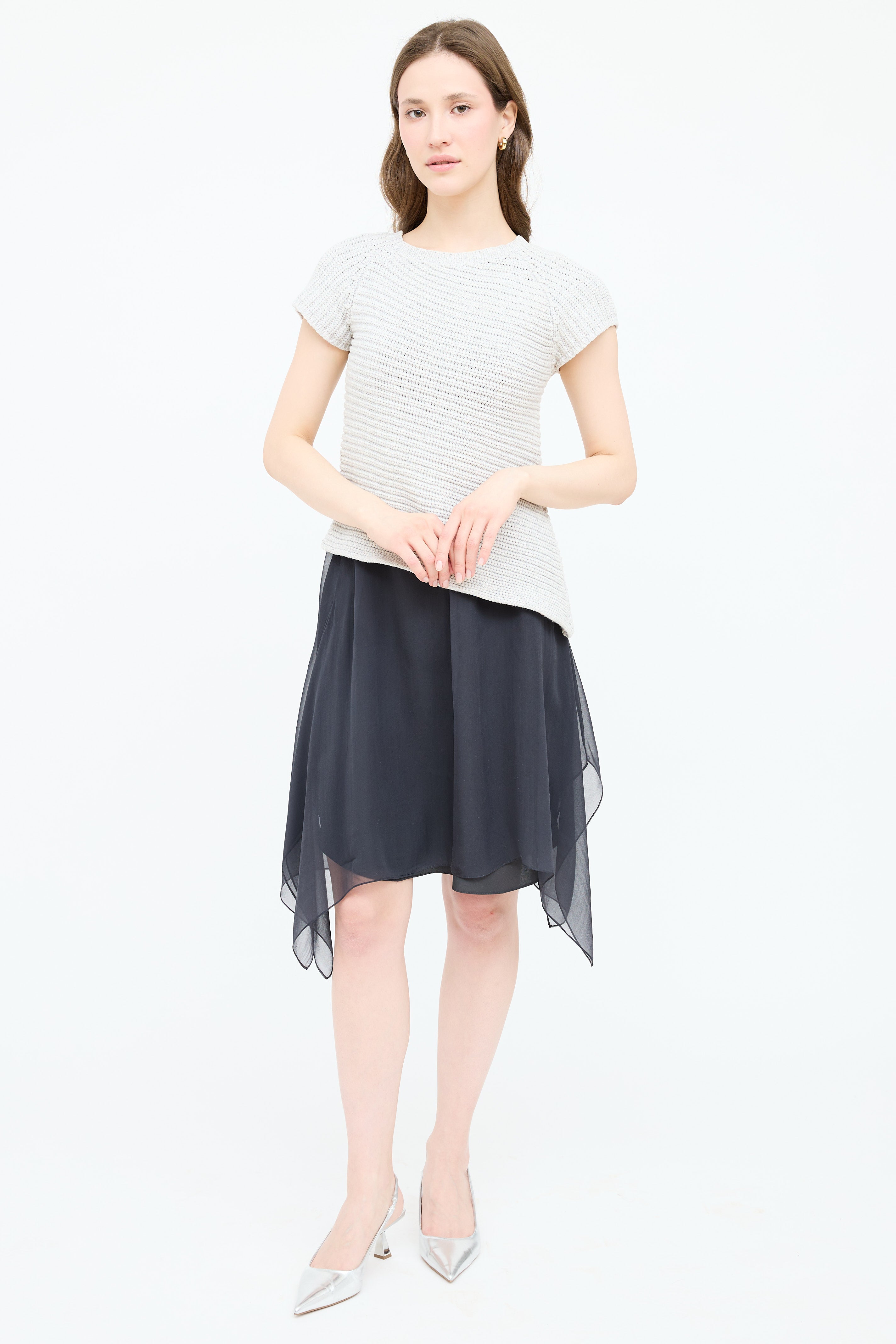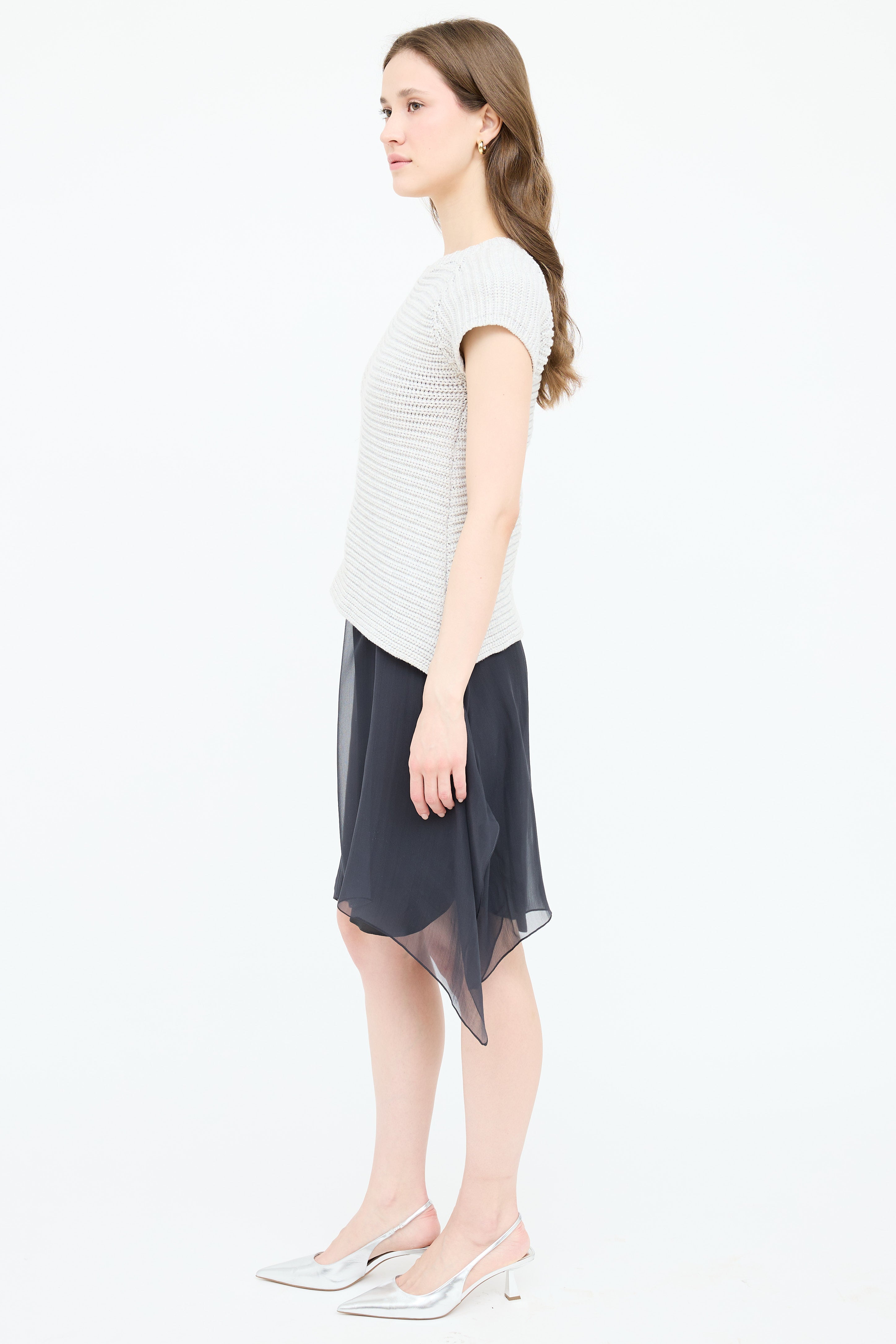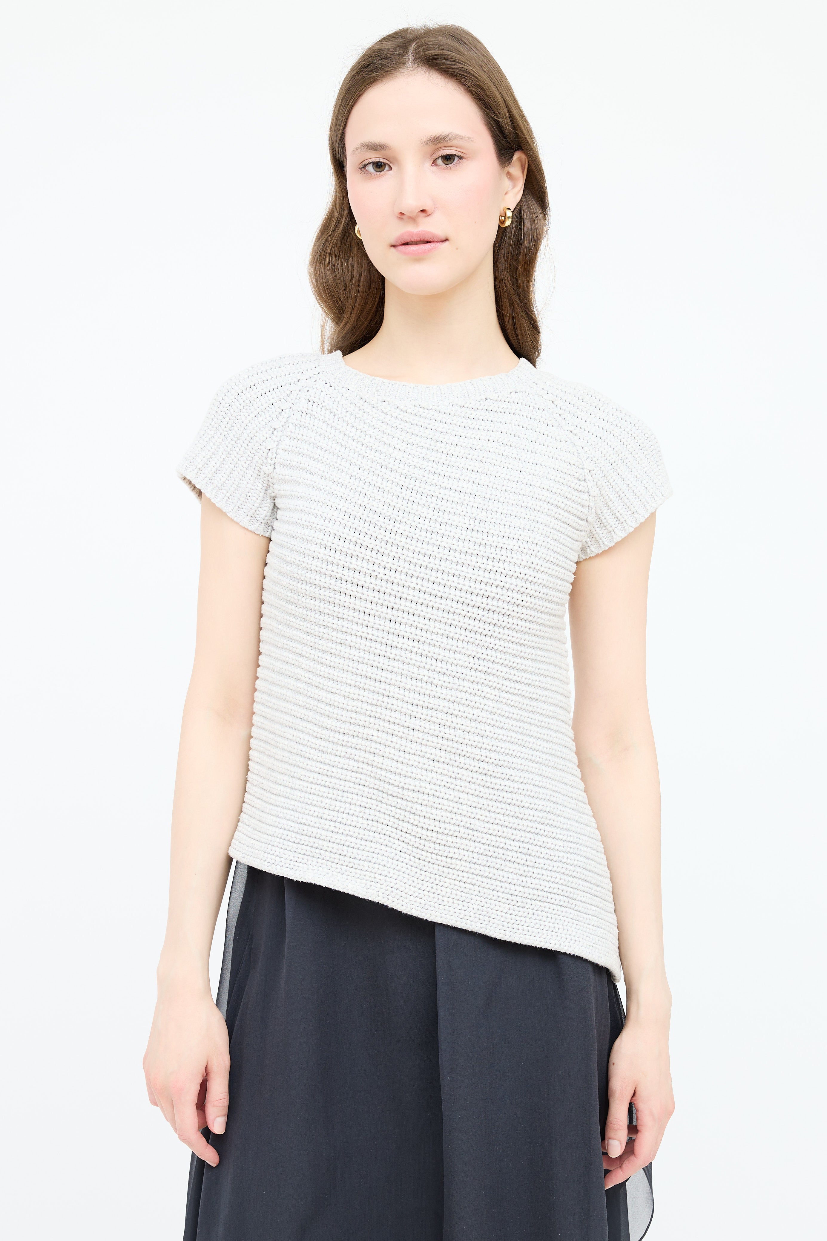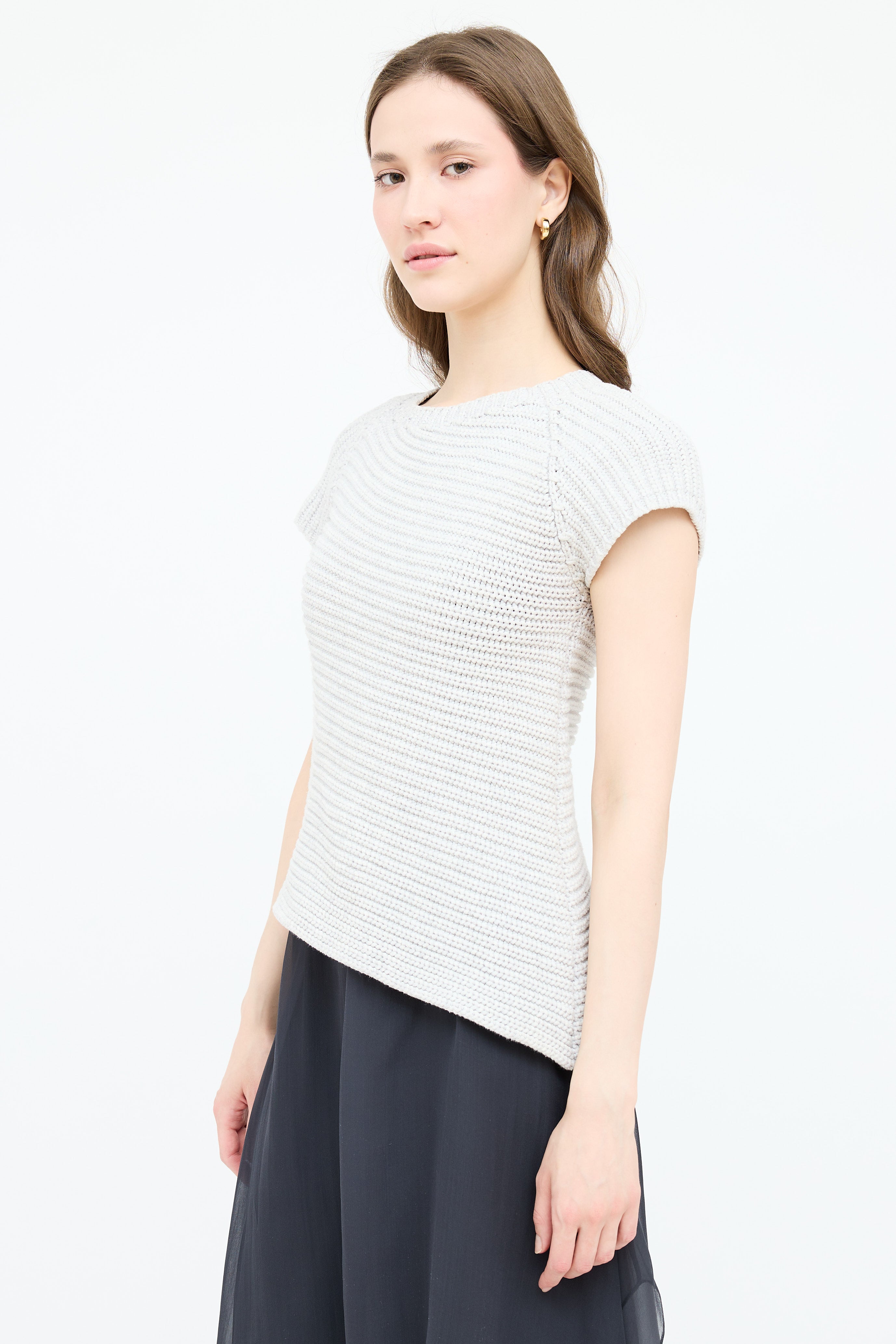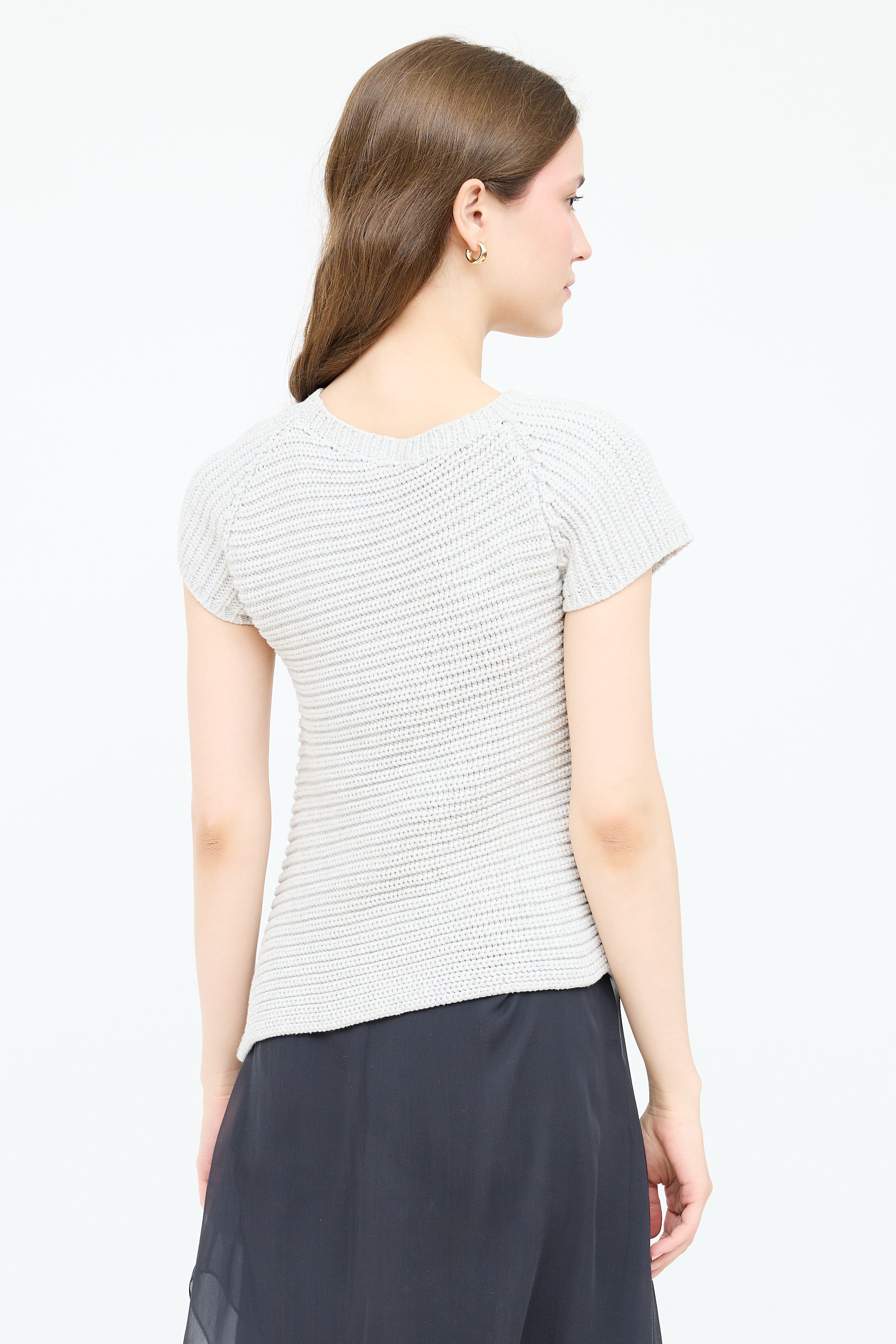 Pre-owned Brunello Cucinelli grey knit short sleeve top featuring round neckline, asymmetrical hem and cap sleeves.