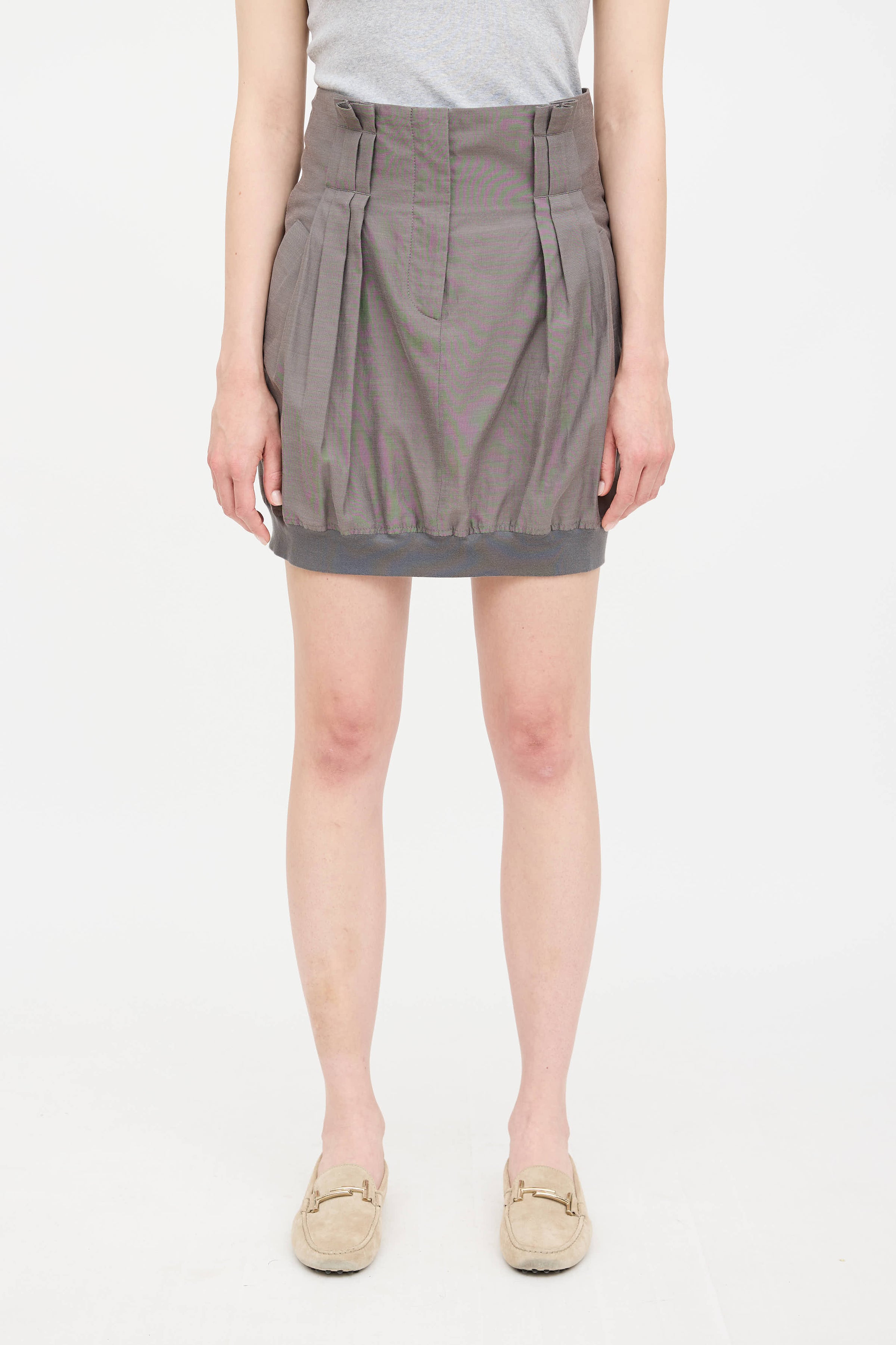 Pre-owned Brunello Cucinelli grey mini skirt featuring two slip pockets at hip, pleated front, ribbed hem, and zip fly with snap closure.