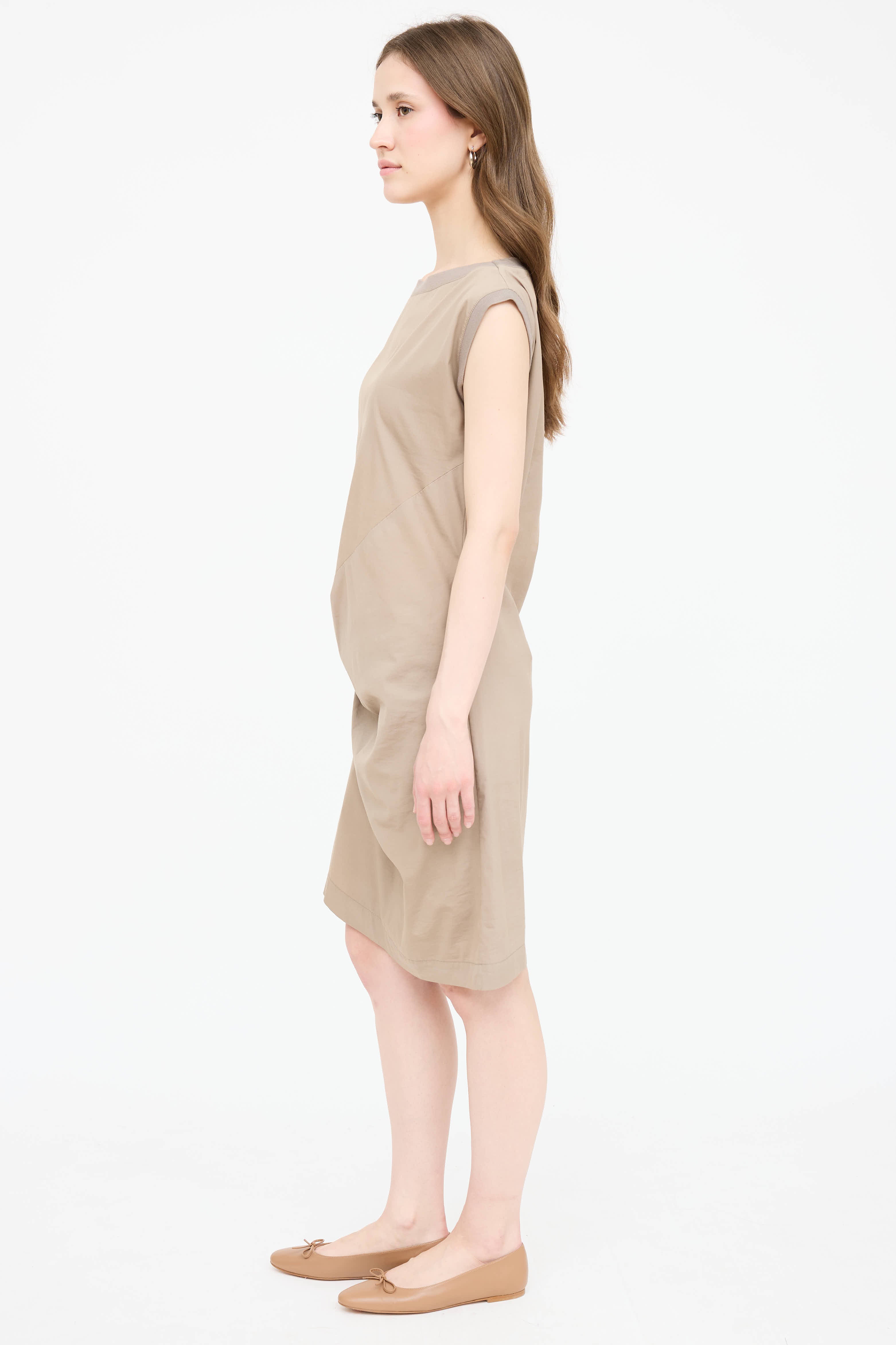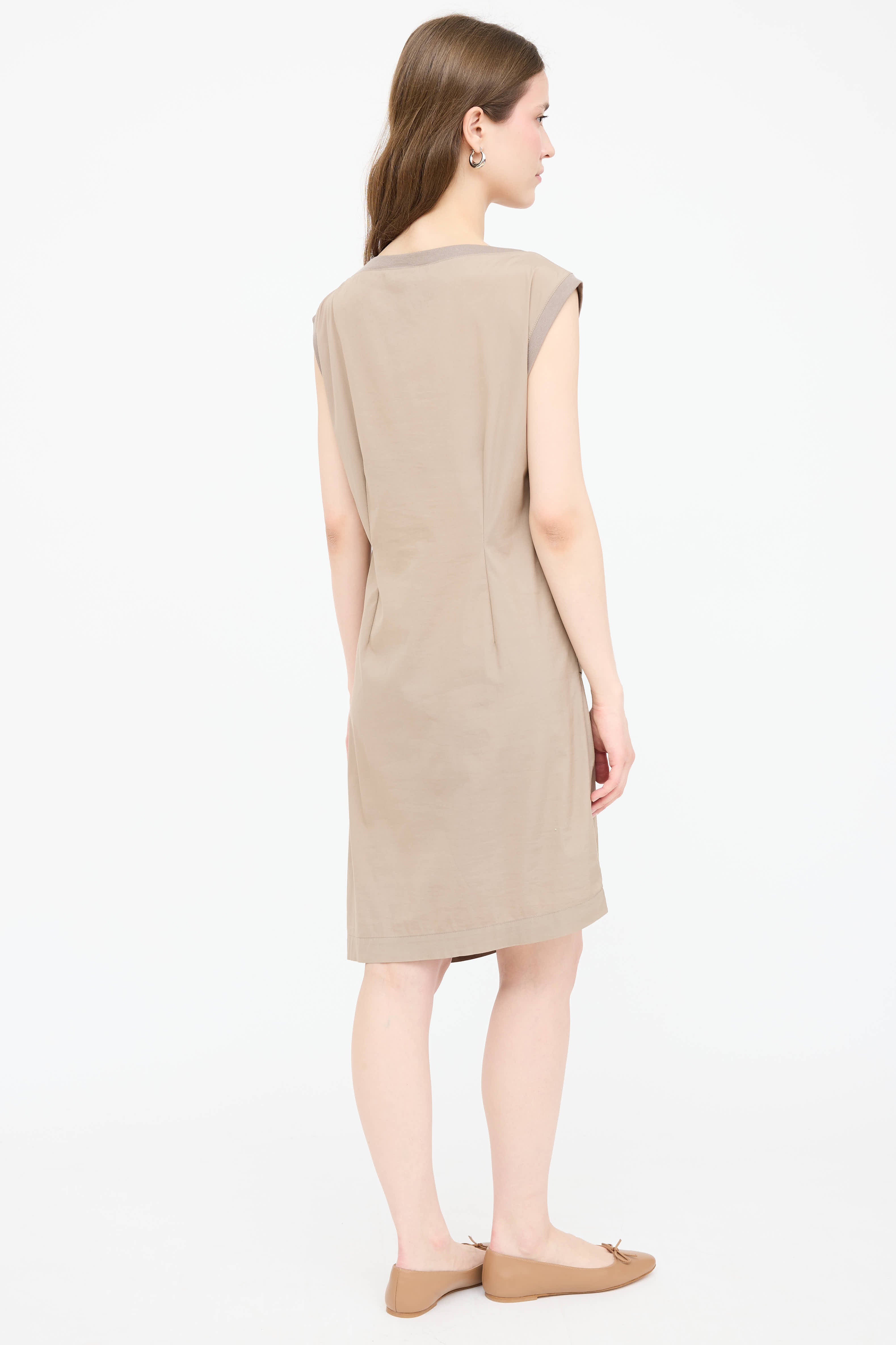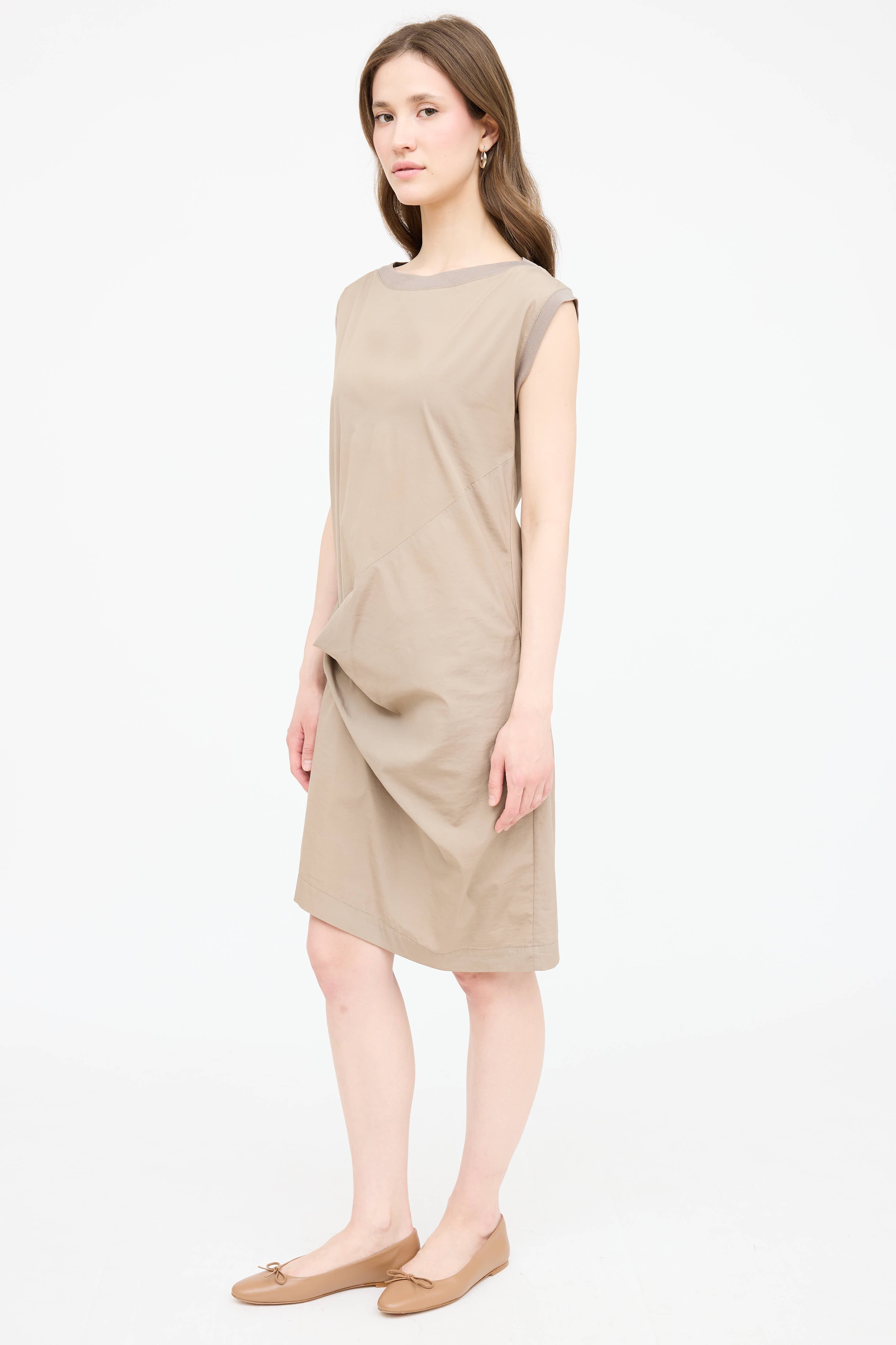 Pre-owned Brunello Cucinelli beige dress featuring a ribbed round neckline, sleeveless styling, gathered front, and darted back.