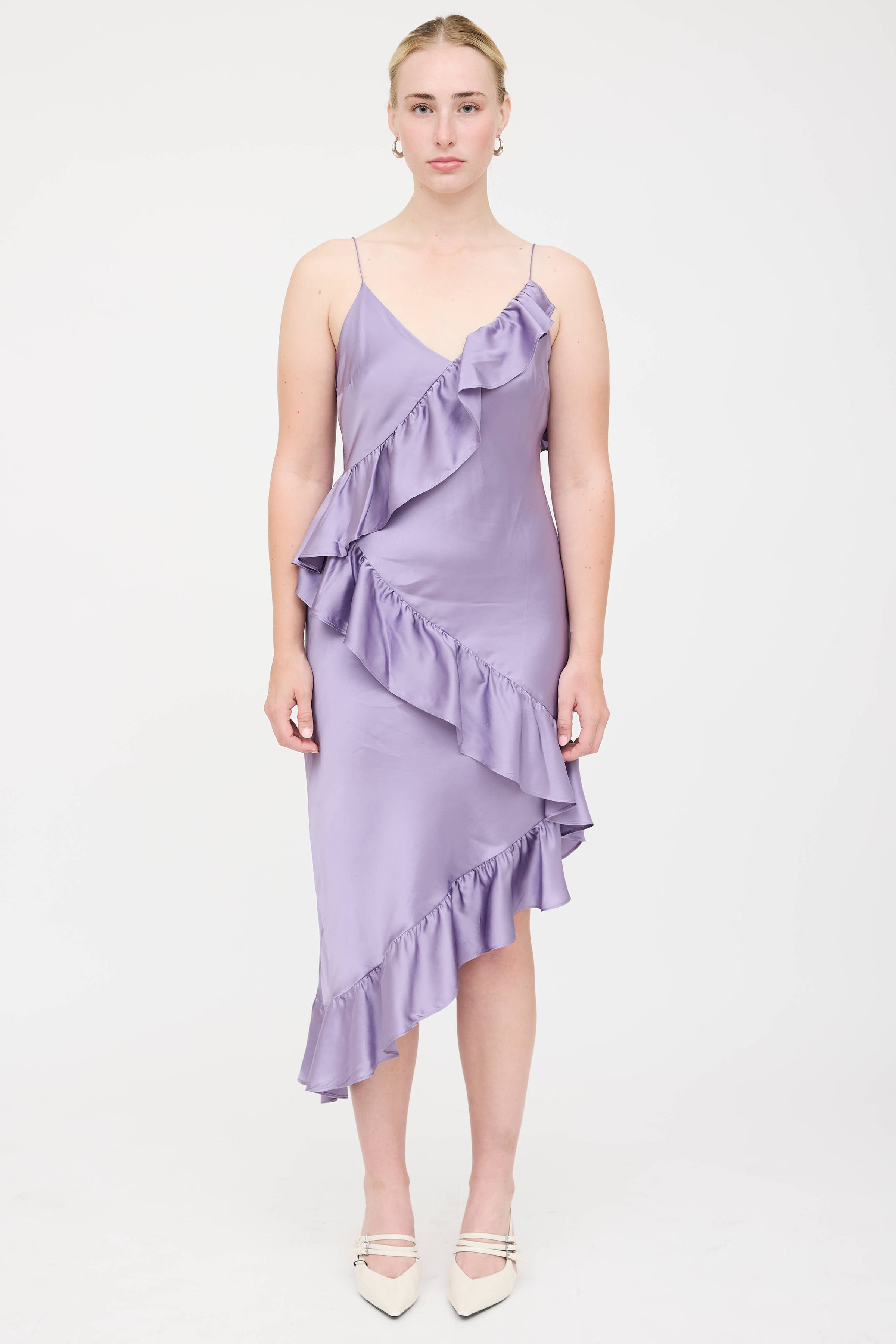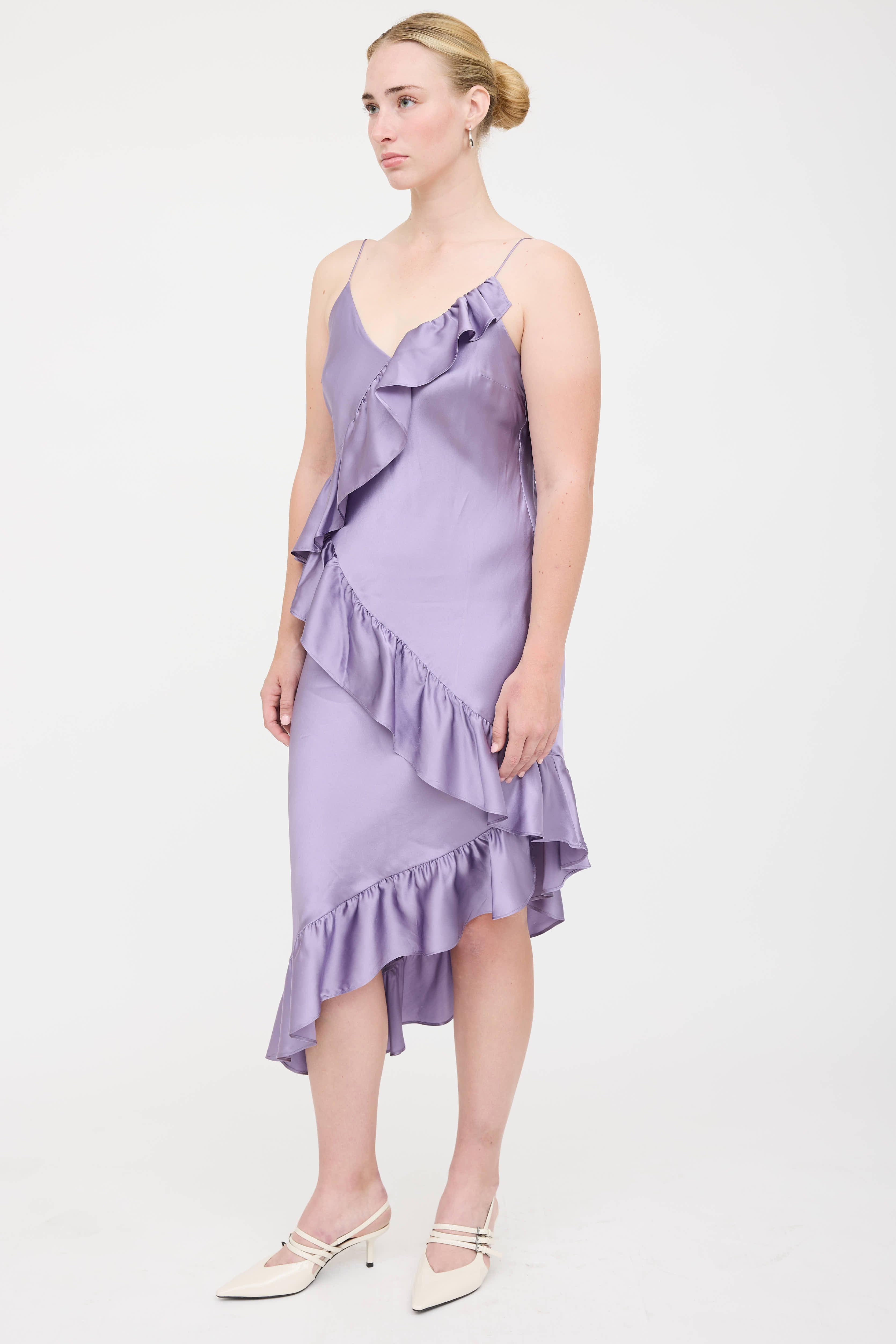 Pre-owned Cami NYC purple sleeveless dress featuring v-neckline, adjustable shoulder straps, ruffle trim, and asymmetrical hemline. Lined.