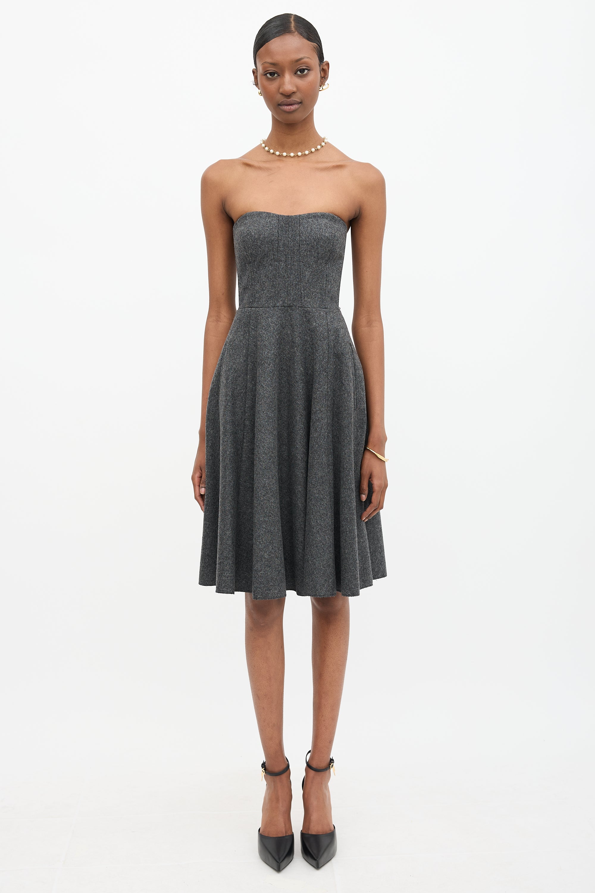 Pre-owned Carven grey wool blend strapless dress featuring a sweetheart topline, beige spaghetti shoulder straps, interior boning at bodice, back zip, interior belt, and double welt pockets. Lined.