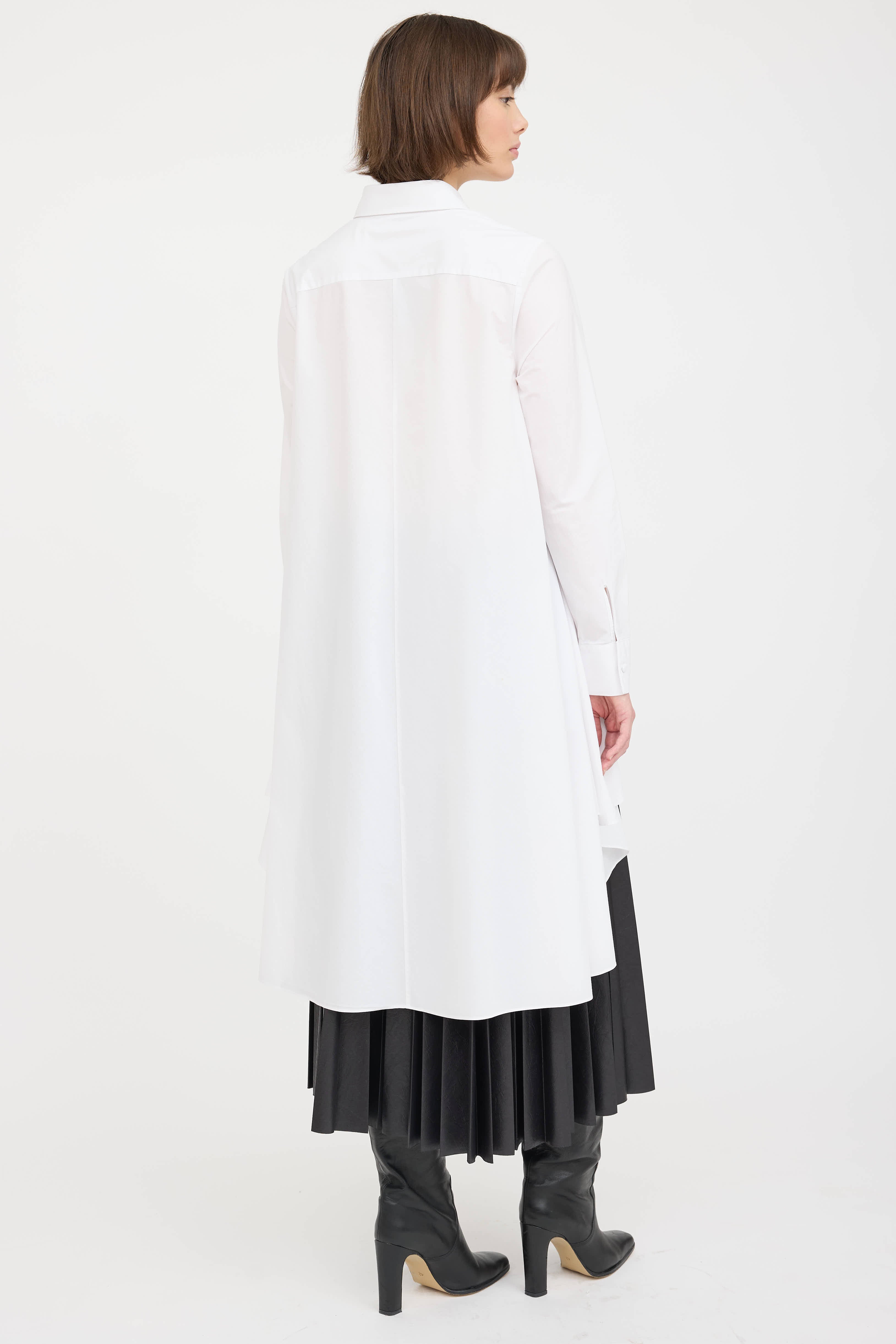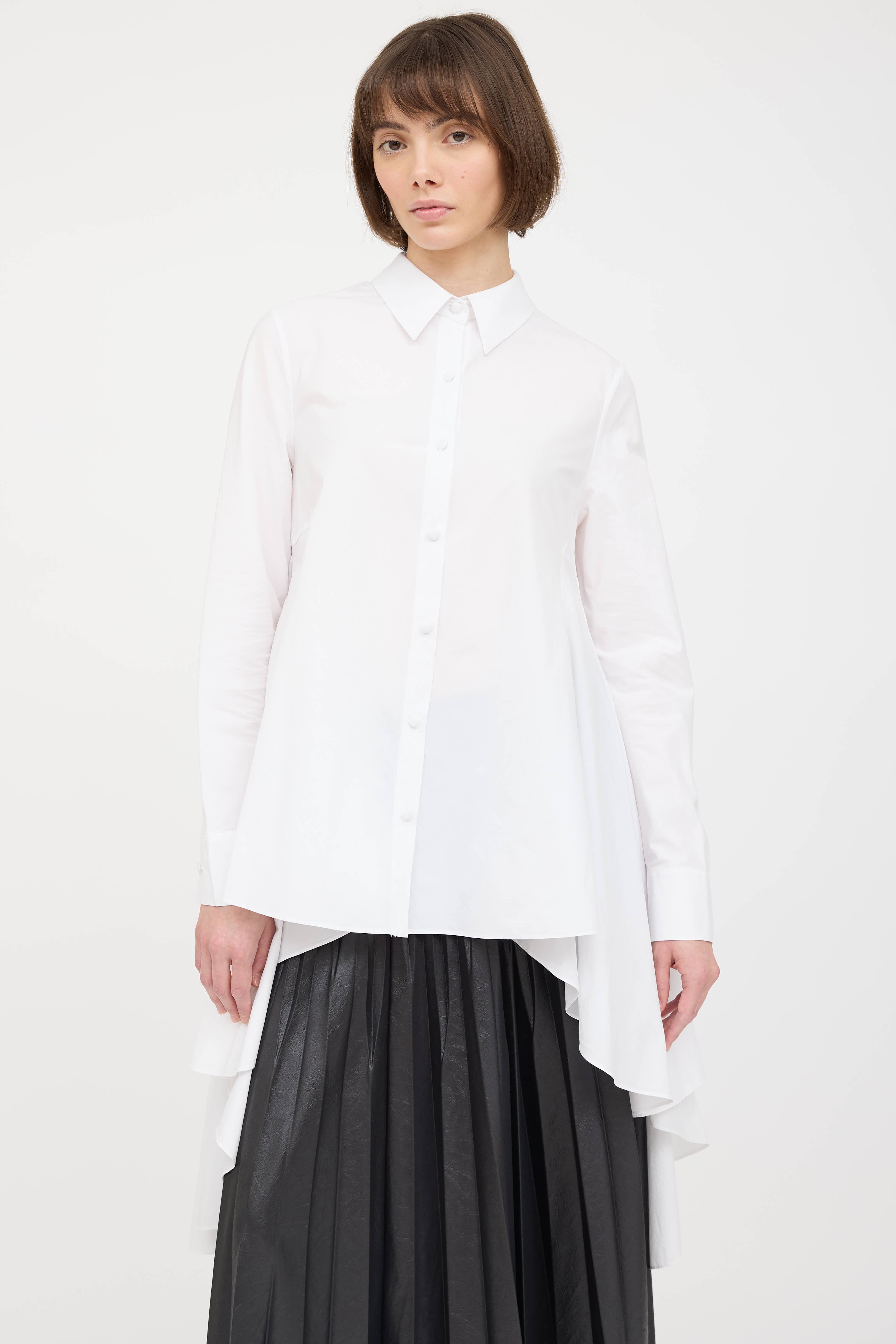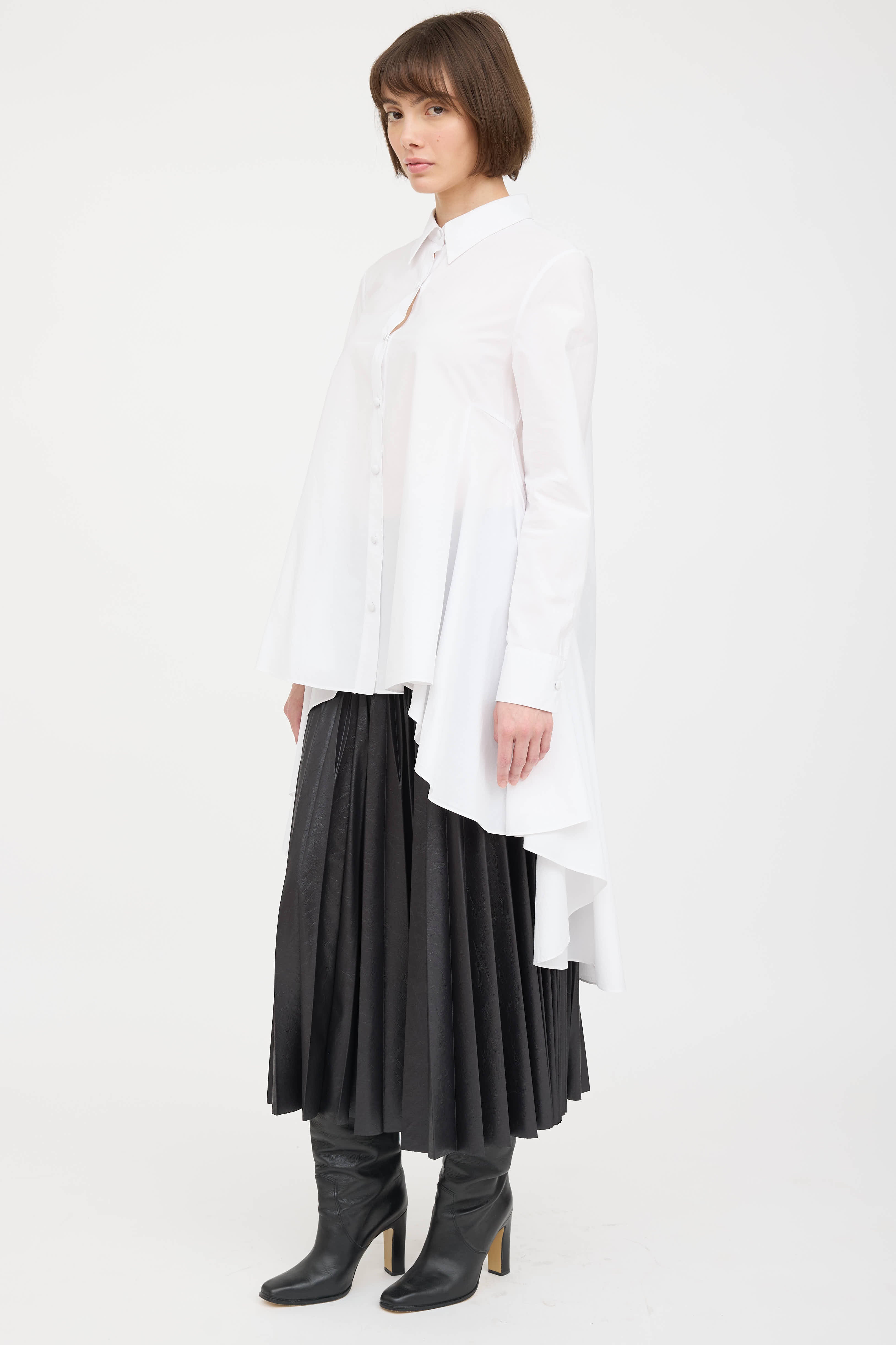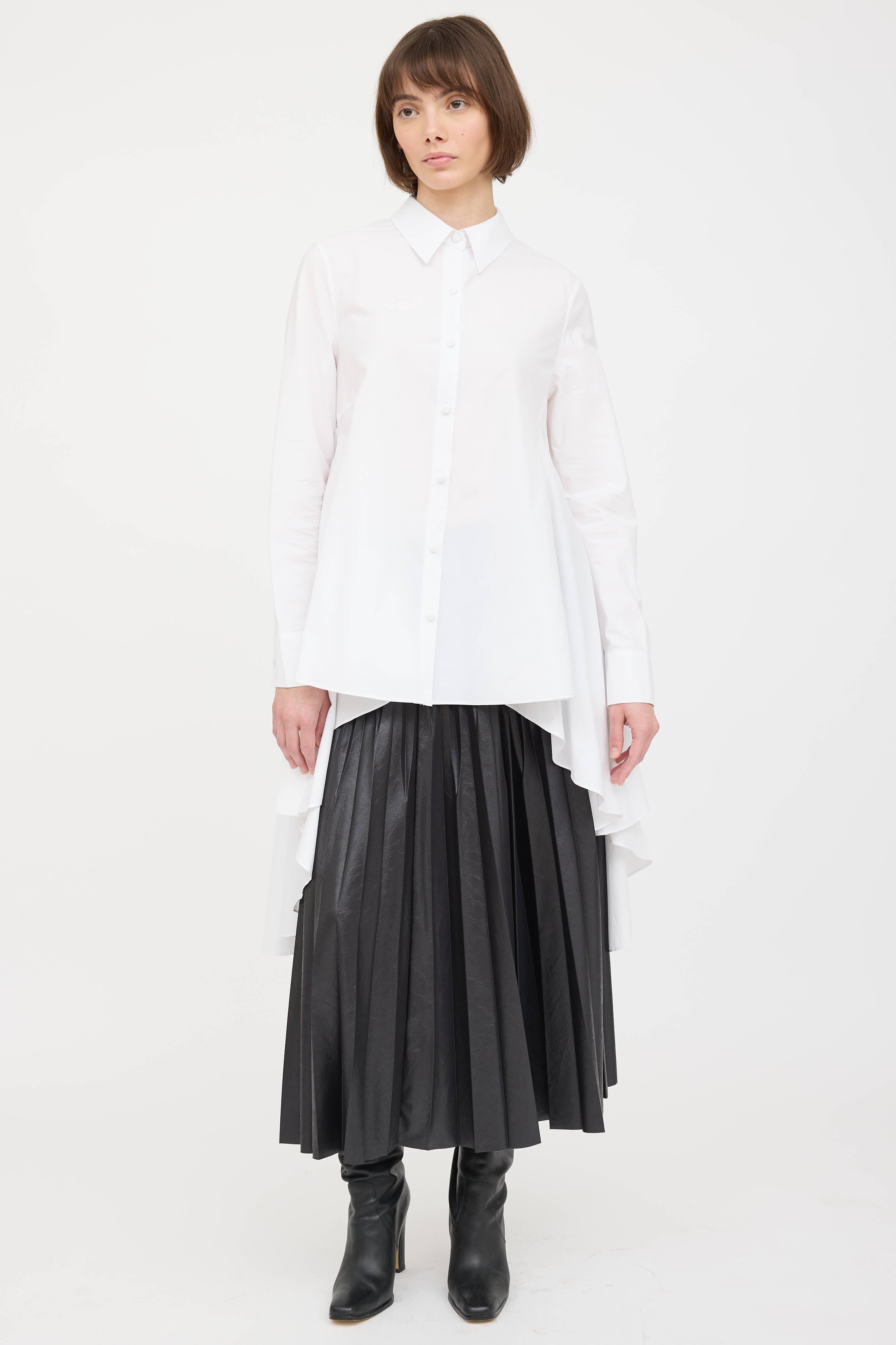 Pre-owned Co white shirt dress featuring a pointed collar, long sleeves with buttoned cuffs, pleated ruffled front, high low hem, and button up closure.