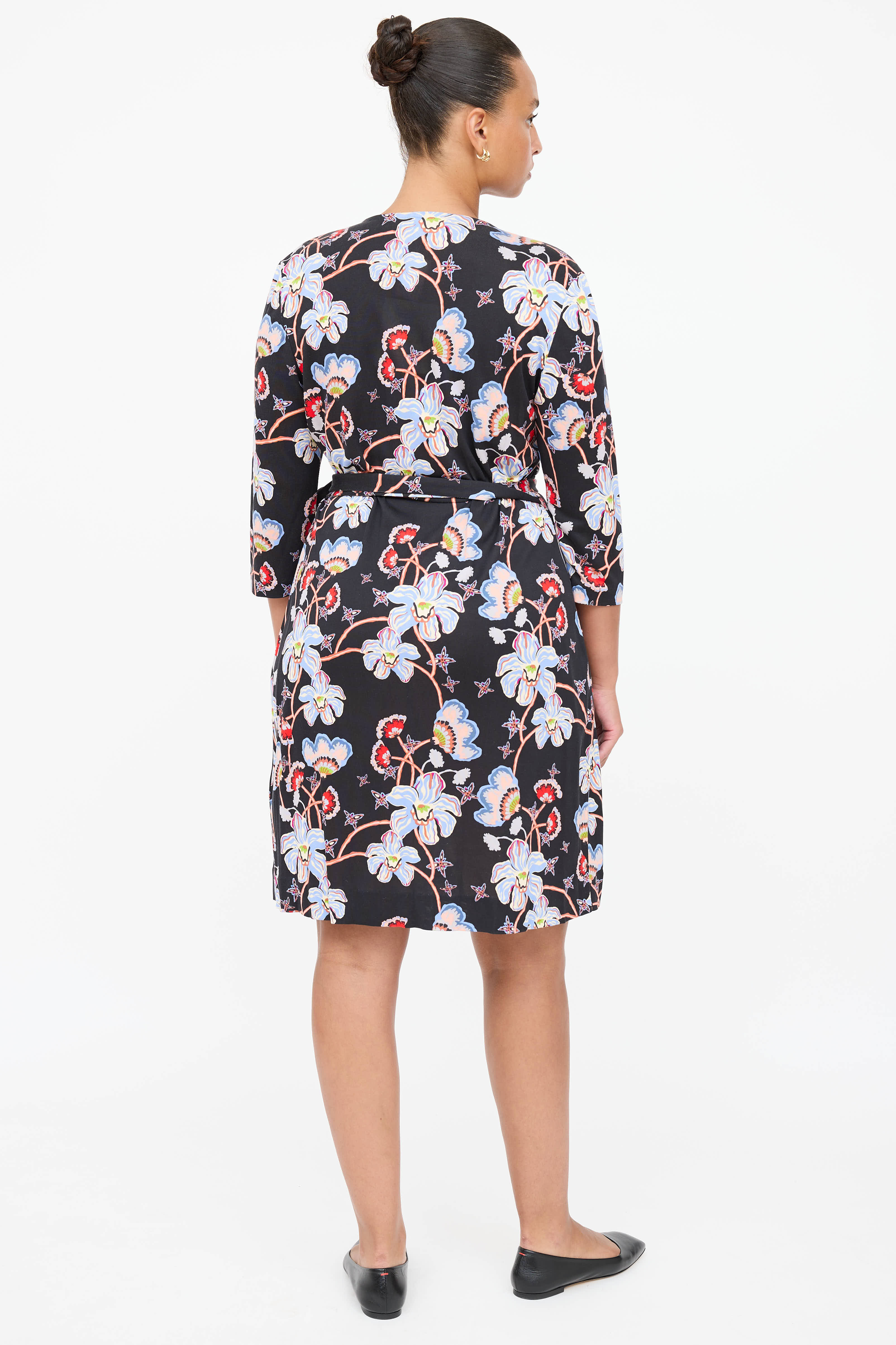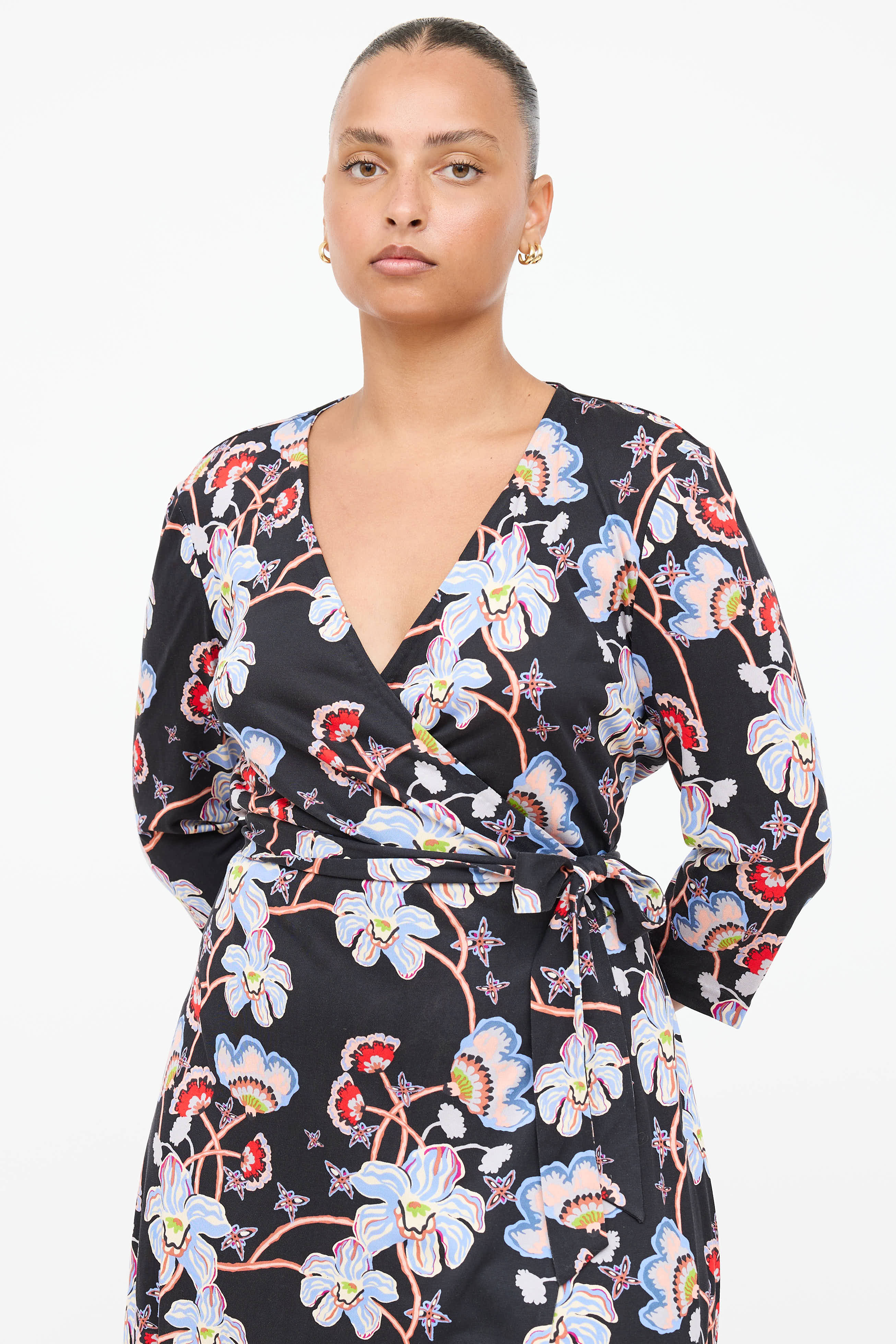 Diane von Furstenberg black Julian dress featuring a multicolour floral pattern throughout, surplice neckline, long sleeves, and wrap tie closure.