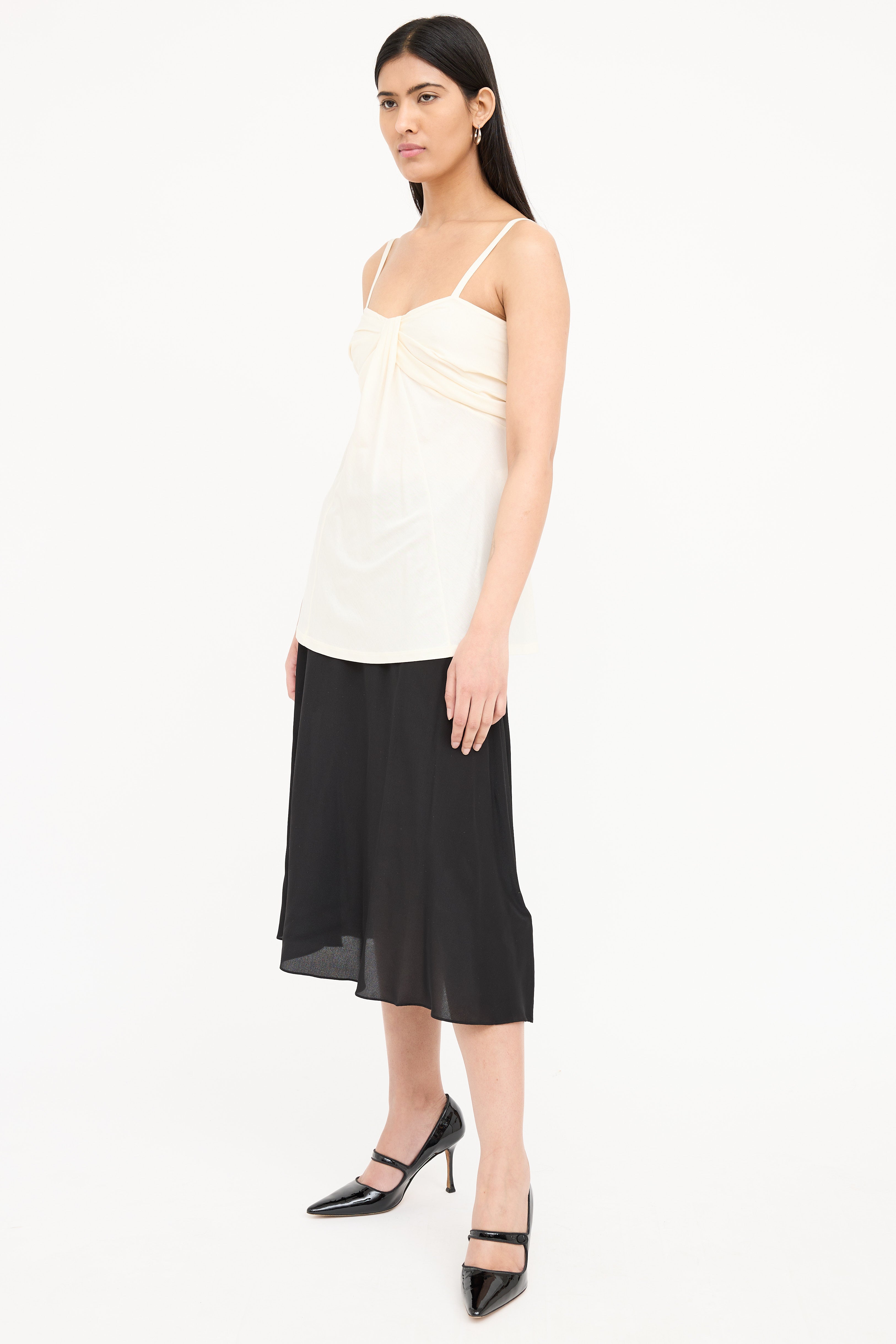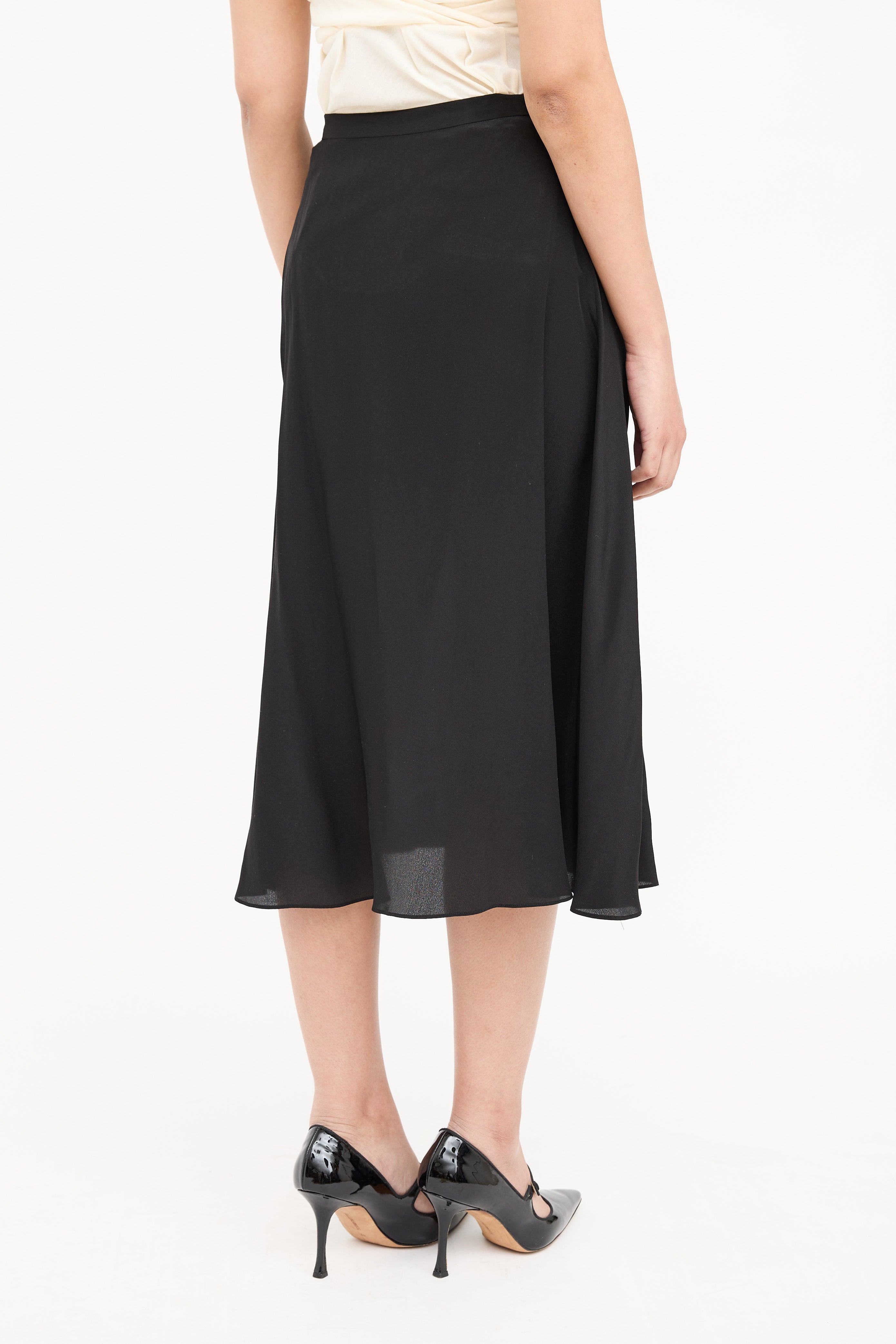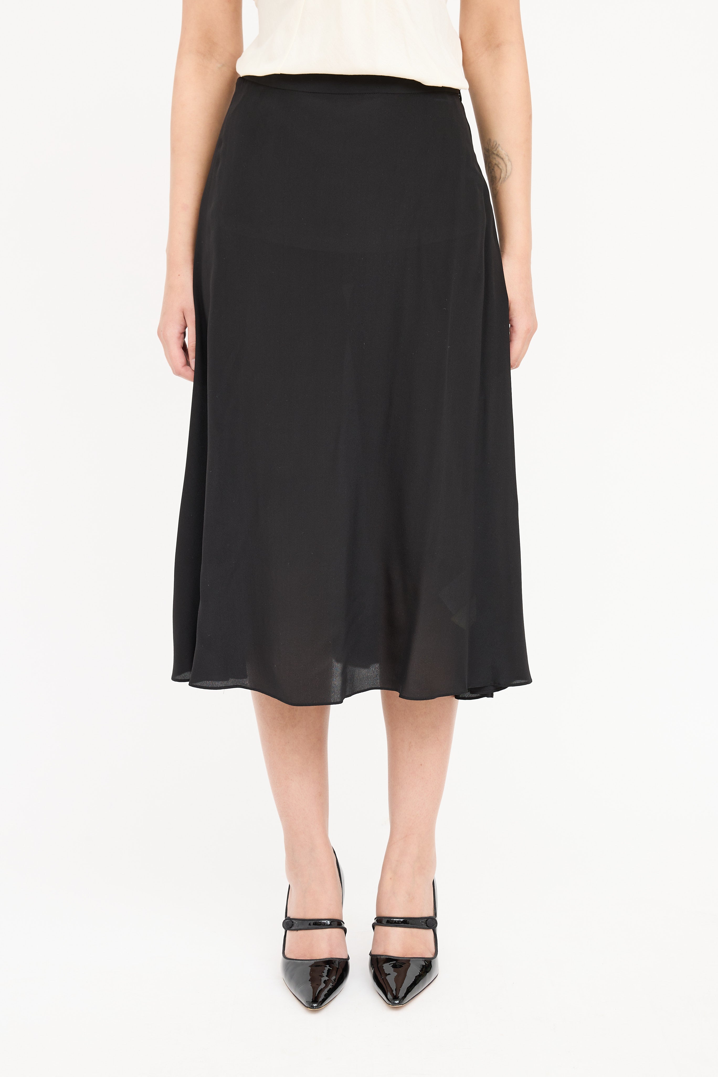 Pre-owned Dior black satin midi skirt featuring banded waist, semi sheer, and zip entry.