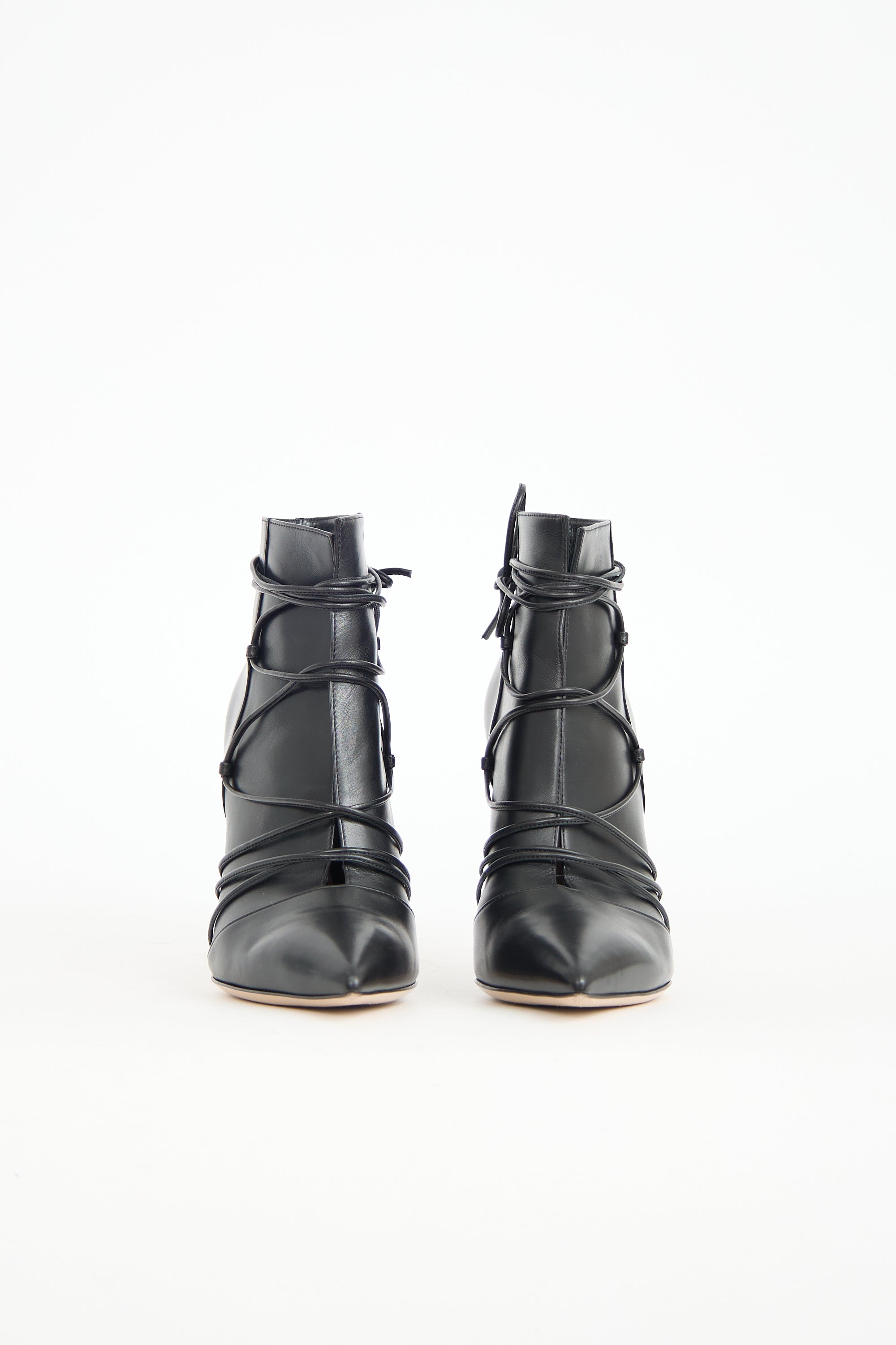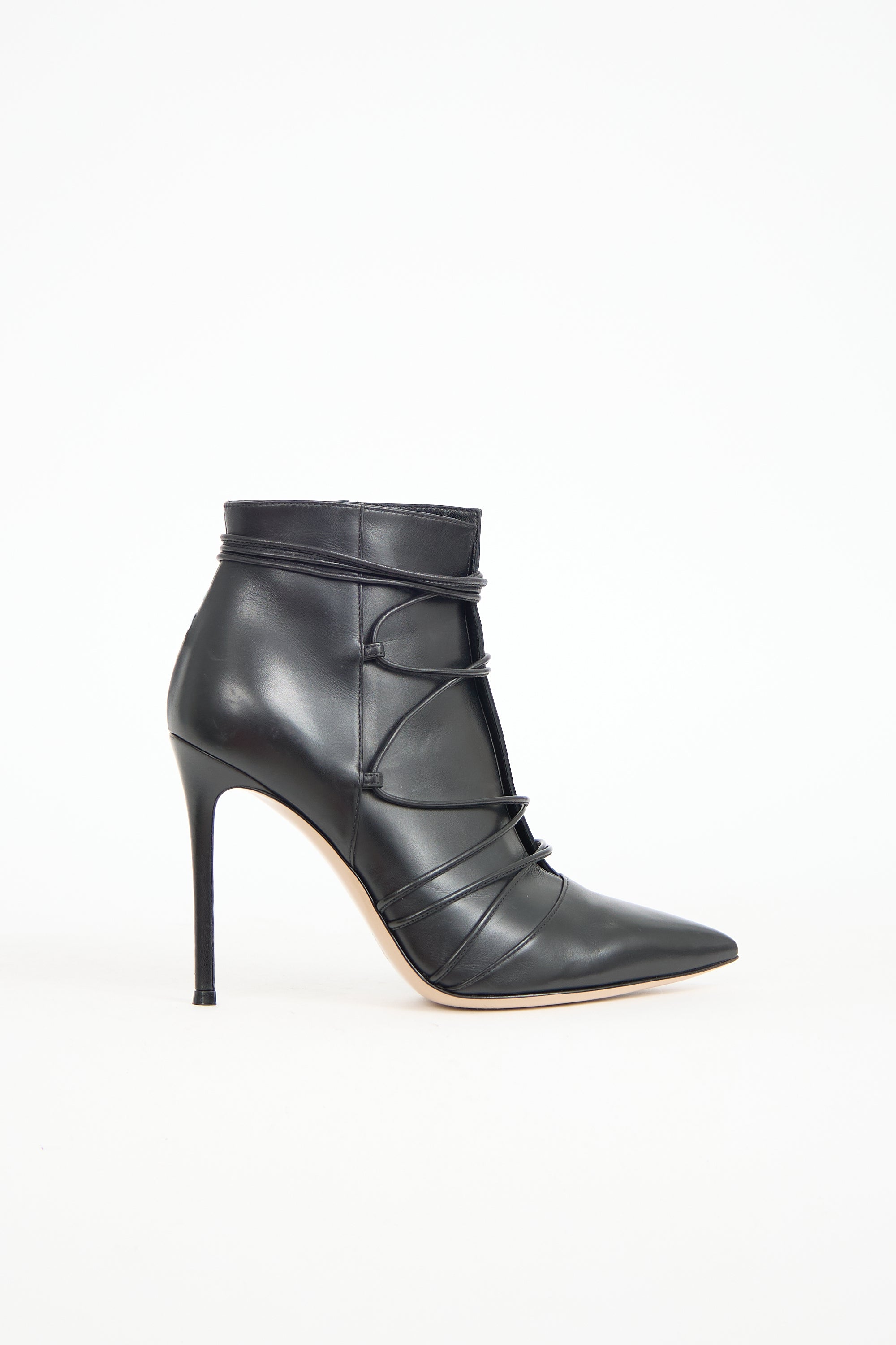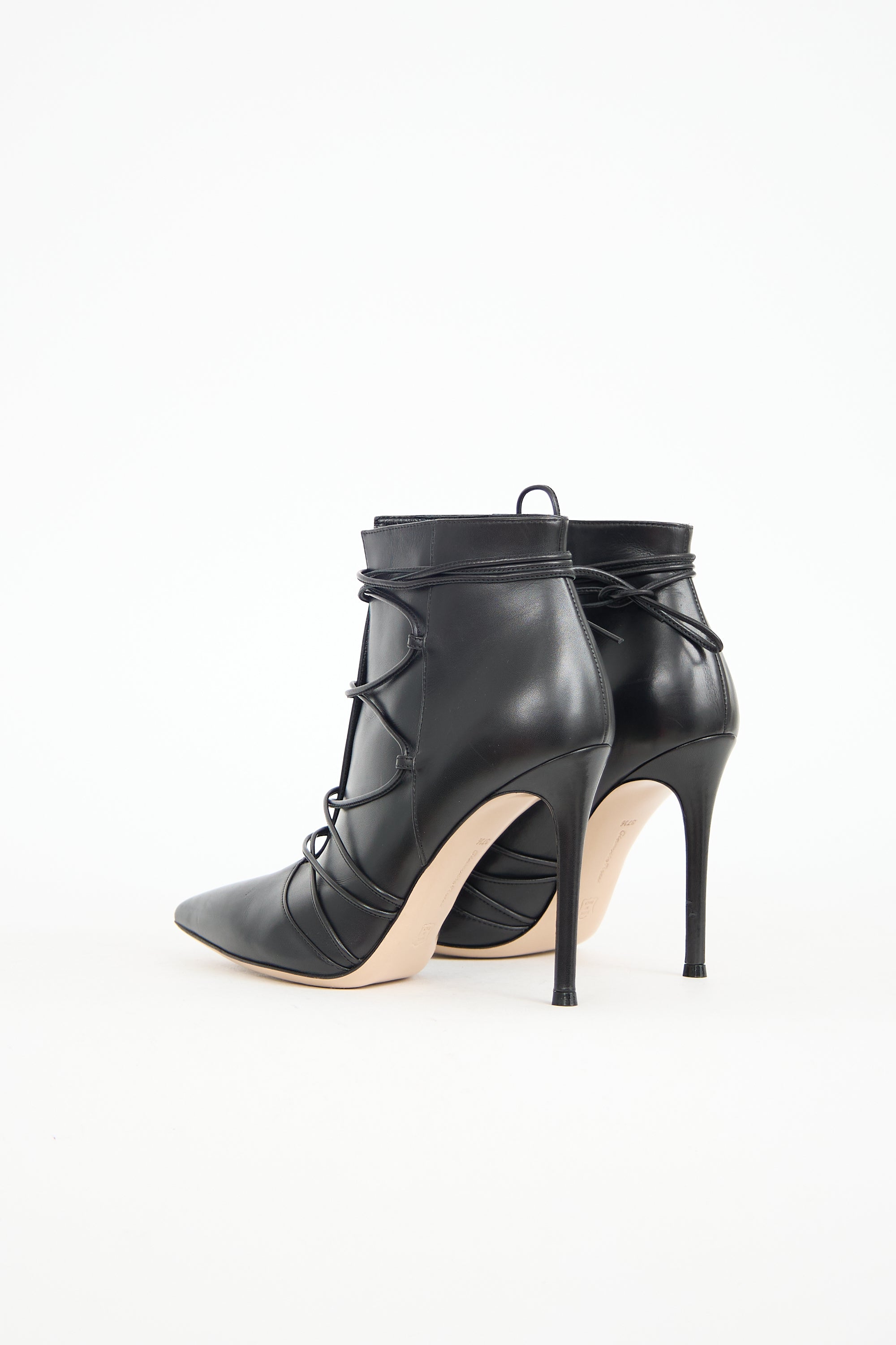 Pre-owned Gianvito Rossi black leather ankle boots featuring a pointed toe, lace up uppers with wrap around ankle styling, cut out instep, and a covered stiletto heel. Comes with original dust bag and box.
