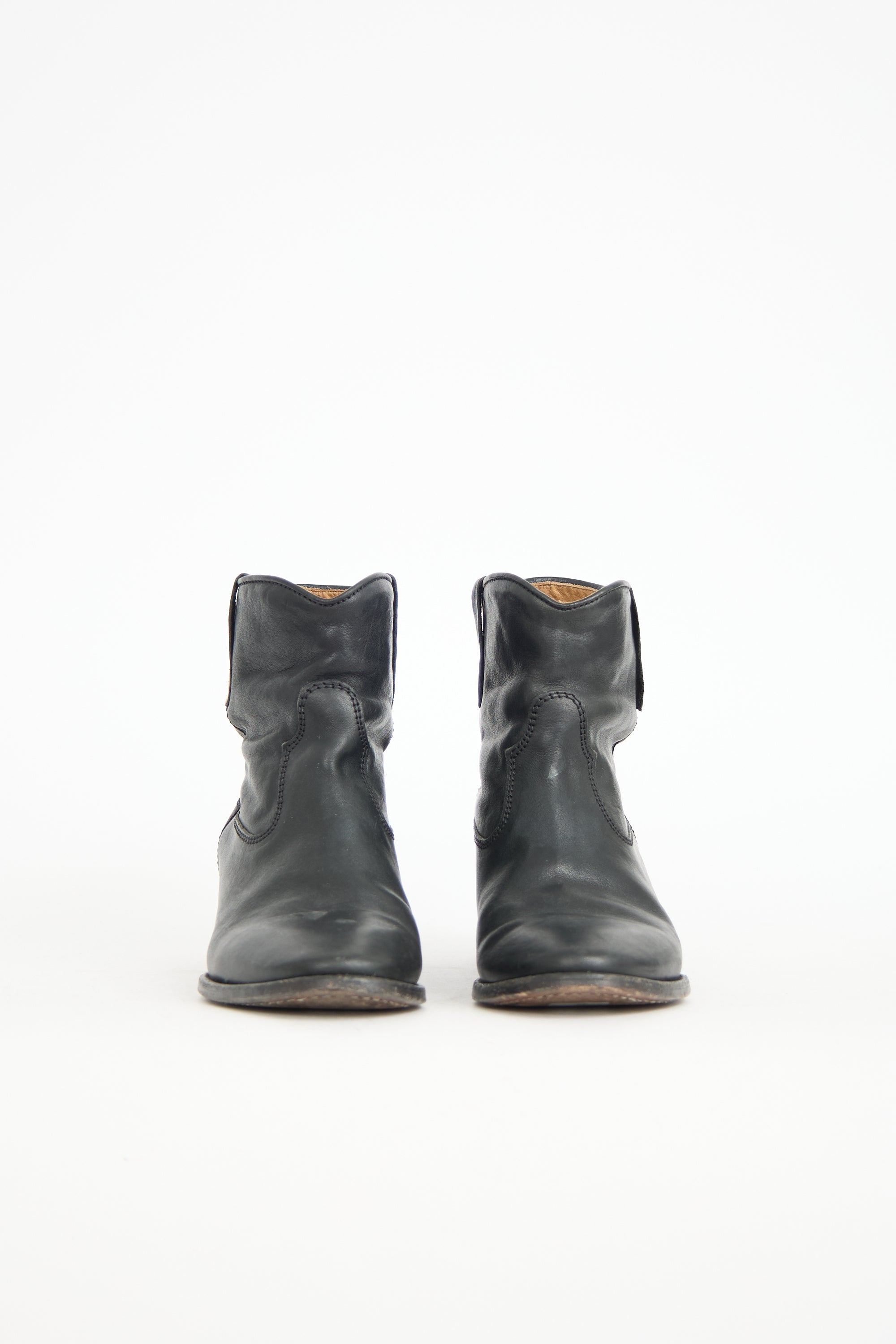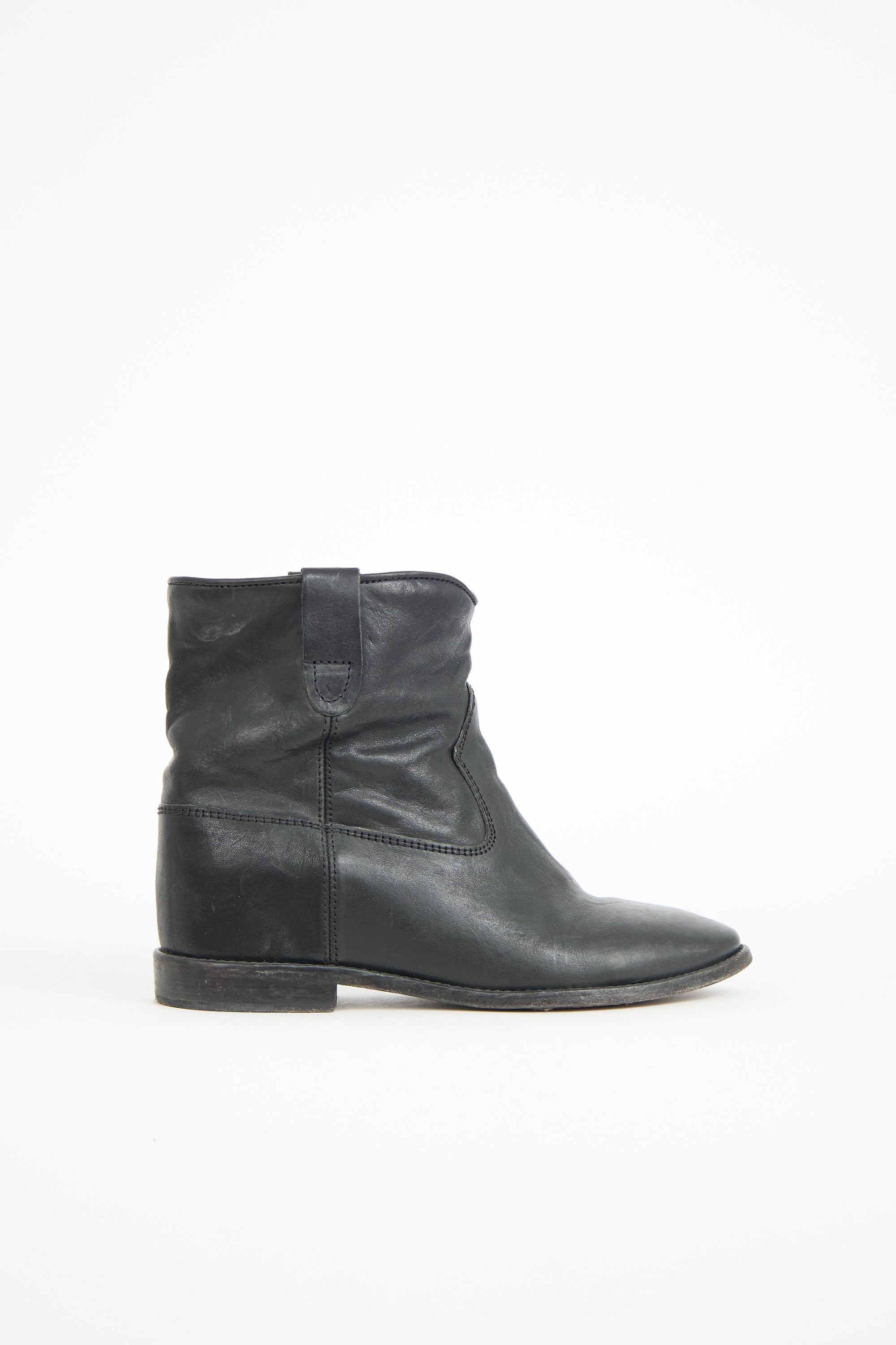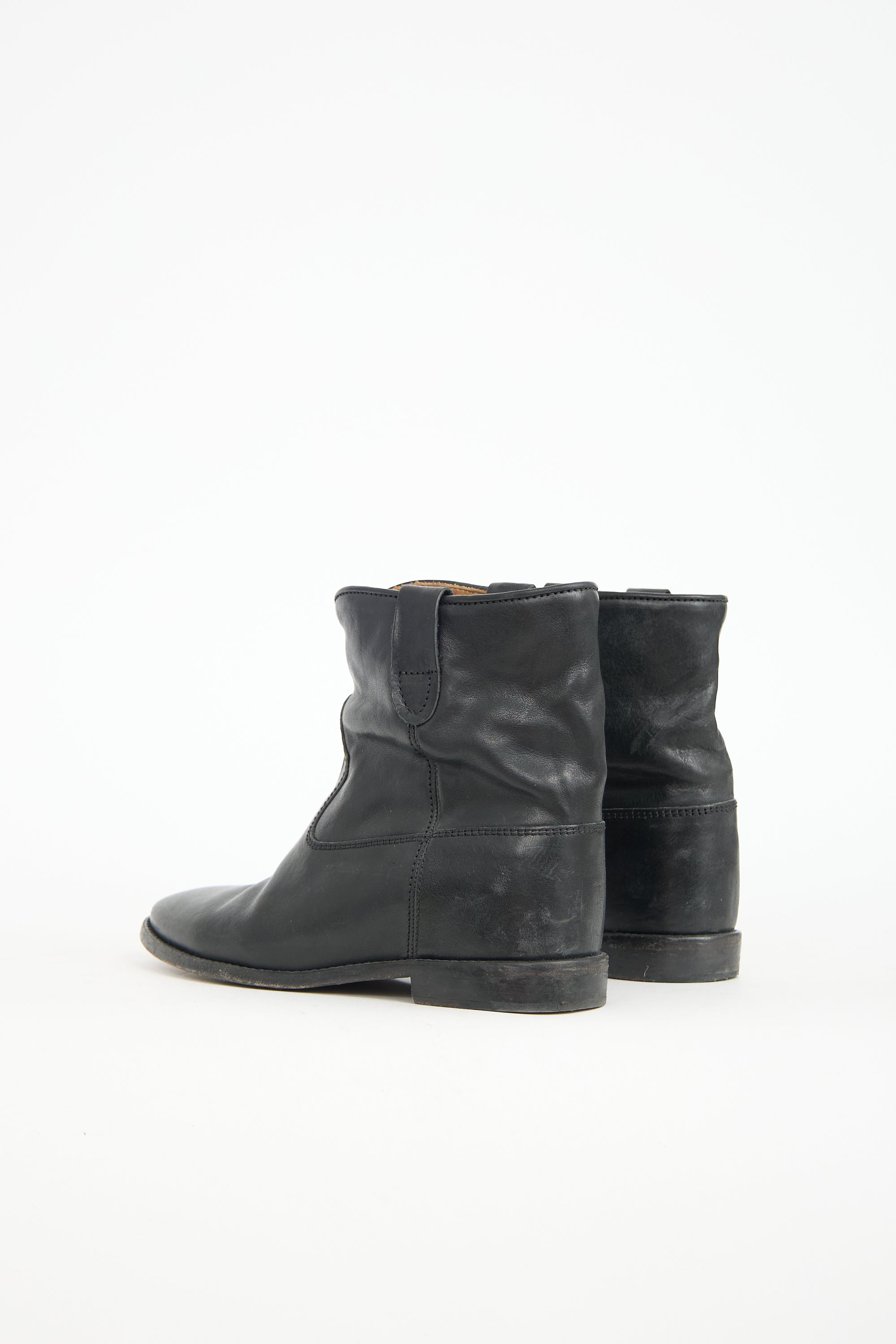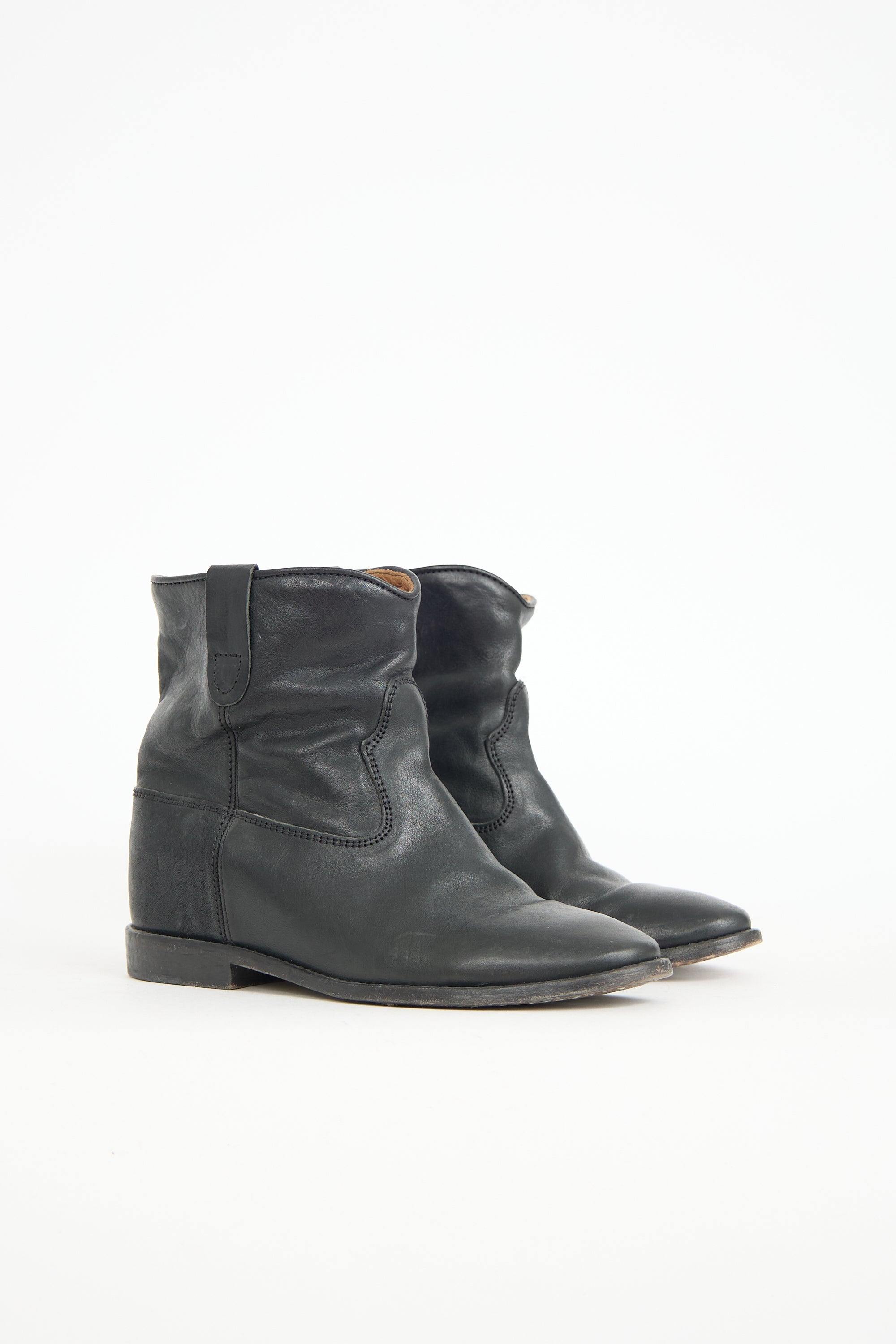 Pre-owned Isabel Marant black leather Crisis Cluster boots featuring a rounded toe, two pull tabs at collar sides, and a small stacked heel.