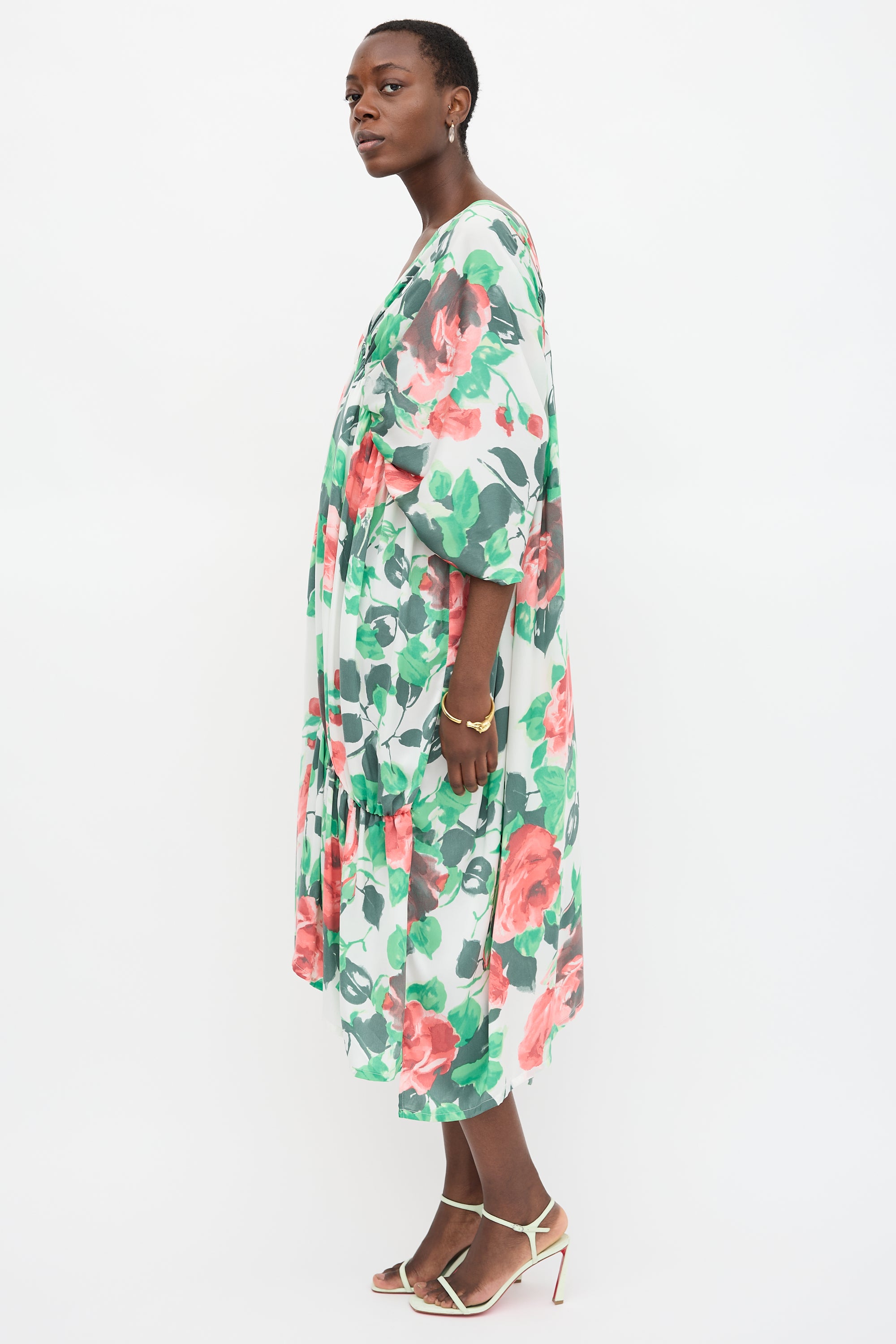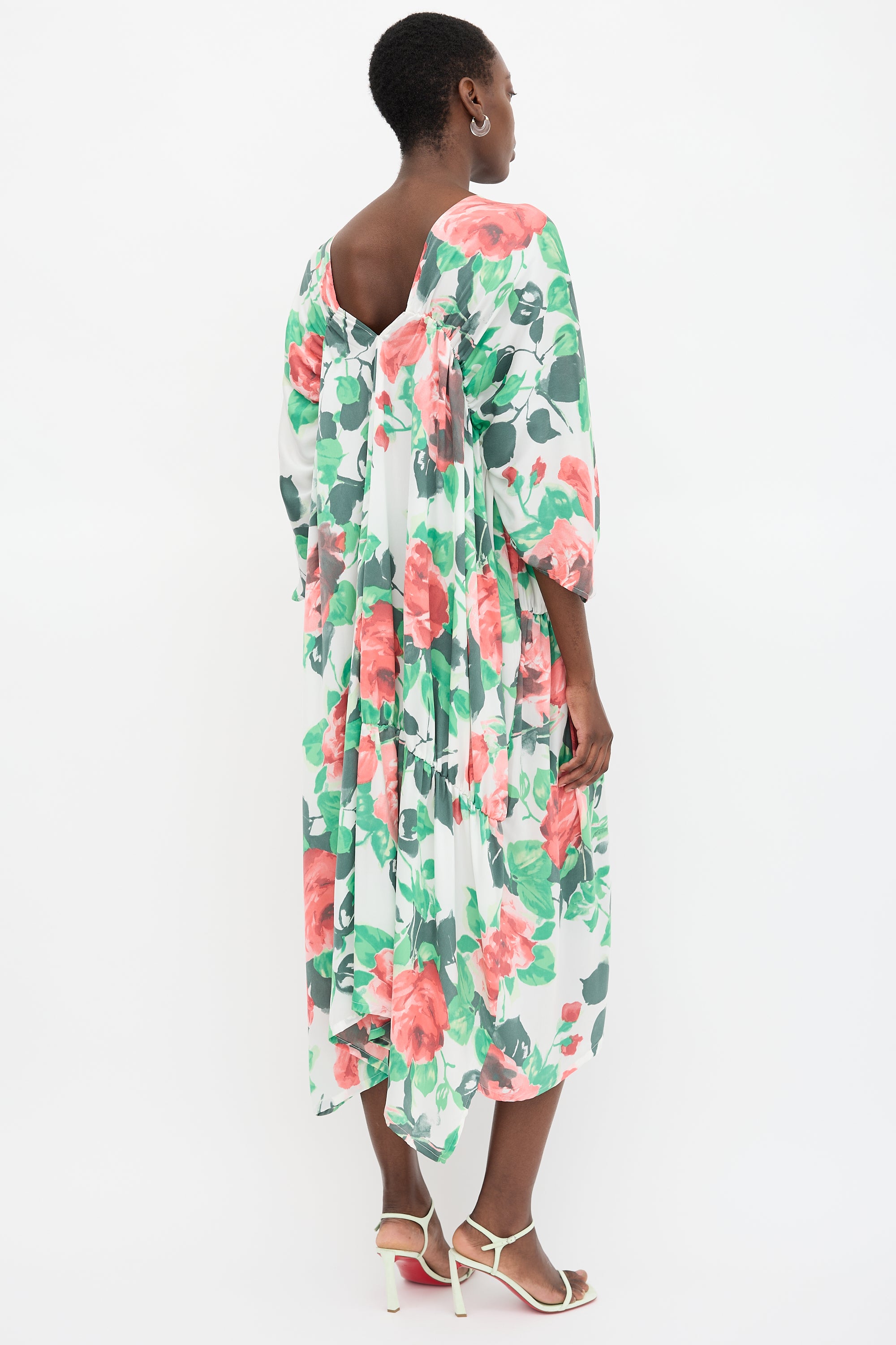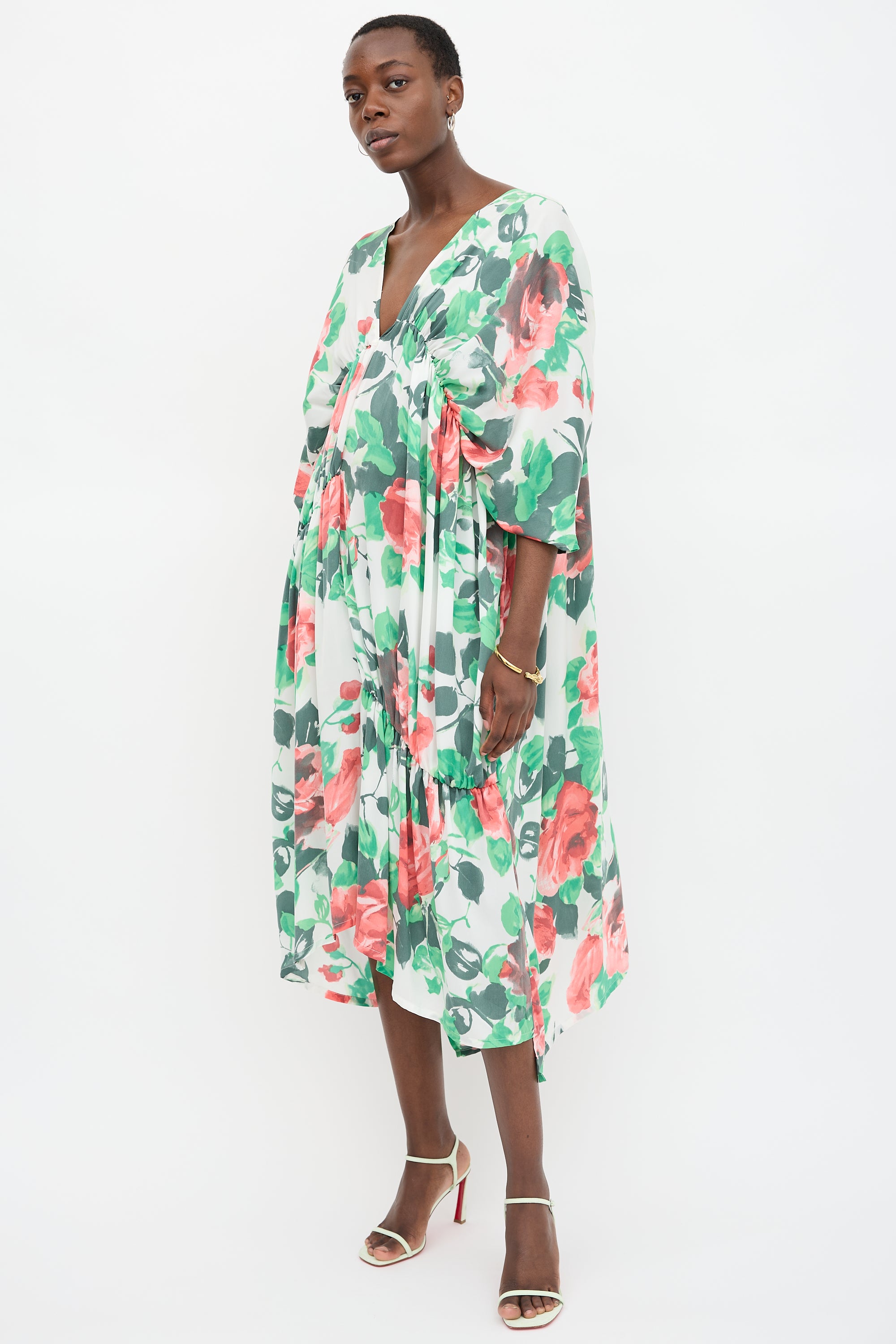 Pre-owned Ivan Grundahl white dress featuring pink and green floral print, plunge neckline, elasticized empire waist, and asymmetrical ruching.