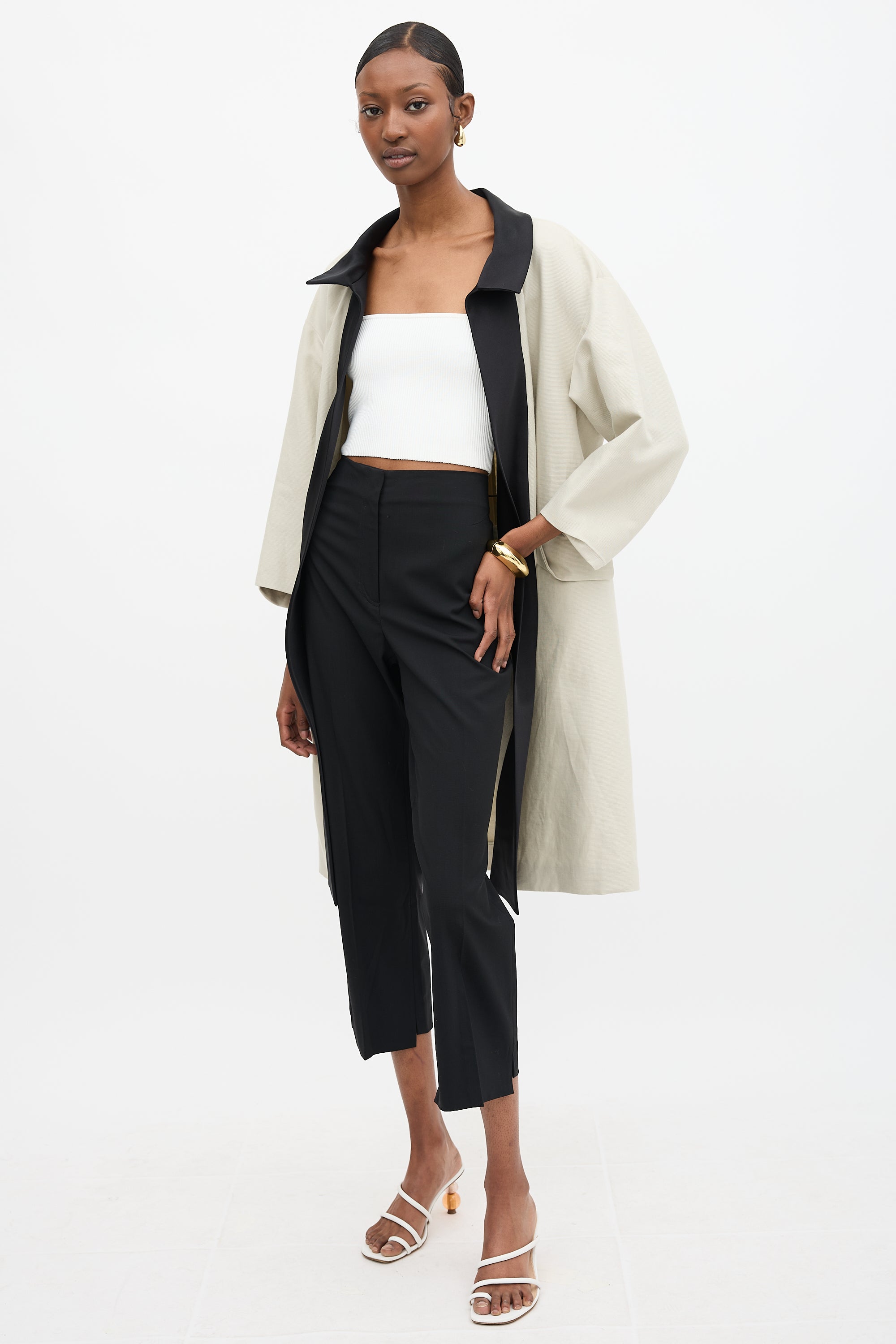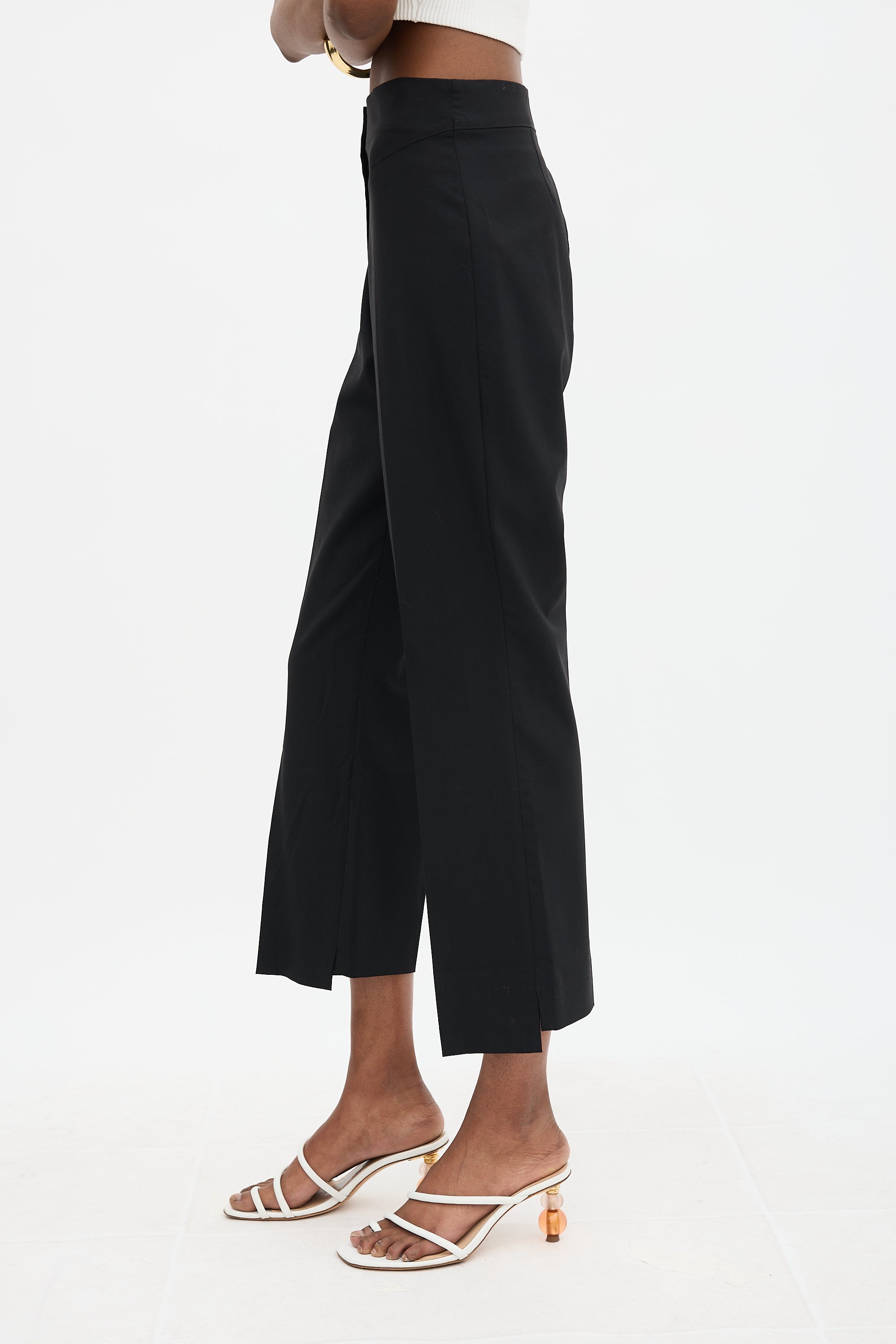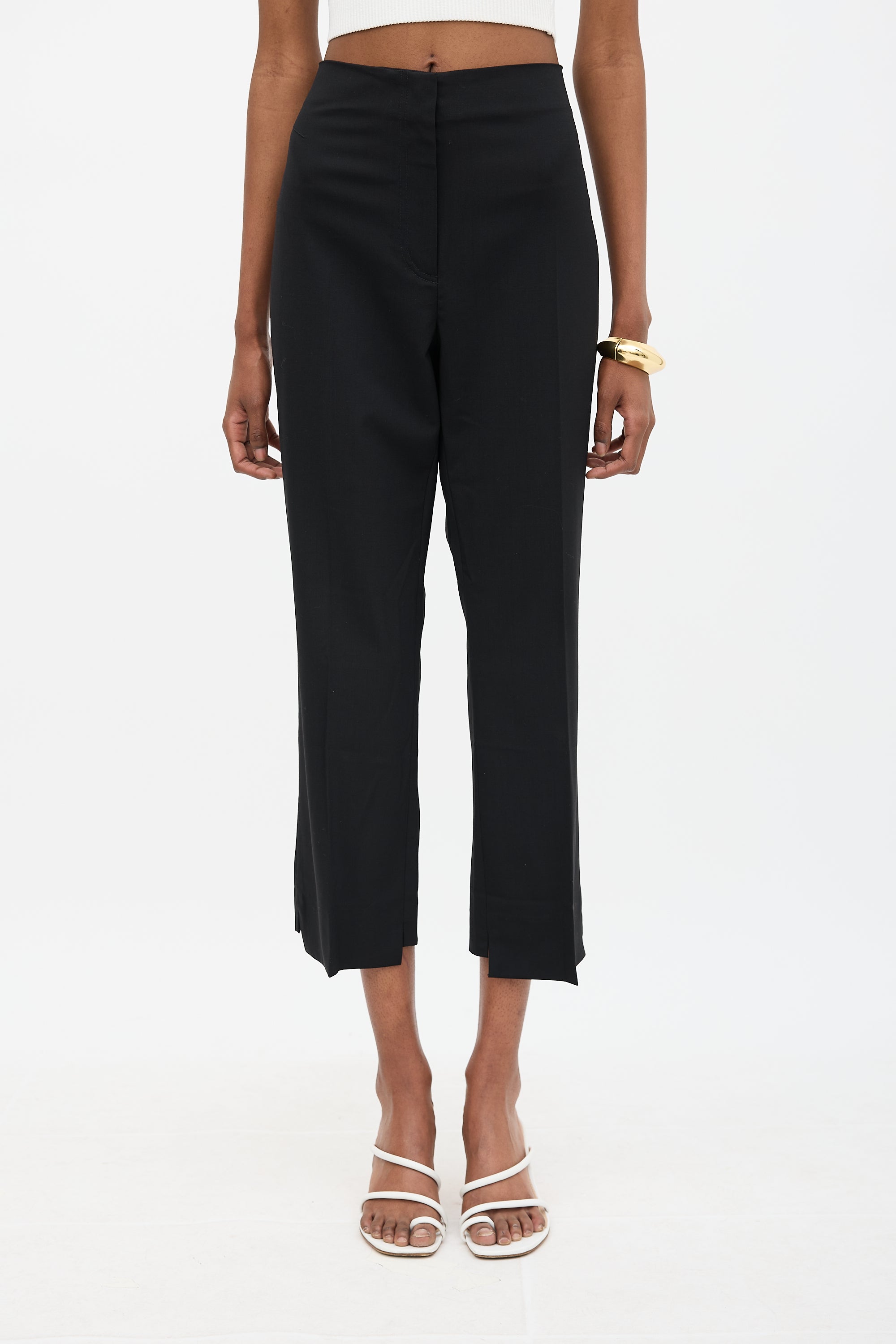 Pre-owned Jacquemus black wool blend trousers featuring a mid rise, zip fly, cropped straight leg, and hi-low hems. Unlined.