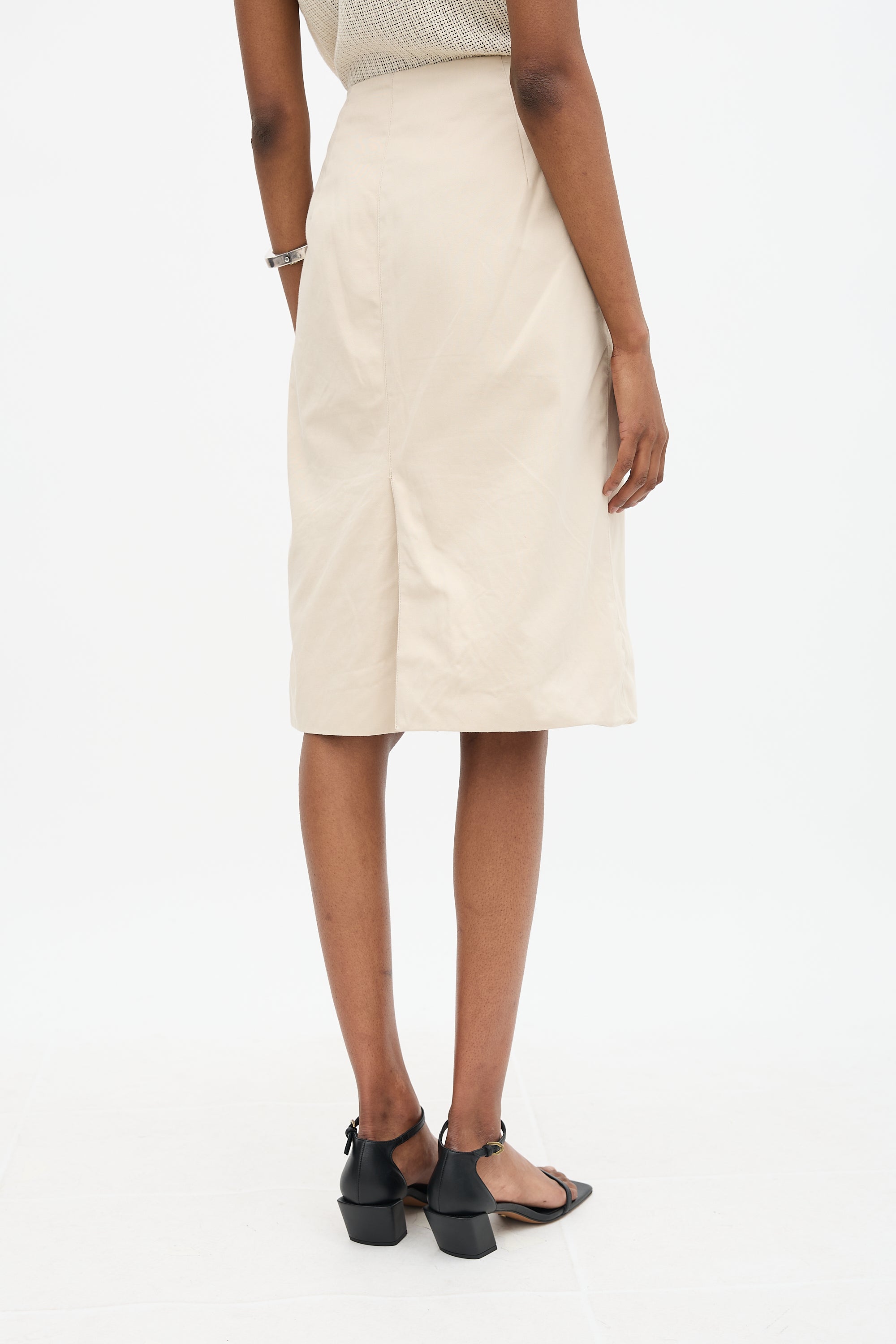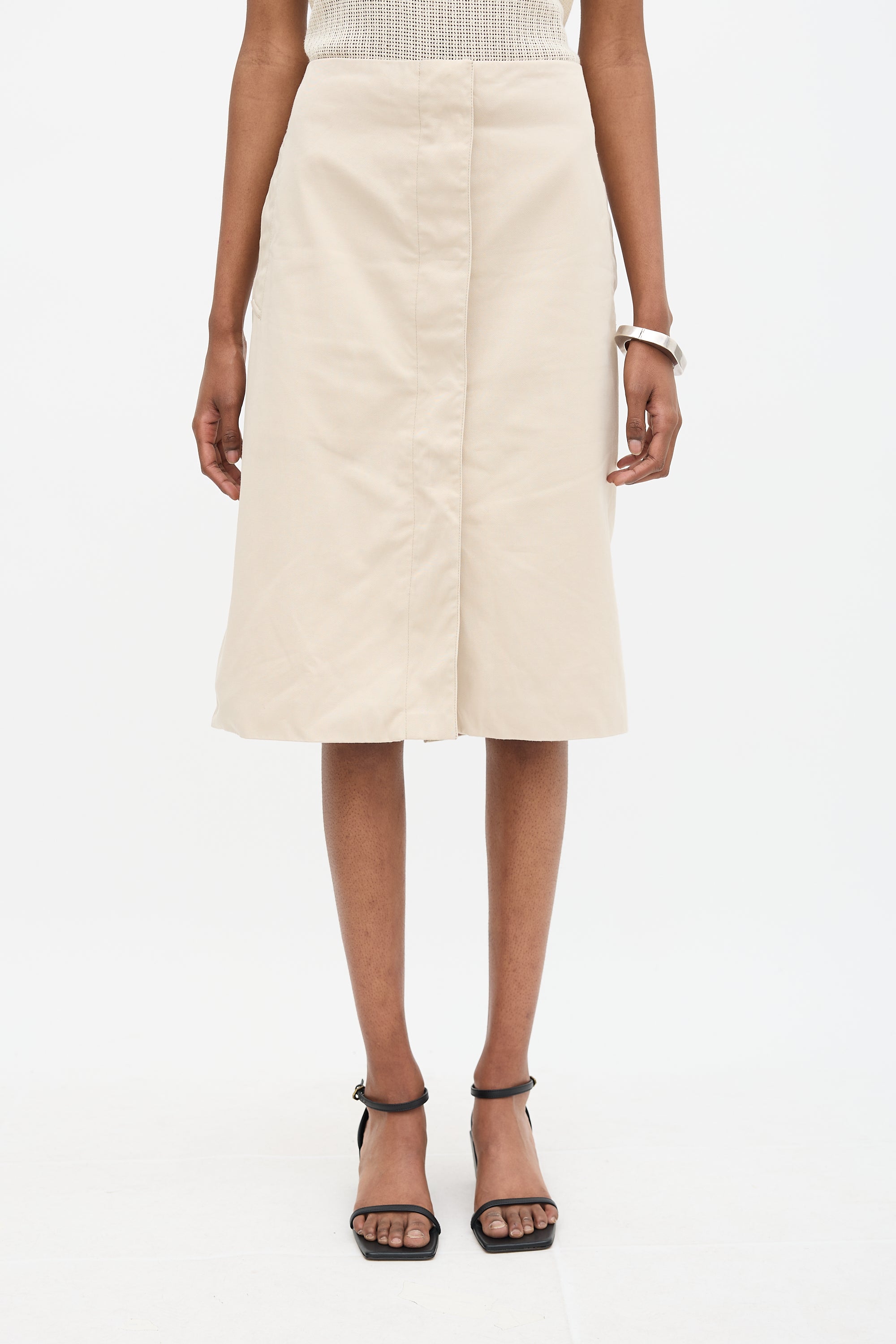 Pre-owned Lemaire beige midi skirt featuring concealed button front, two pocket styling, and back vent. Lined.