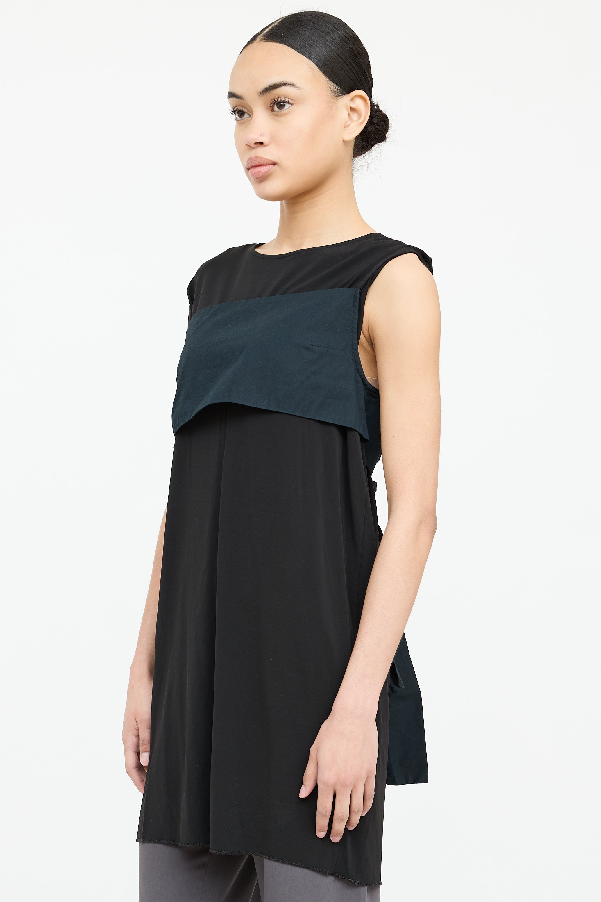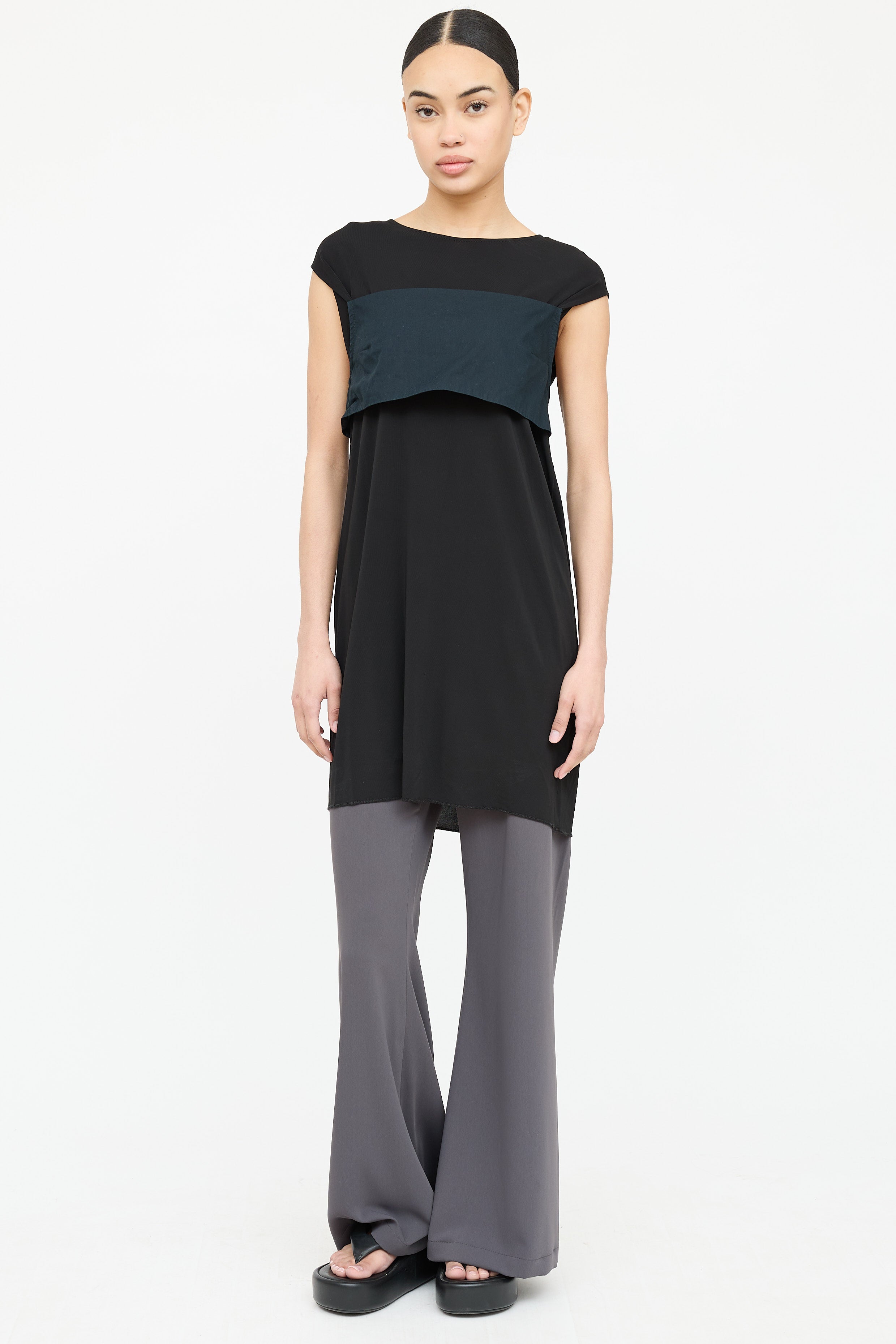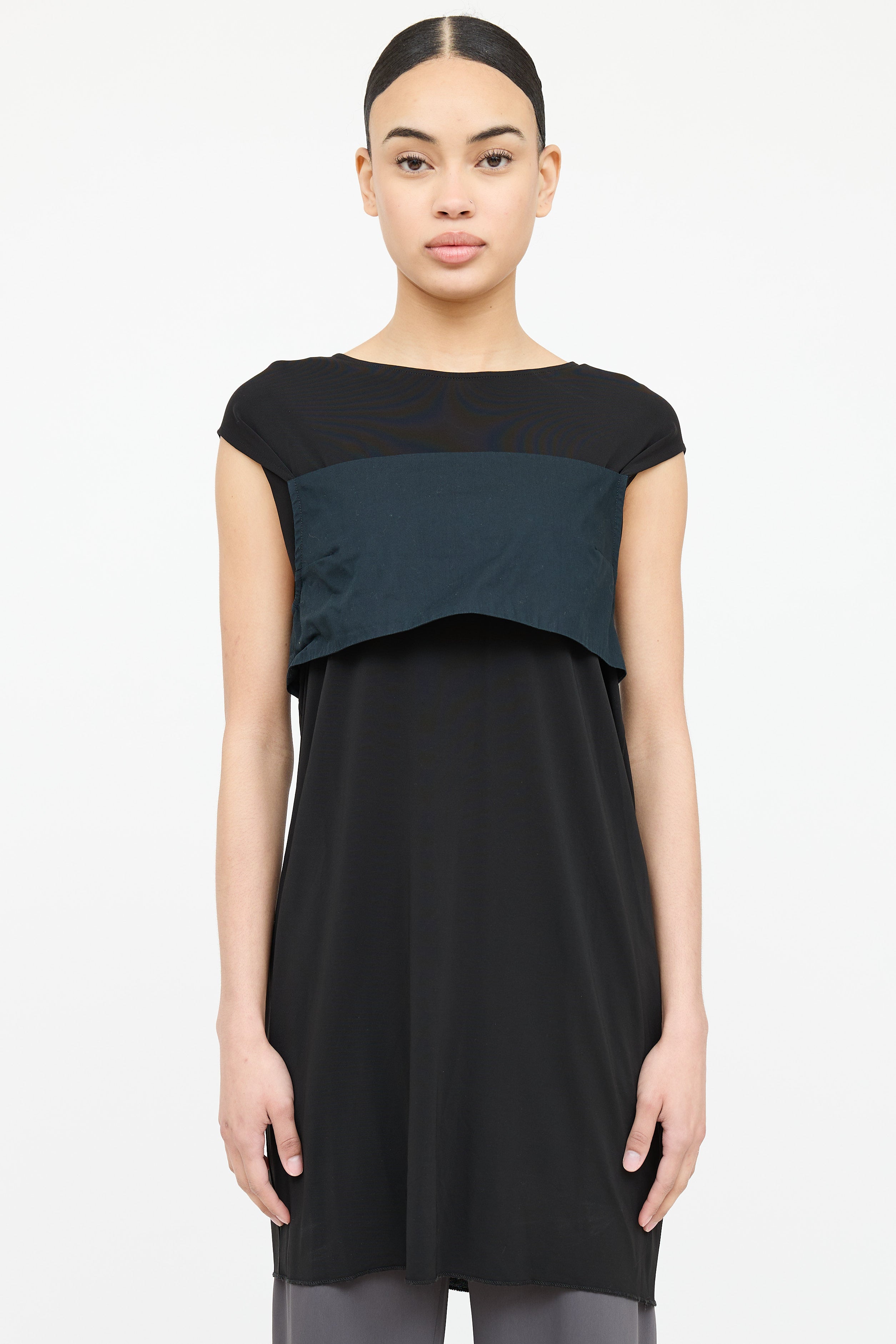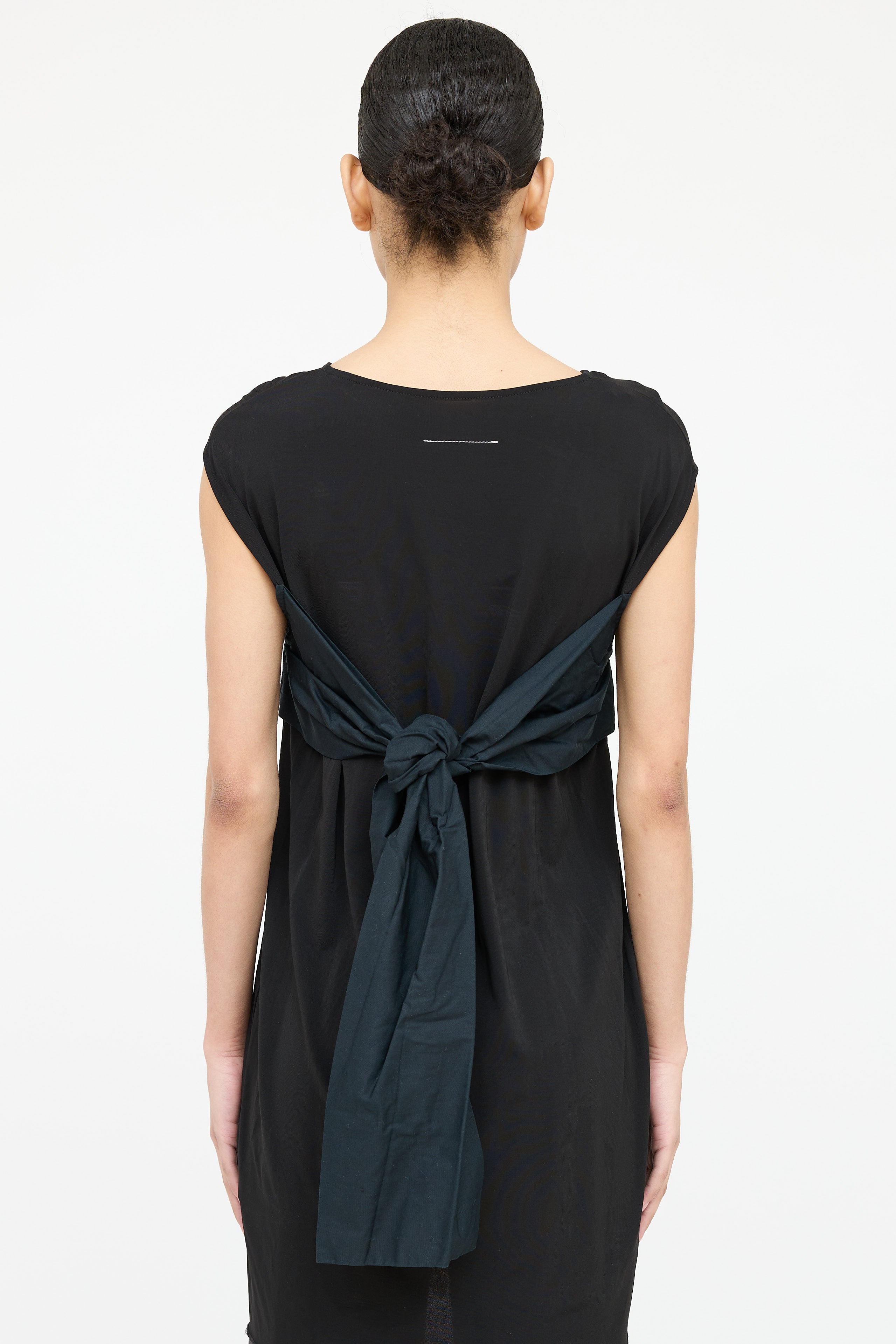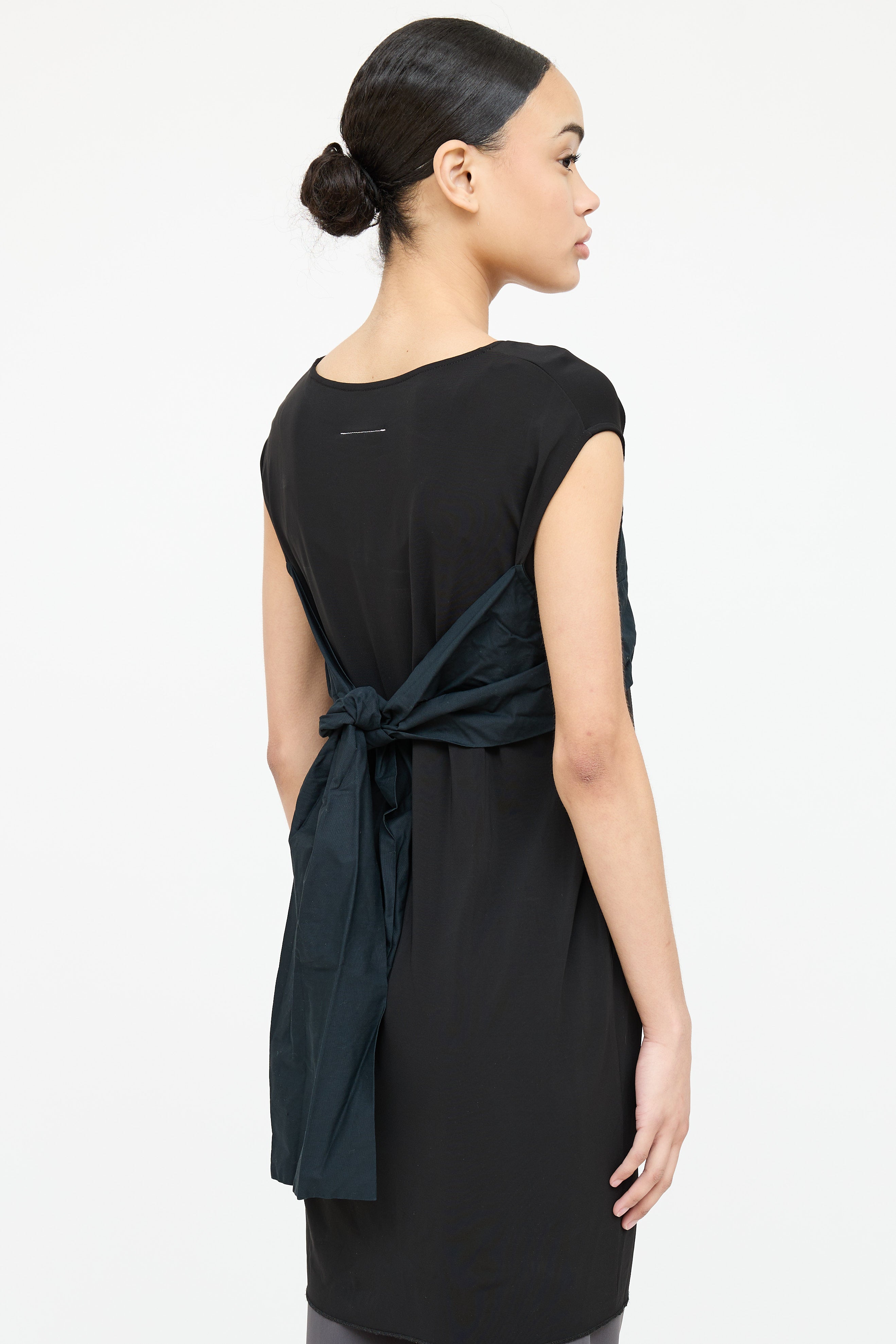 Pre-owned MM6 Maison Margiela black short sleeve semi sheer dress featuring round neckline, and extended panel at front with tie at back.