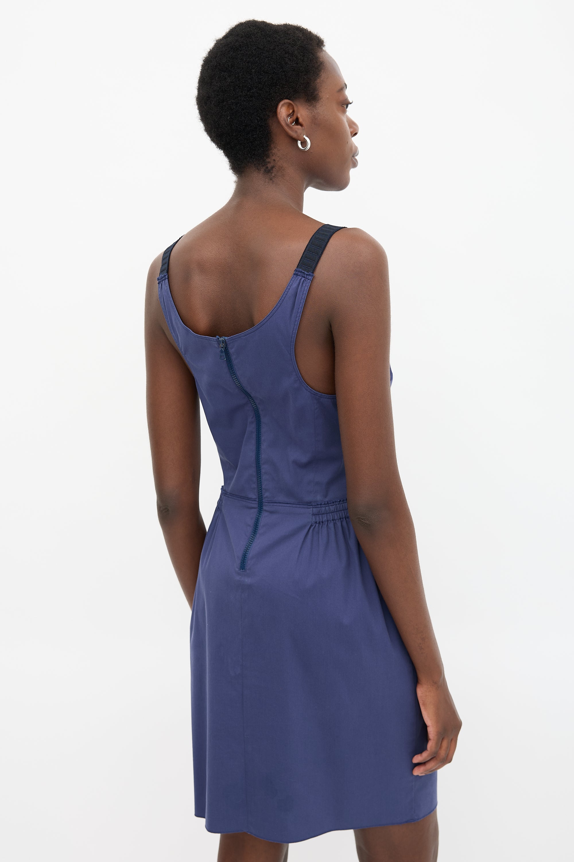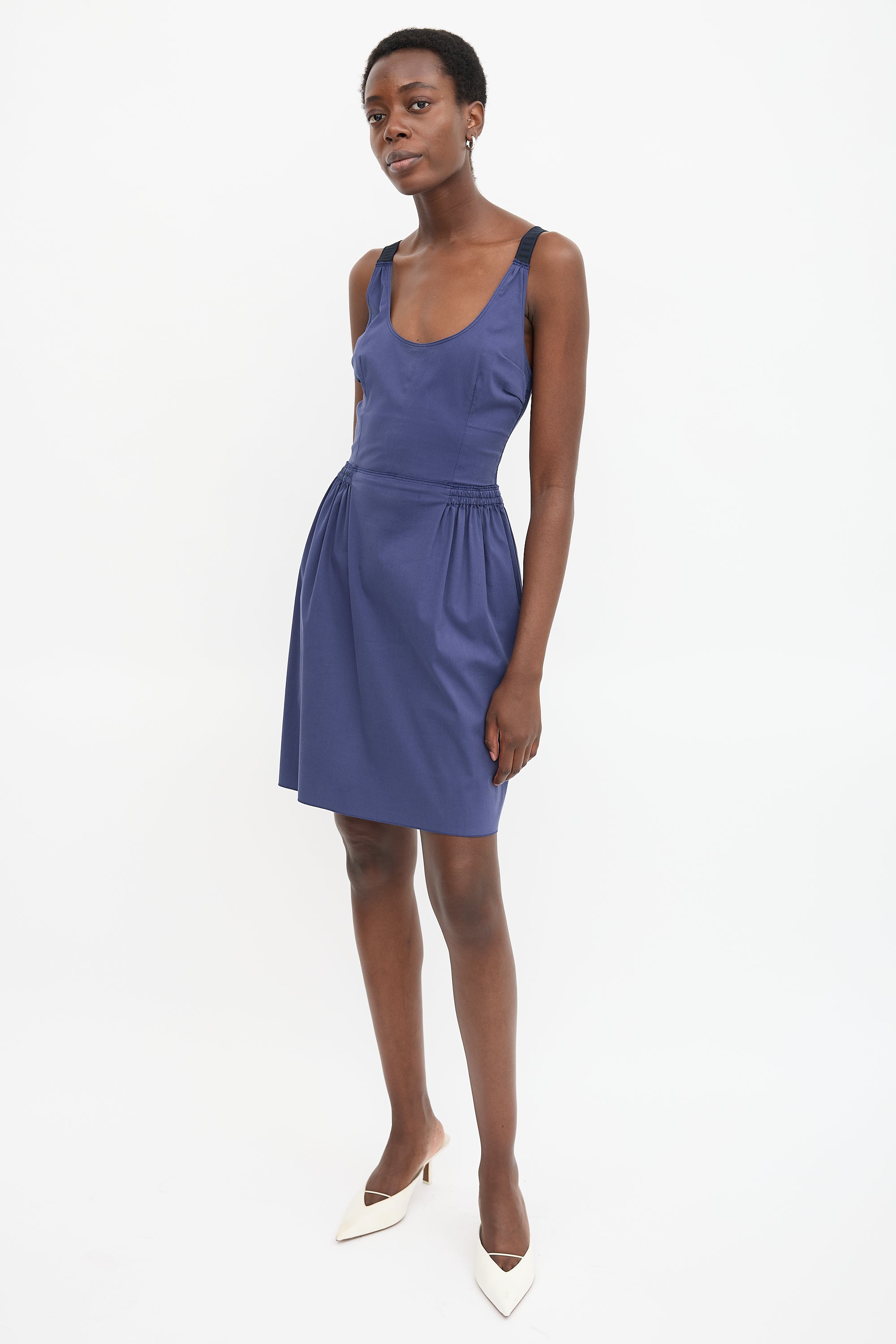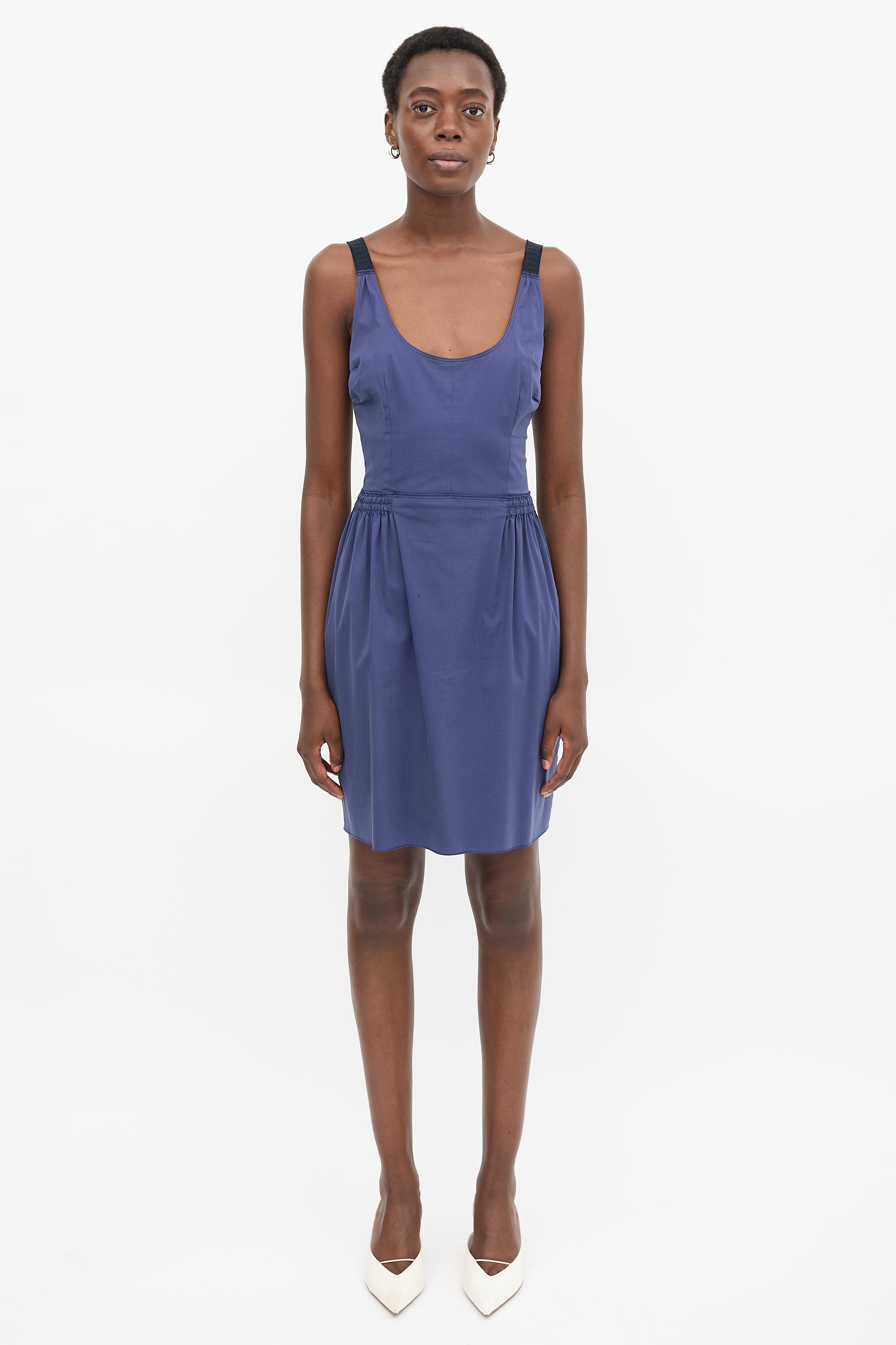 Pre-owned Prada blue mini dress featuring an inside-out design, elasticized webbing shoulder straps, back zip, pleated bust, and smocked hips. Unlined. Clipped to fit model.