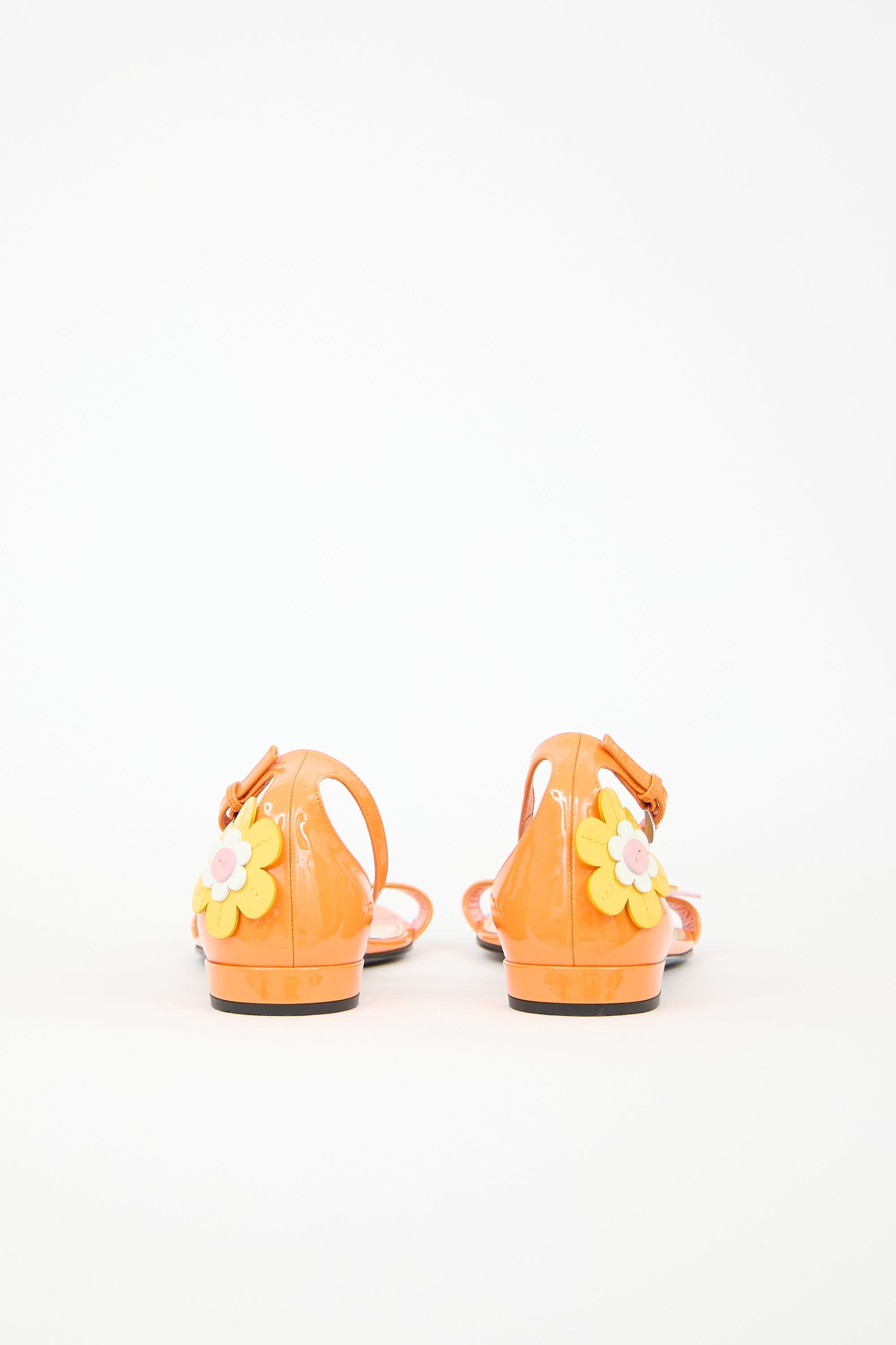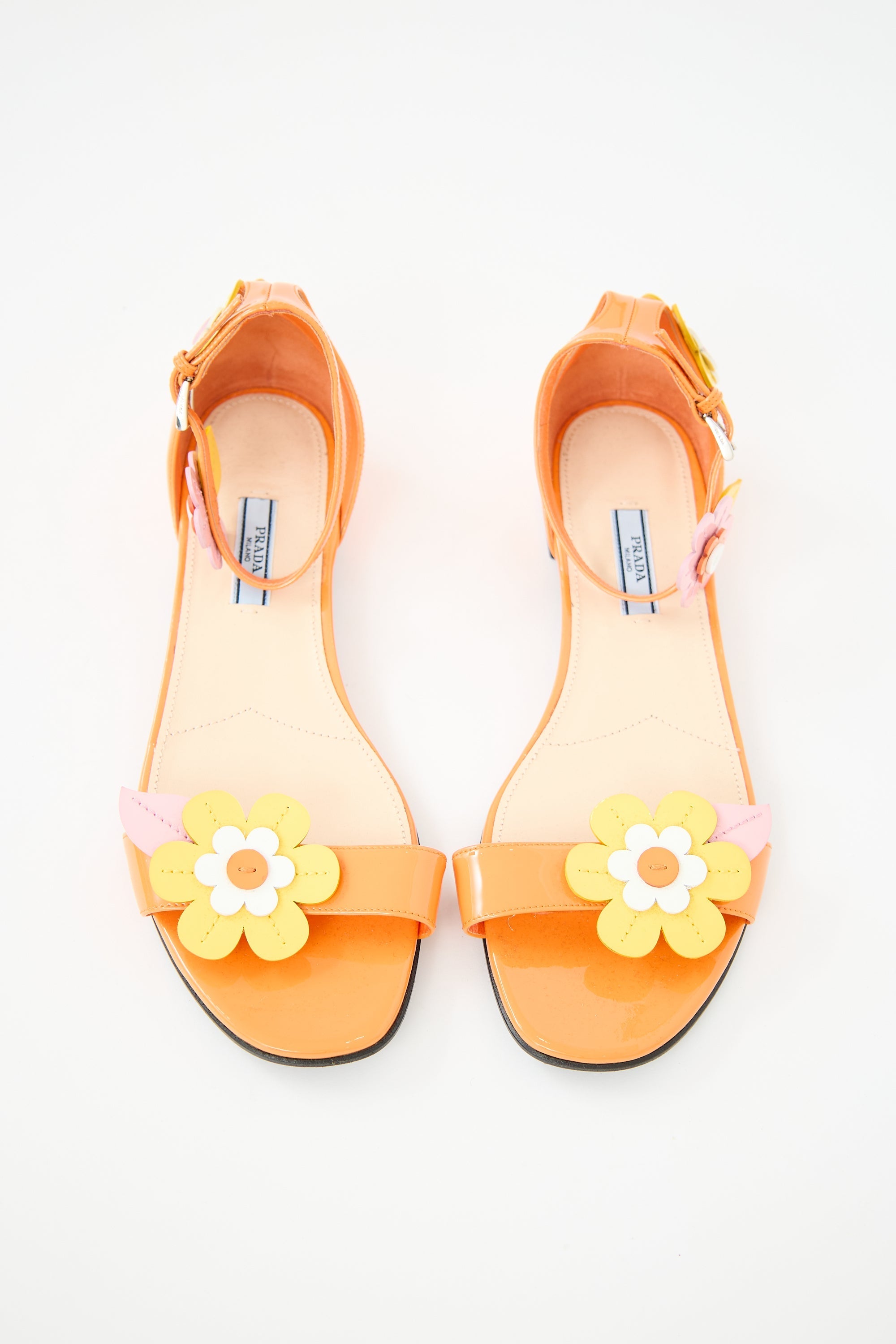Pre-owned Prada Spring 2017 orange patent leather sandals featuring open almond toe, multicolour floral appliqué embellishment, adjustable ankle strap with buckle closure, and short block heel. Comes with original dust bags.