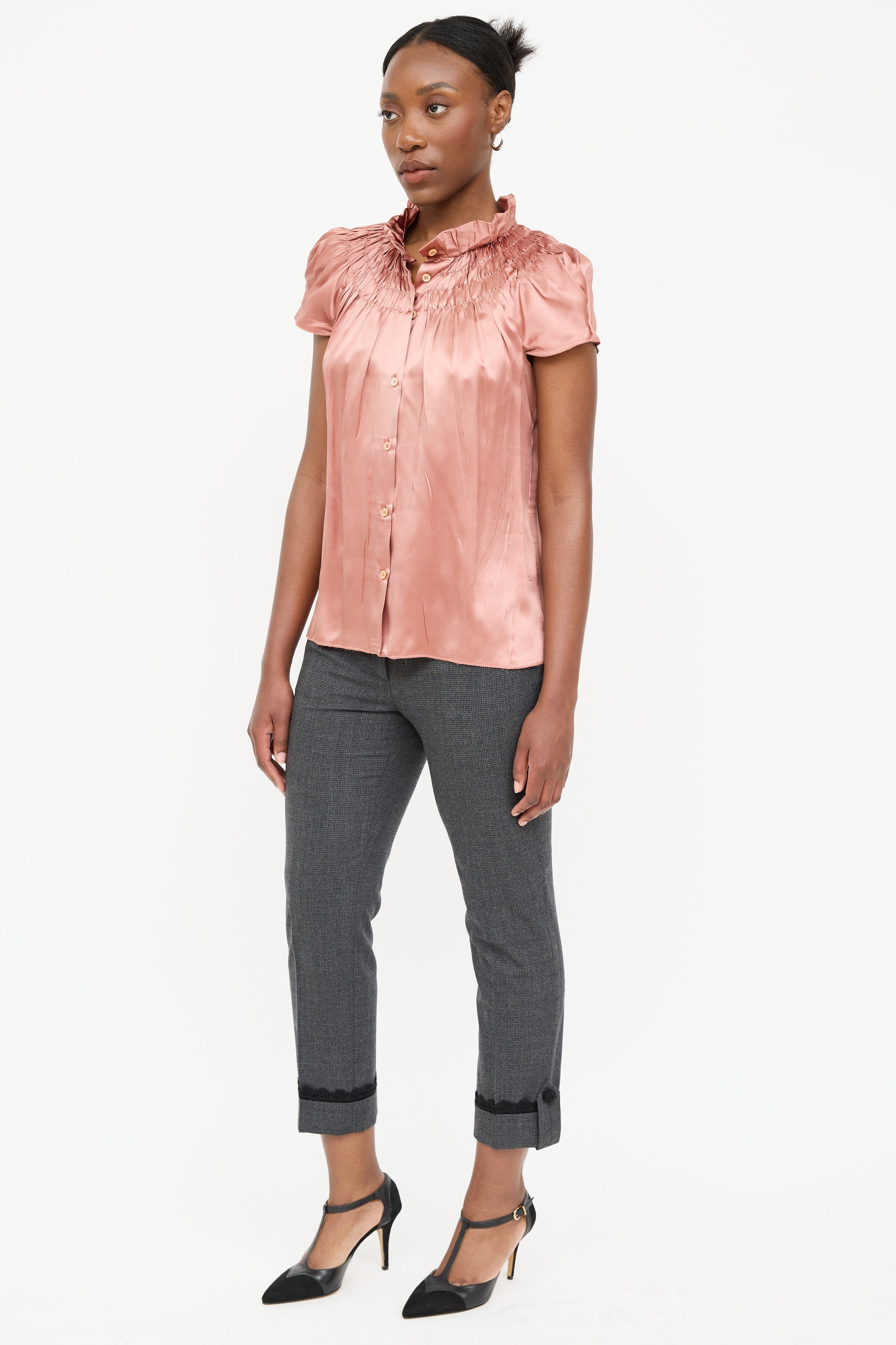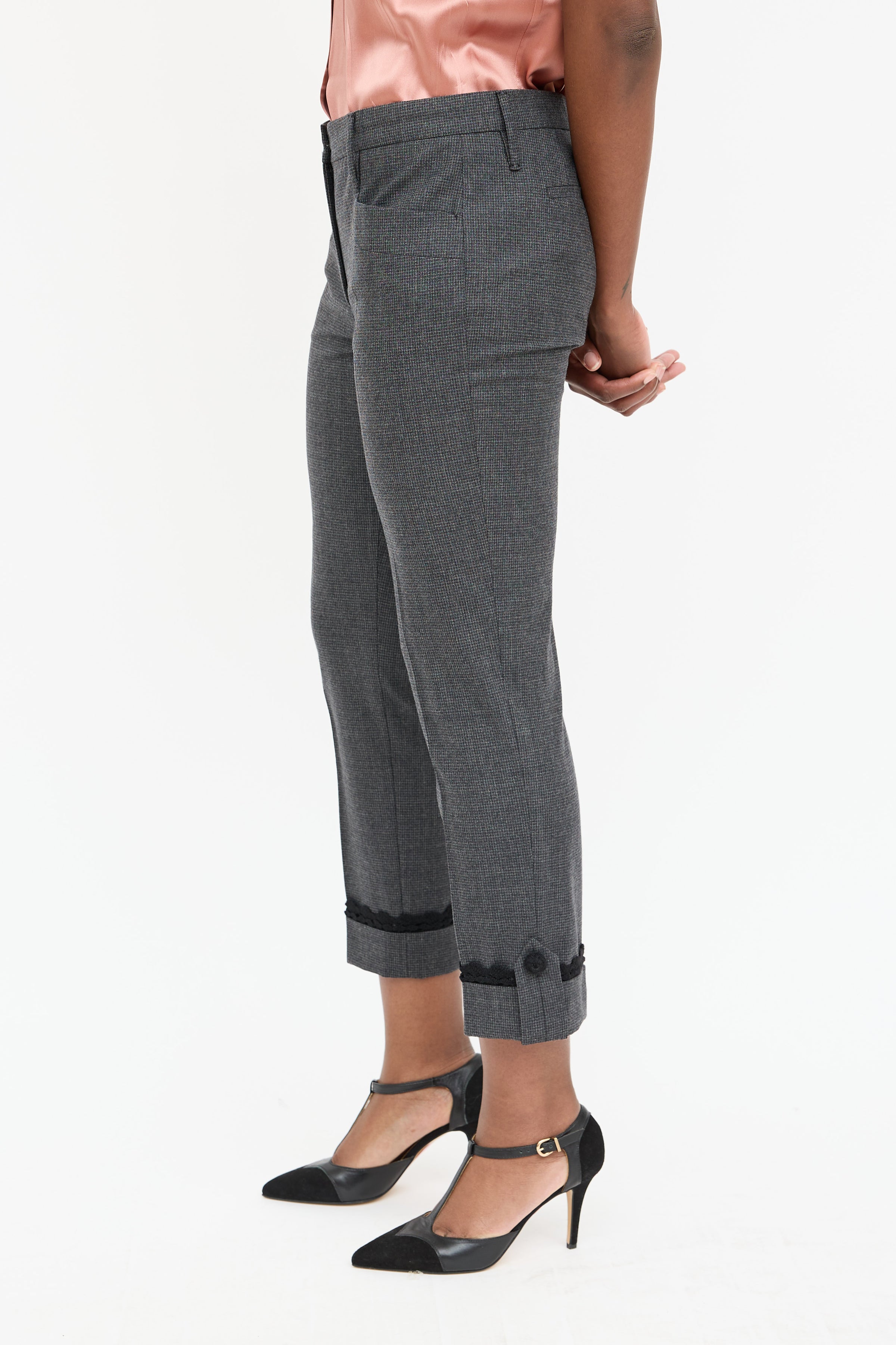Pre-owned Prada grey wool trousers featuring a white windowpane pattern throughout, two slip pockets at hip, two welt pockets at back, slim cropped leg, cuffed hem with crocheted detail, and zip fly with hook and eye closure. Lined.
