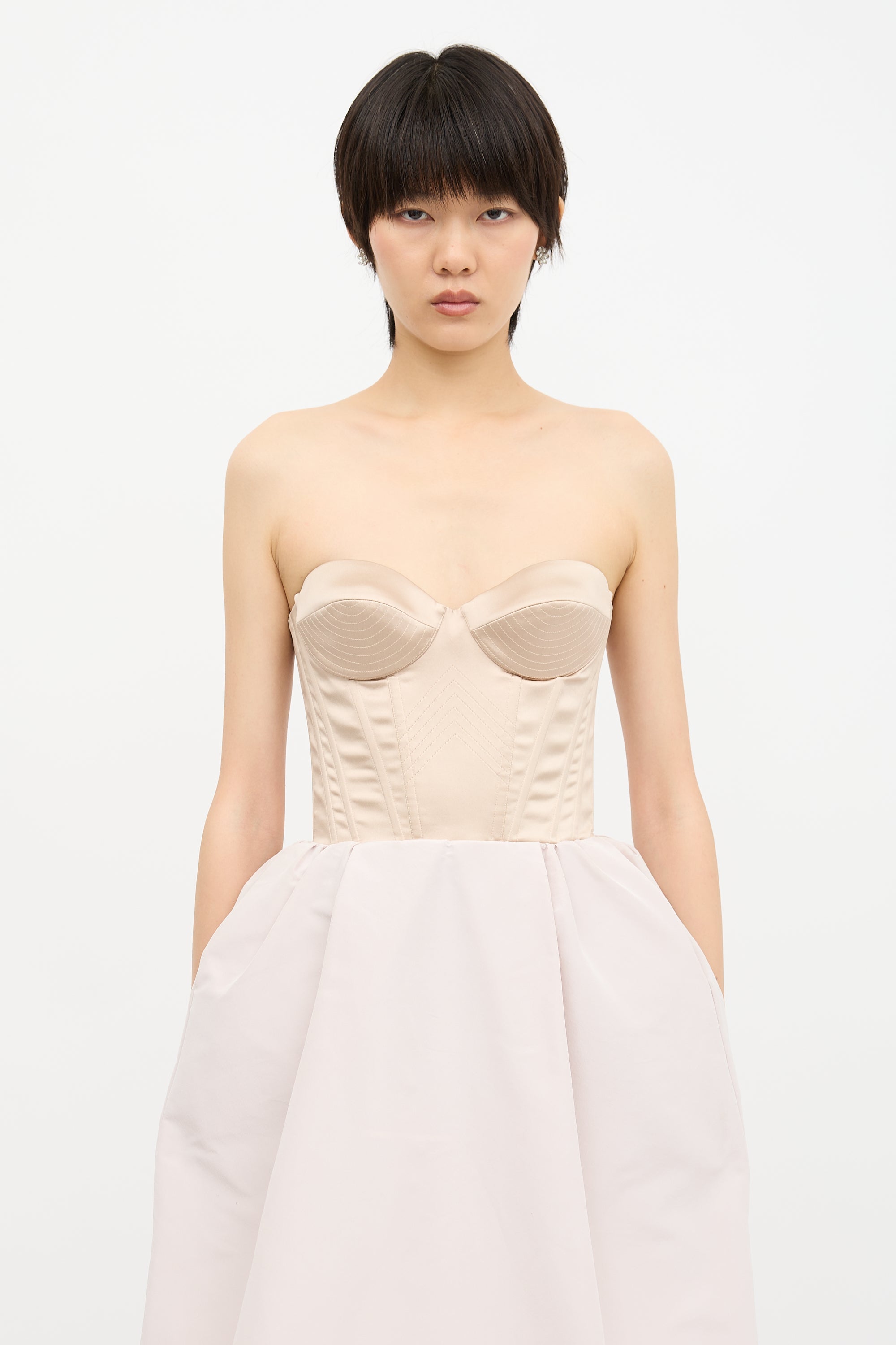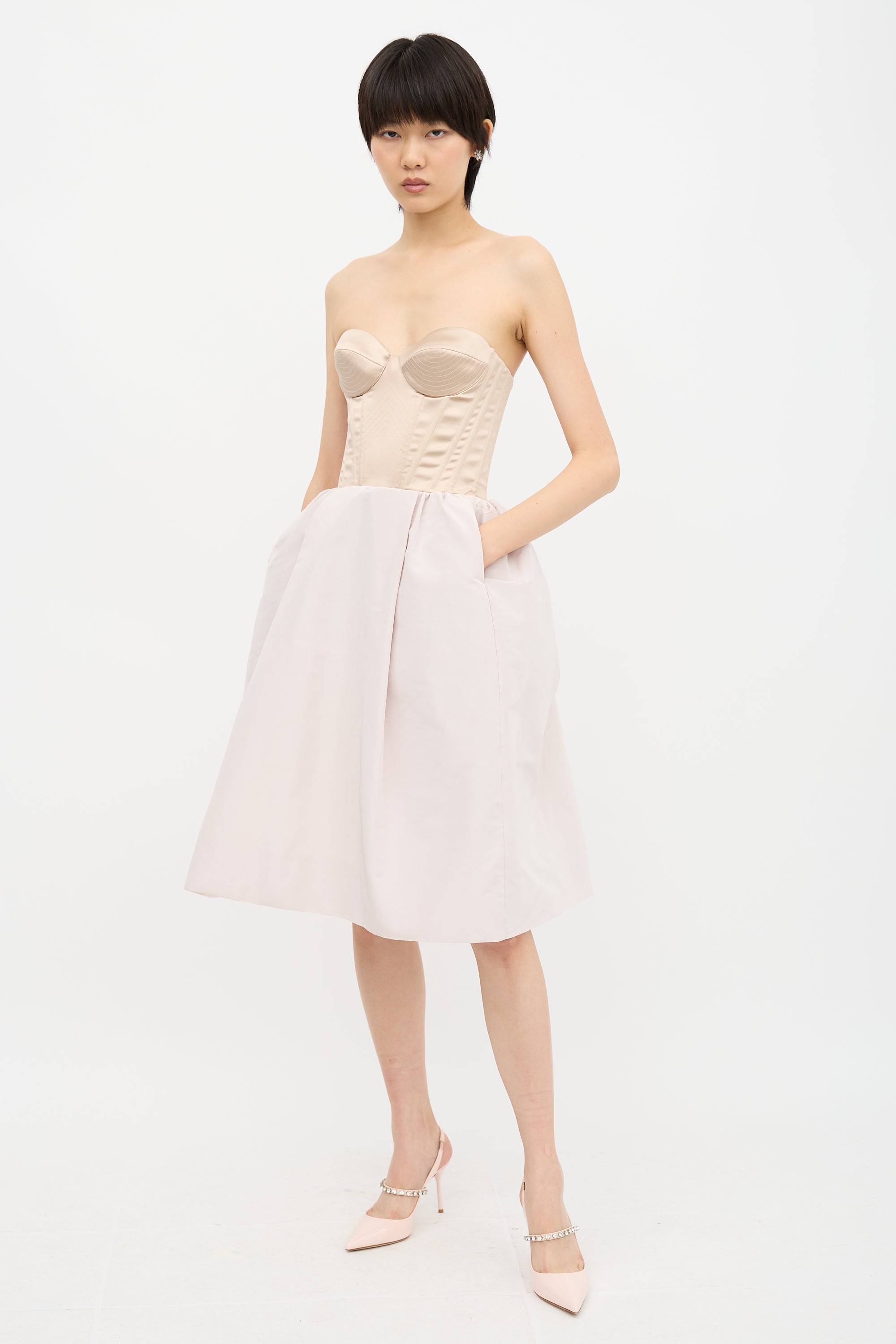 Pre-owned Rochas pink strapless midi A-line dress featuring bustier top with boning, gathered skirt, in seam pockets, and hook and eye and snap button closure. Lined.