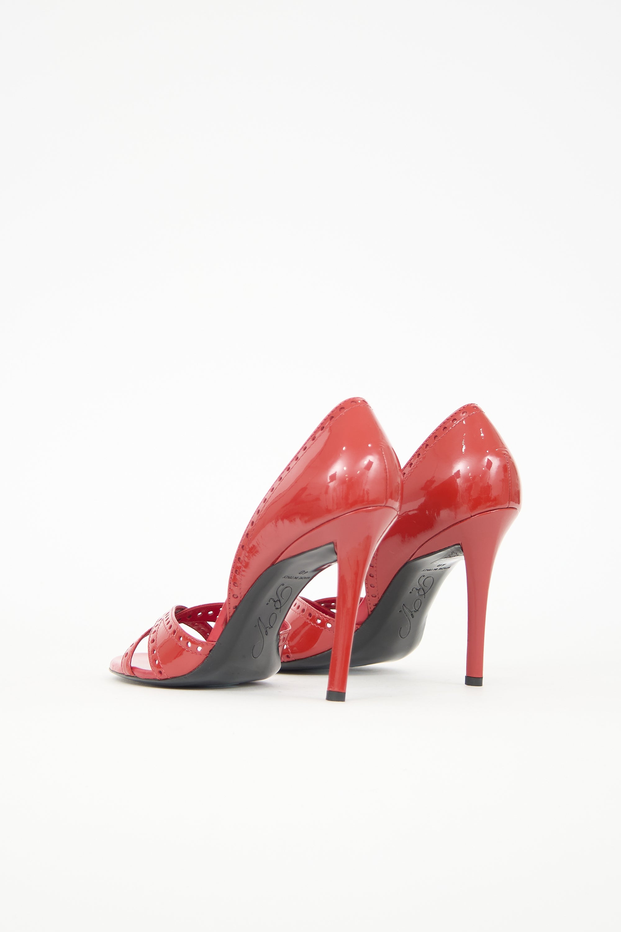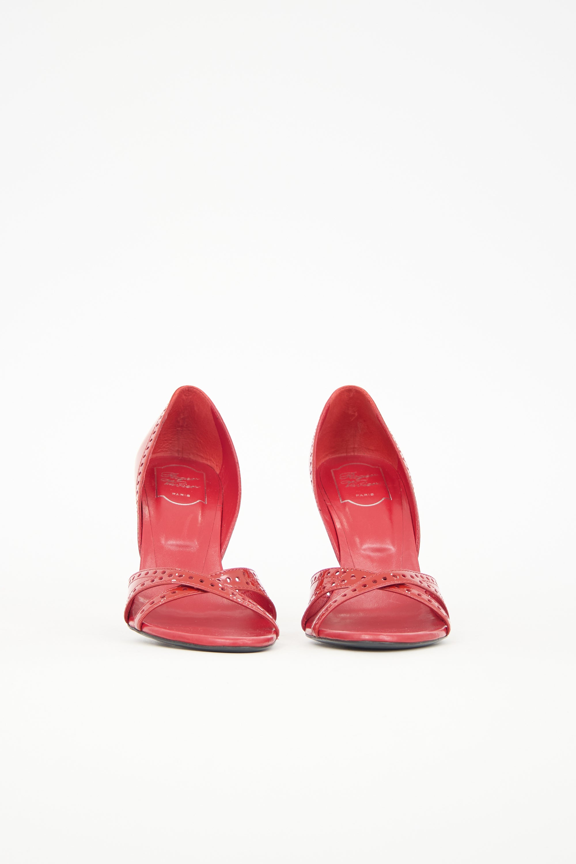 Pre-owned Roger Vivier red patent leather sandals featuring rounded toe, criss cross vamp, perforated trim, and covered stiletto heel. Comes with original dust bag.