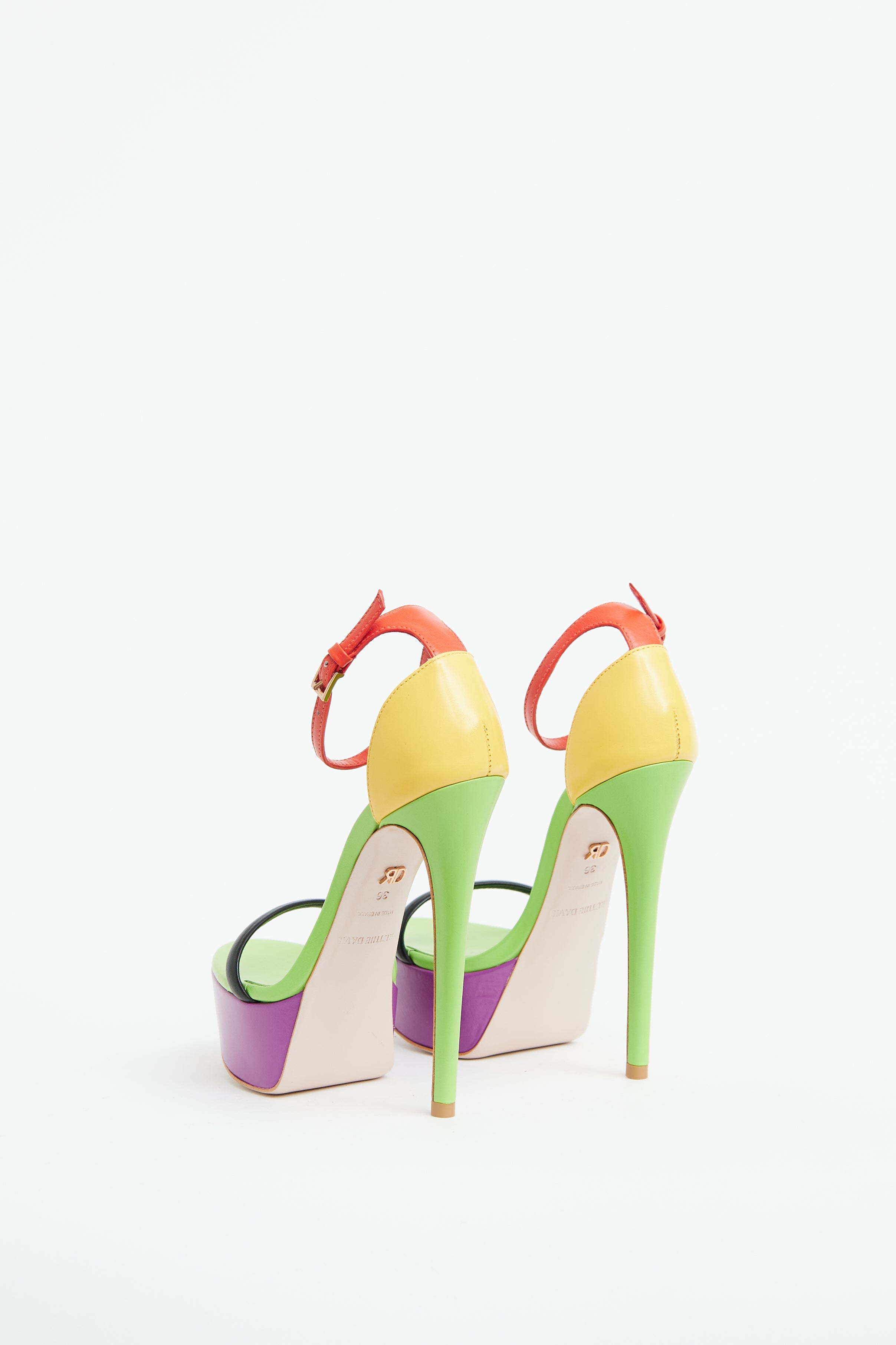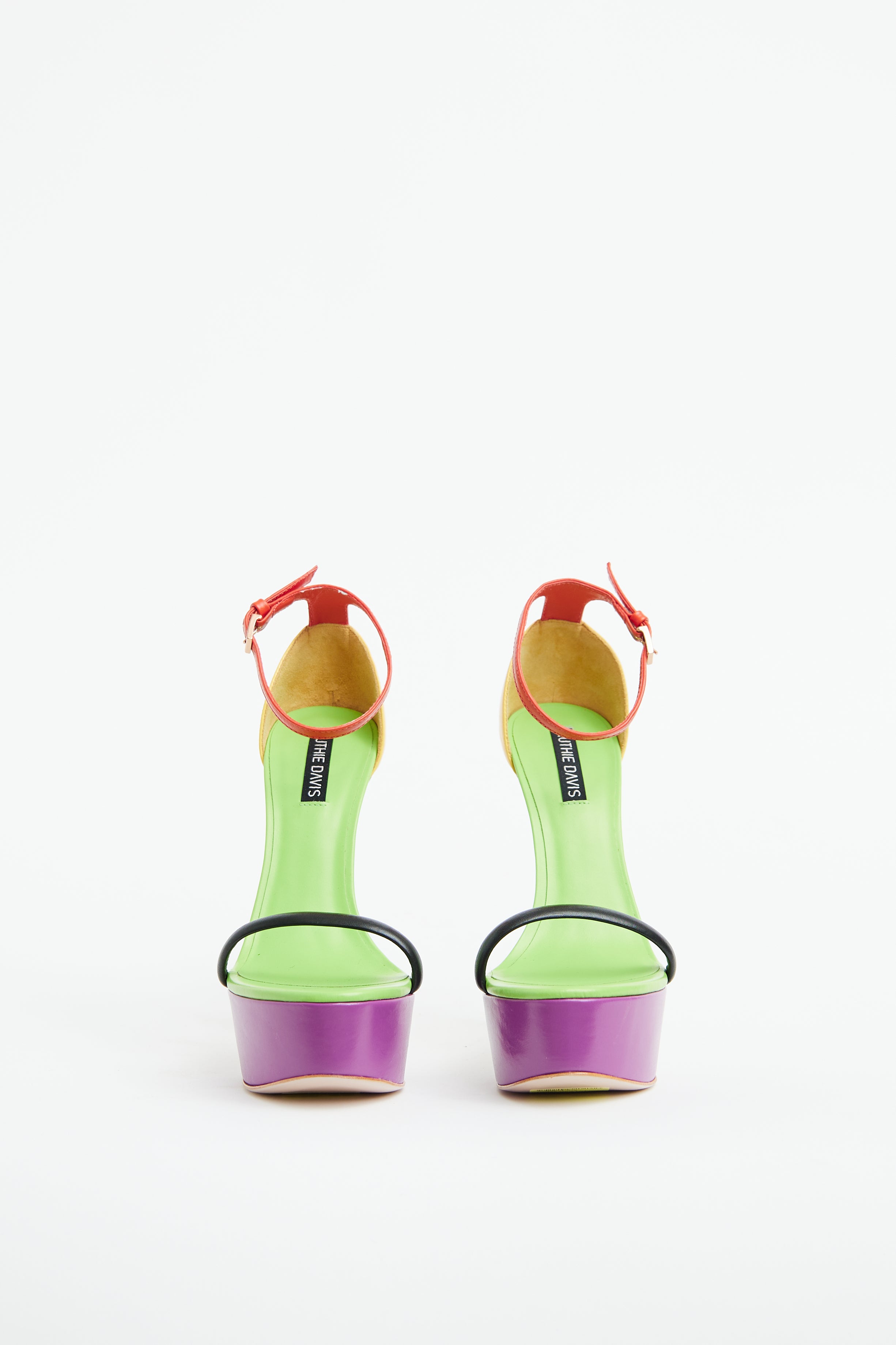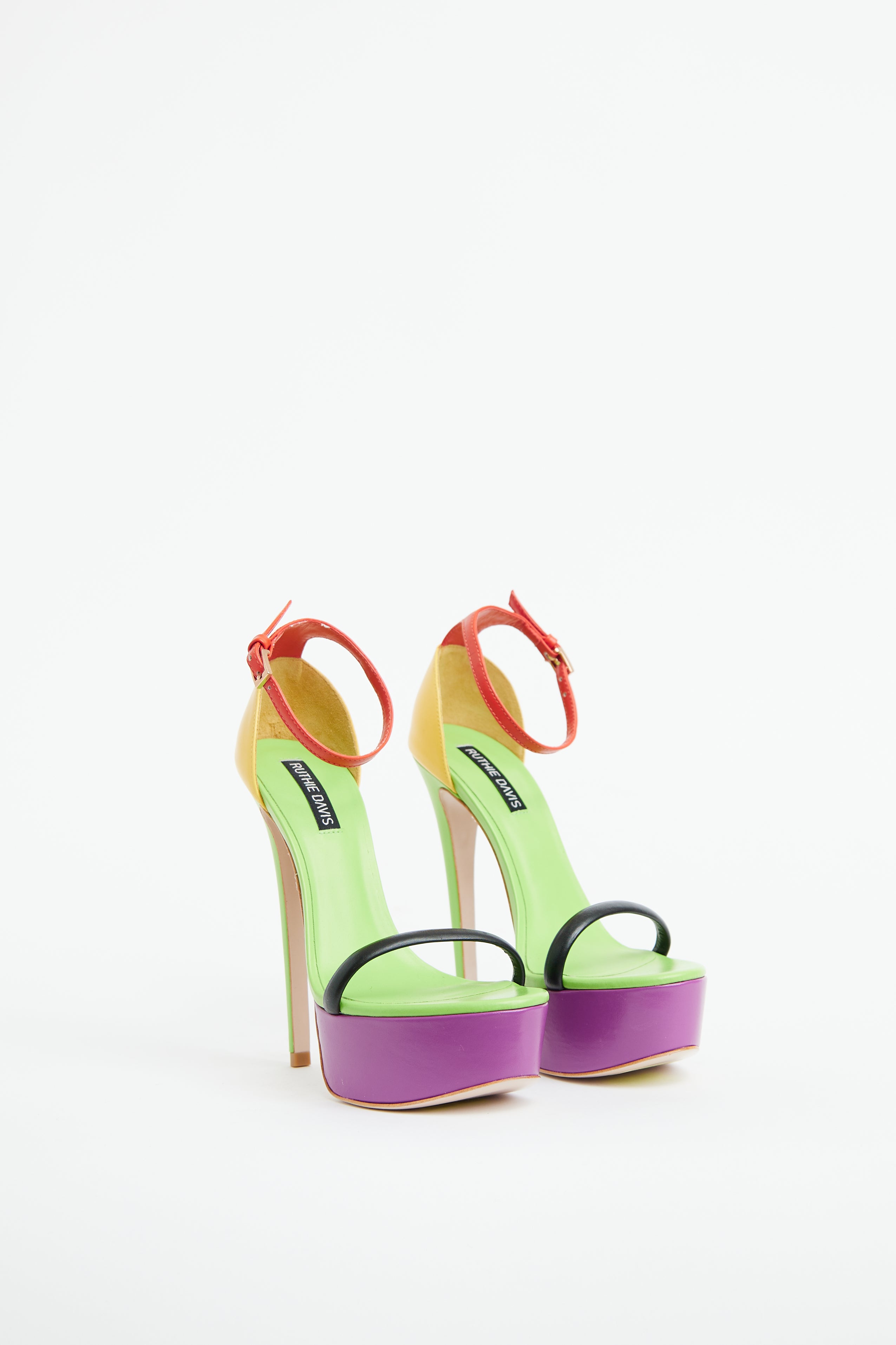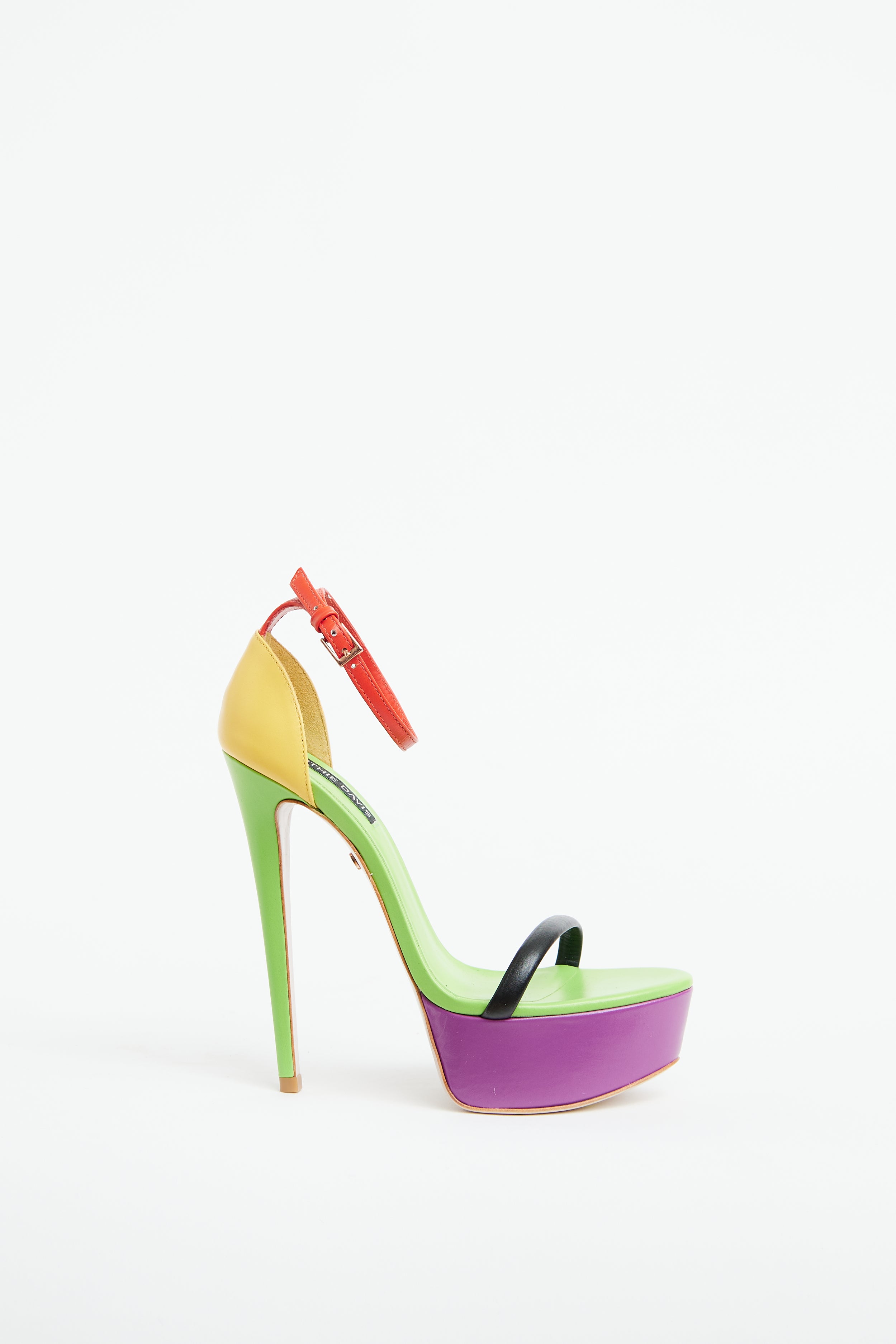 Pre-owned Ruthie Davis multicolour Candy platform sandals featuring open round toe, single black rolled strap at vamp, red adjustable ankle strap with silver tone buckle, purple platform and stiletto heel.