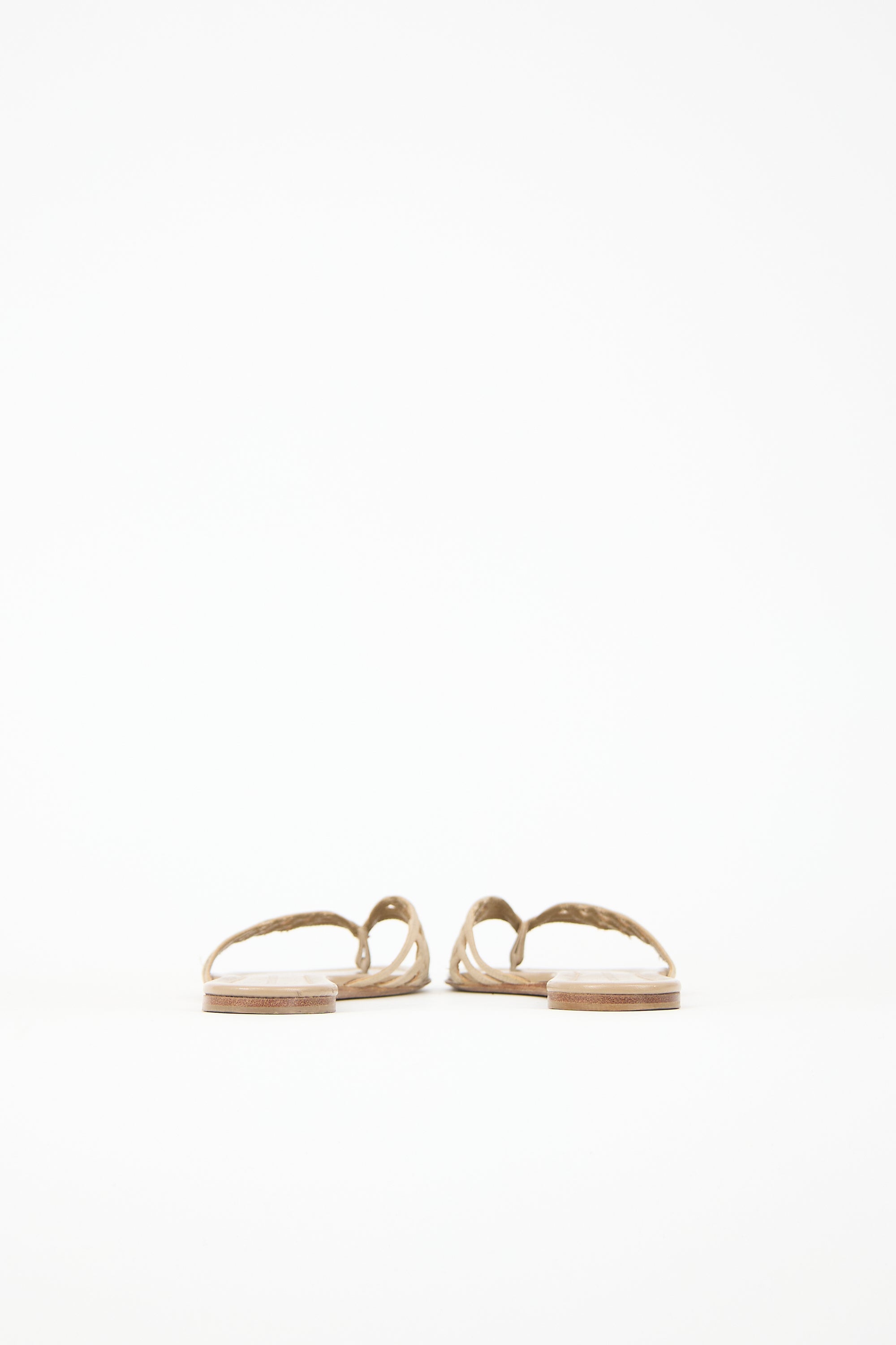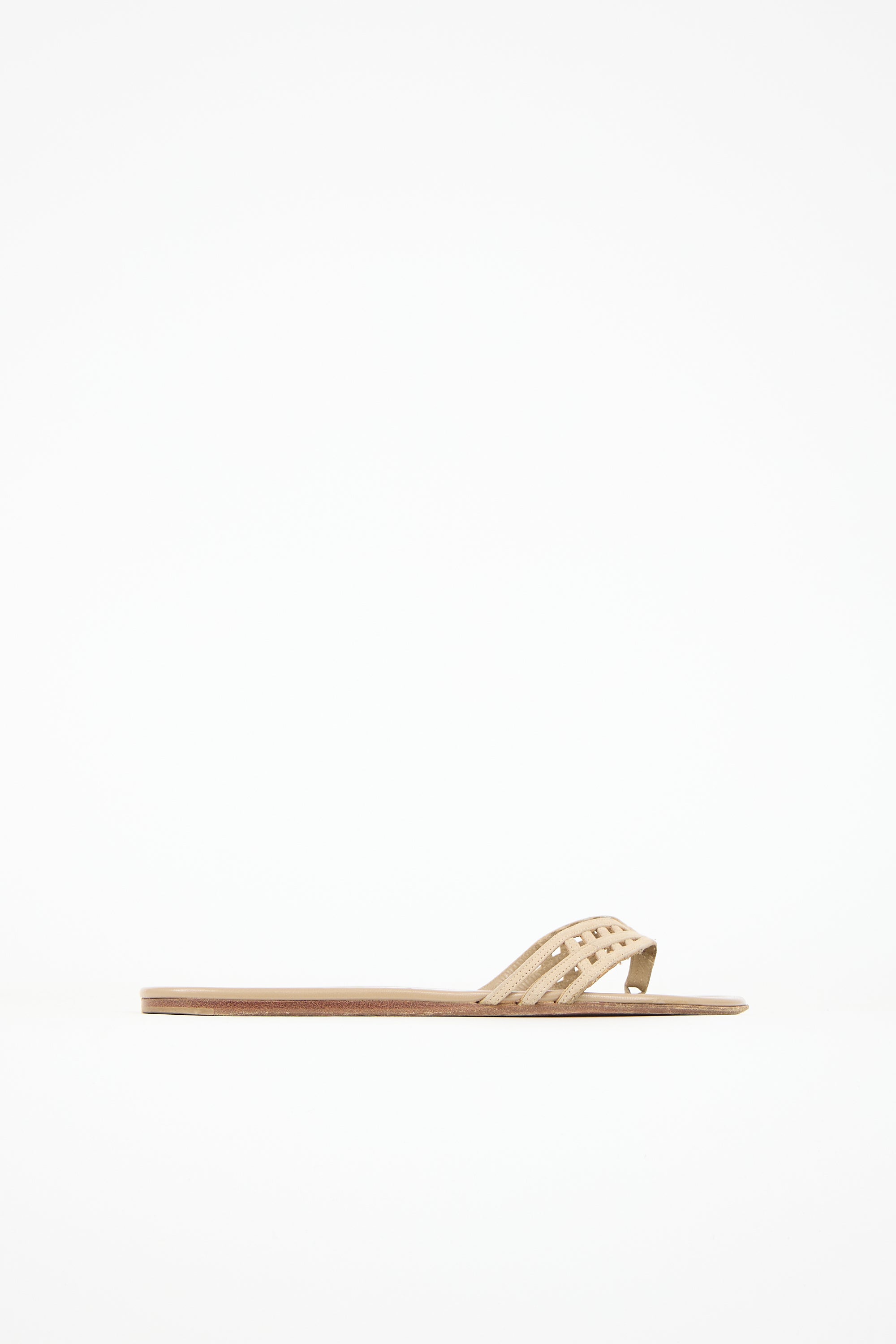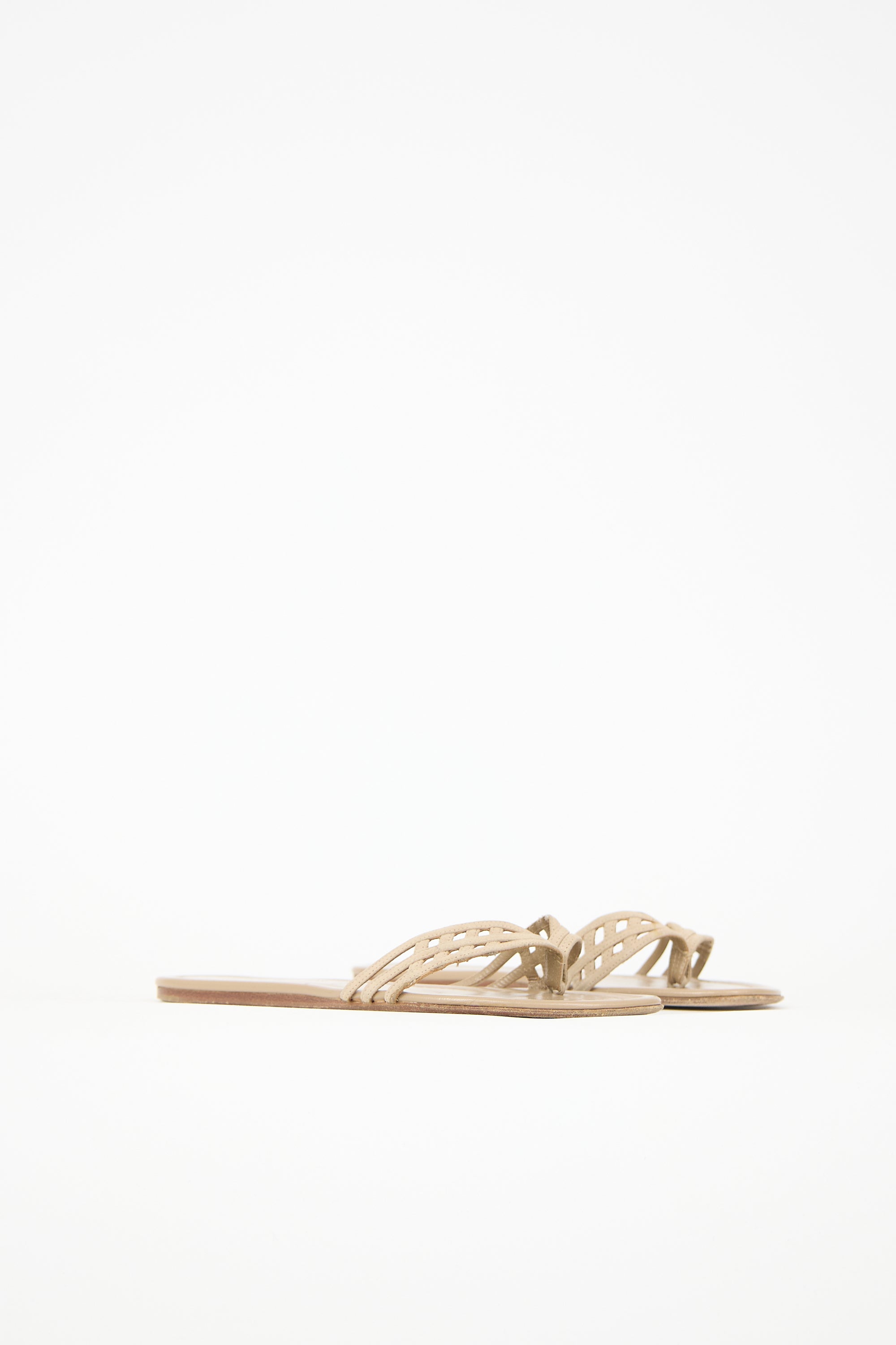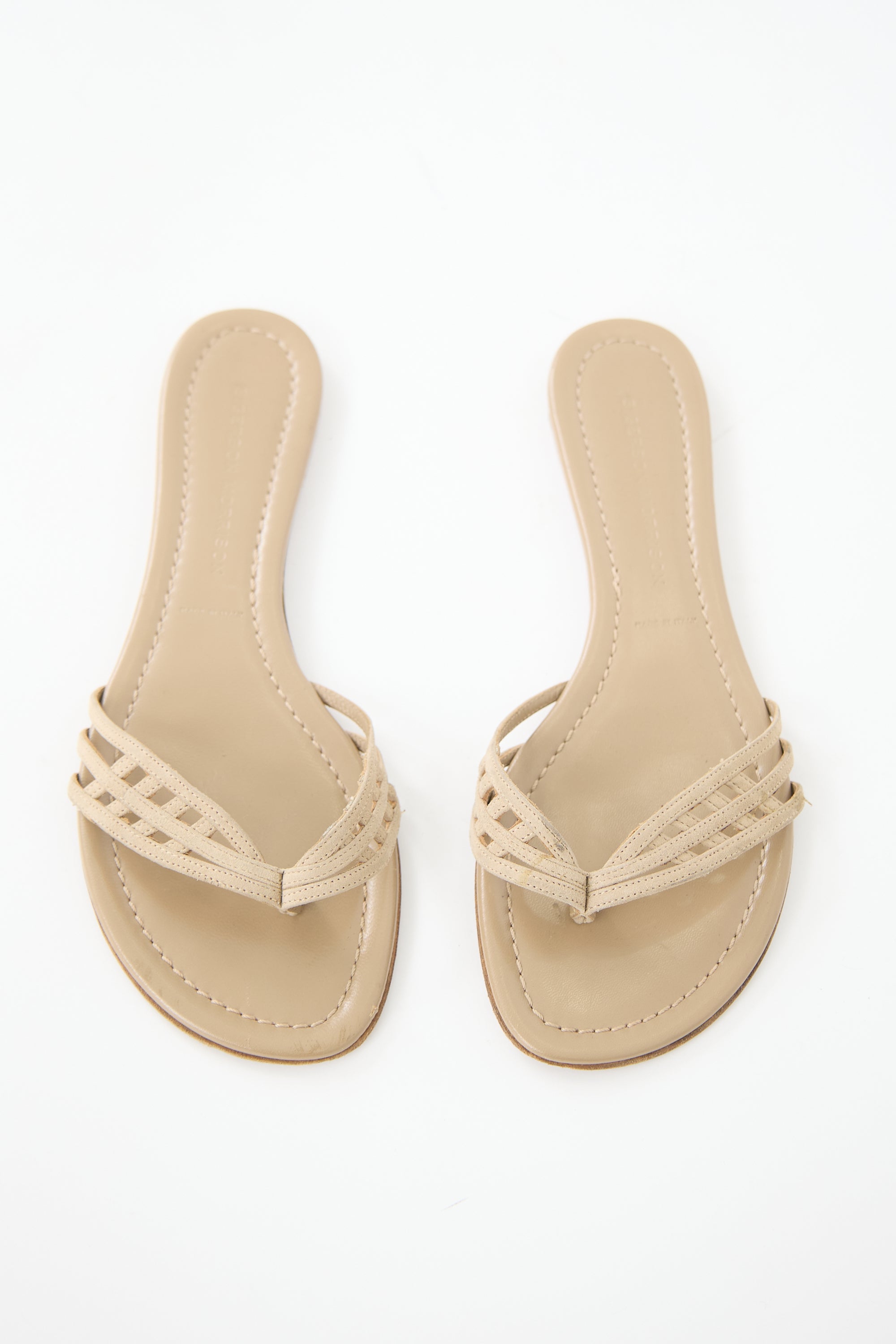 Pre-owned Sigerson Morrison brown leather sandals featuring a tapered round toe, caged thong strap across vamp, and a flat stacked outsole.