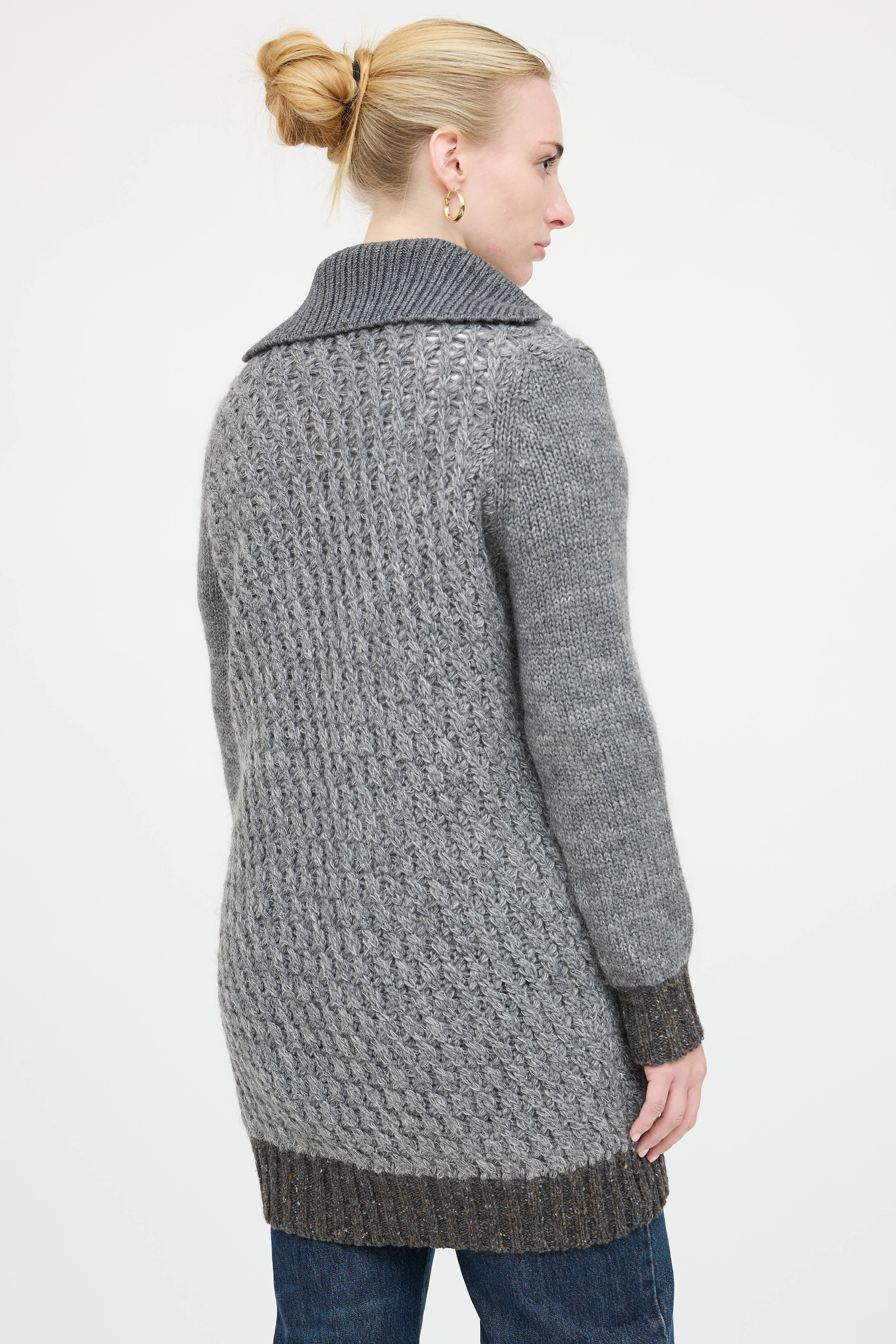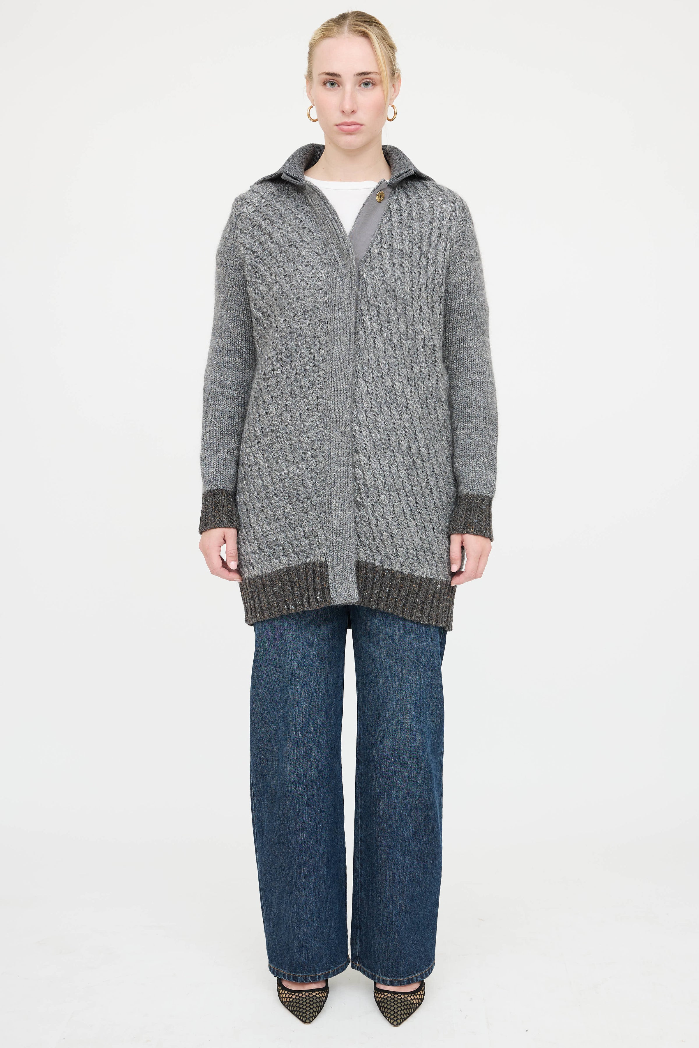 Pre-owned Sportmax grey knit long sleeve cardigan featuring pointed collar, snap button front, and ribbed trims.