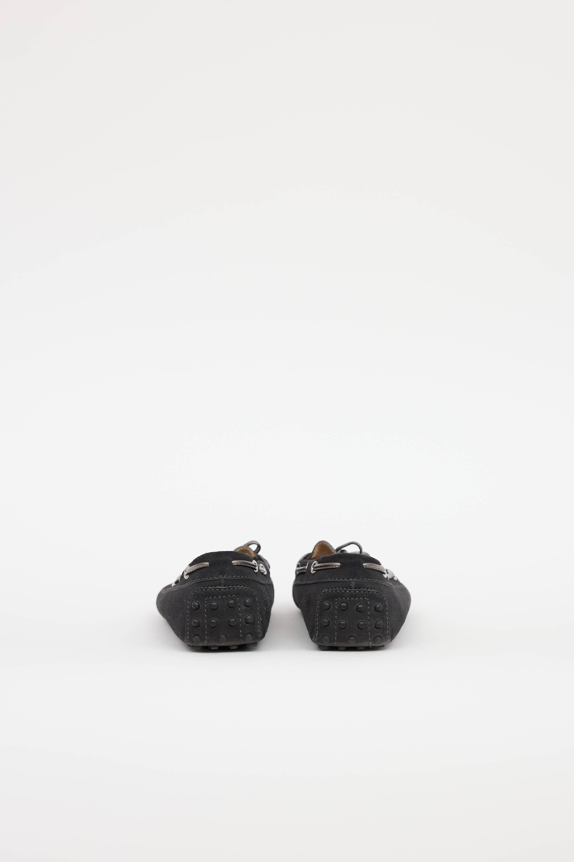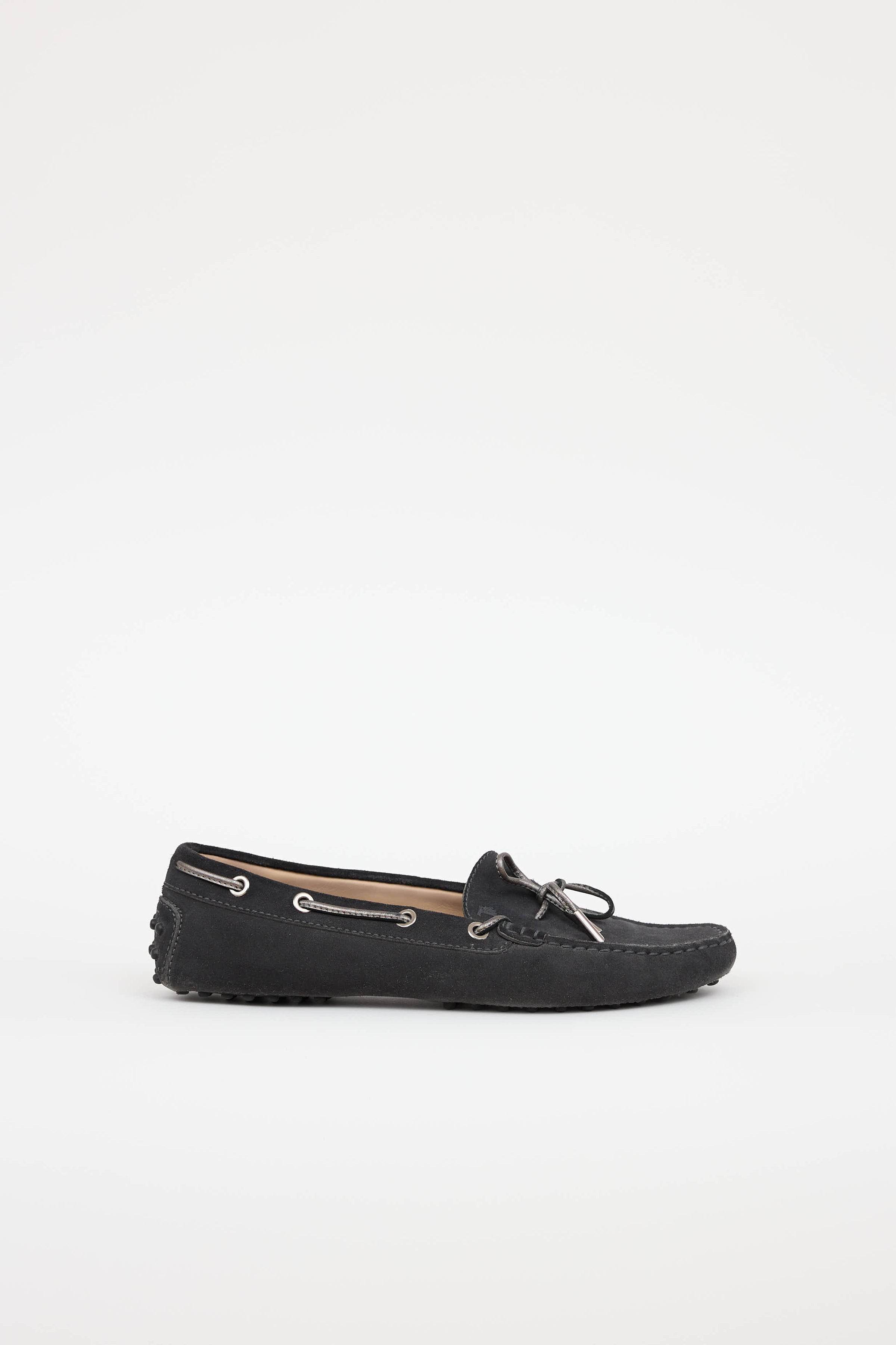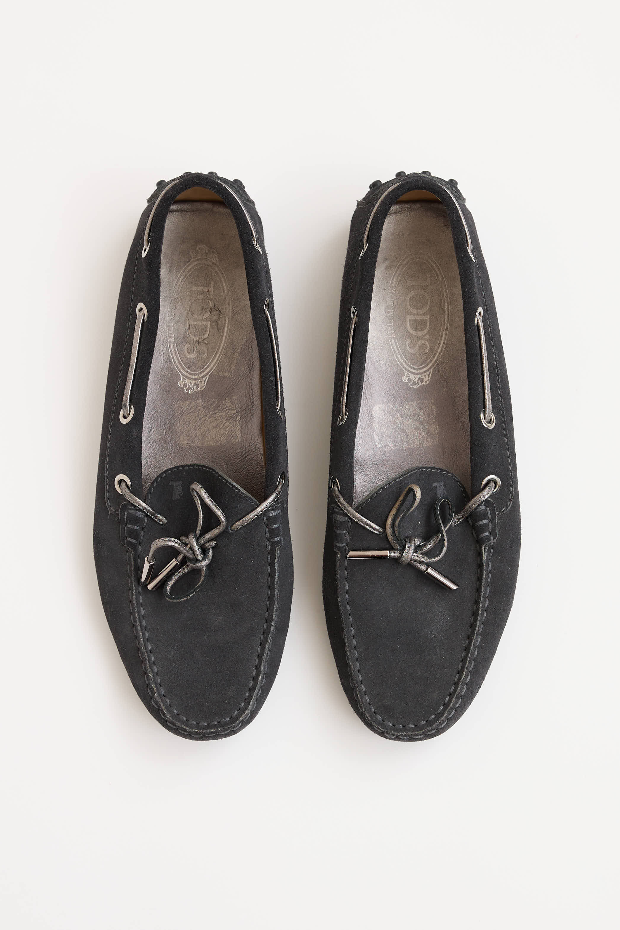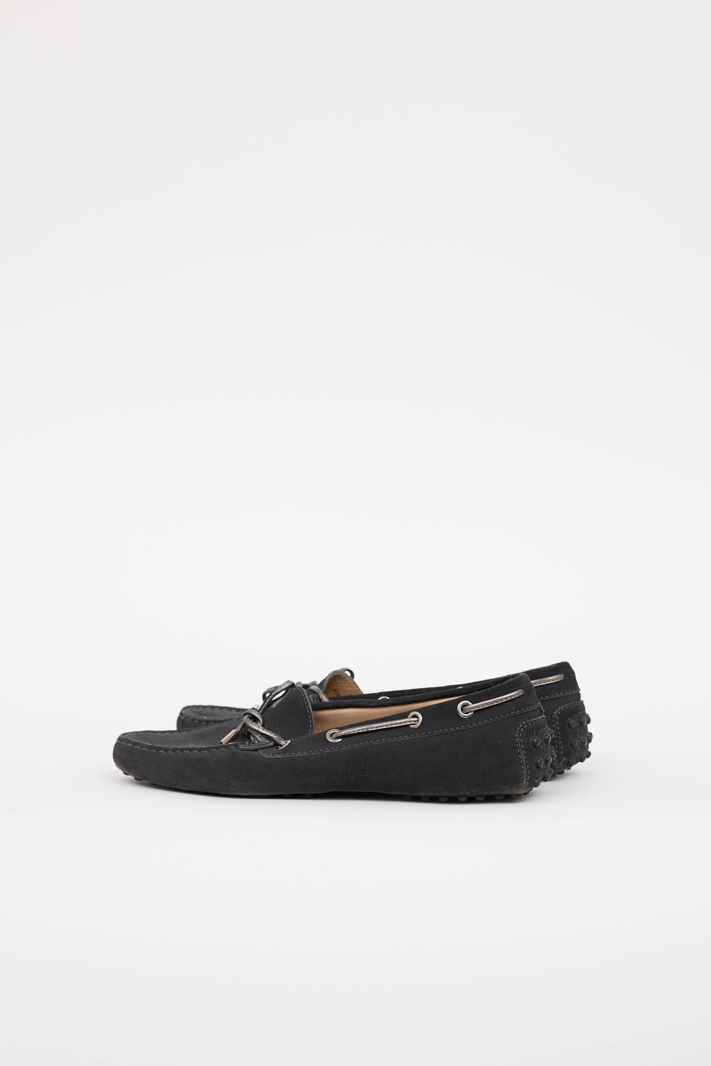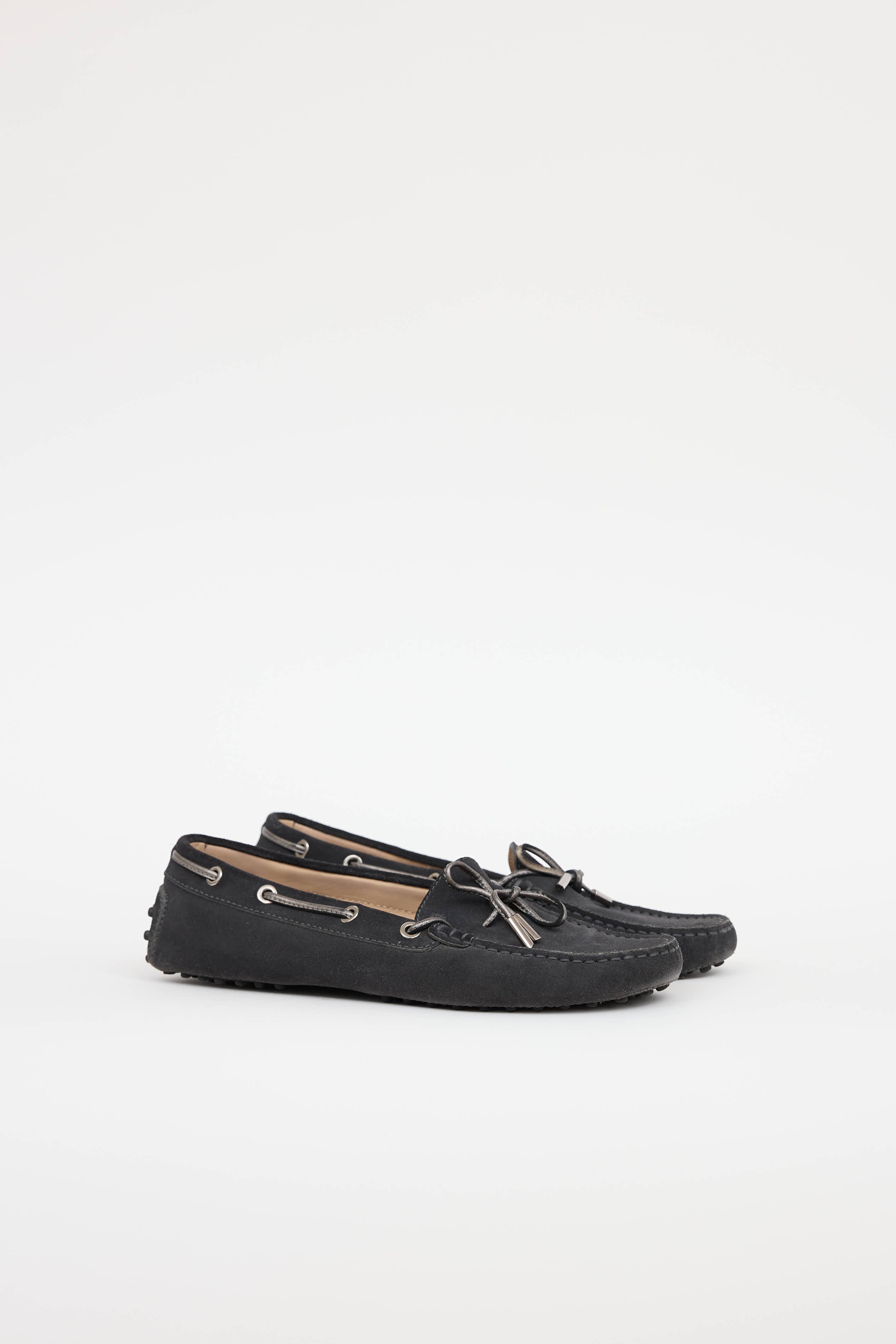 Pre-owned Tod's charcoal suede driving loafer featuring square toe, wrap around metallic lacing with bow detail at vamp, and rubber pebbled sole.