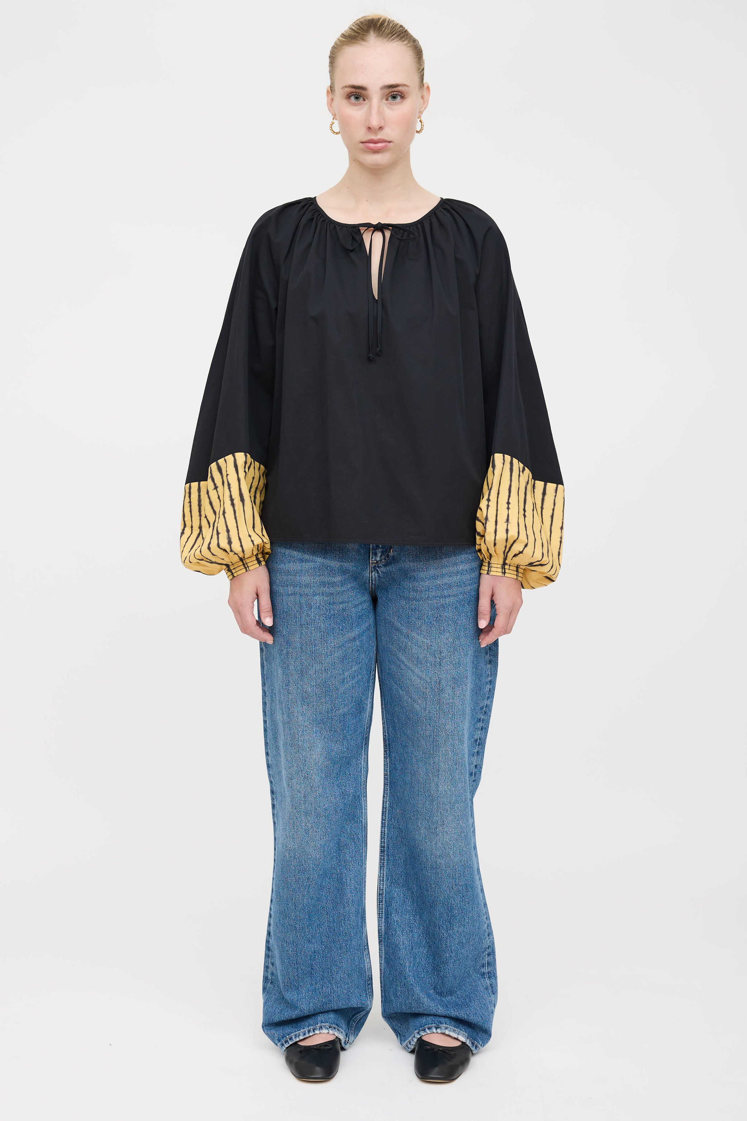 Pre-owned Tory Burch black and yellow peasant blouse featuring round neckline with tie, pleating at collar, patterned balloon sleeves, buttoned cuffs, and slit at hem.