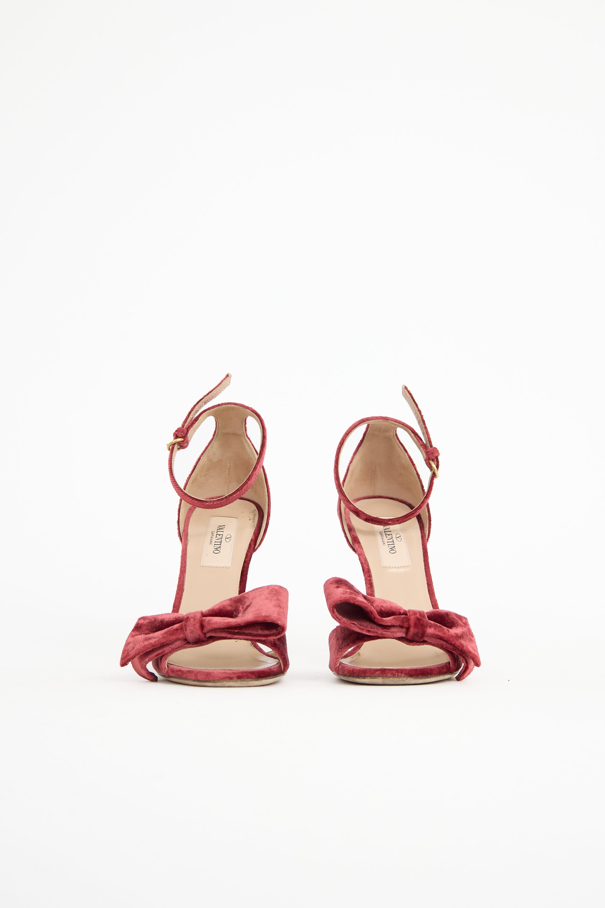 Pre-owned Valentino burgundy velvet sandals featuring rounded toe, bow at vamp, adjustable ankle strap, and covered stiletto heel.