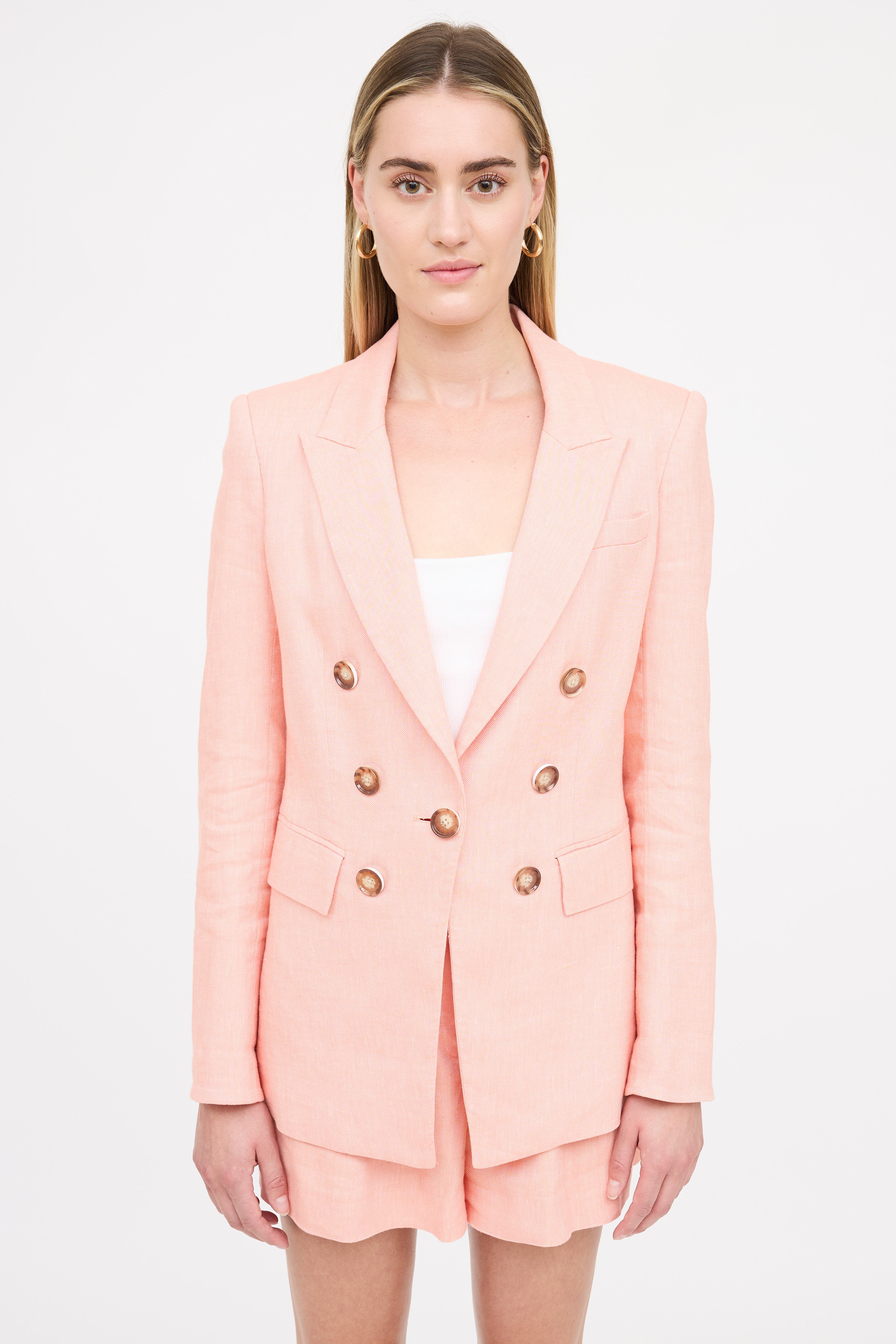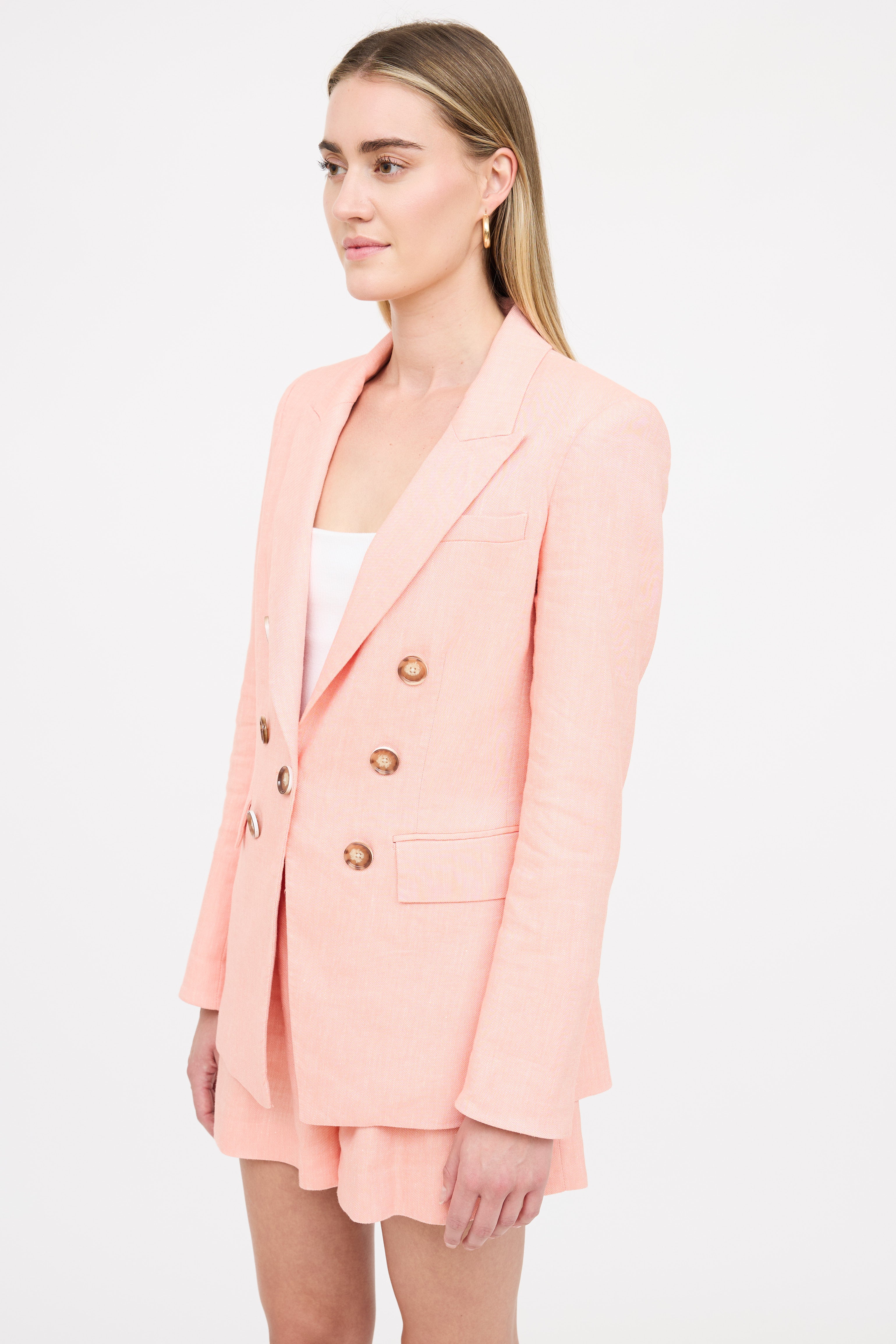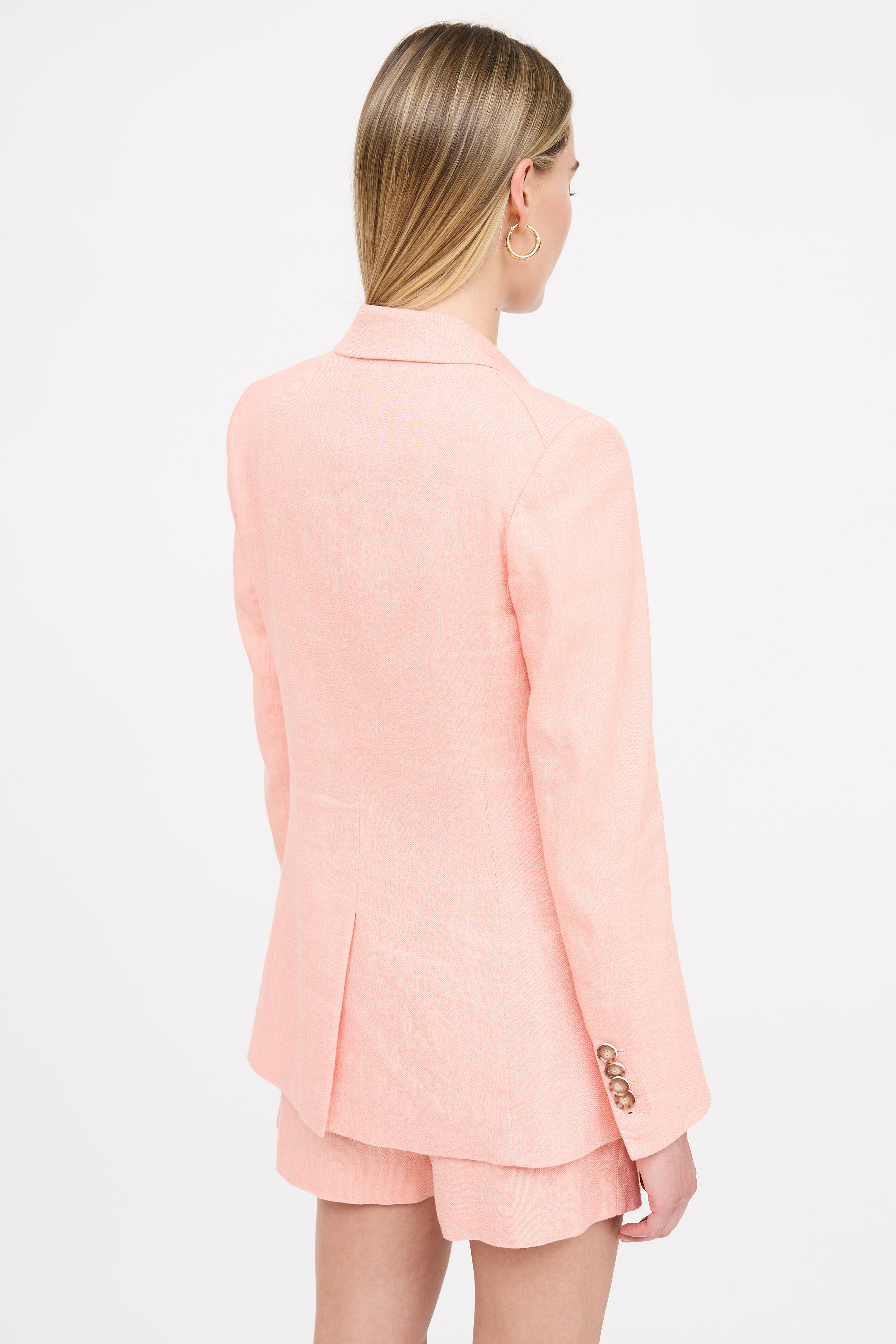 Pre-owned Veronica Beard pink blazer and shorts linen co-ord set featuring peak lapel, singular button front, pocket at chest, shoulder pads, welt pockets at front, buttoned cuffs, and slit at hem. Matching shorts featuring detachable adjustable belt, zip fly, slit pockets at hip, welt pockets at back, and pleated waist. Lined.