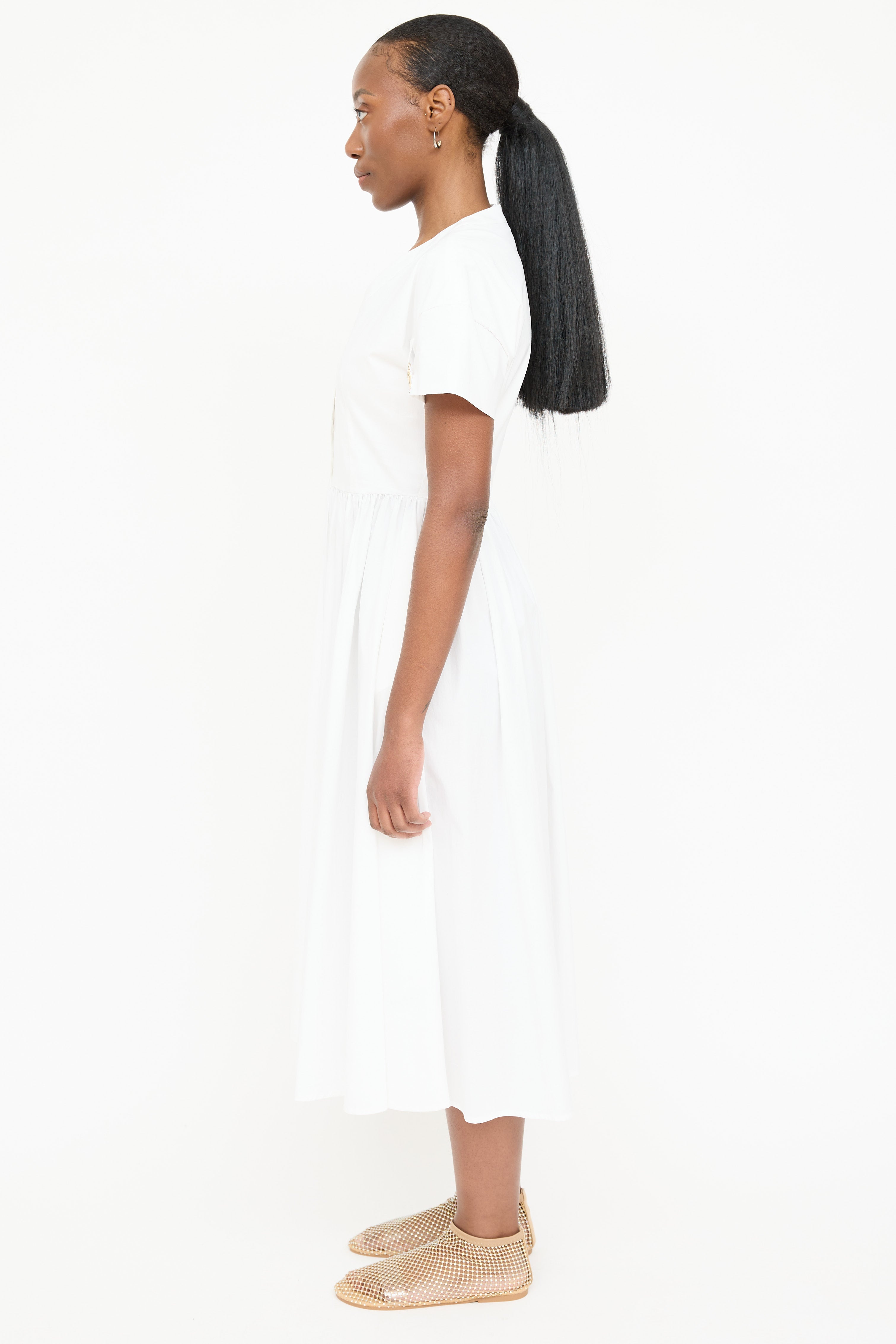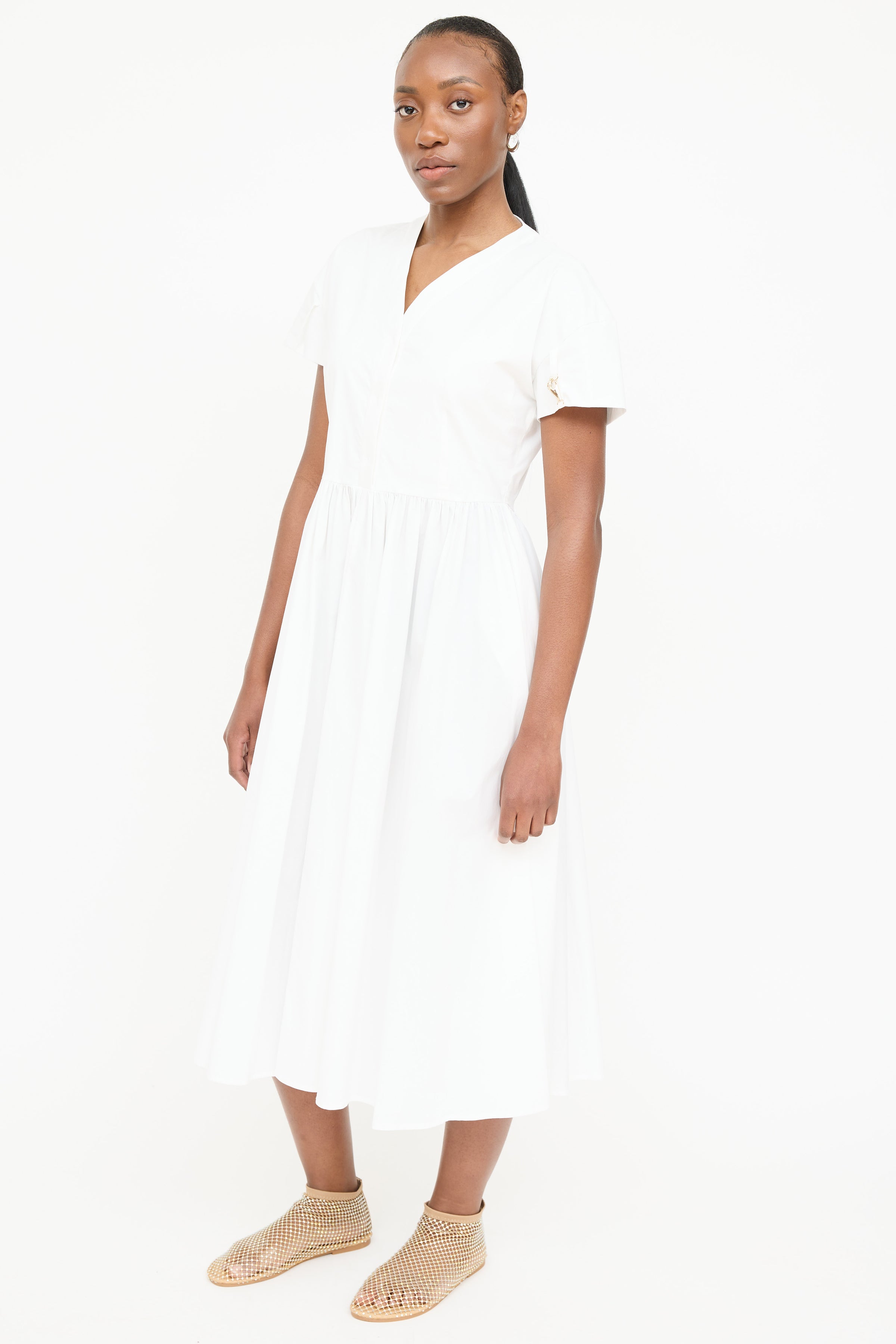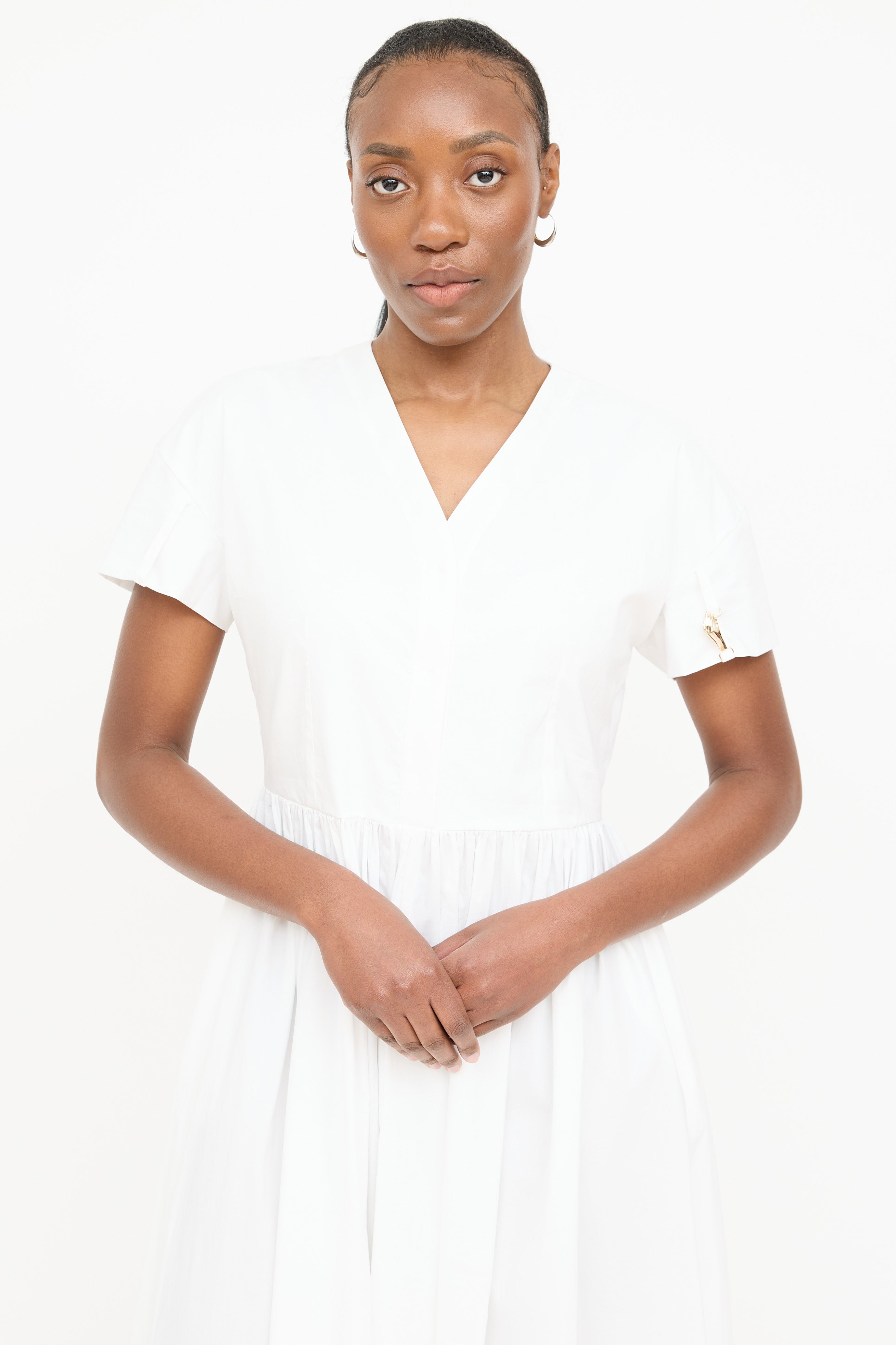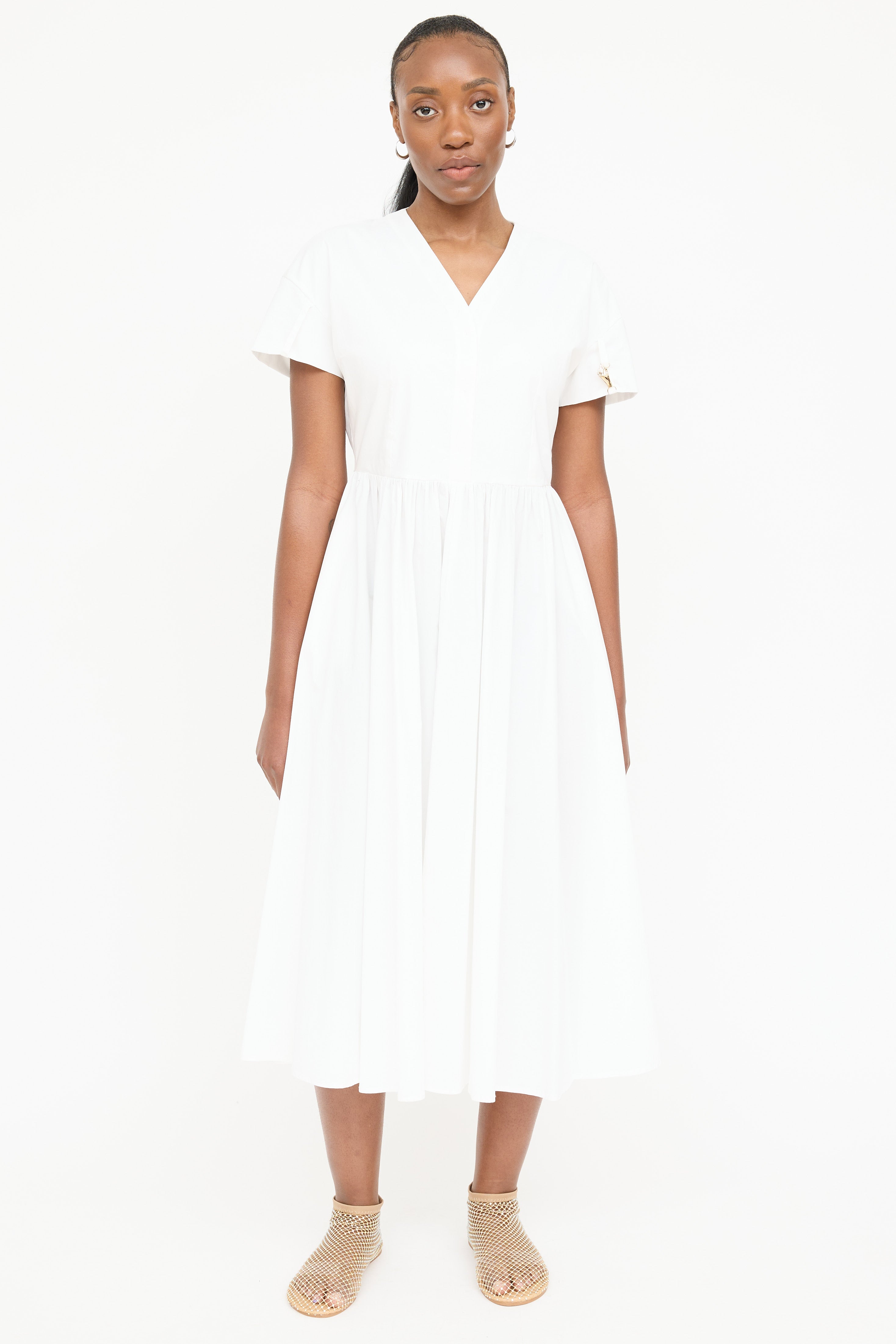 Vivetta white poplin maxi dress featuring V neck, short sleeves with gold tone hand hardware, gathered skirt, two slip pockets at hip, quarter button up front, and zip closure at back.